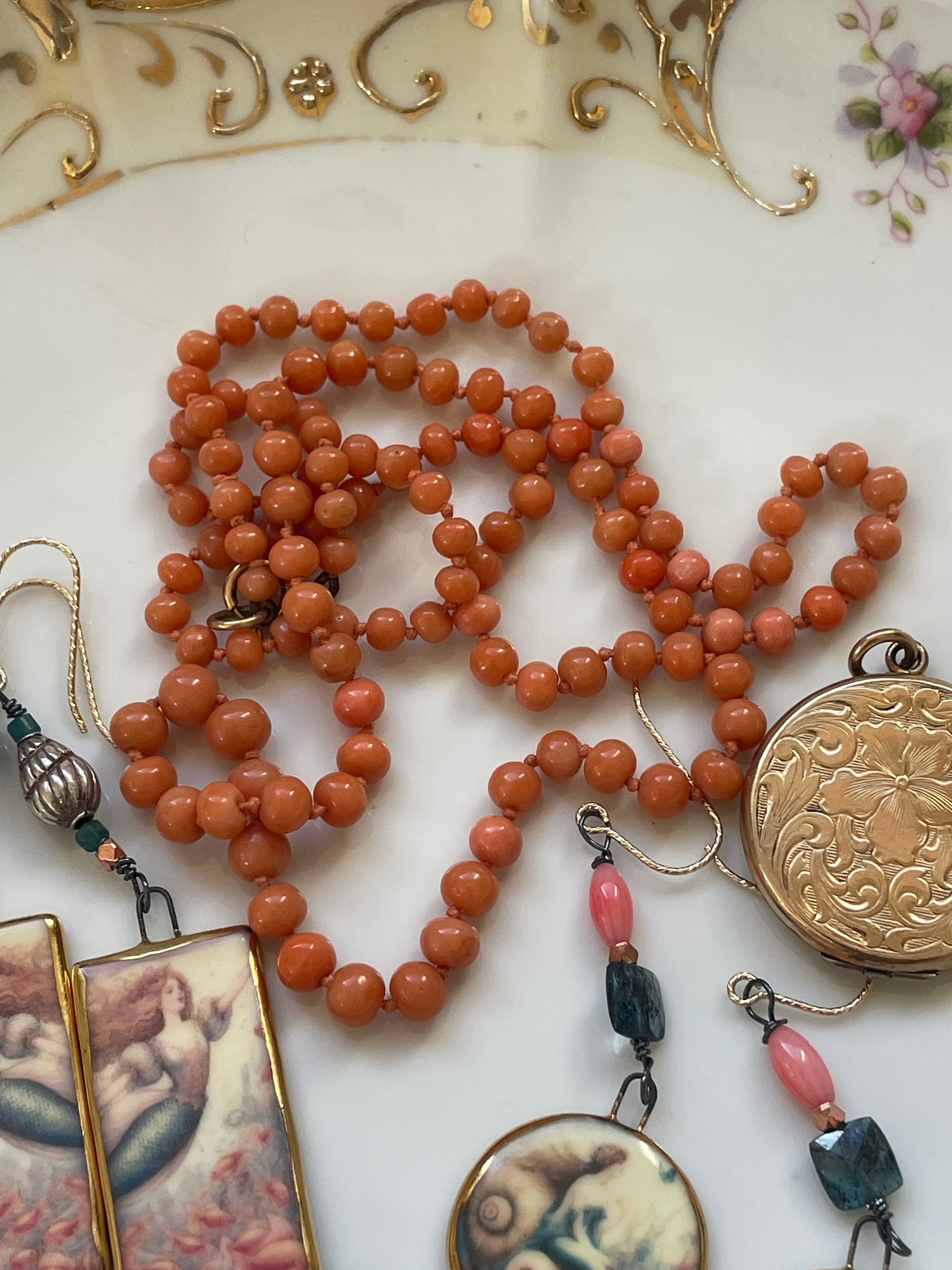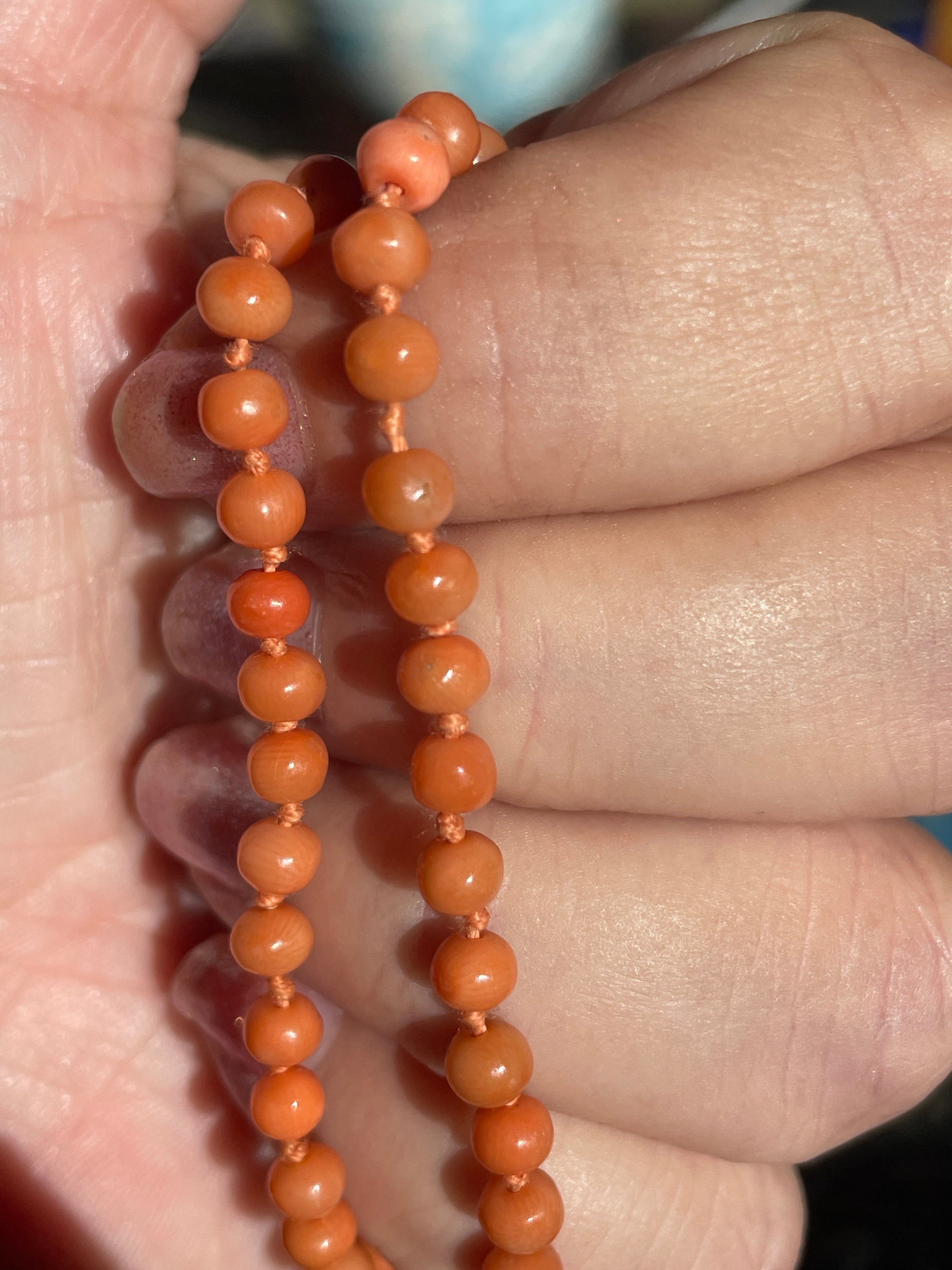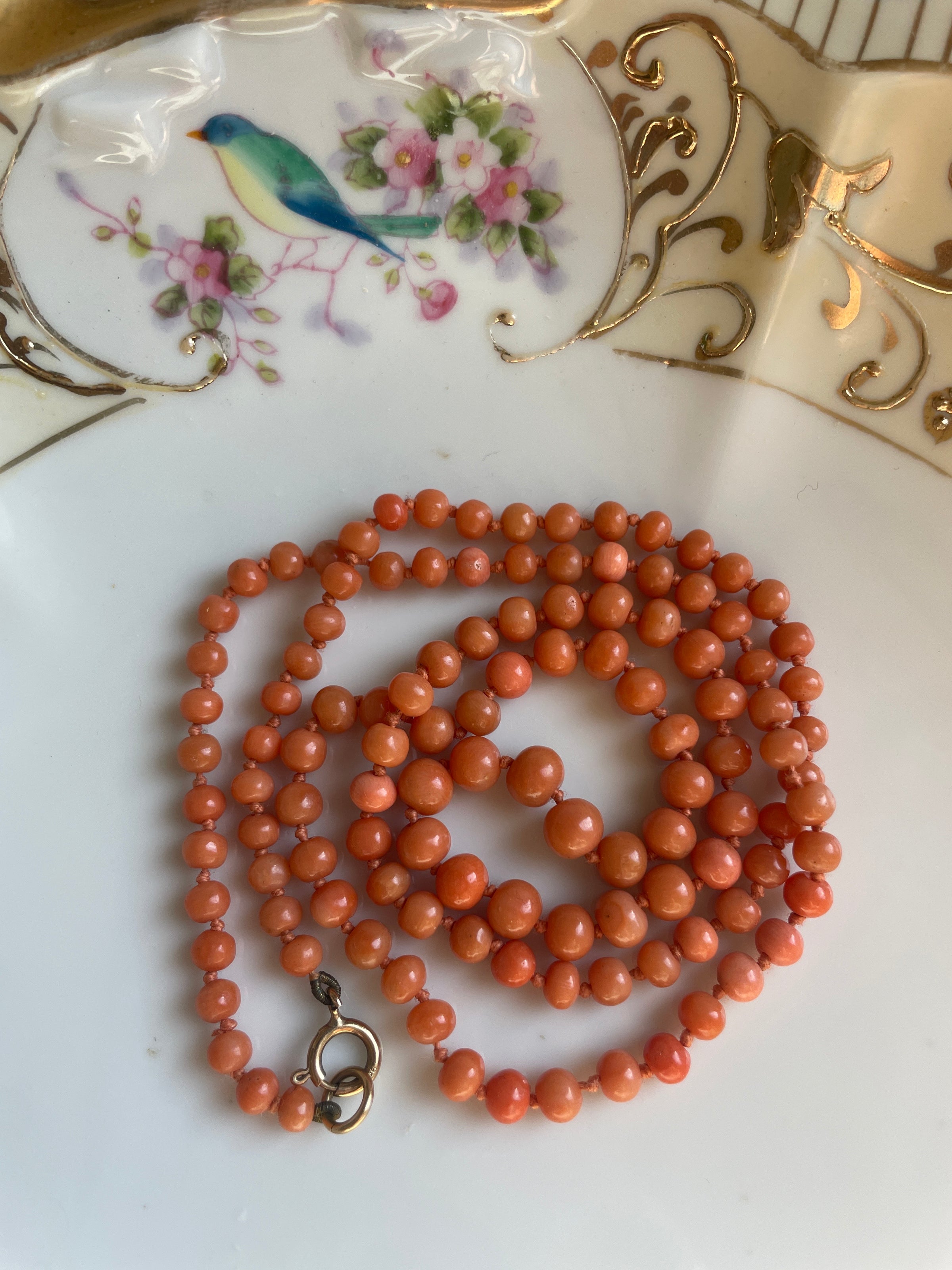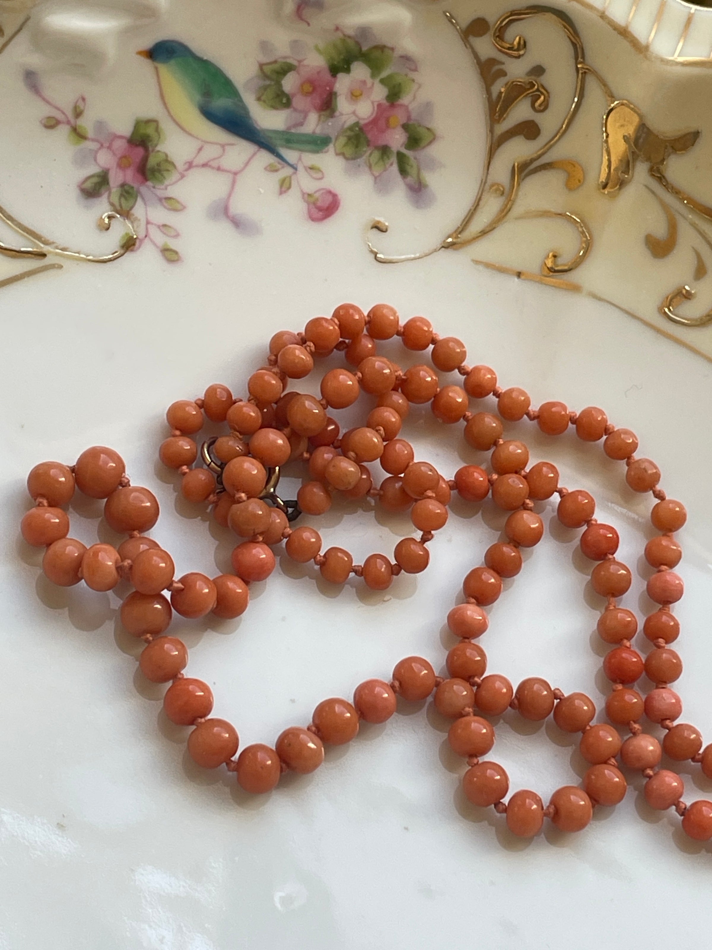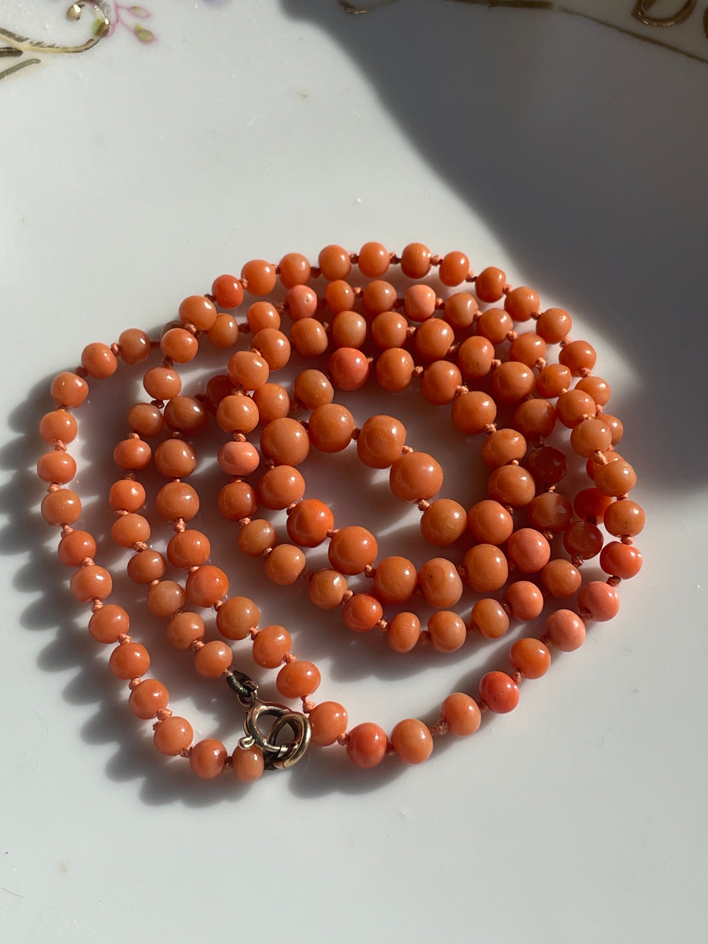 Gorgeous hand knotted Mediterranean Coral necklace with 9k gold clasp circa early 1900s. Rare longer length of just under 24 inches. Overall good condition with a few knotted areas likely stretched with time but not overly evident. Clasp stamped 9k.