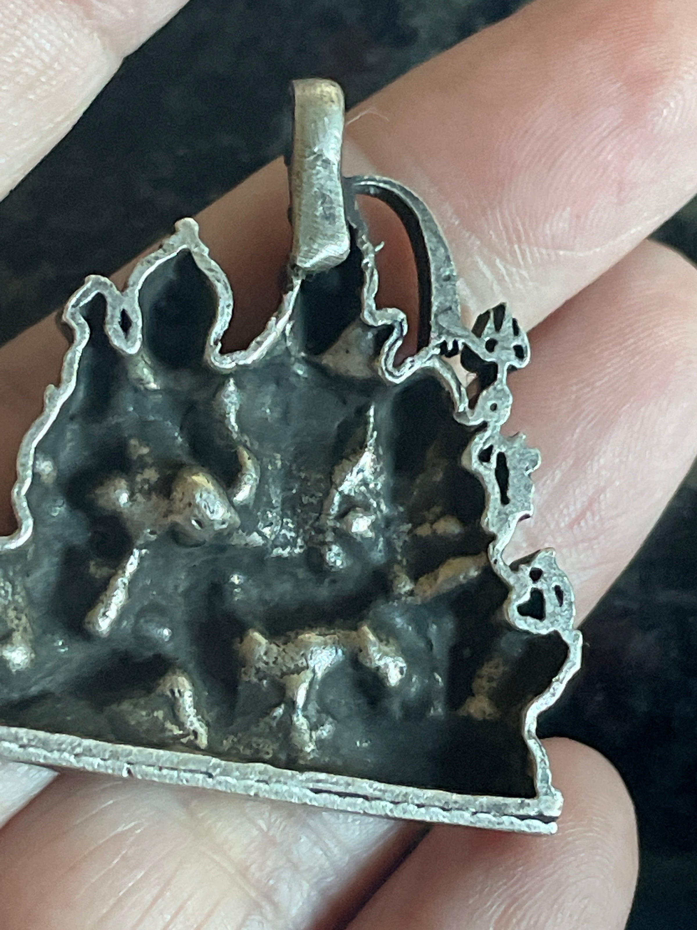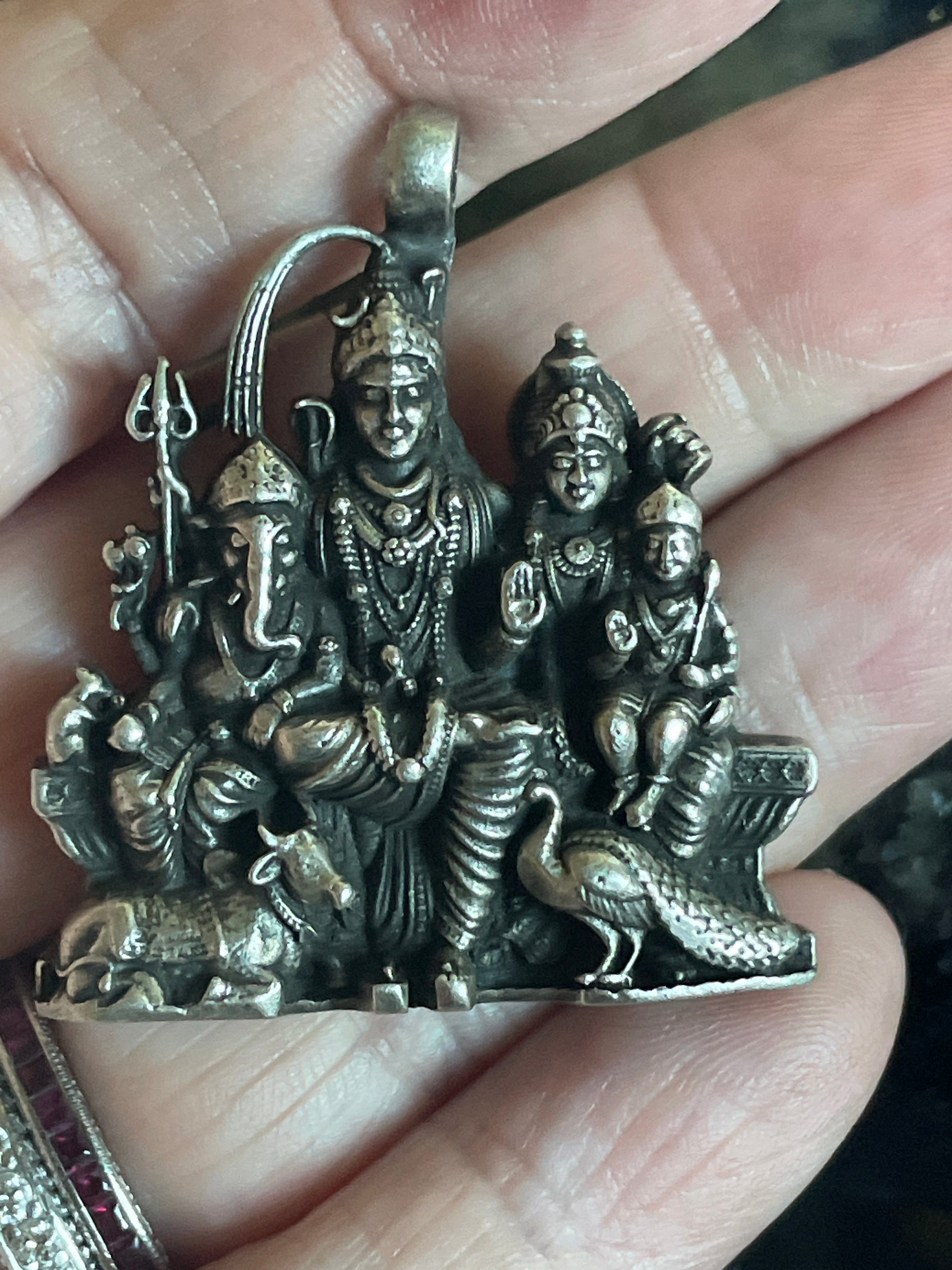 Huge heavy vintage Deity family pendant with Ganesh, Peacock and Cow.  Heavy sterling piece weighing 16.75 grams.  Unmarked sterling.  Circa 1930s.
