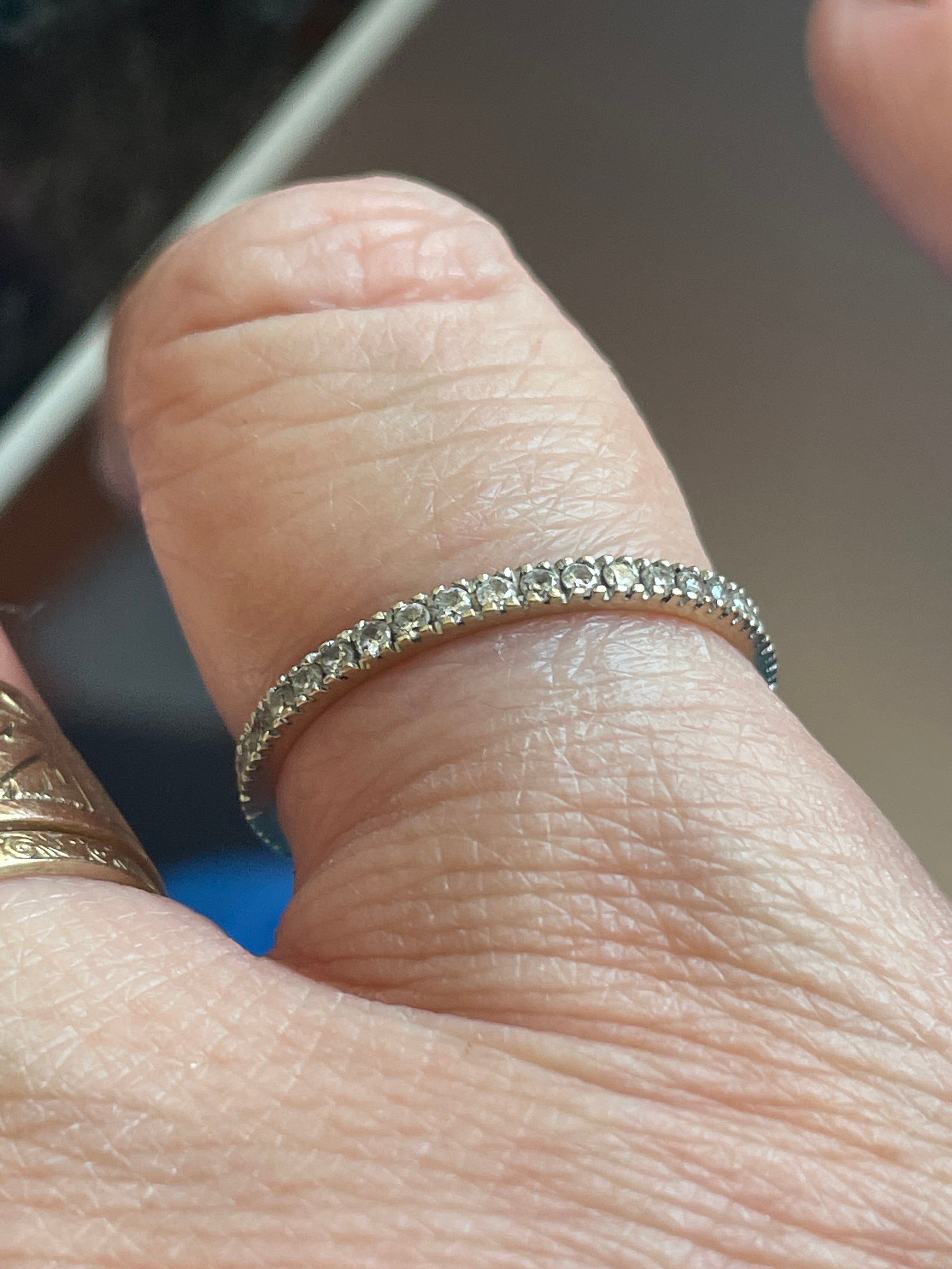 Beautiful vintage Diamond eternity band.  Thin and lovely band with Diamonds all the way around.  Stamped 14k and Mexico inside band.  Diamonds approx 1mm.  Size = 7.