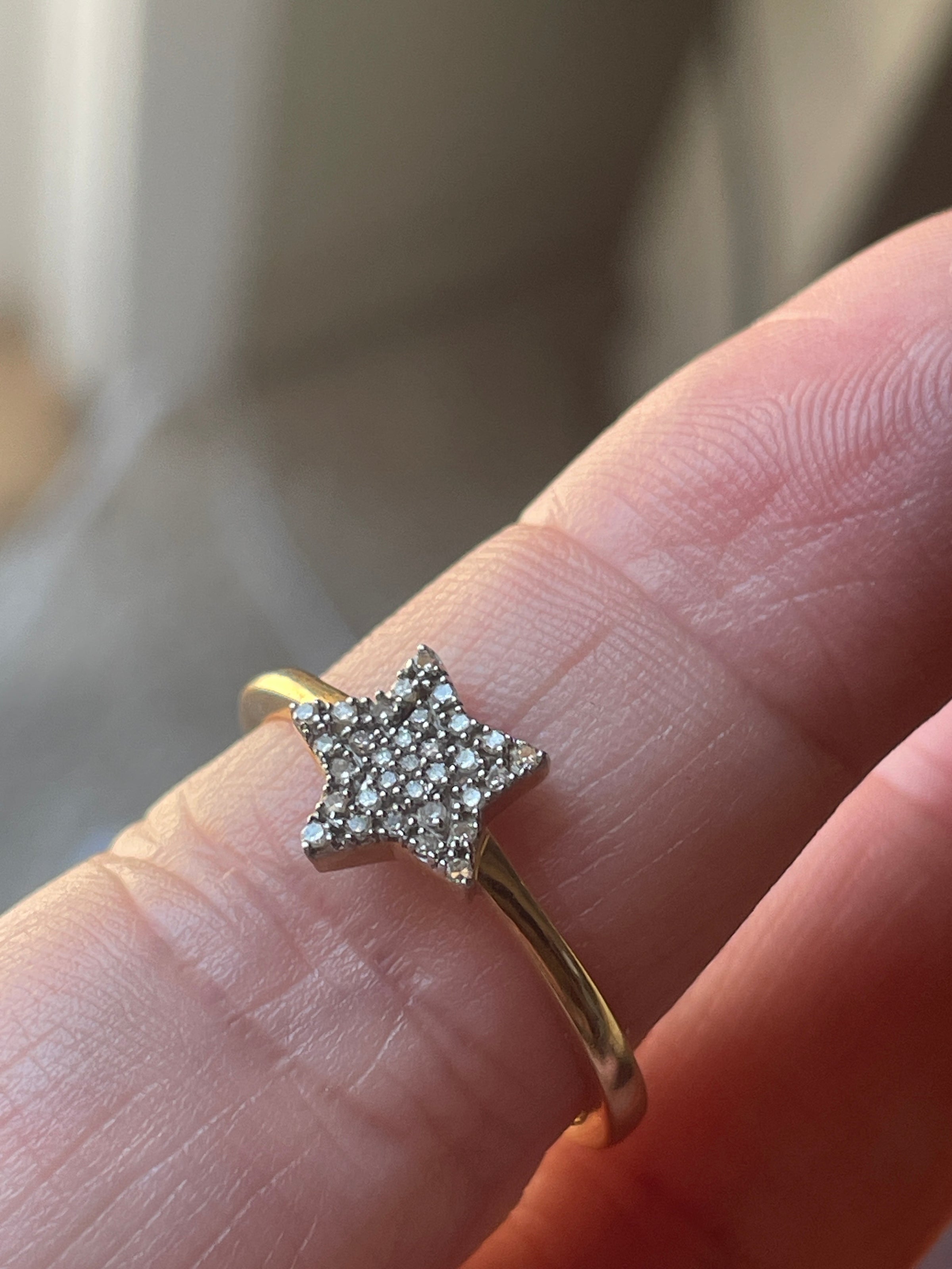 Vintage Diamond star ring in 14k gold.  Small Diamonds make up the star.  Size = 7.75.  Stamped 14k inside ring band.  Also stamped India.