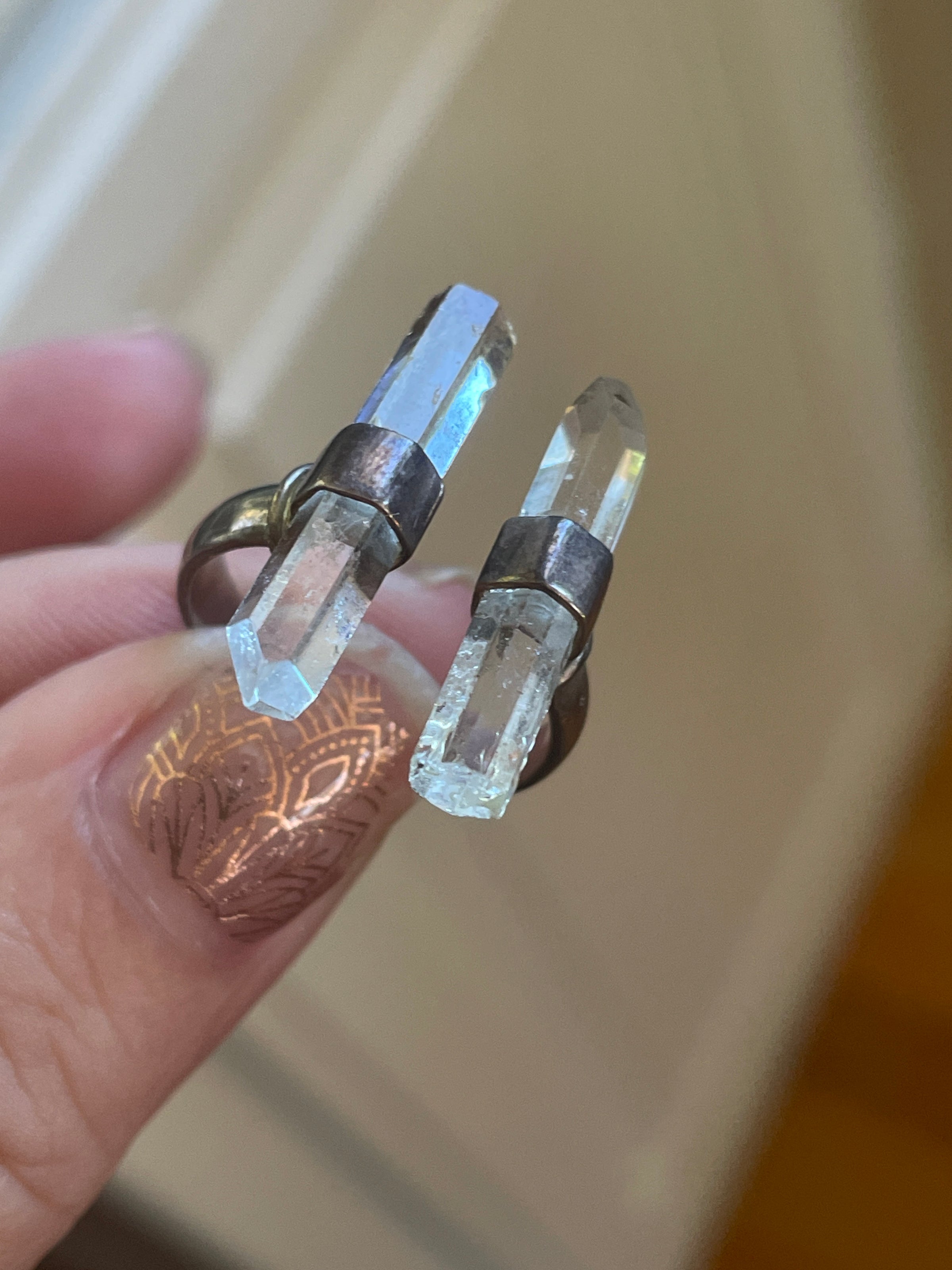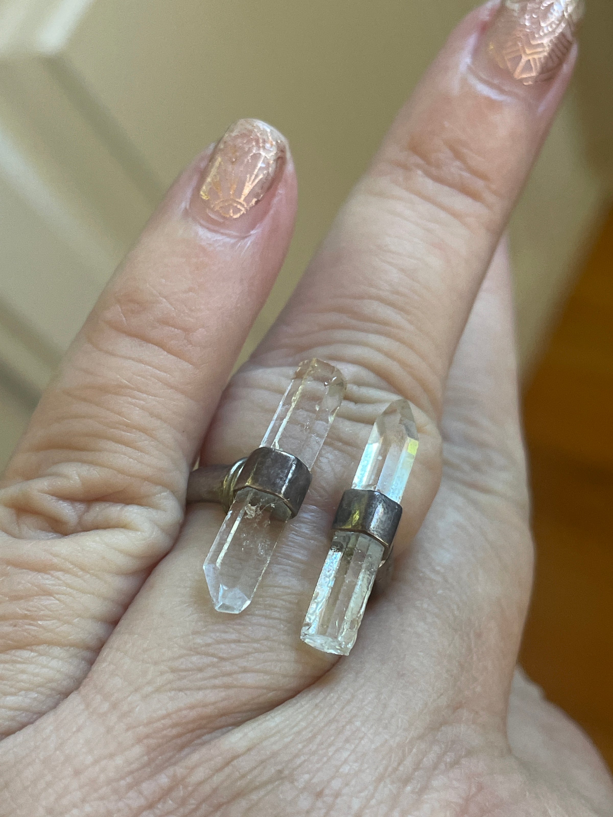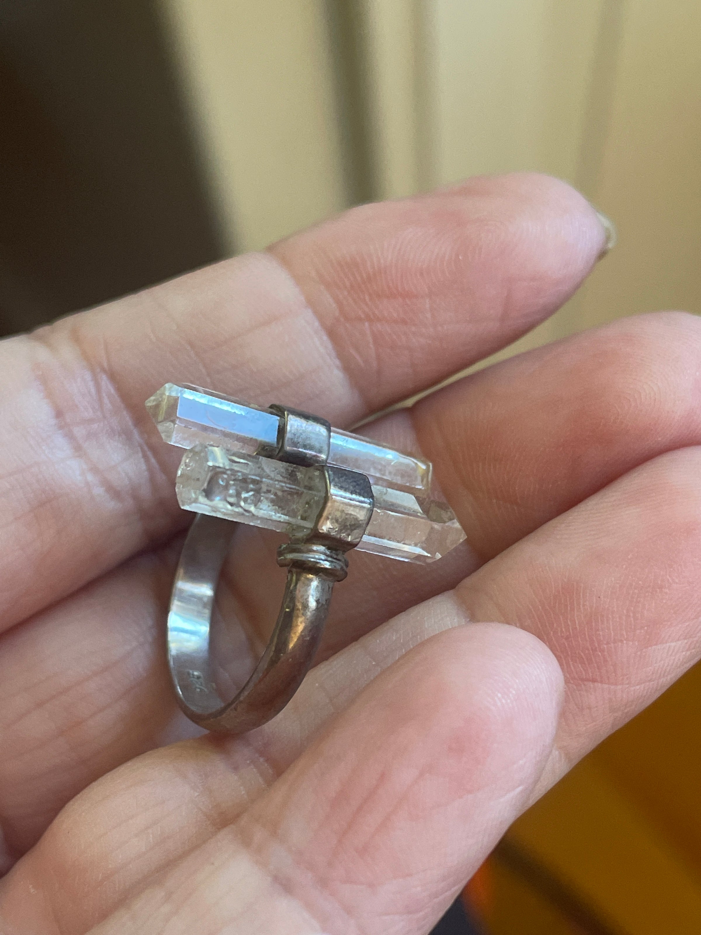 Fabulous double point crystal ring with points pointing in opposing ways. Has open setting so can fit slightly larger than current size which is 6.25. Some wear to crystals. Stamped 925 for sterling.