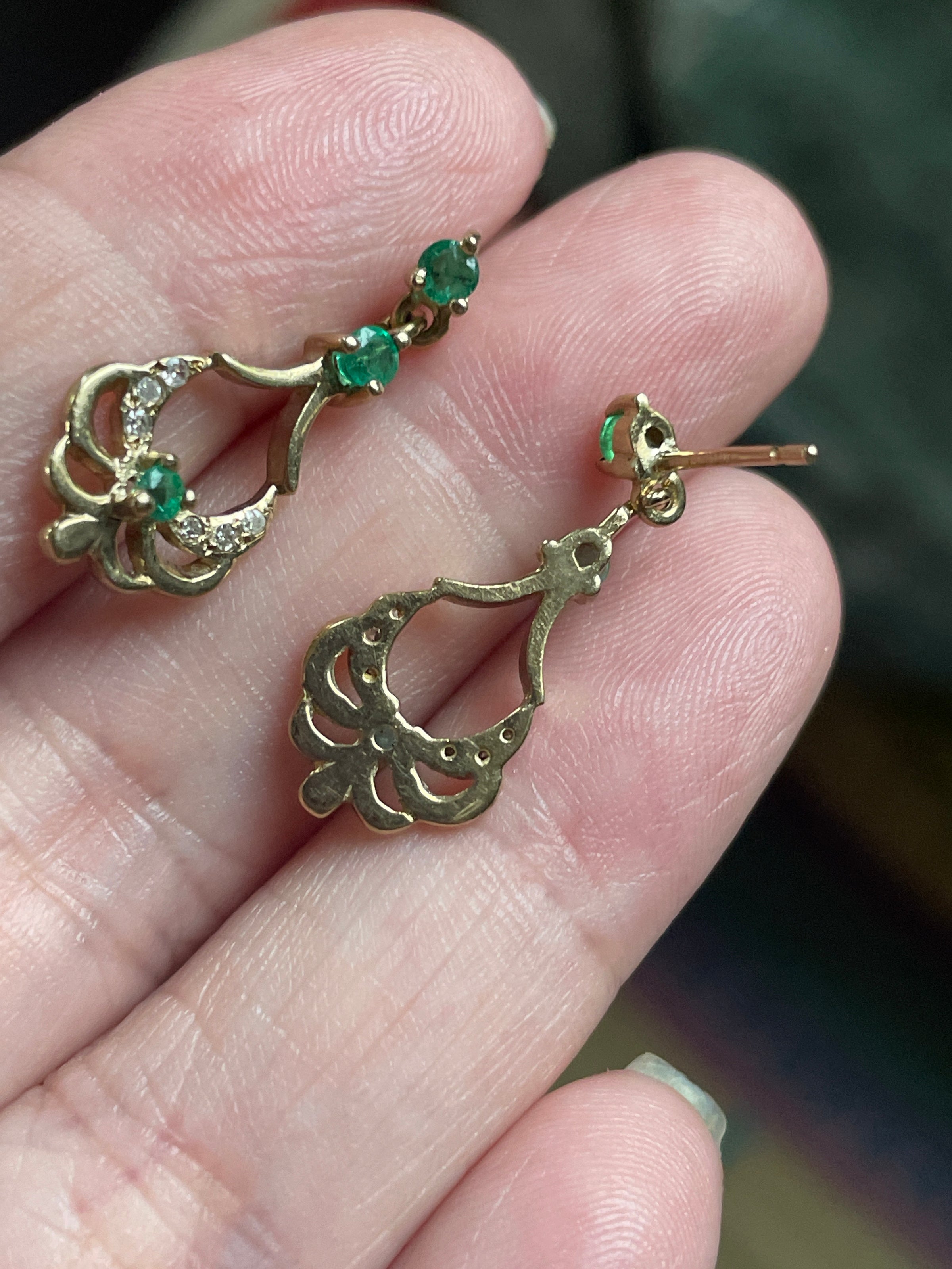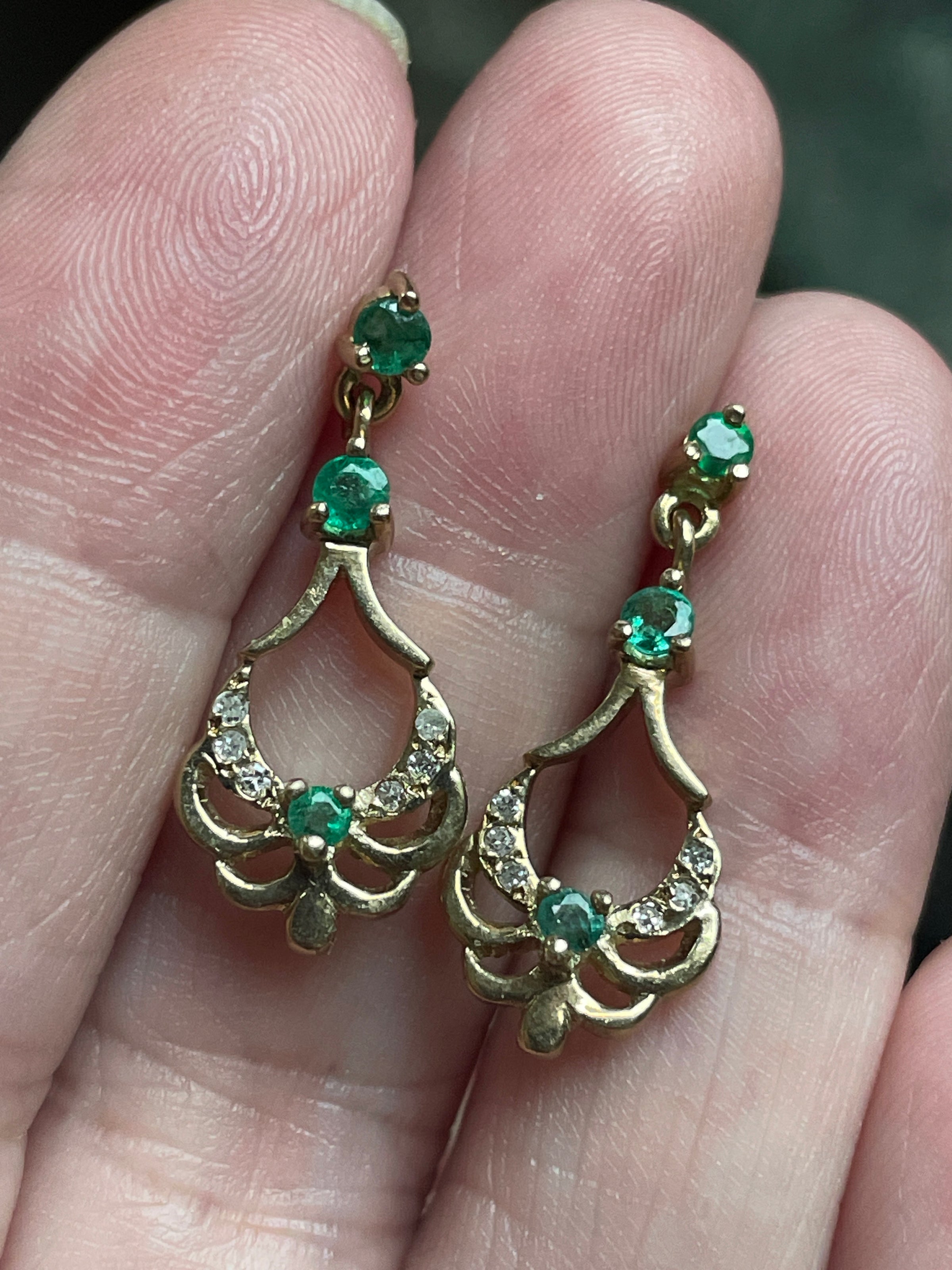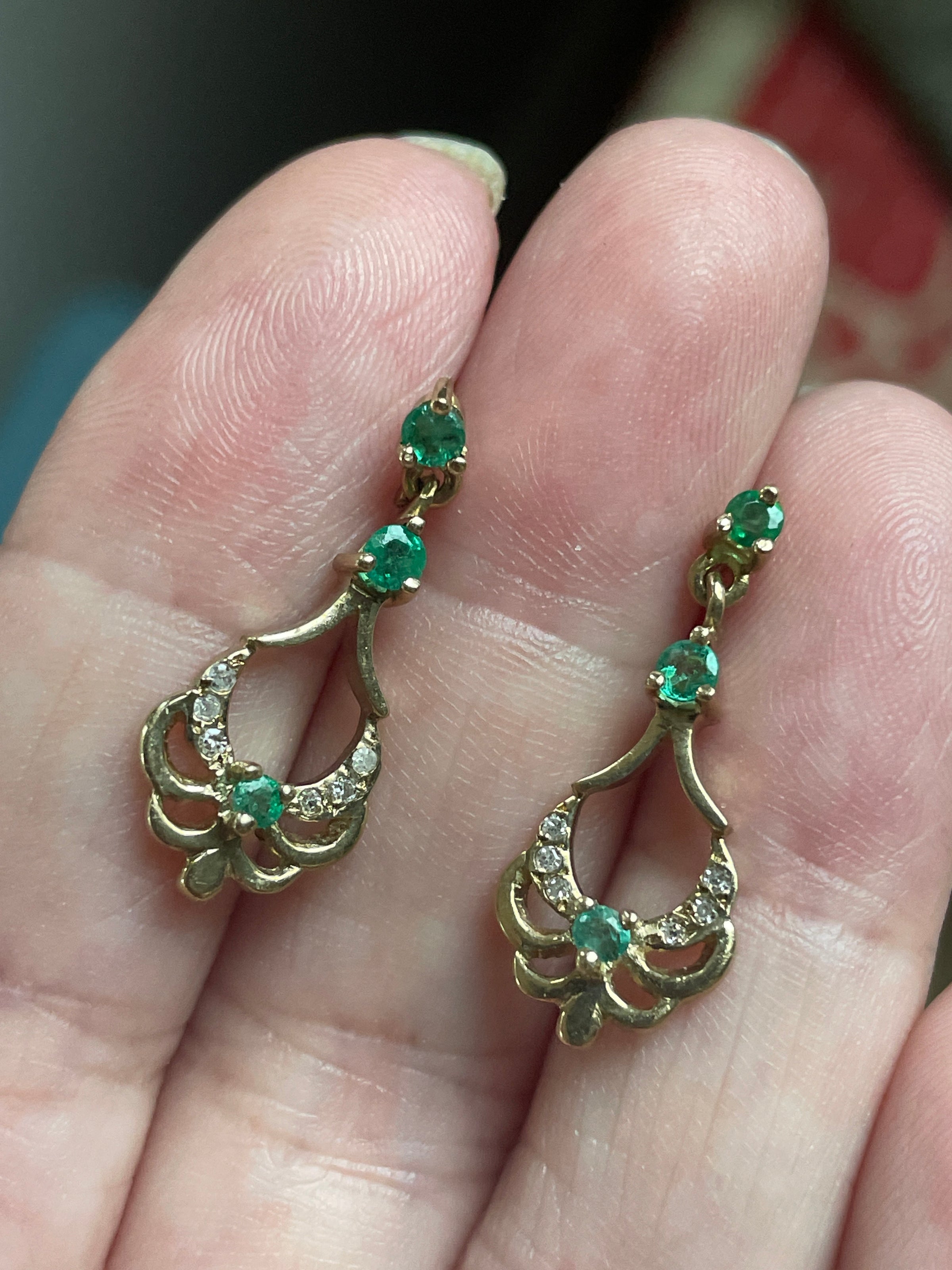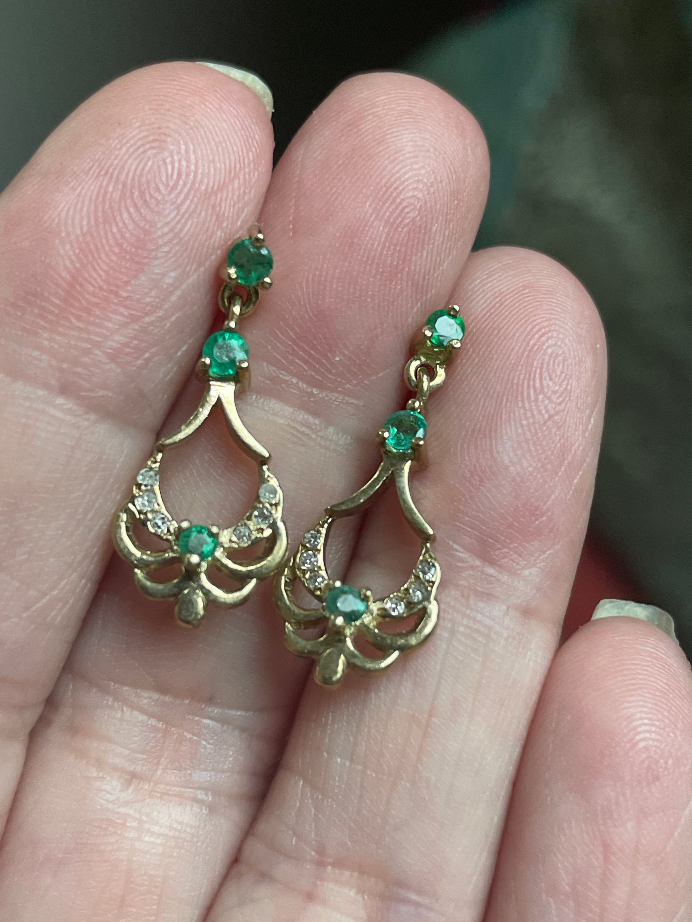 Stunning Emerald Diamond drop earrings in 9k gold. Such beautiful design. Perfect for daily wear or evenings out. Earrings measure just under 1 inch. Full British hallmarks including 375 for 9k.