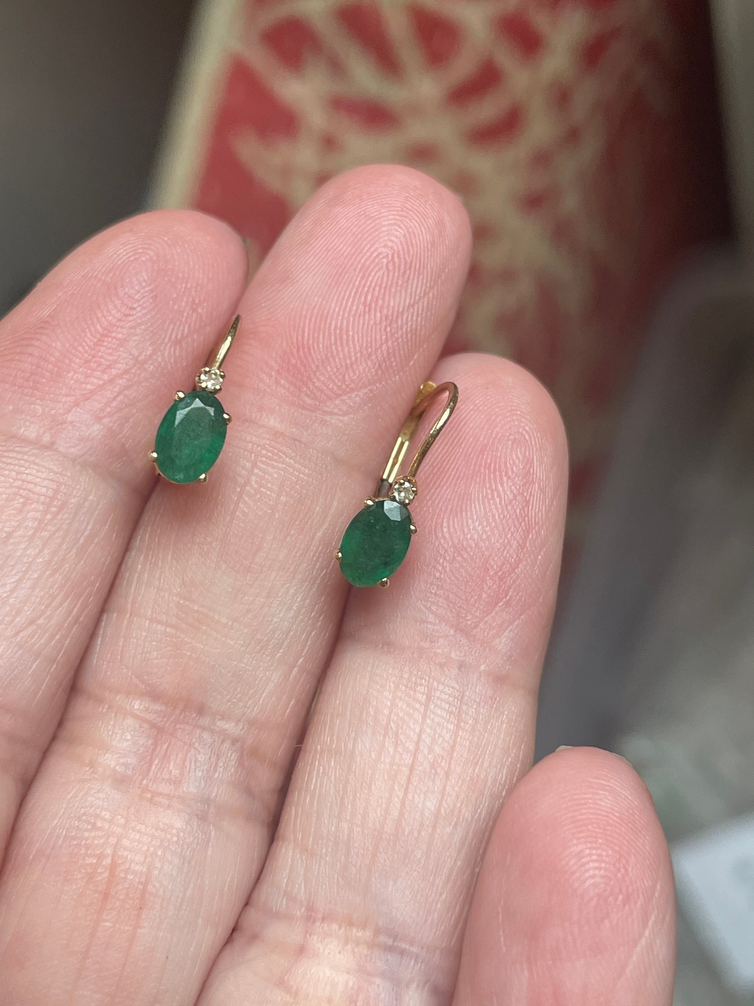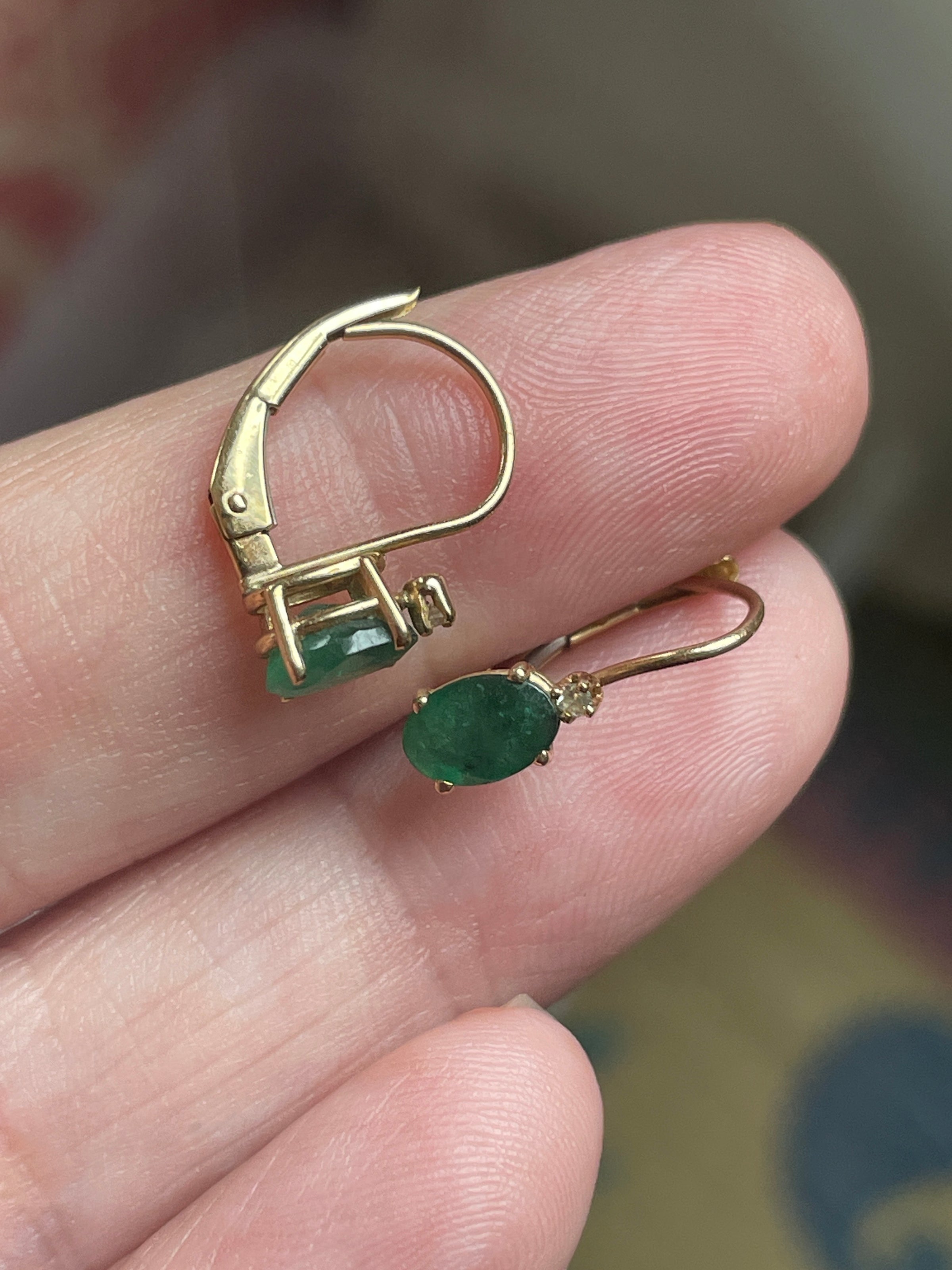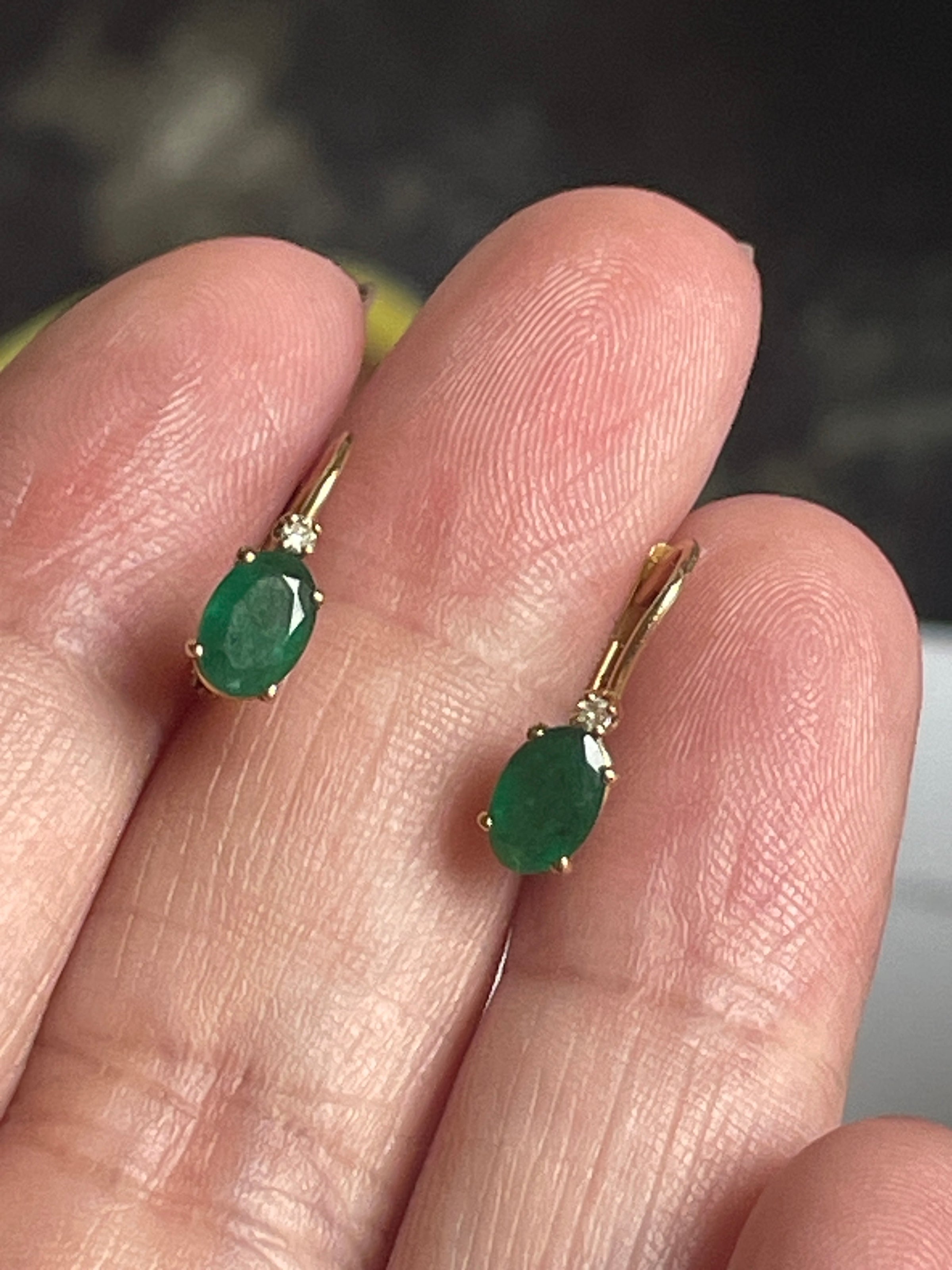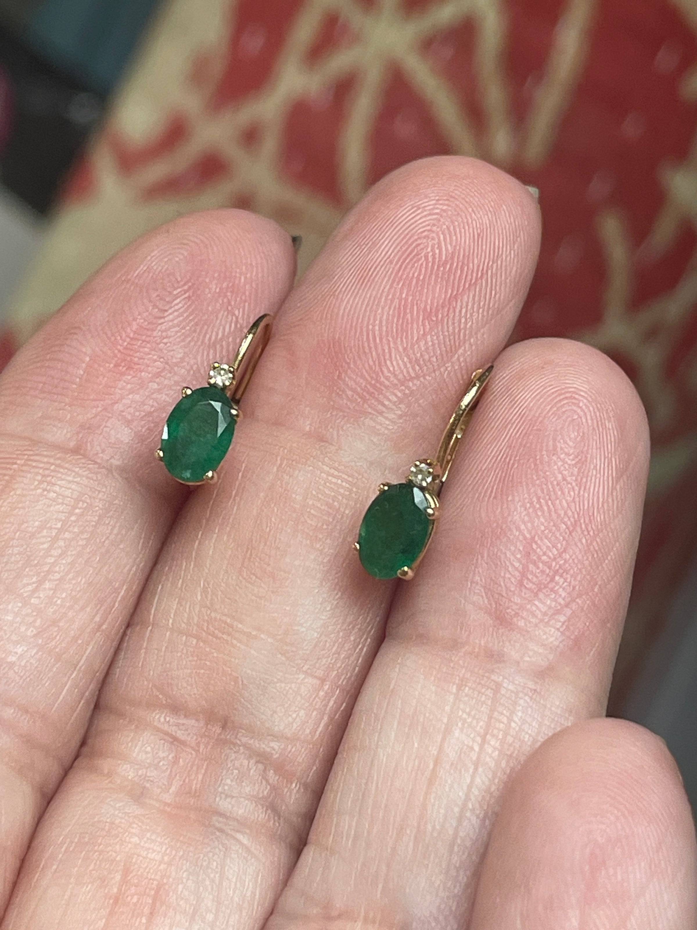 Gorgeous vintage Emerald Diamond leverback earrings in 10k gold. Emeralds measure approx 6mm x 4mm. Earrings are just under 0.5 inches. Stamped 10k. The color on these stones is beautiful!