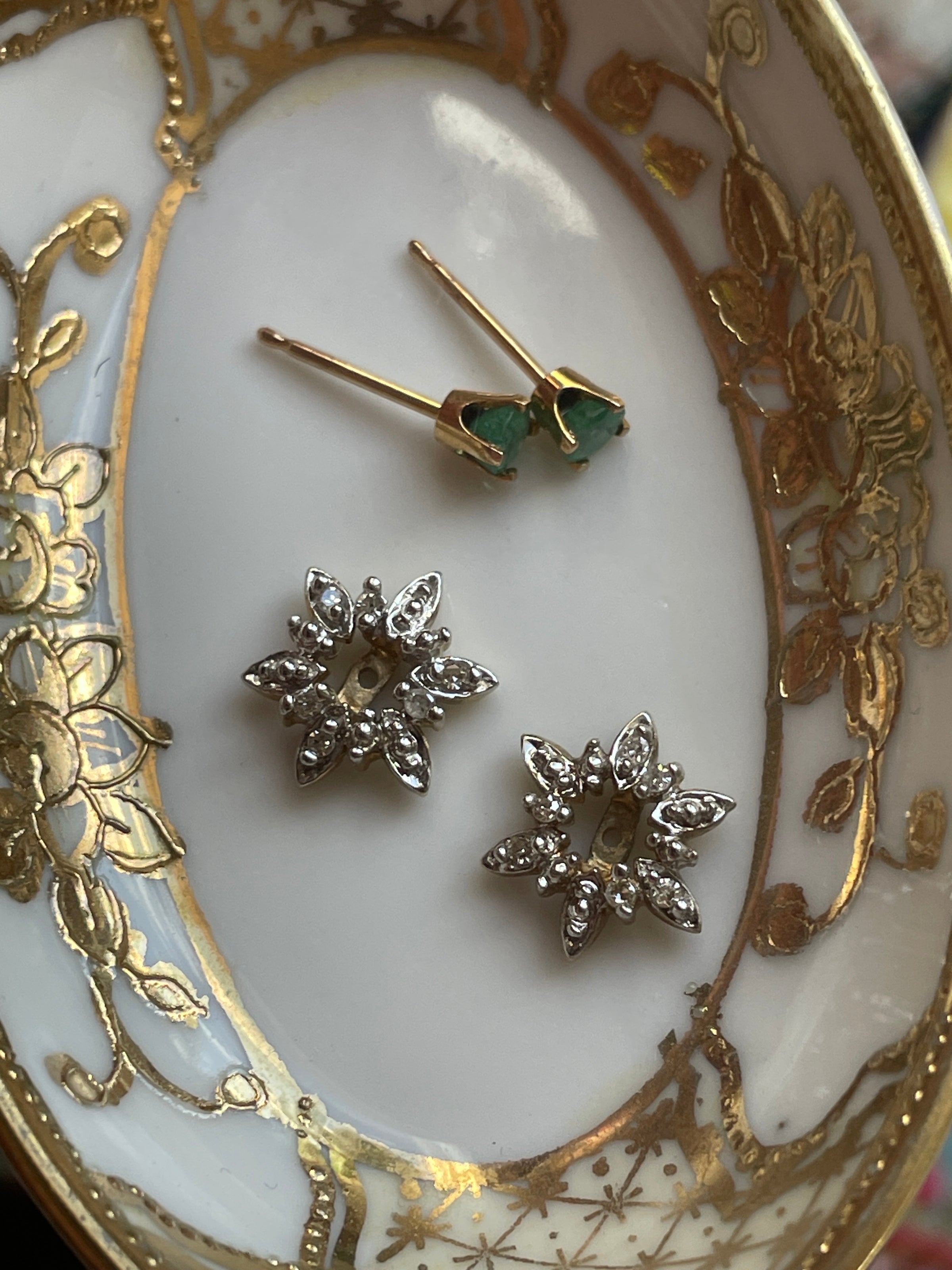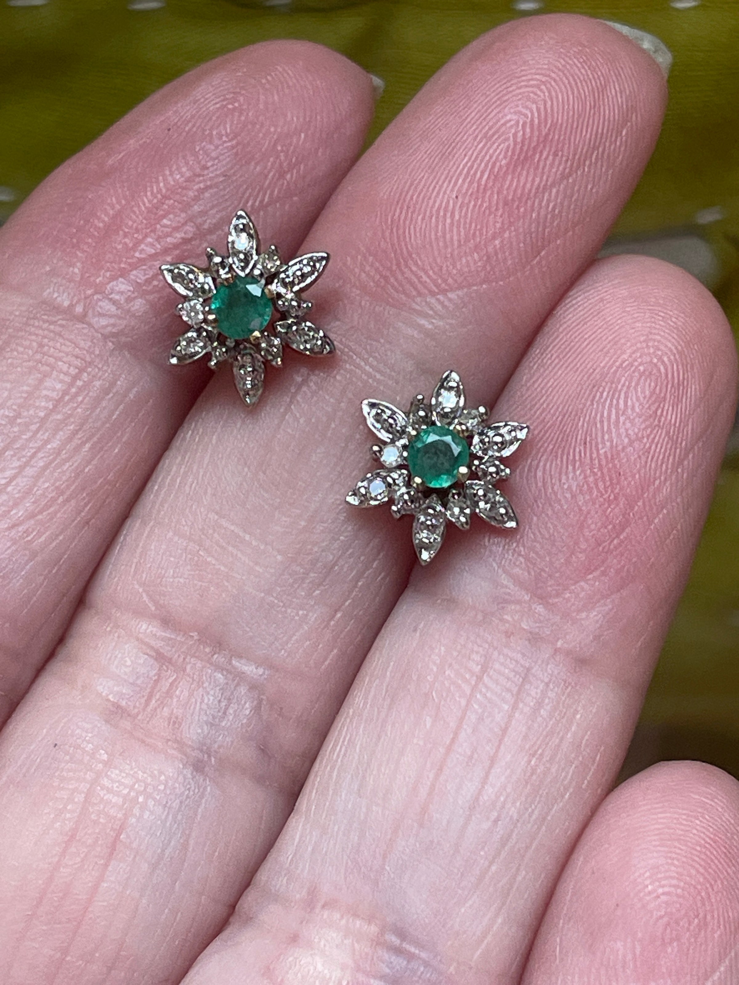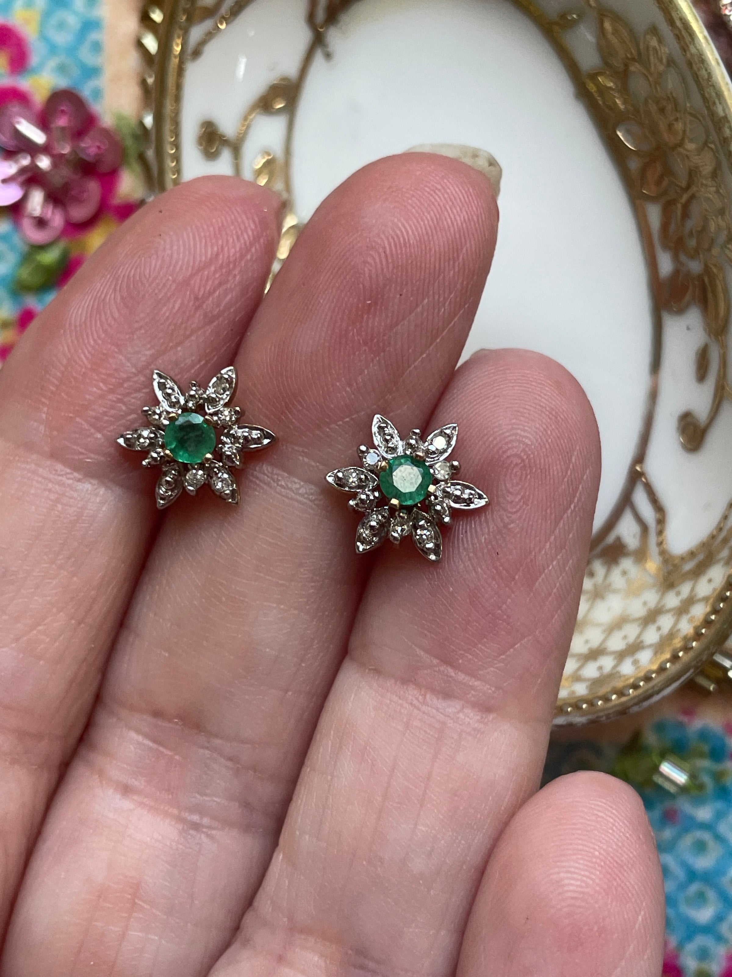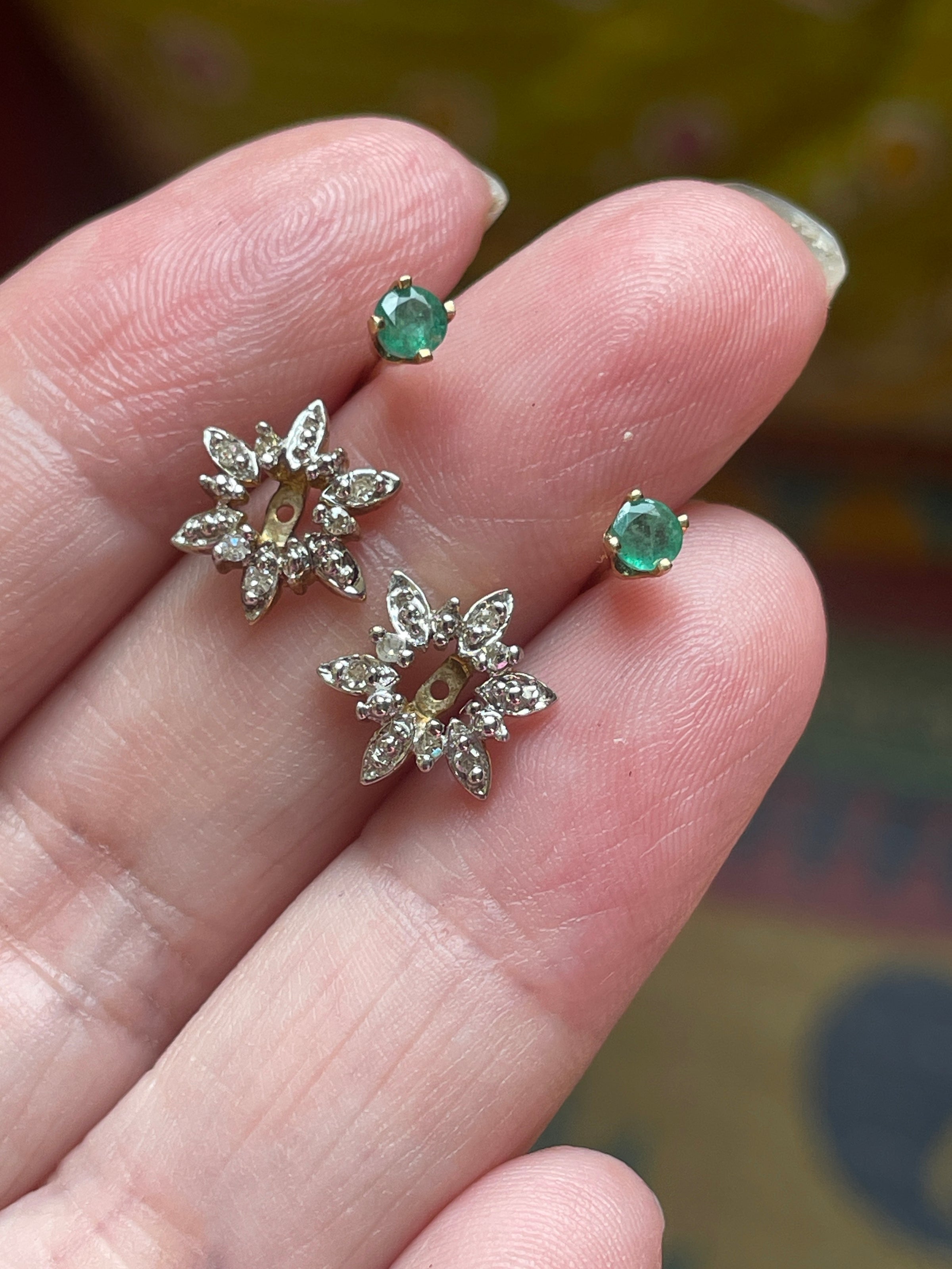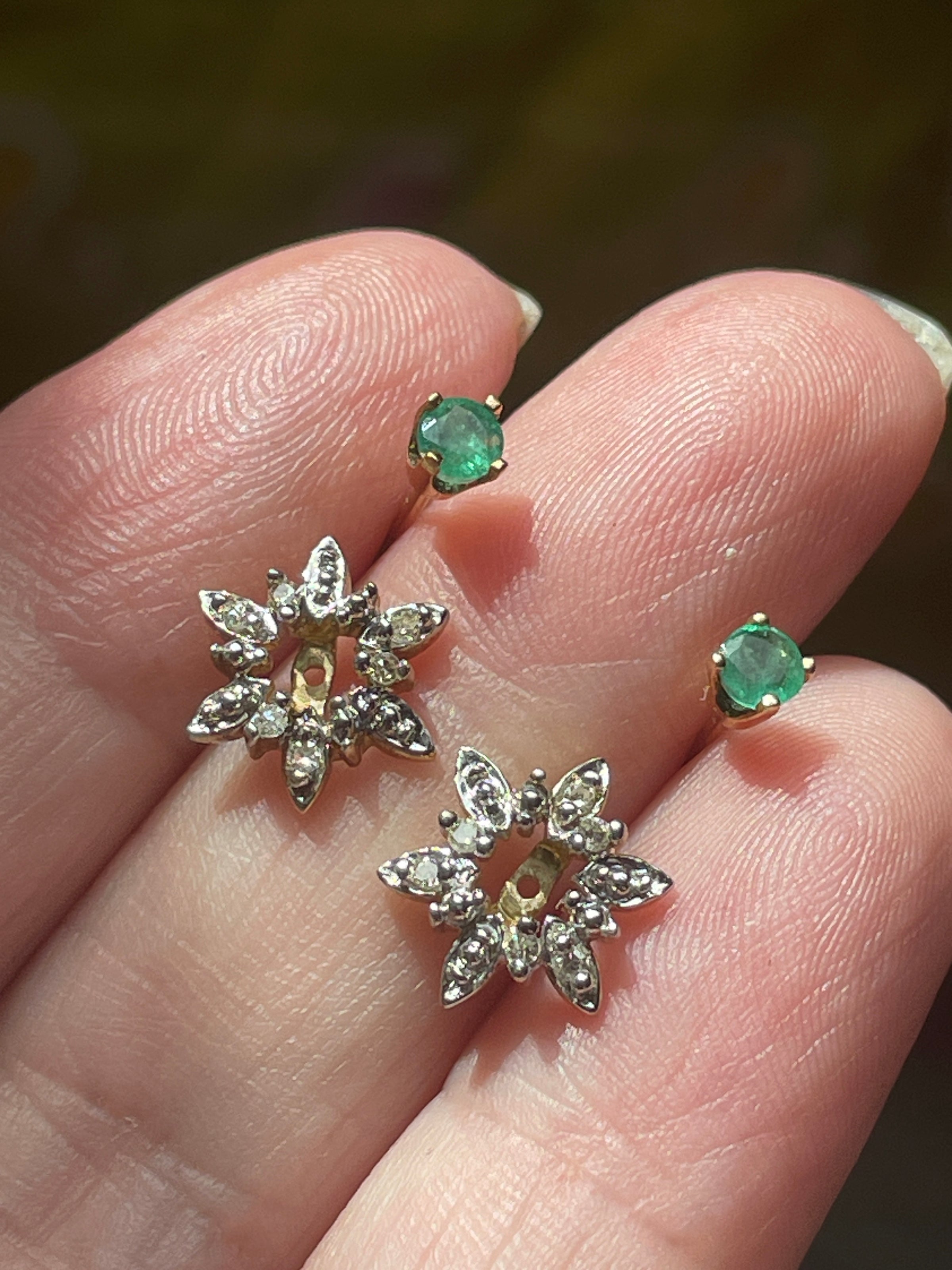 Vintage Emerald stud earrings with removable Diamond Star jackets. Can be worn together or separately. Emerald Stud earrings measure 3mm. Star jackets measure 9mm across. Earrings stamped 10k on posts and on back of the Diamond star jackets.