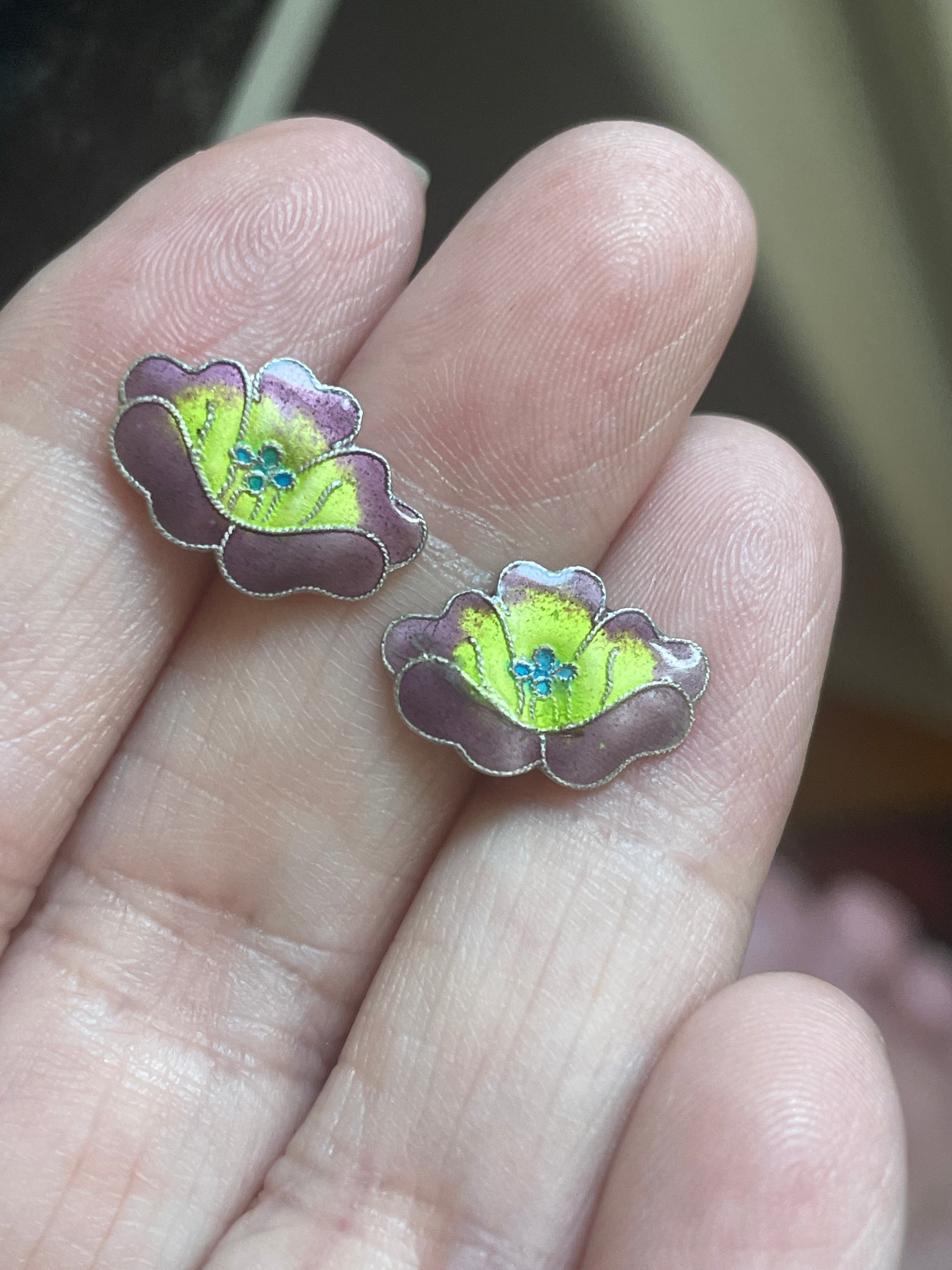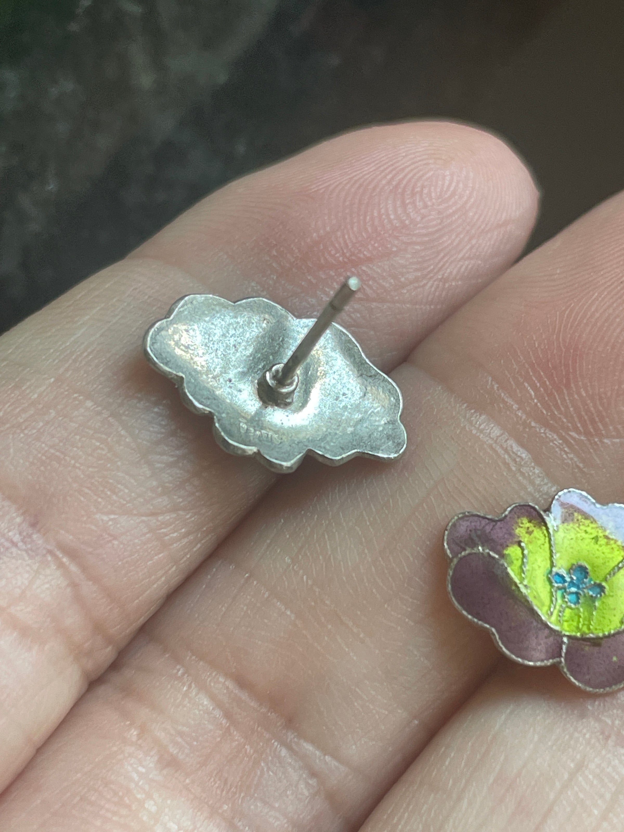 Beautiful vintage two tone enamel stud earrings in sterling silver. Earrings measure approx 15mm x 9mm across. Stamped Silver on the earrings themselves and Silver on backs.