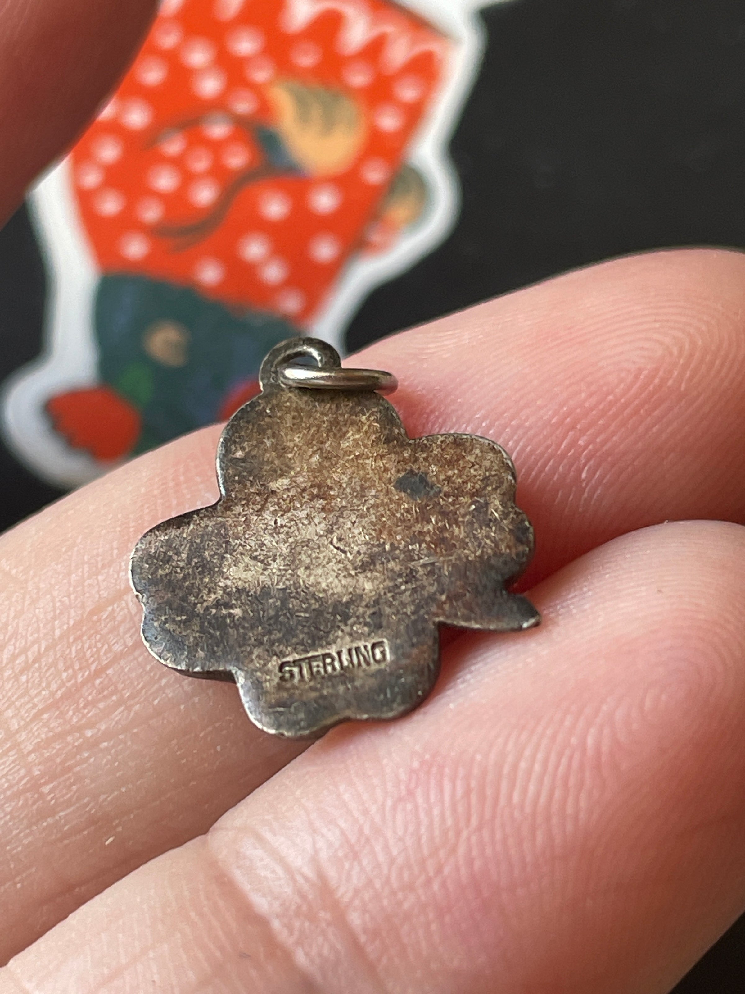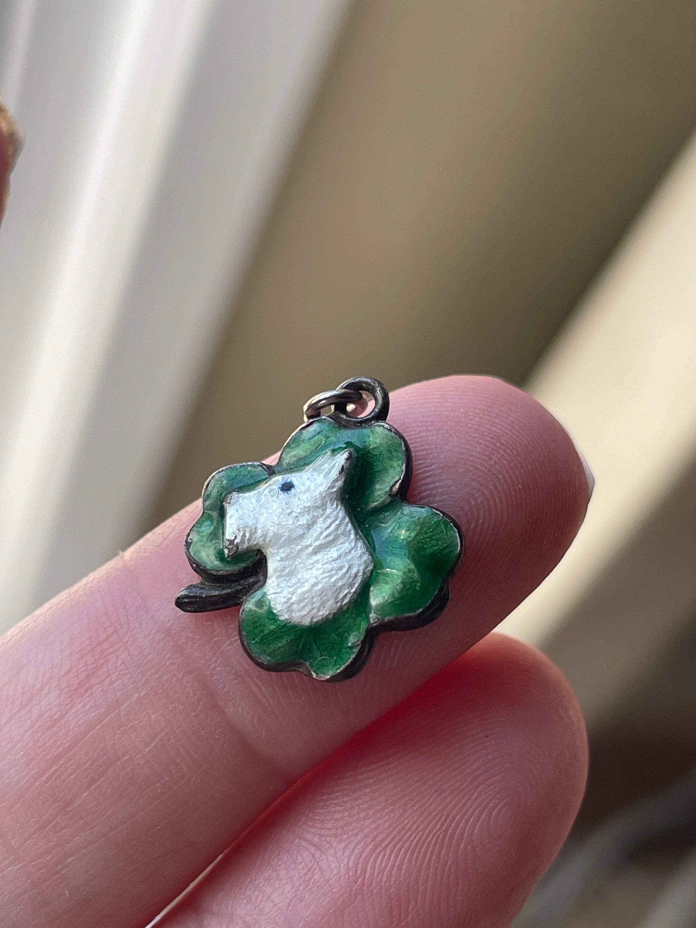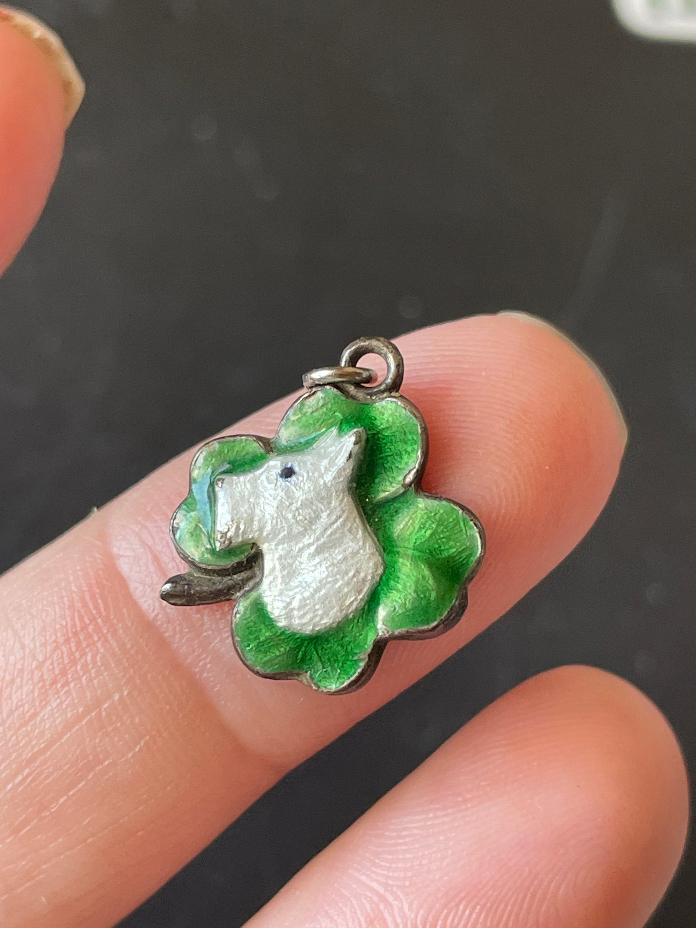 Adorable early antique Westie dog charm with Clover behind head for luck. Measures 0.75 inches with top loop. Stamped “Sterling” on back.