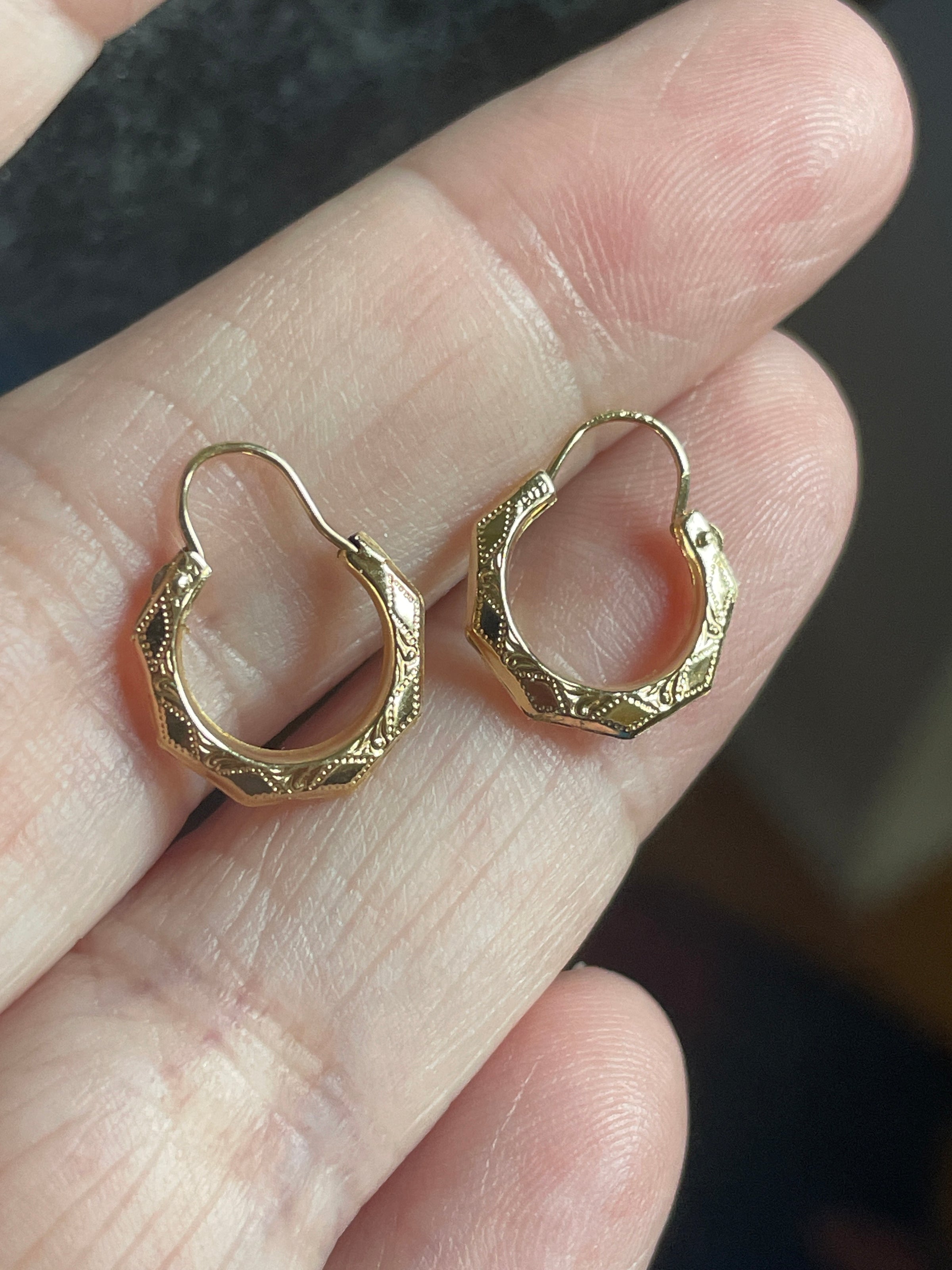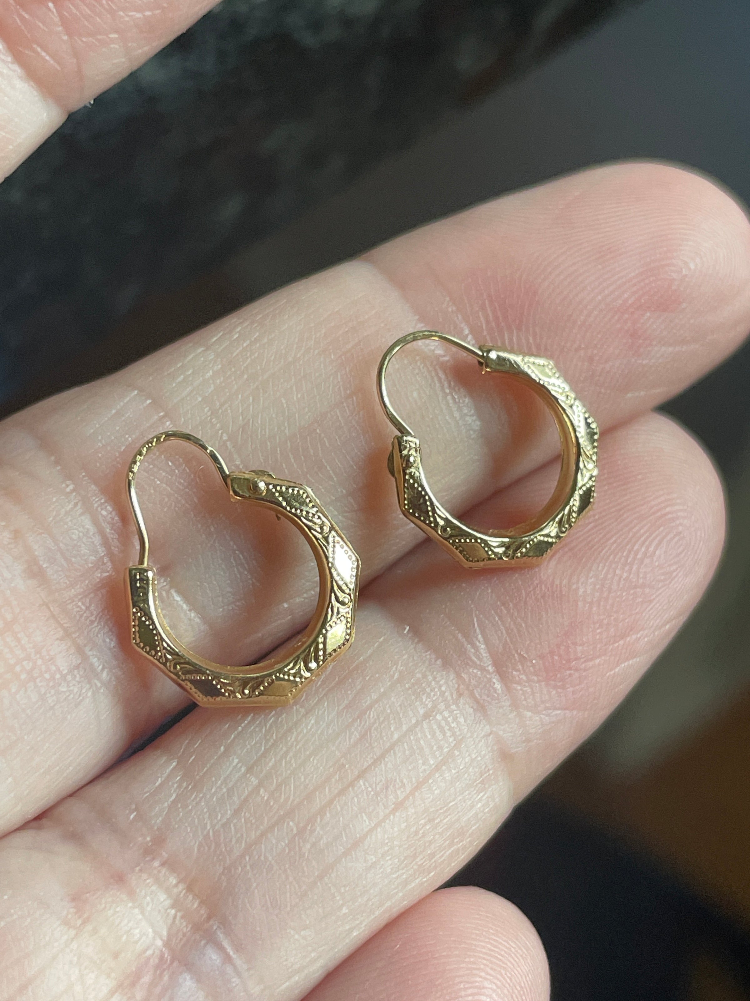 Gorgeous dainty engraved 14k gold hoops. These measure approx 13mm. Patterned on both sides. Super small markings on earwires for 14k.