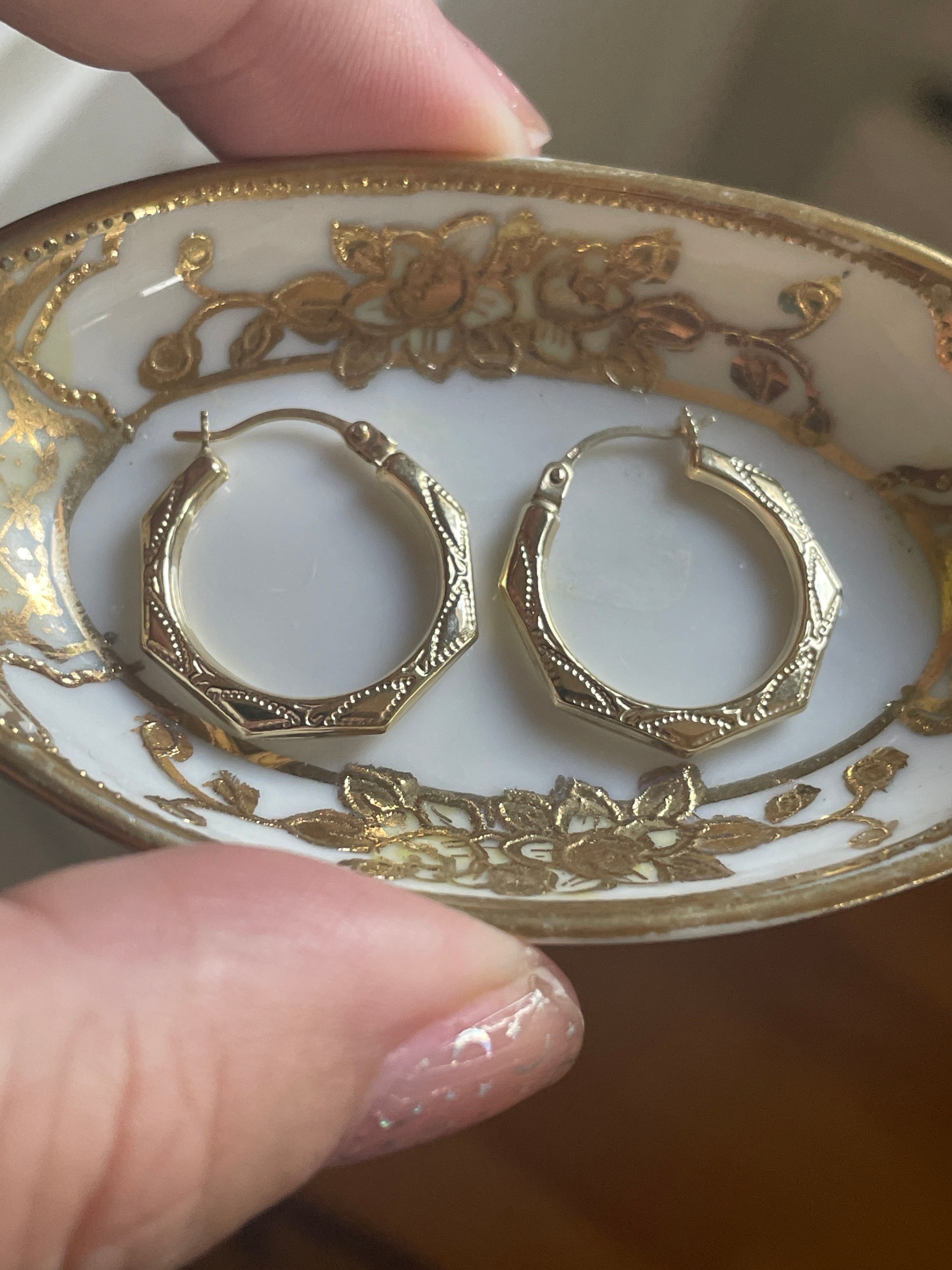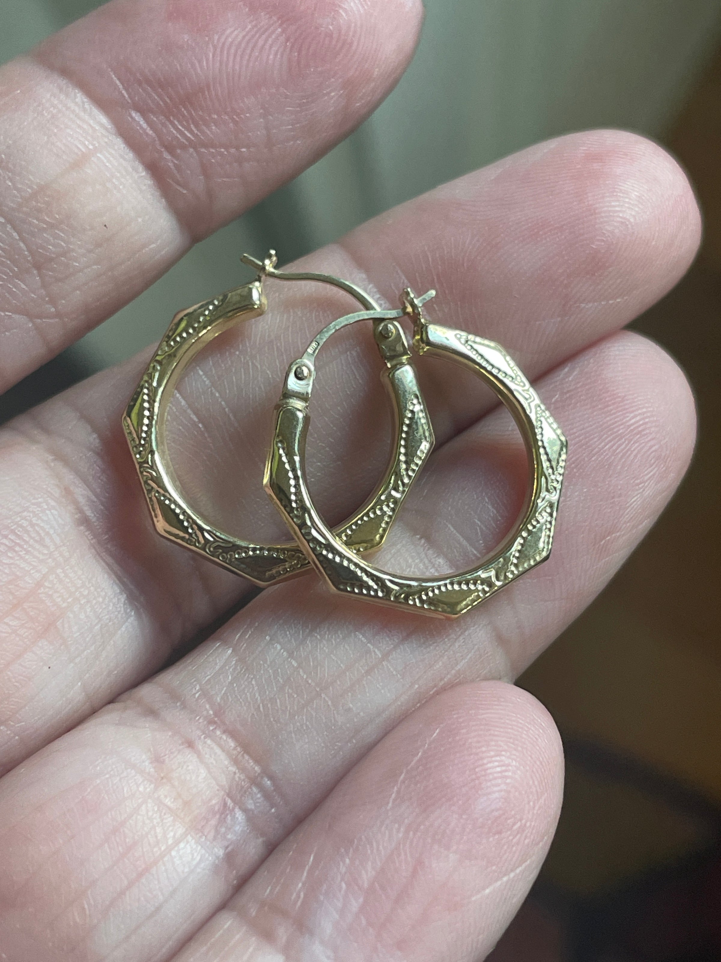 Fabulous larger vintage engraved 10k gold hoops with angled design. They measure approx 0.75 inches. Stamped 10k on earwires.