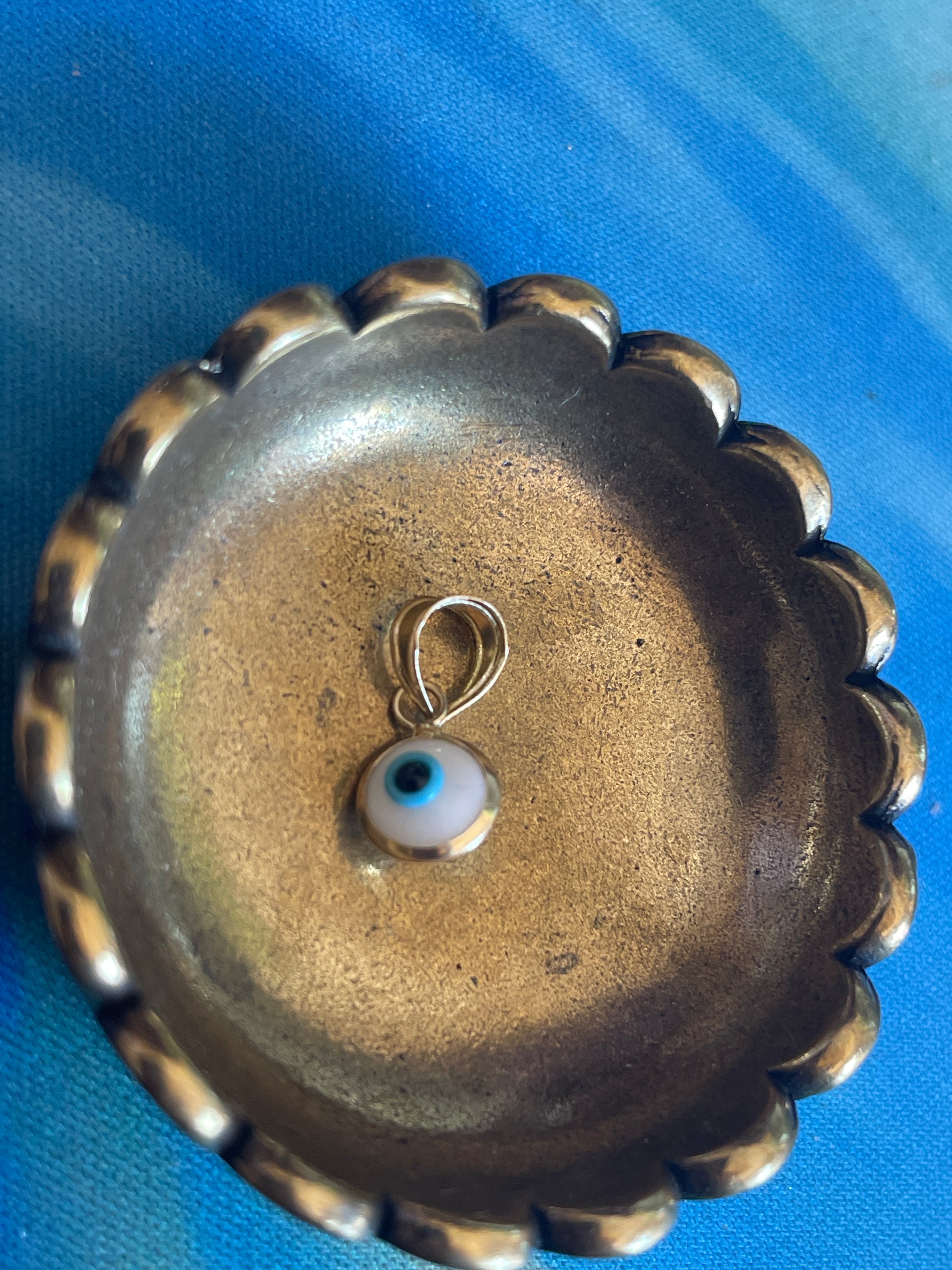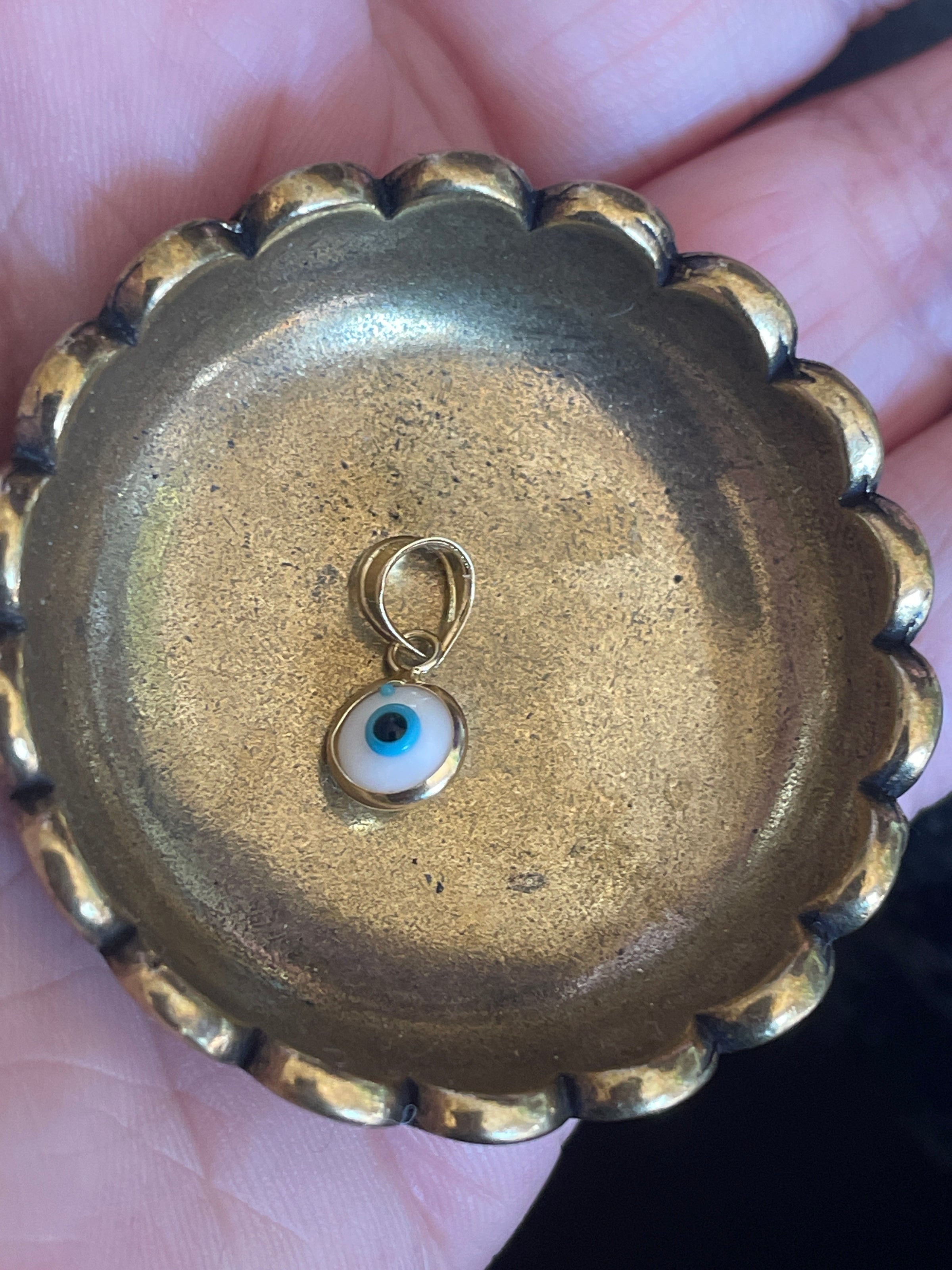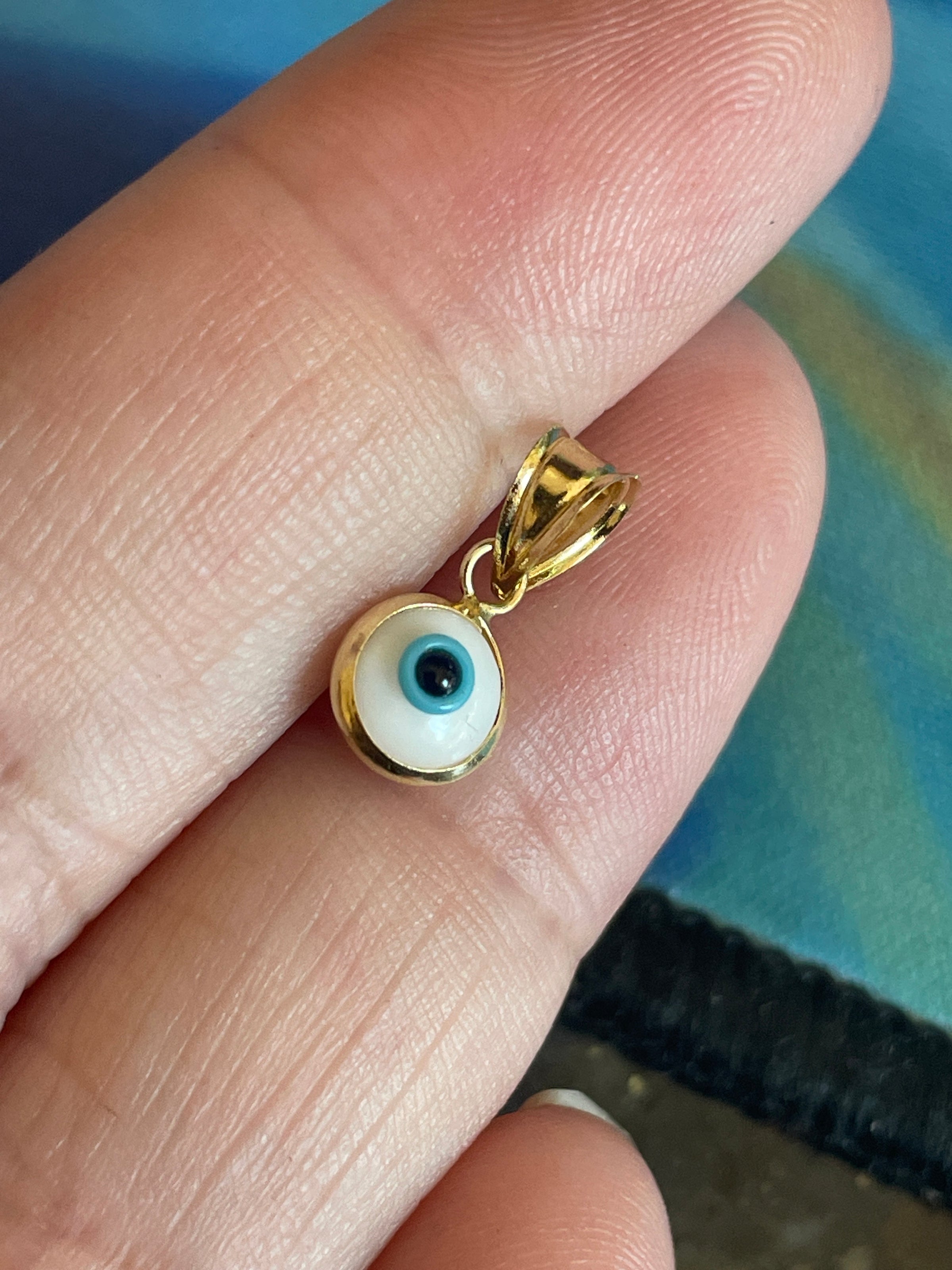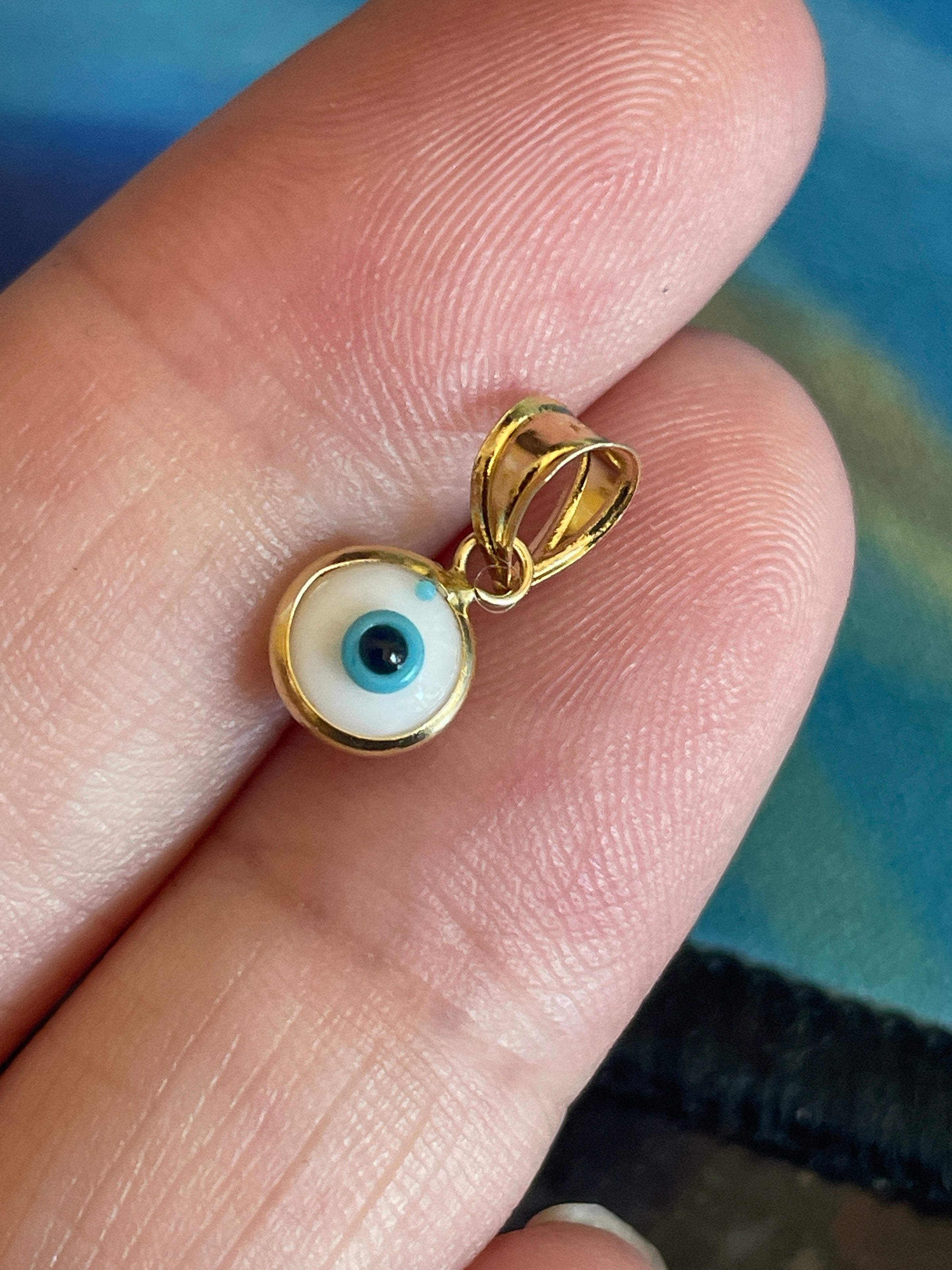 Vintage evil eye protection pendant in 14k gold. Measures just under 0.5 inches with bail. One side has an extra blue dot on the top of the eye mentioning for accuracy. Bail stamped 14k.