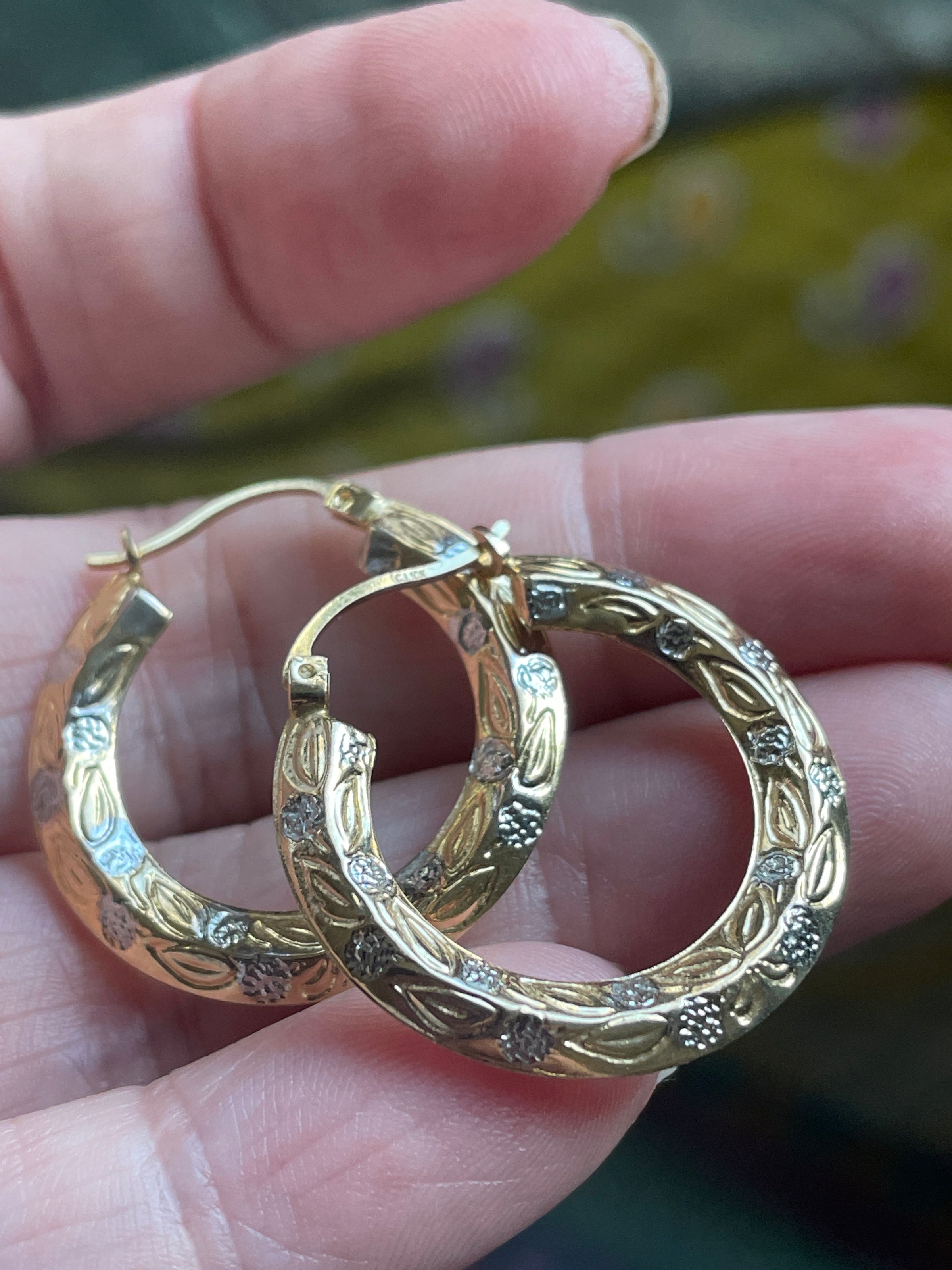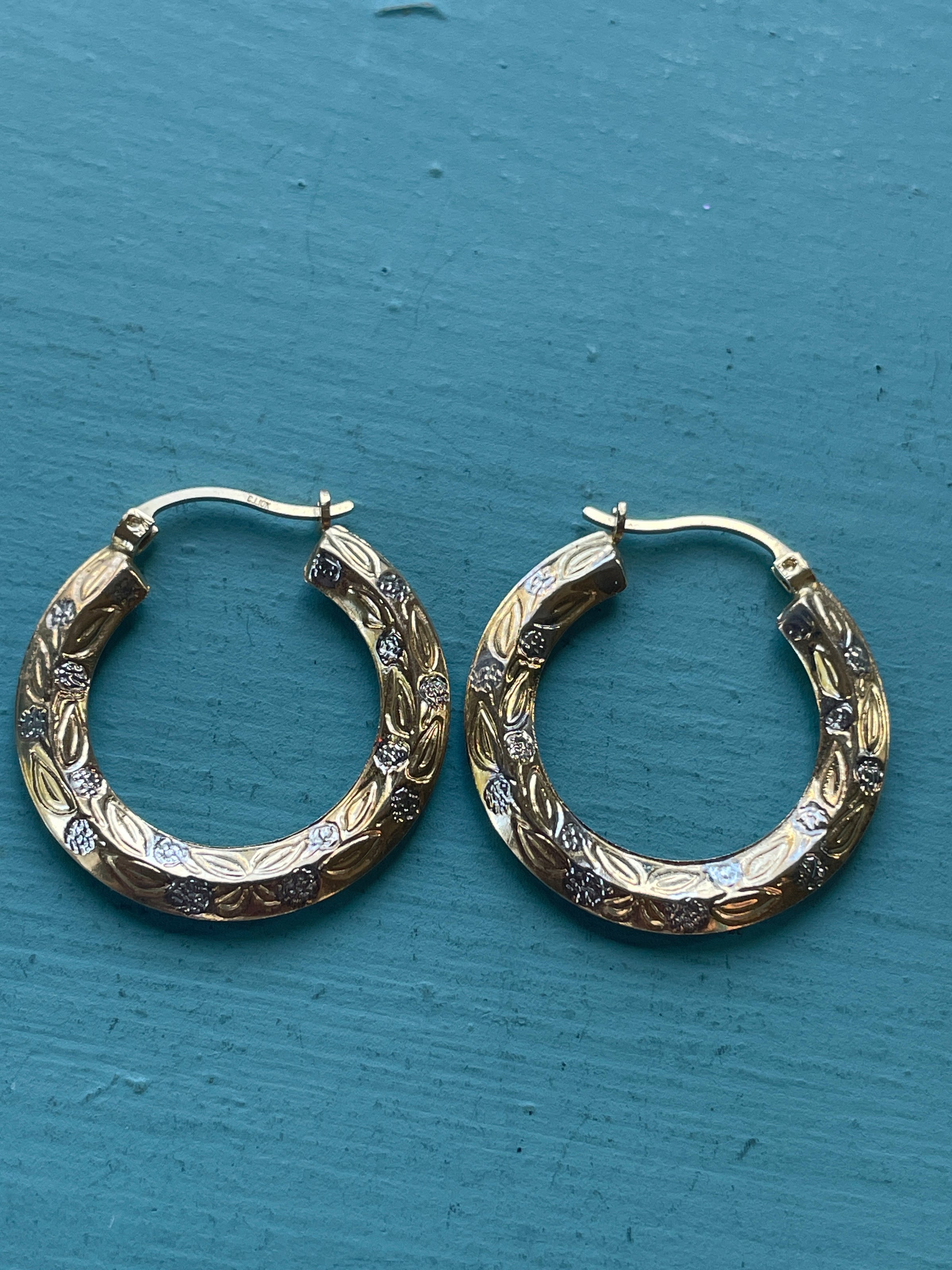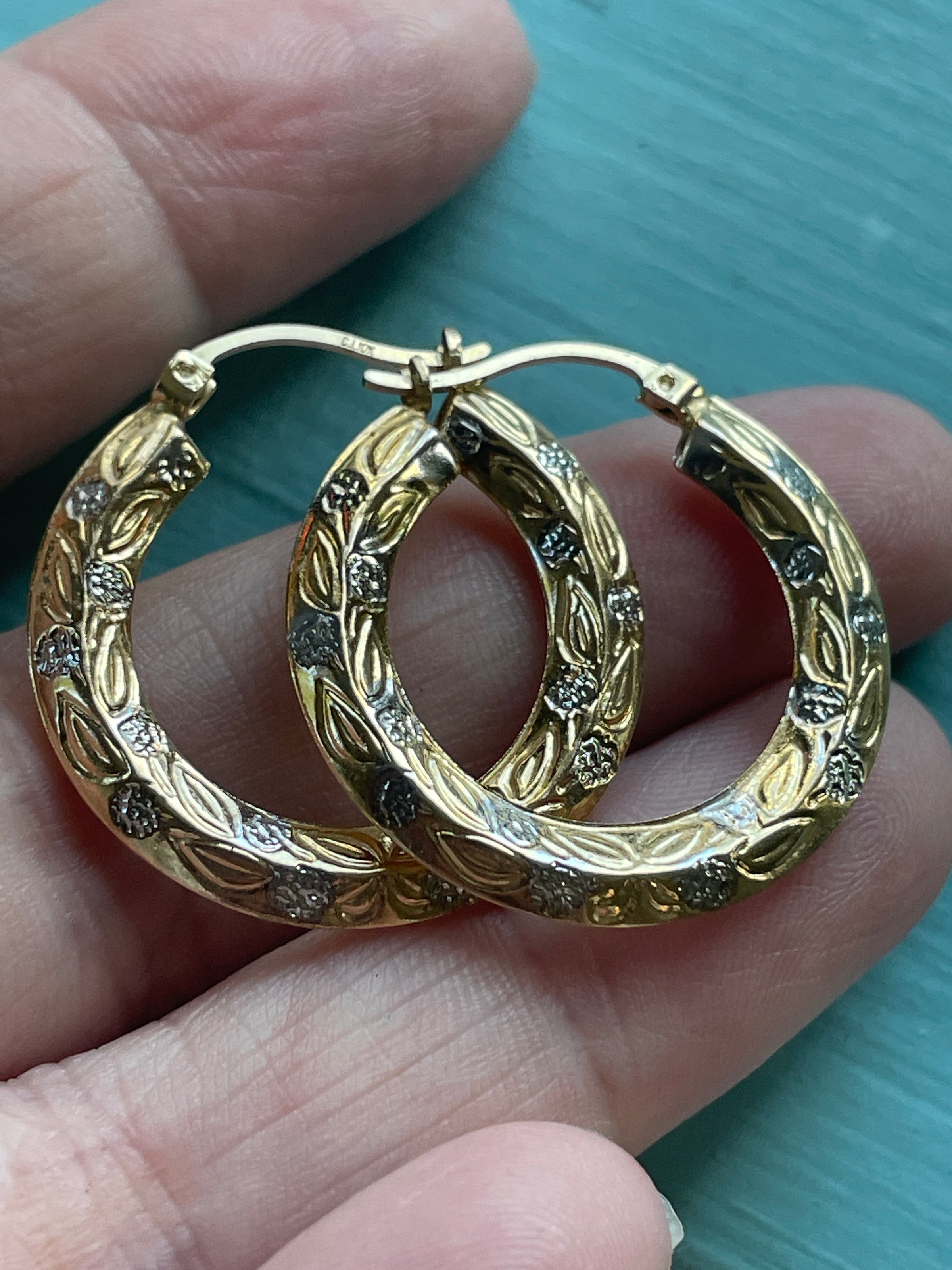 Really rare vintage hoop earrings with engraved white gold flowers and yellow gold leaves. These measure approx 1 inch. Stamped 10k on earwires. Lightweight and comfortable for daily wear.