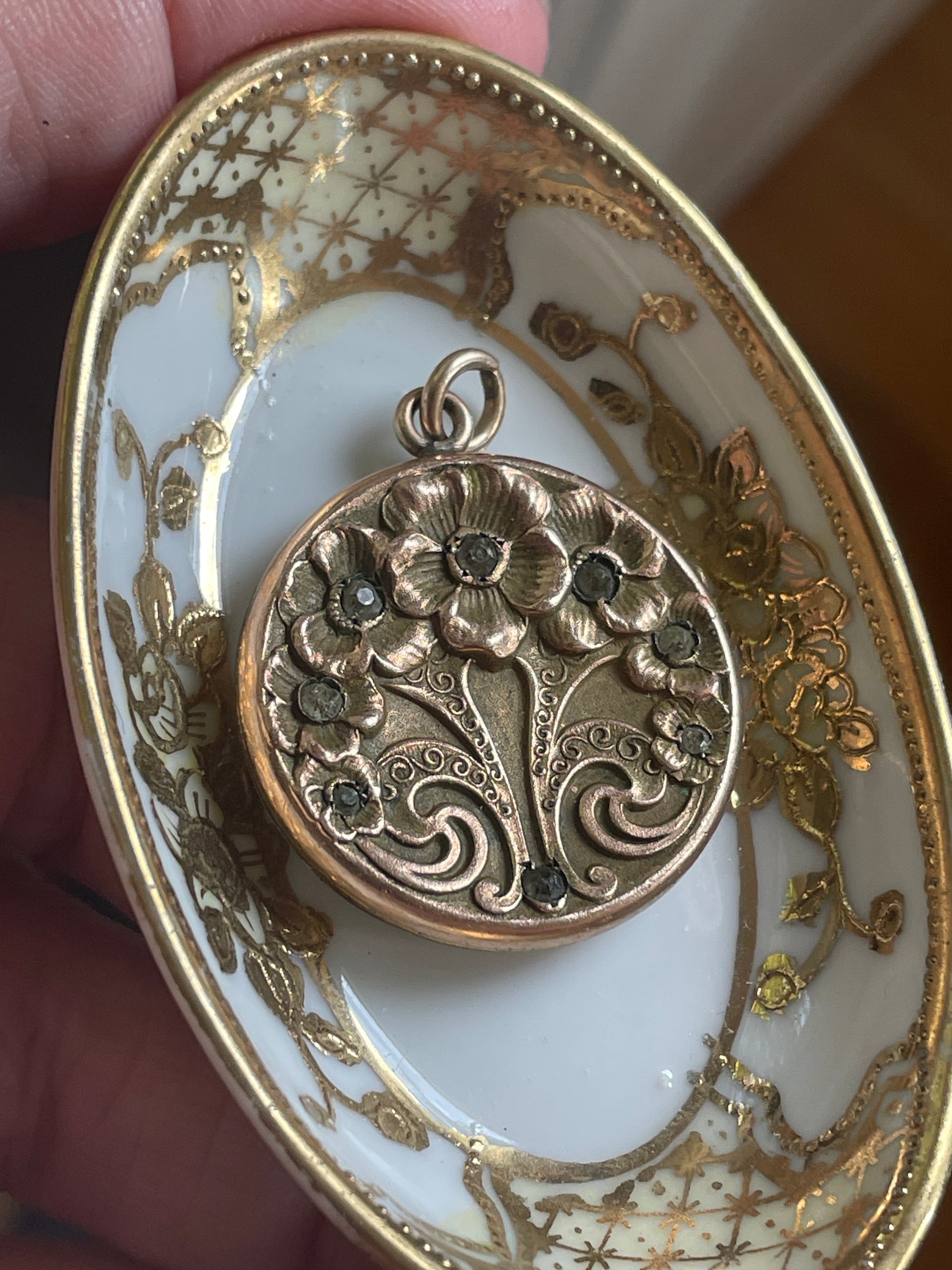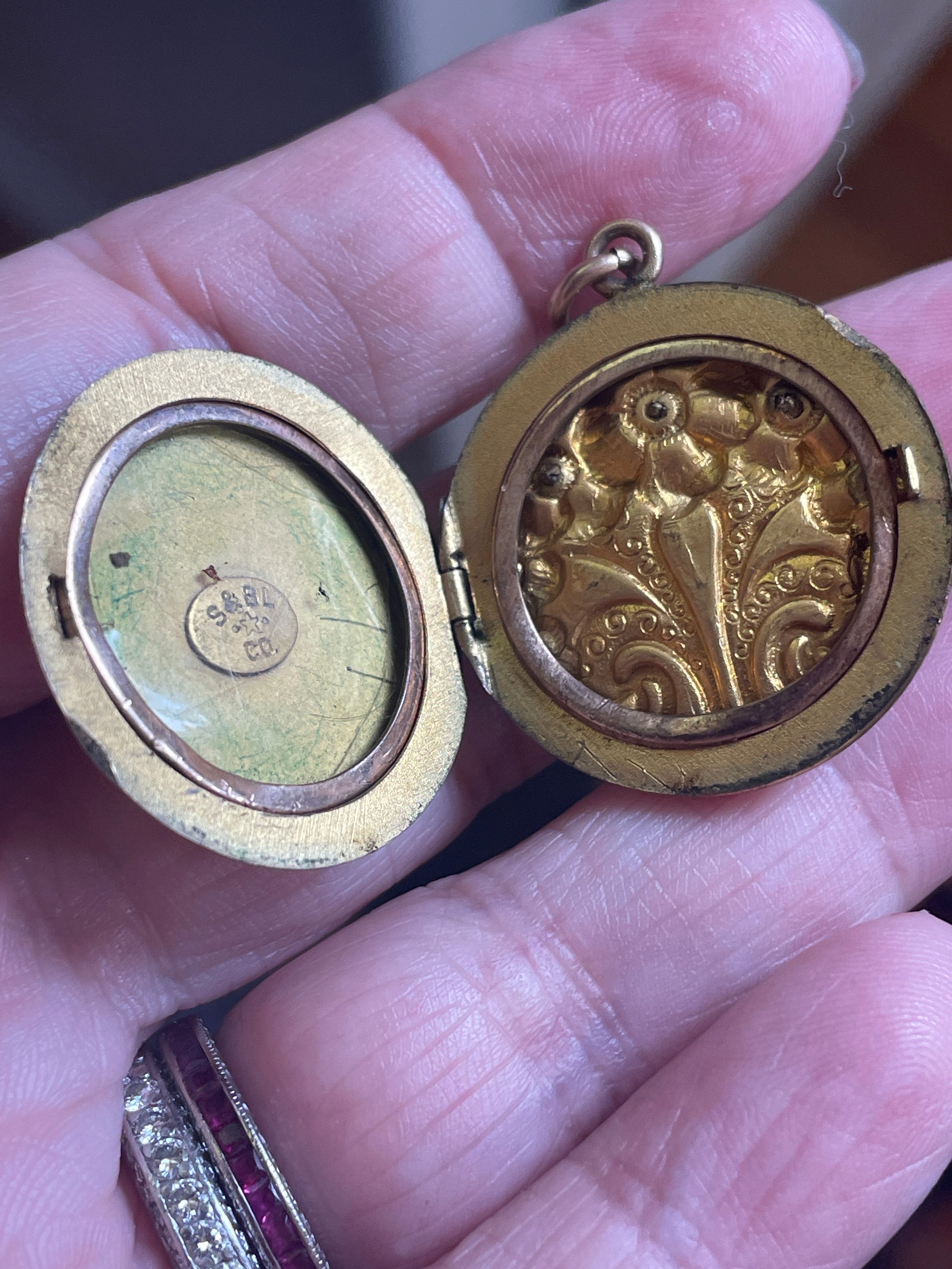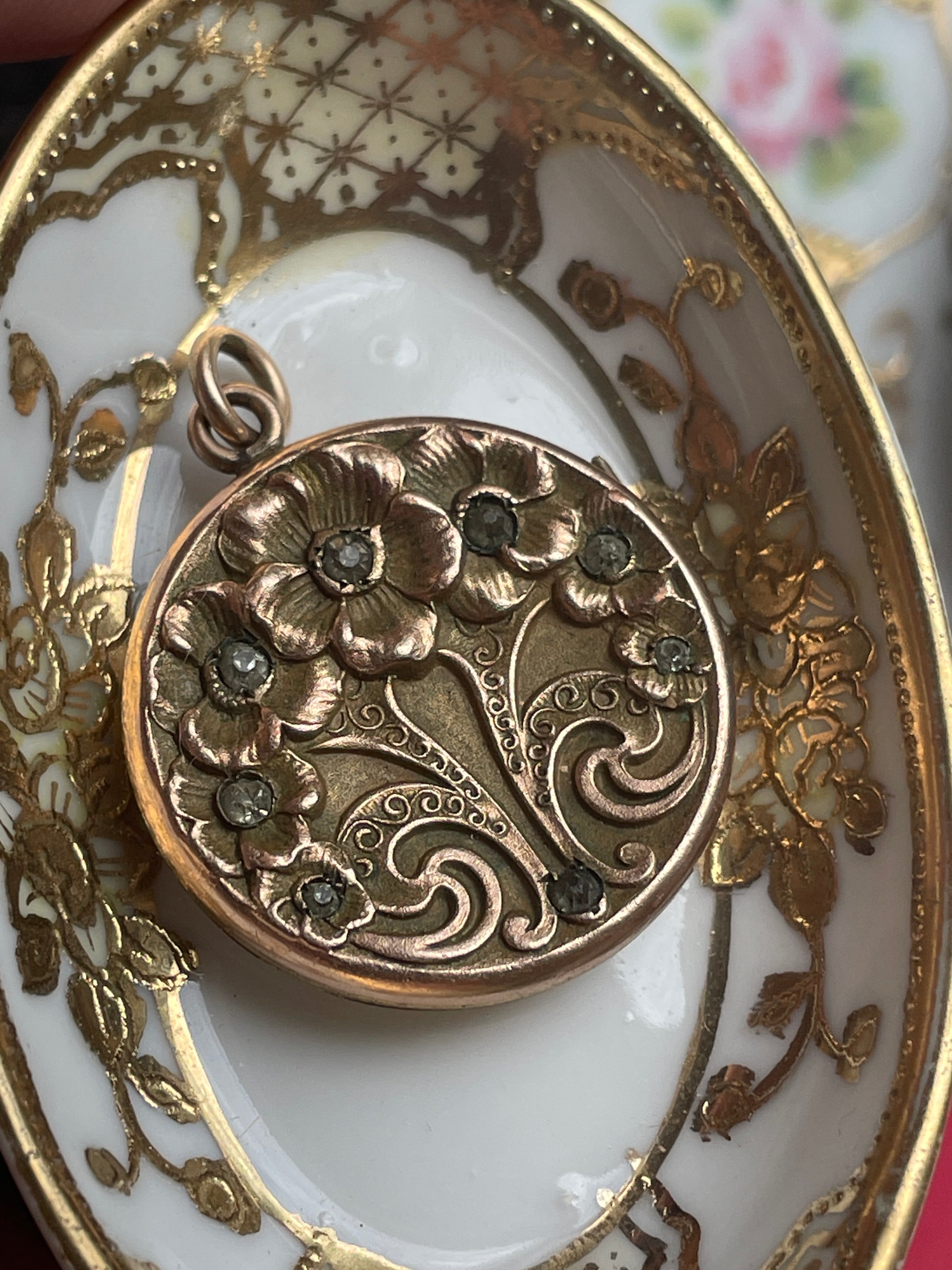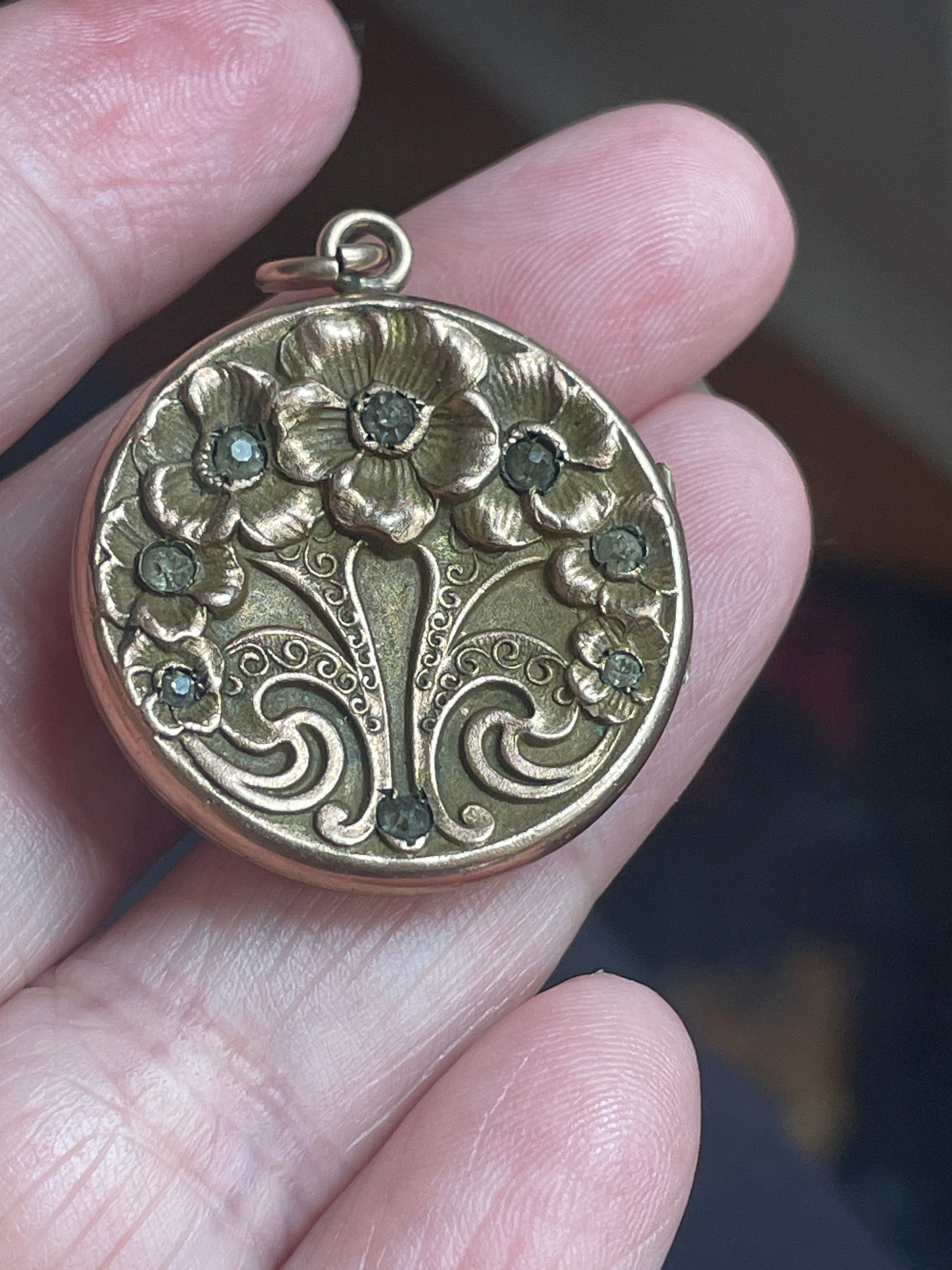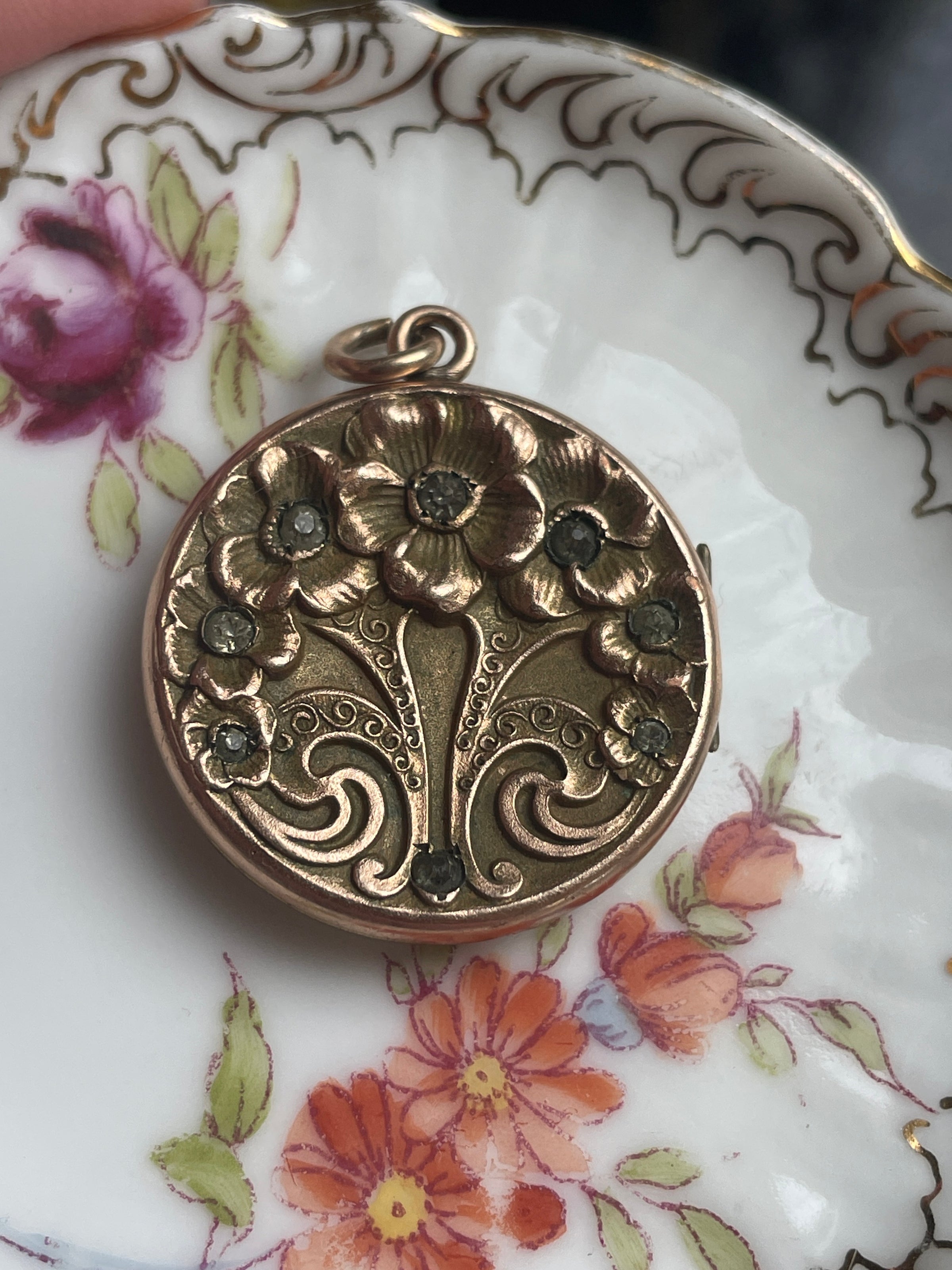 Beyond stunning antique floral paste locket with gorgeous detail. Great condition for a locket over 100 years old. Locket measures 1.25 inches x 1 inch (with top loop). Has two frames present, one acetate. Stamped “S&BL Co” which is the maker. Closes with a snap. Paste stones are a bit dark from wear but still have subtle glimmer.