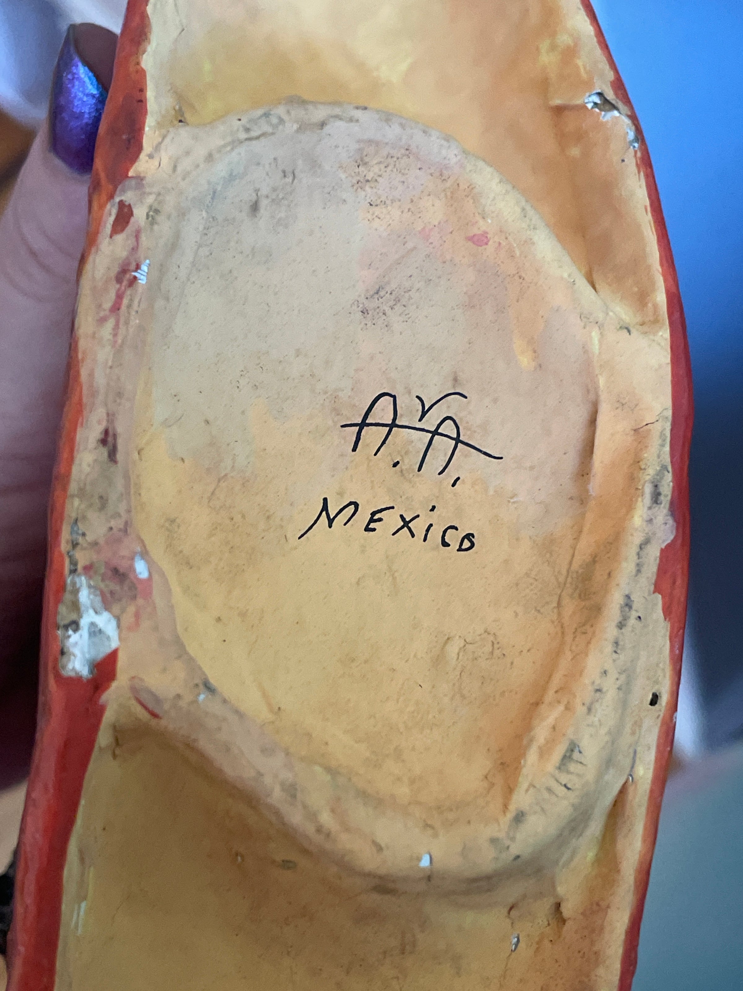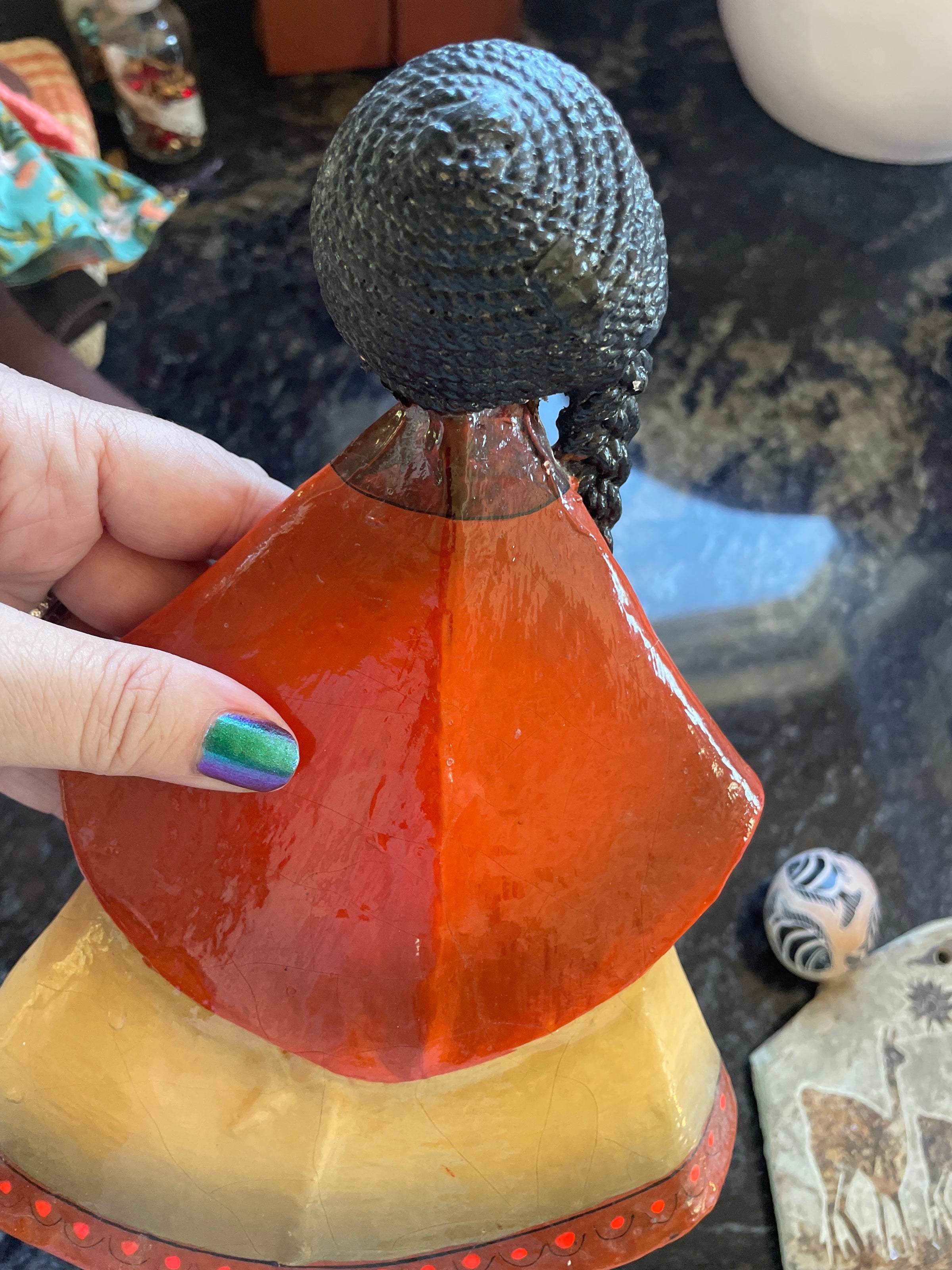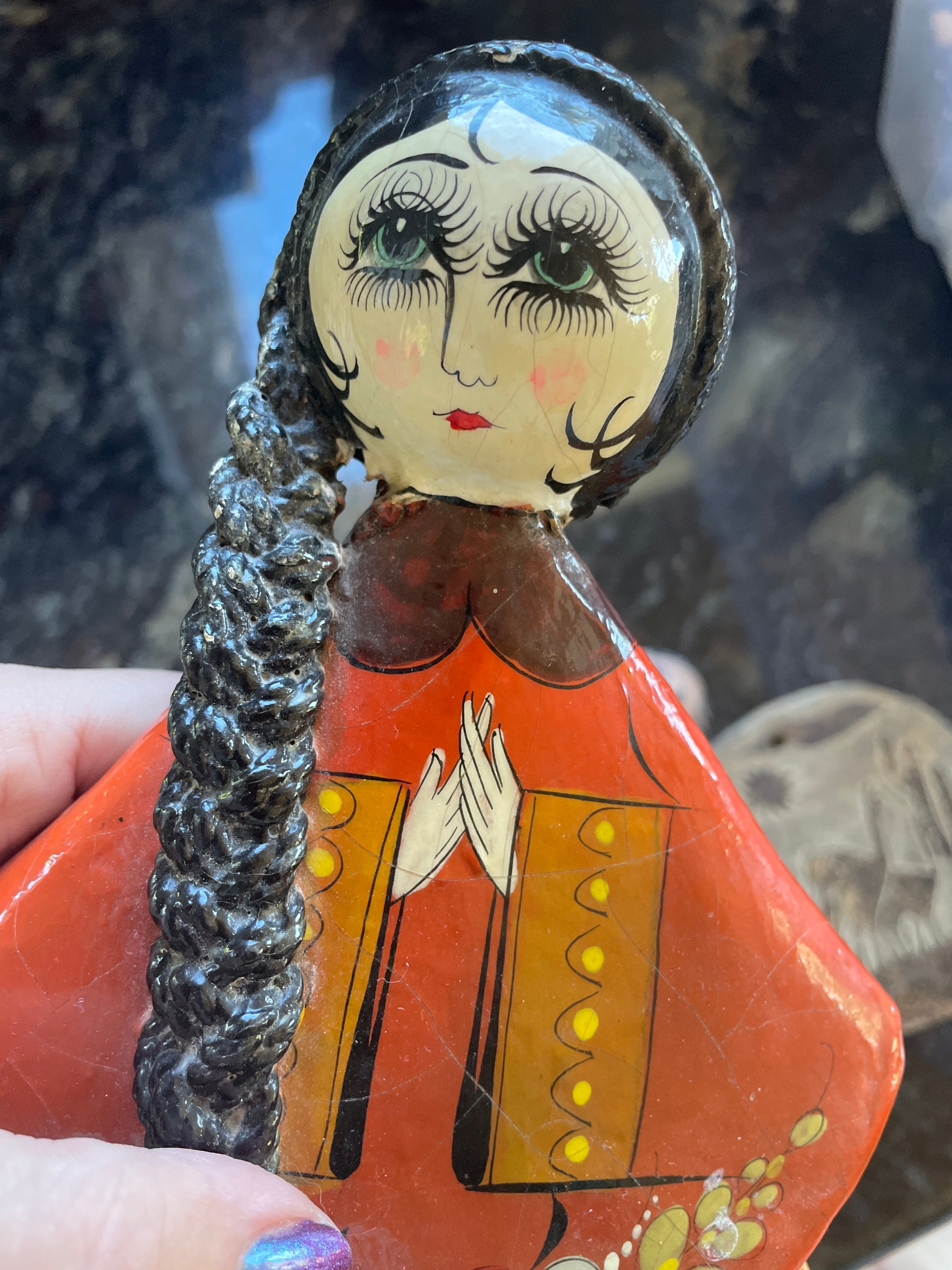 Fabulous vintage Mexican folk art lady statue. Measures about 8.5 inches tall. Likely made of paper mache. Beautiful long braid. Some wear but beautiful still and the colors perfect for Fall. Signed on the bottom.