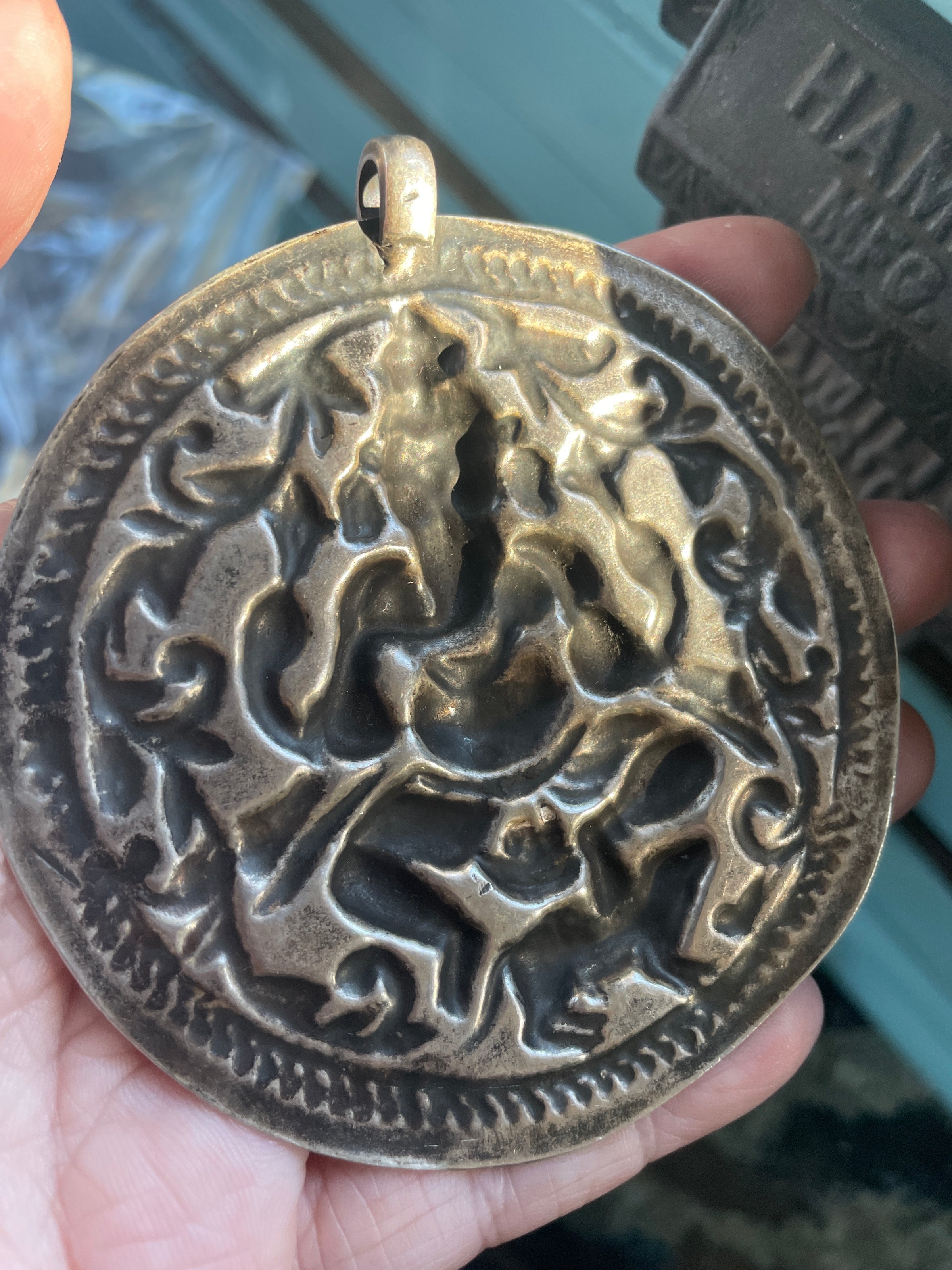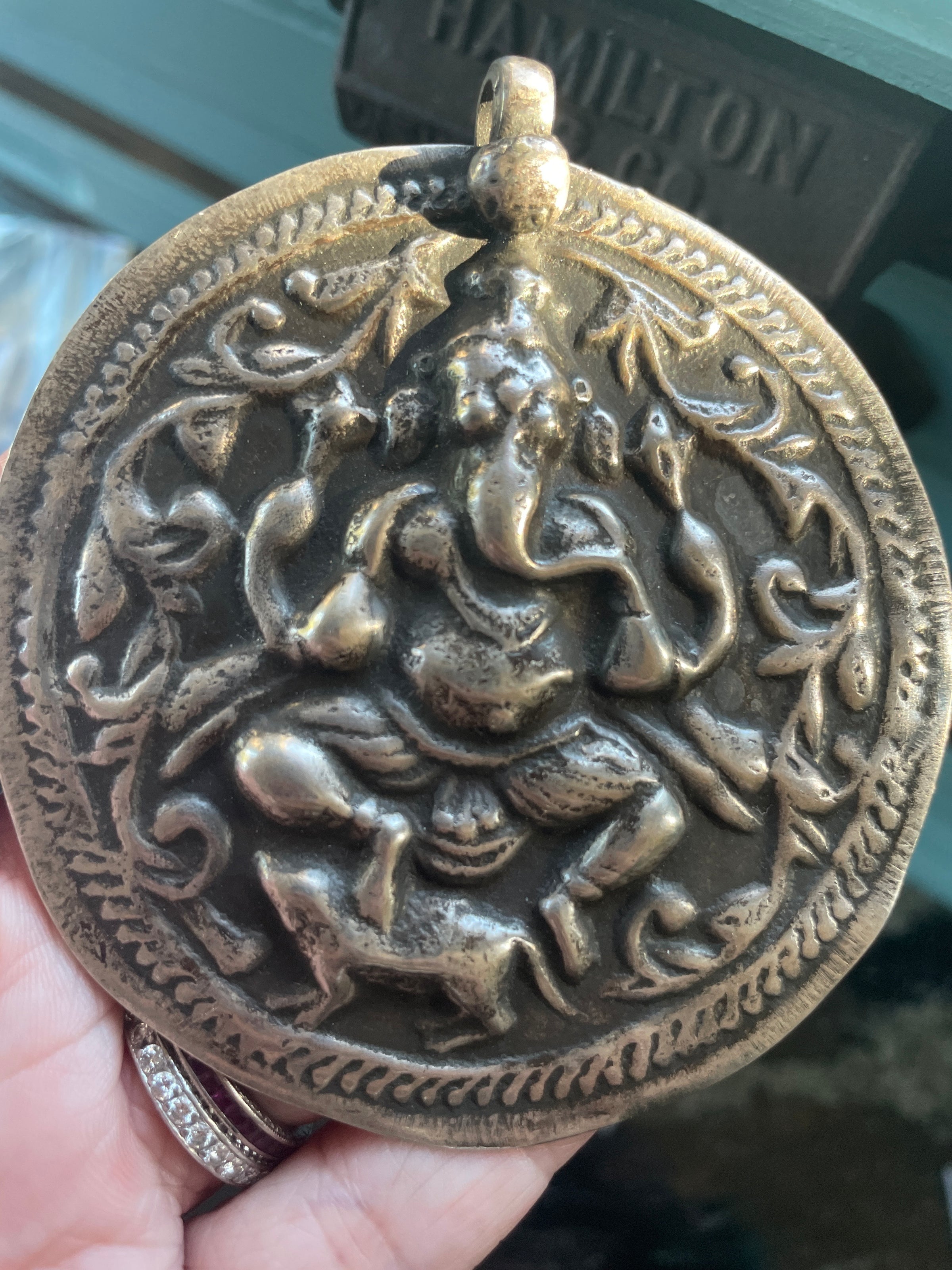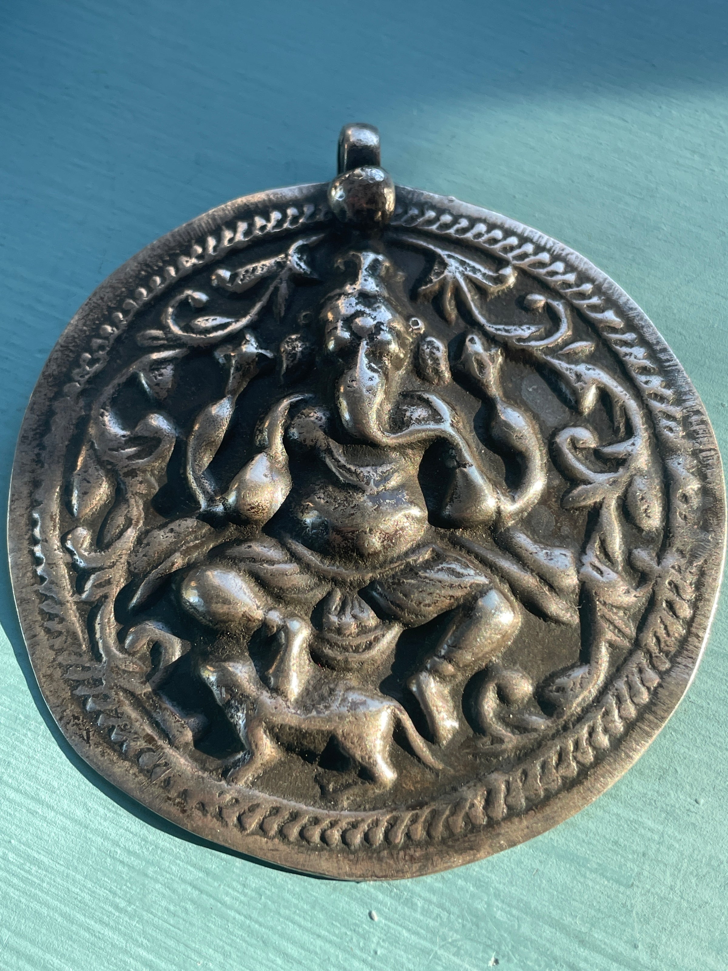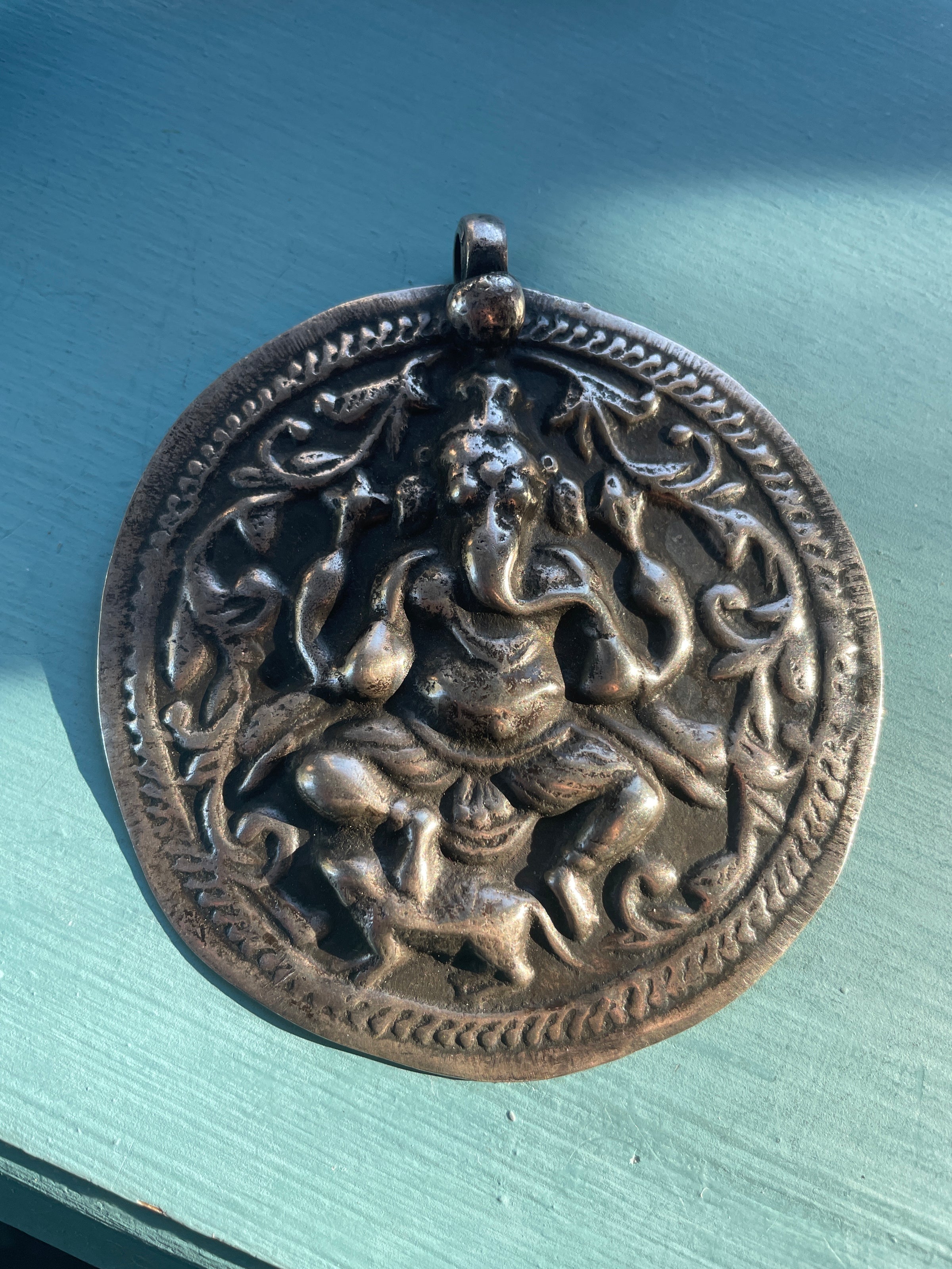 Huge heavy vintage Ganesh pendant in sterling silver.  Measures 3.25 inches x 3 inches.  Weighs 31.22 grams.  Unmarked sterling.  Circa 1930s.