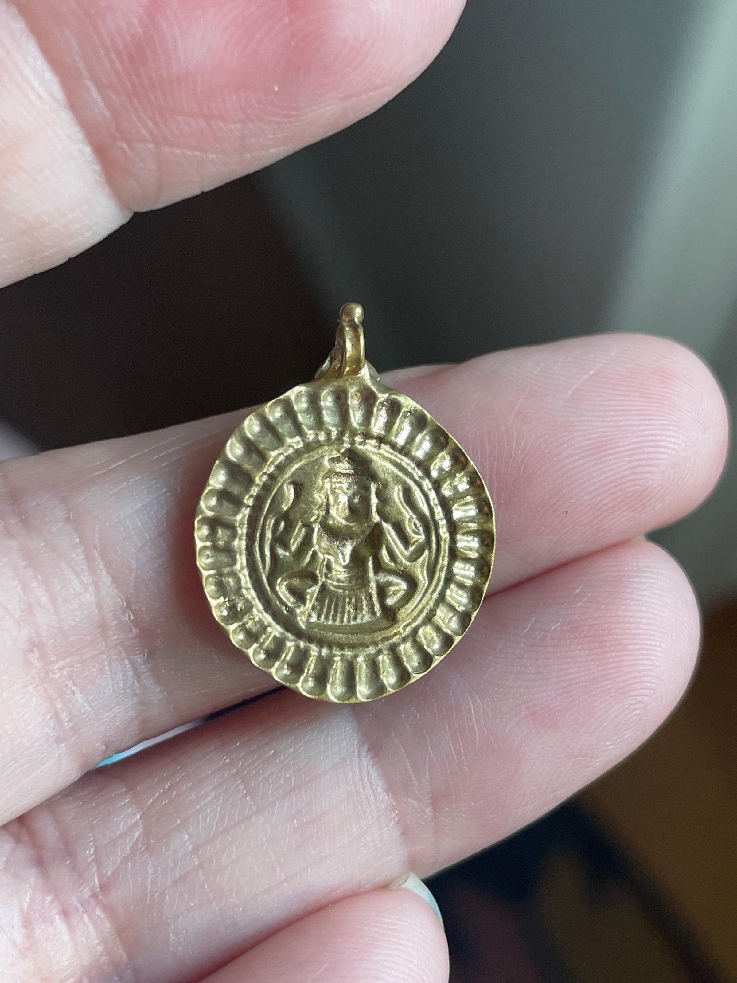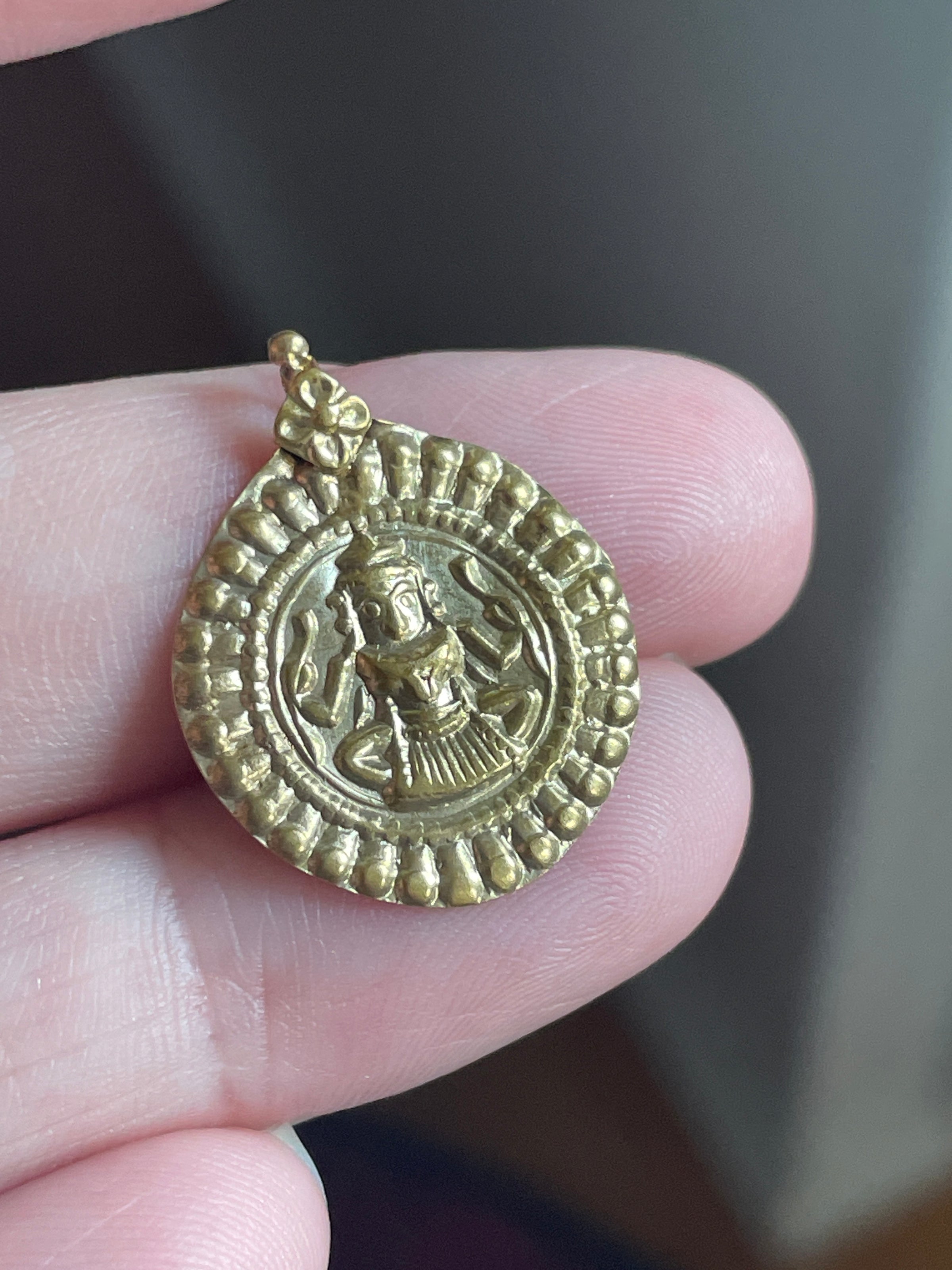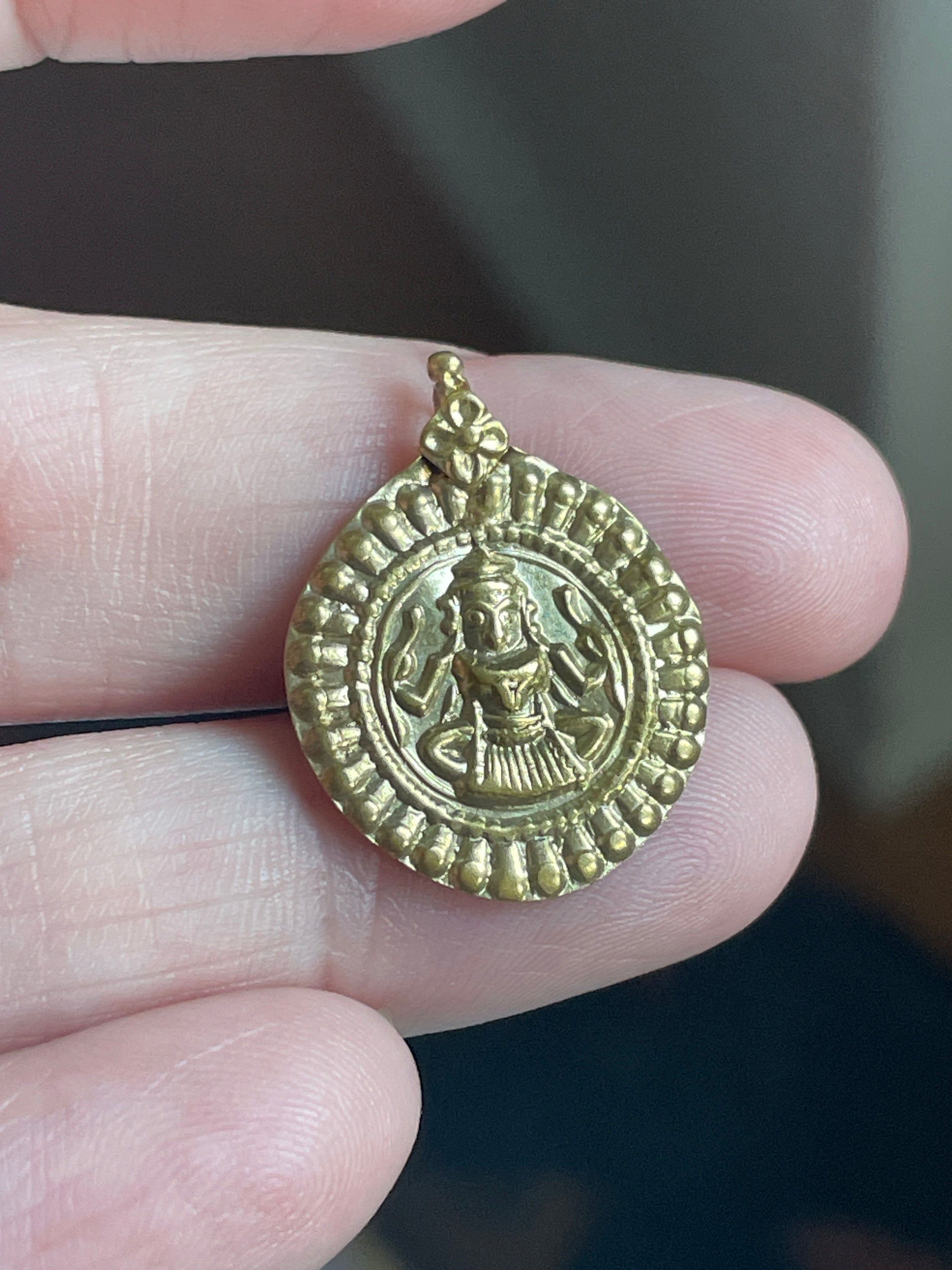 Beautiful antique Goddess/Warrior pendant from India circa early 1900s. Tested 18k plus. Note this pendant is lightweight (under 1 gram) but has great presence. You will need a very fine chain or cord to fit the hole (approx 2mm). Pendant measures just under 1 inch x just under 0.75 inches.