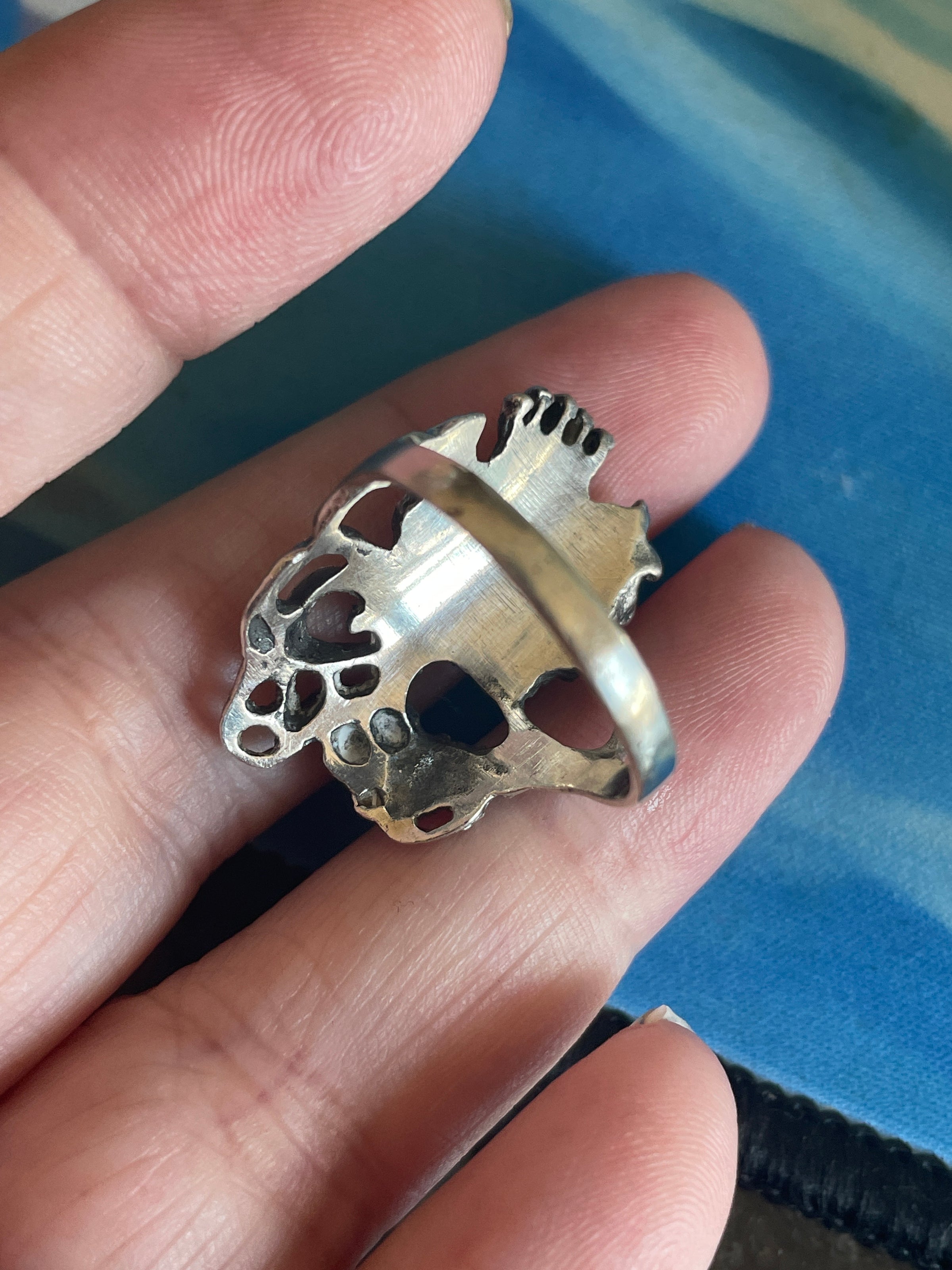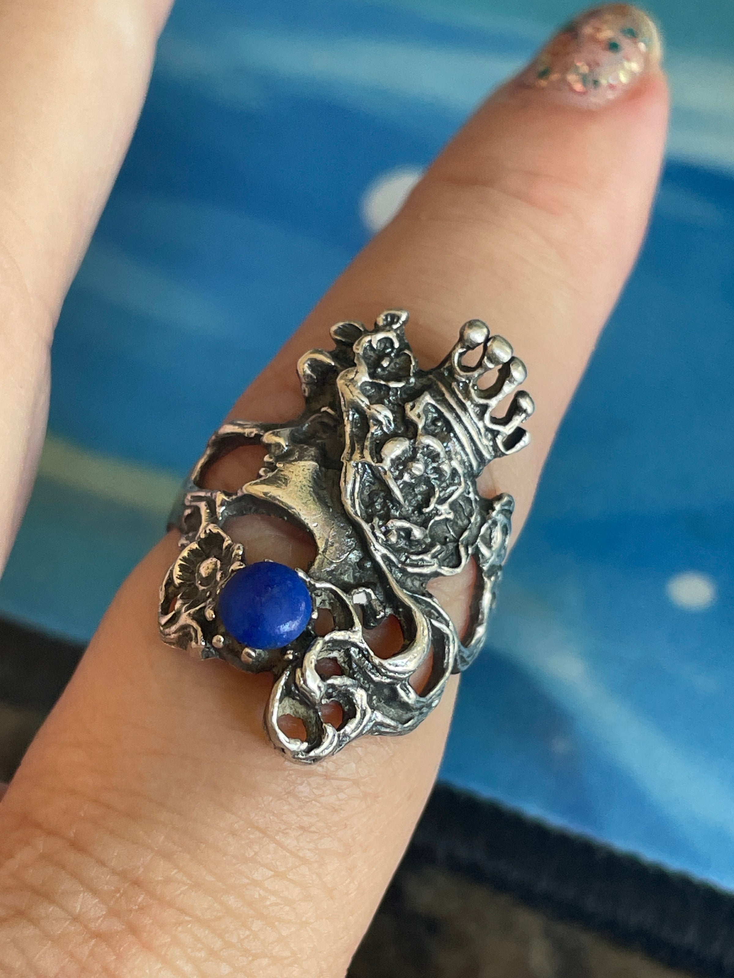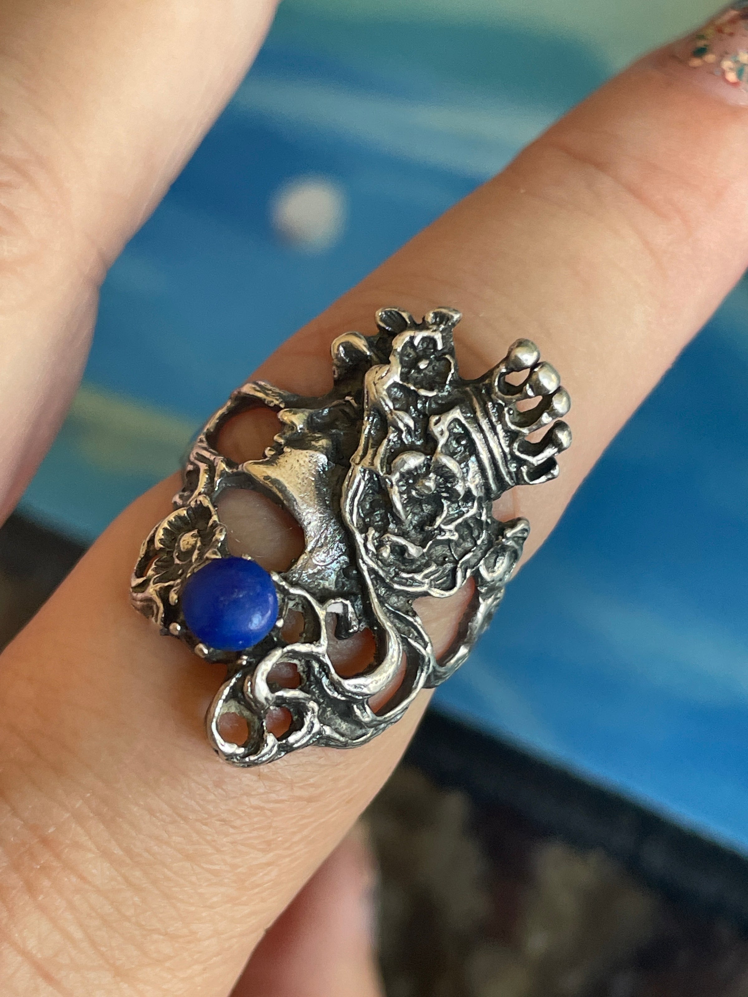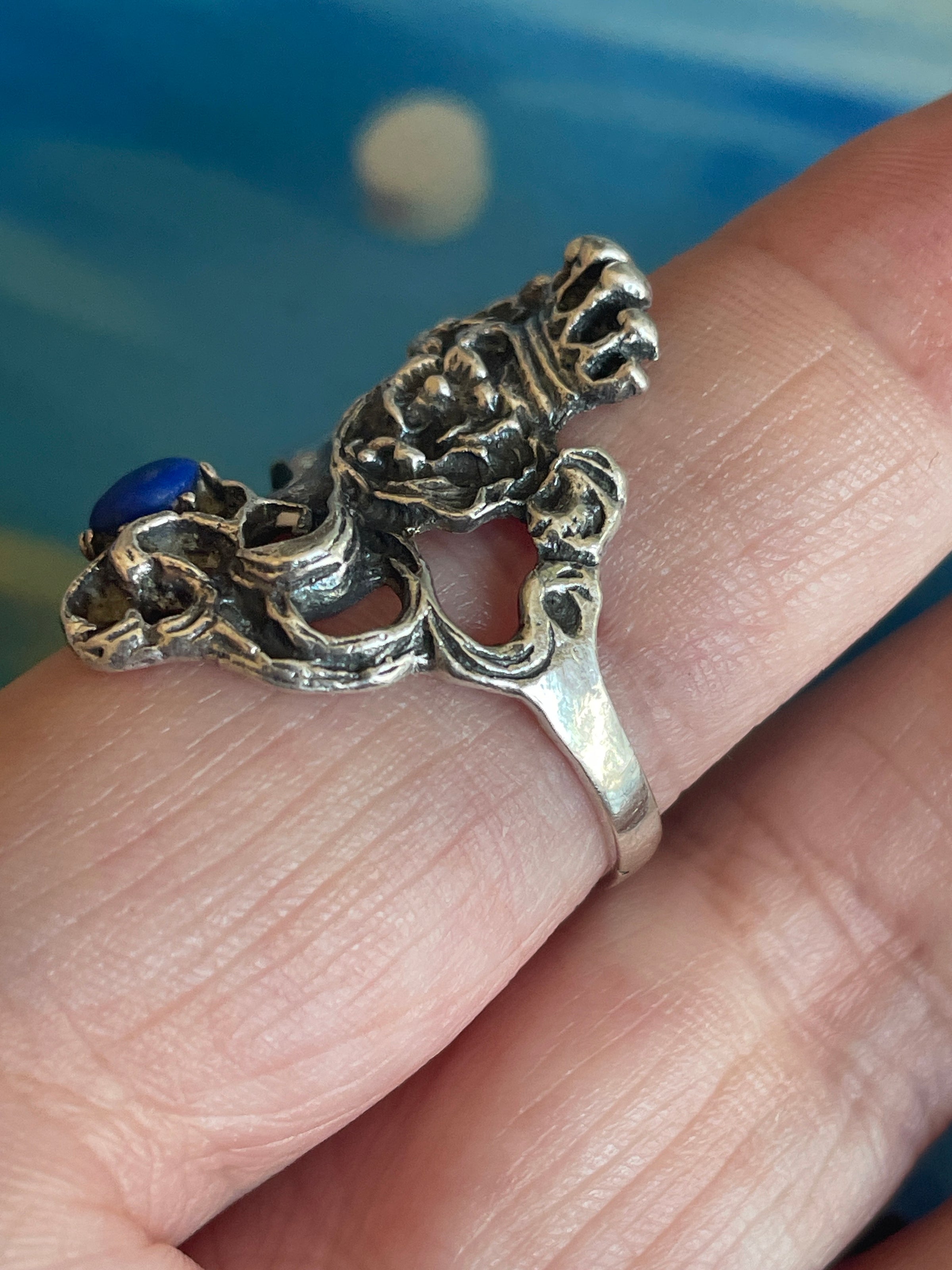 Gorgeous vintage Goddess ring in sterling silver with Lapis. Ring size = 8.25. Stamped 925 for sterling.
