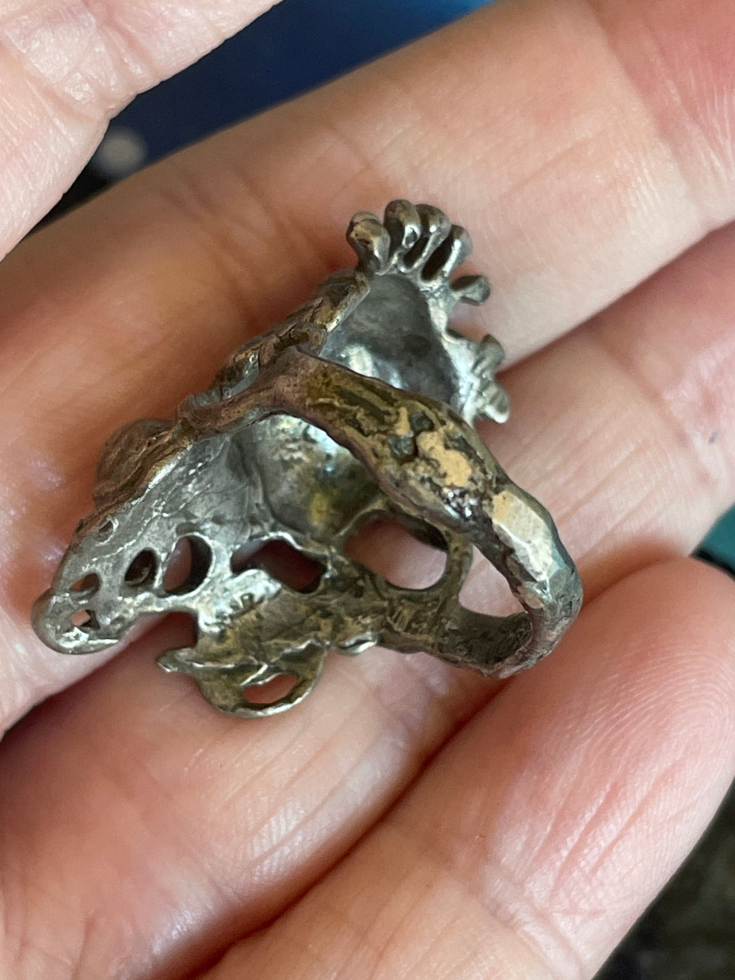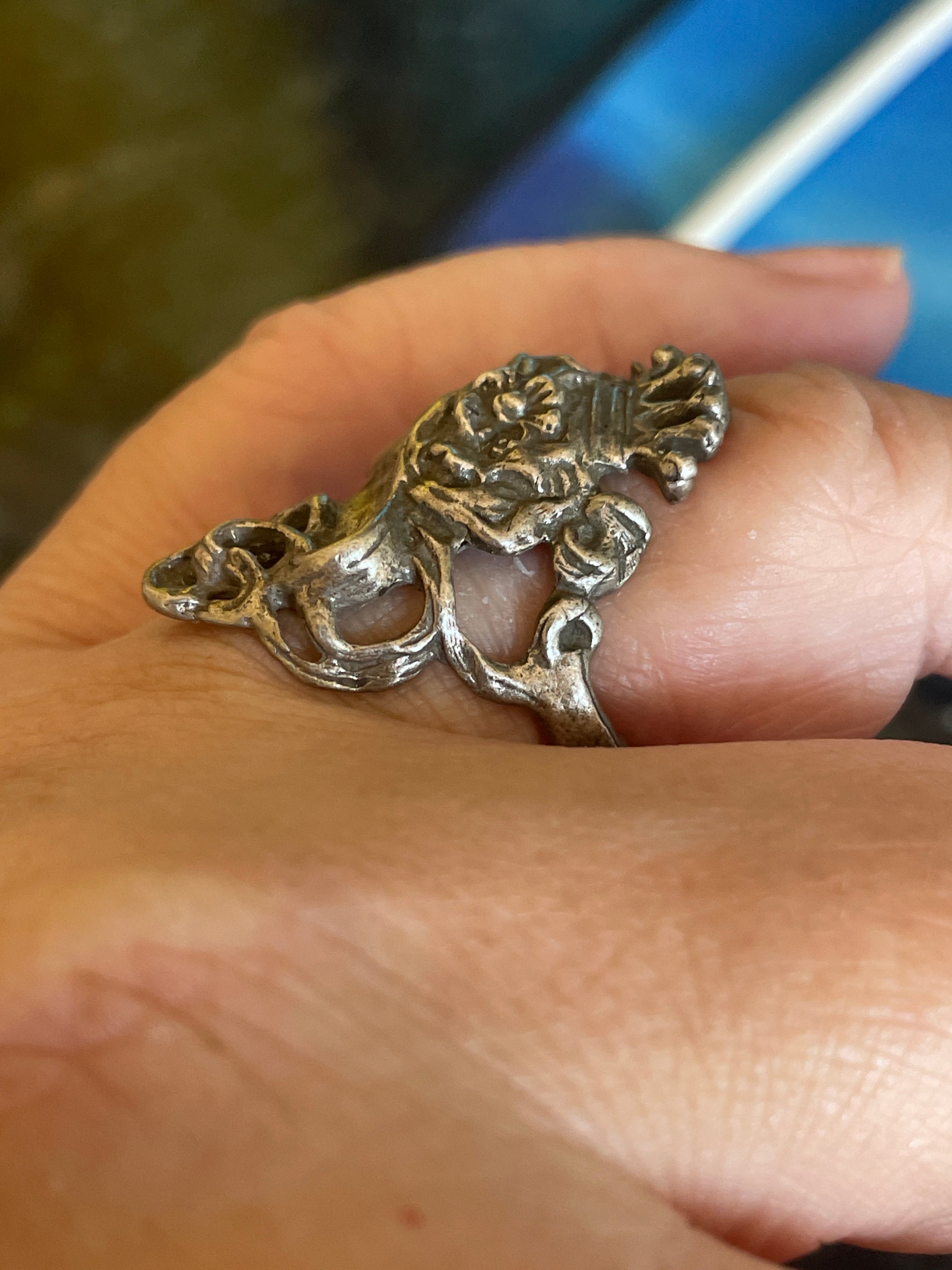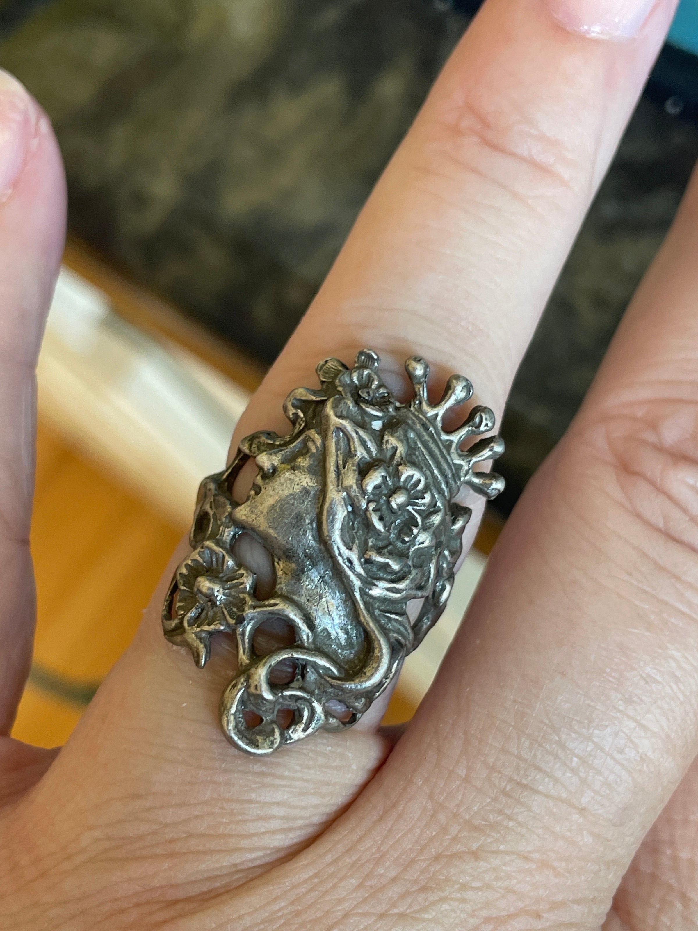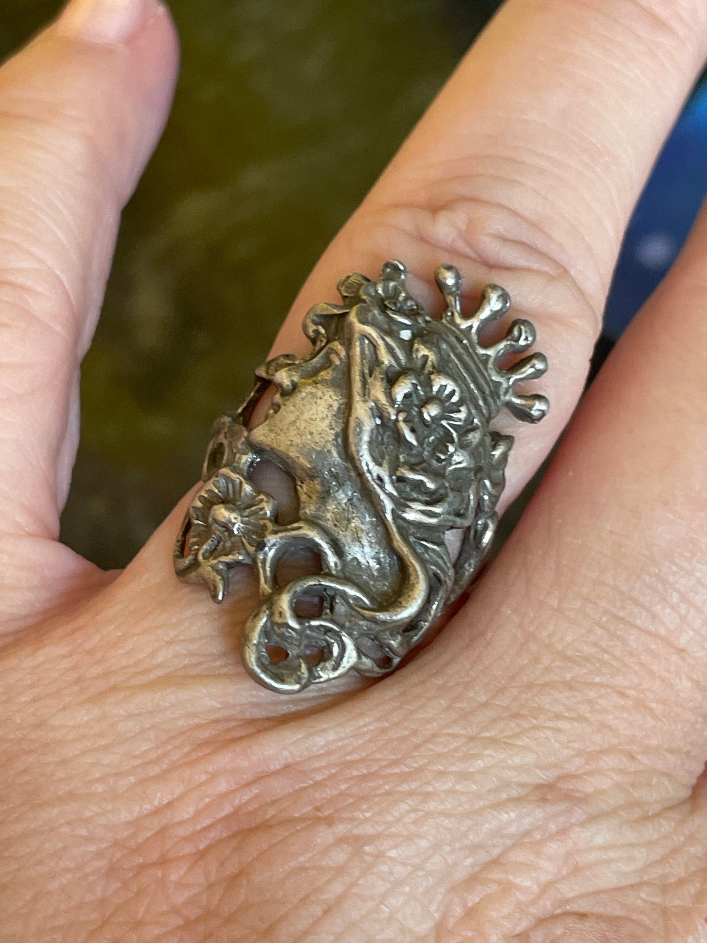 Stunning vintage Goddess ring with lovely crown and flowers. Beautiful details looks hand cast. Ring size approx = 6. Unmarked but tested sterling.
