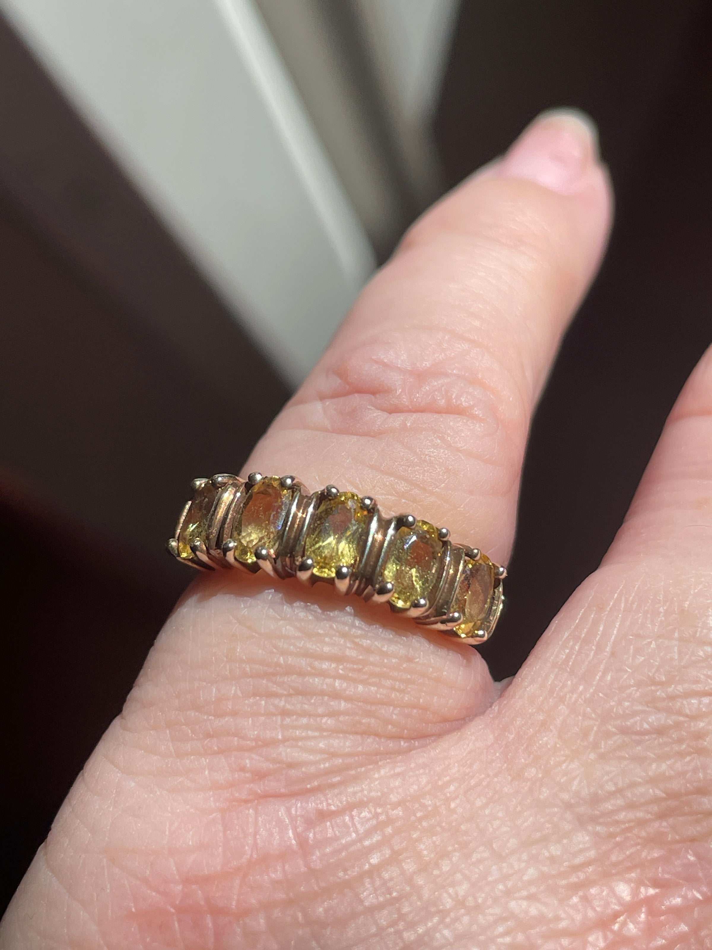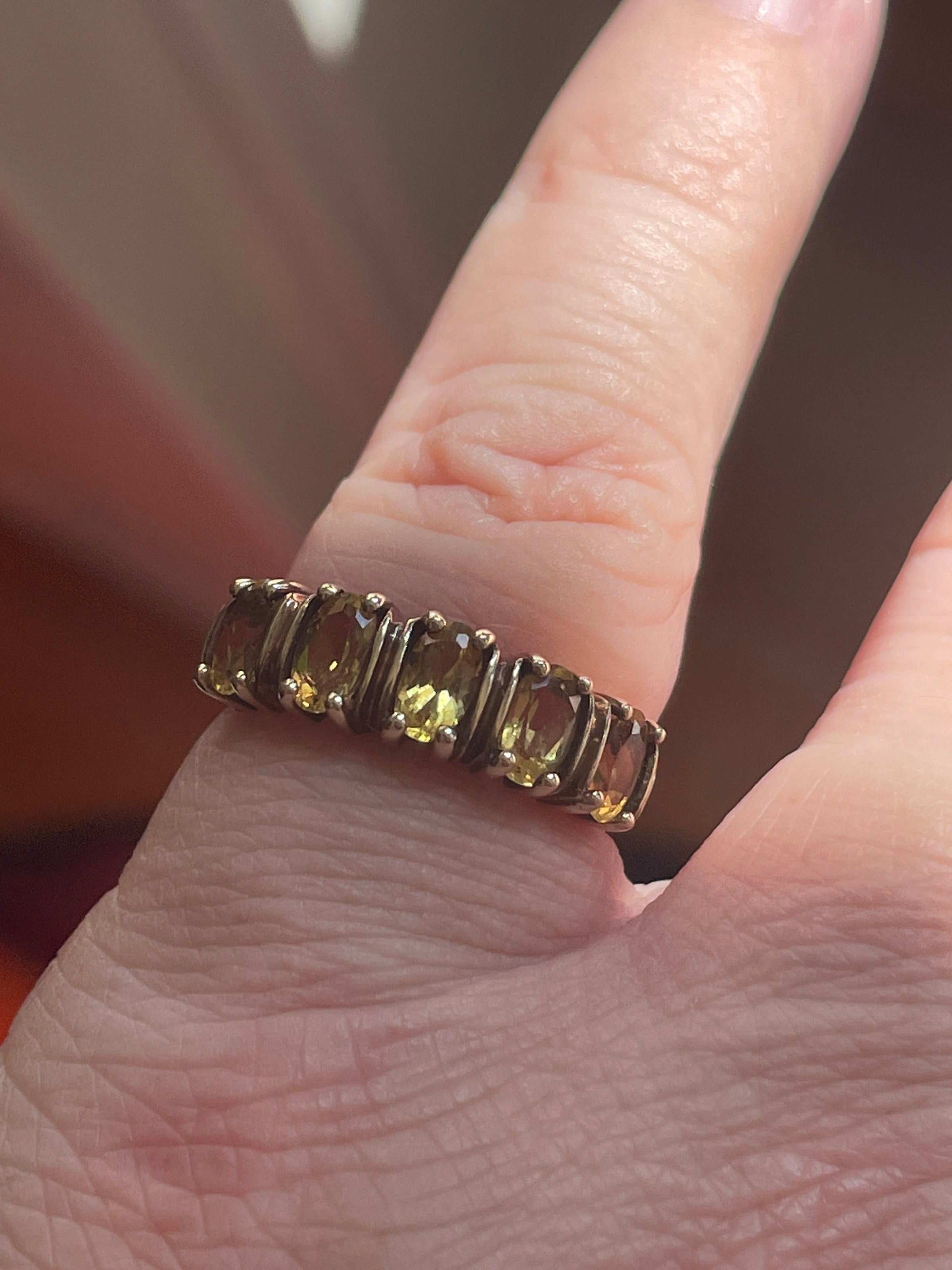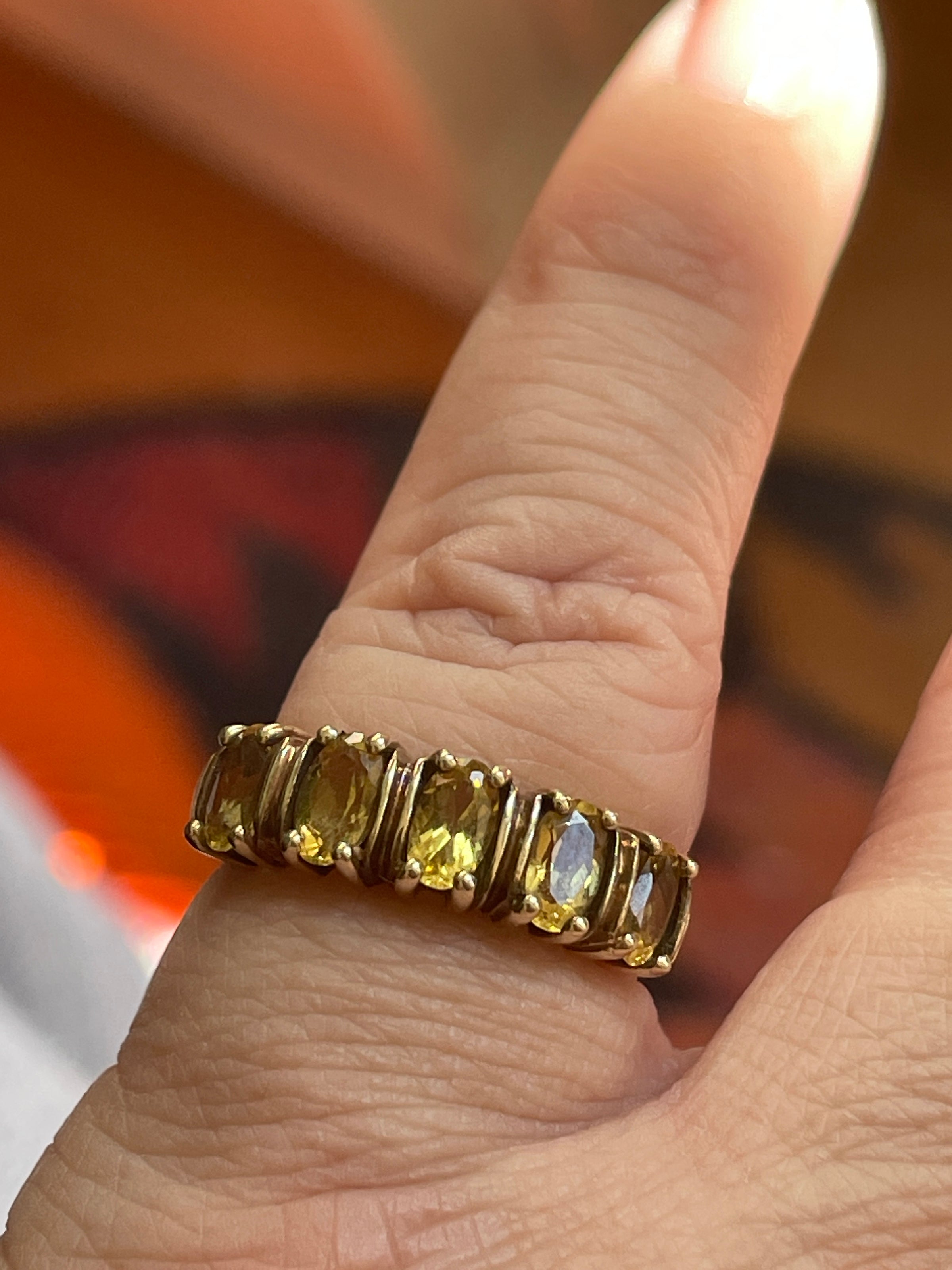 Beyond gorgeous vintage golden Beryl ring in 10k gold. Ring has five glowing gems that are 5x3mm. Ring band stamped 10k. Ring size = 4.5. Should be sizable by jeweler.