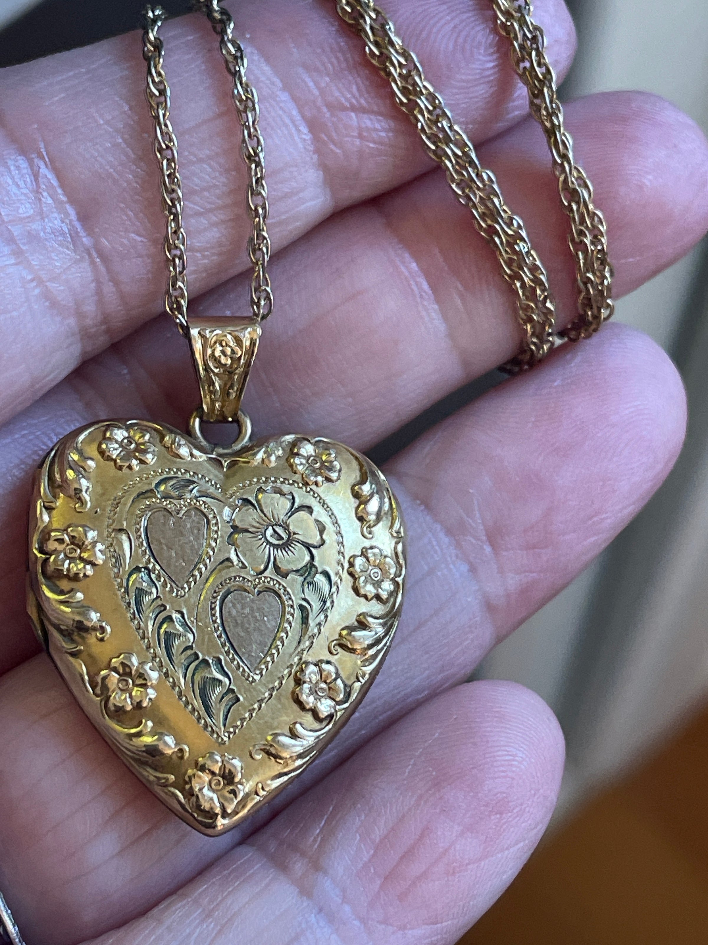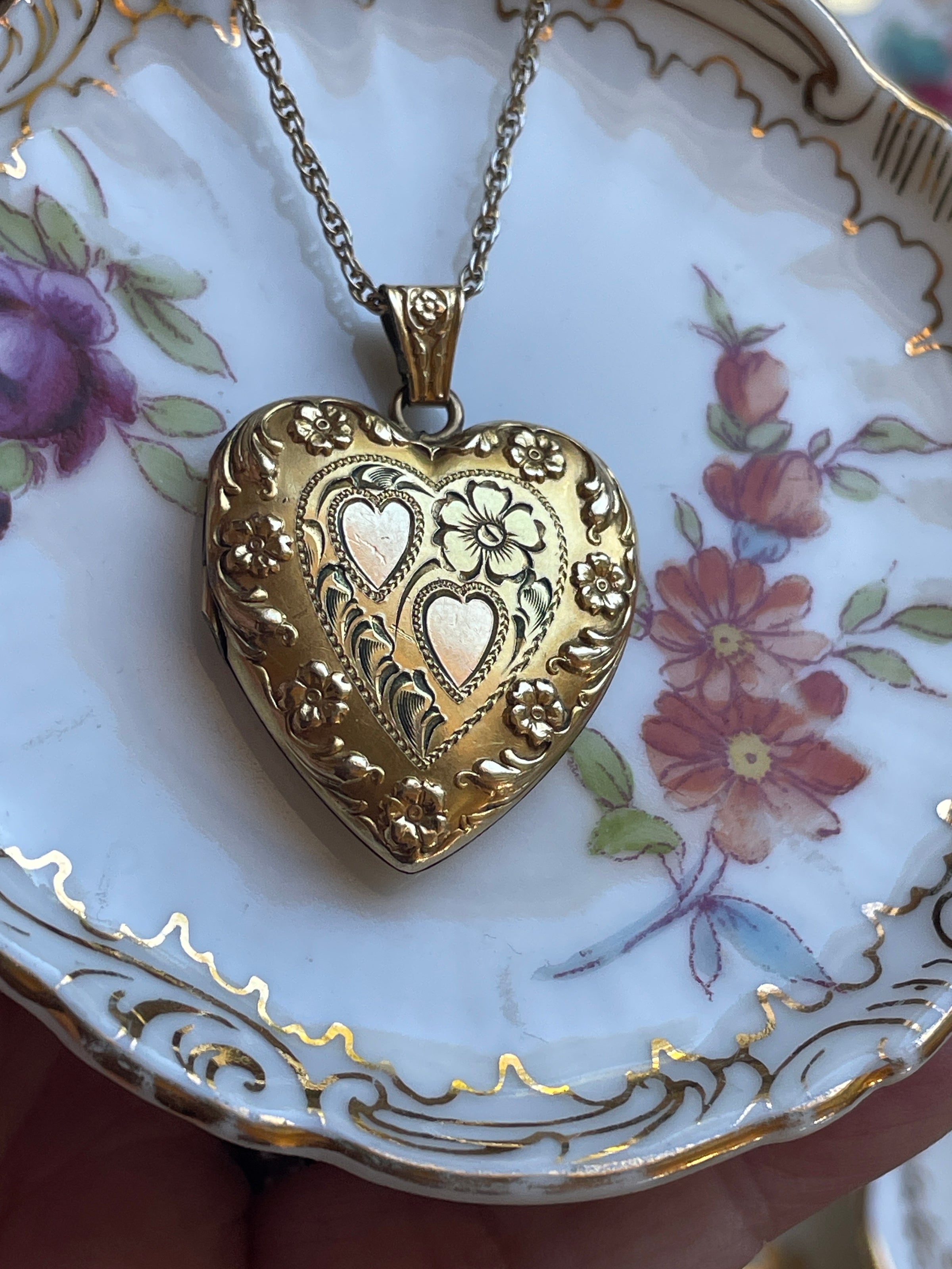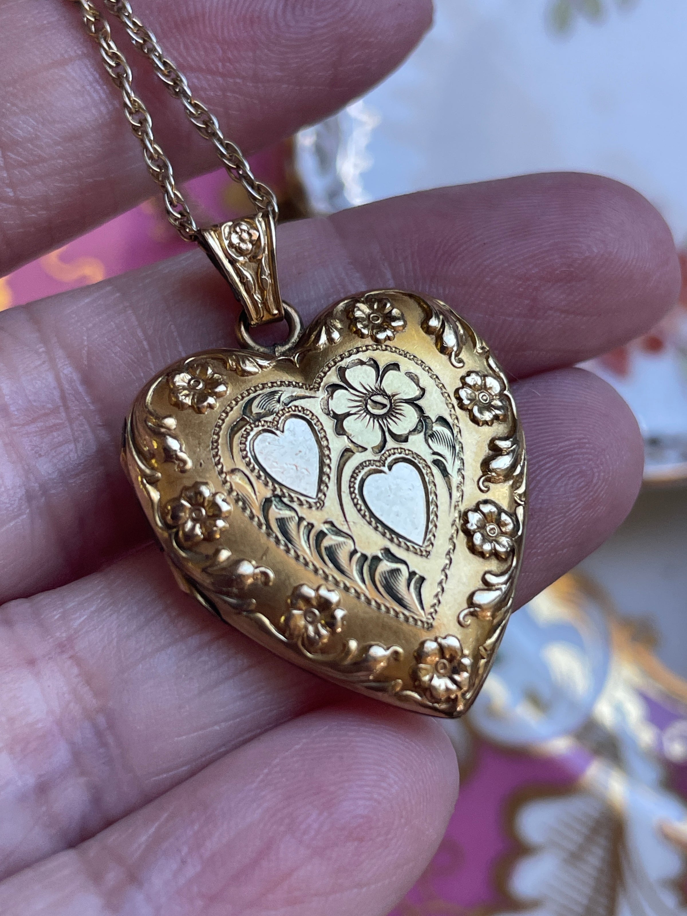 Heart Locket Necklace - Raised Edge Floral Design - Gold Filled - Vintage