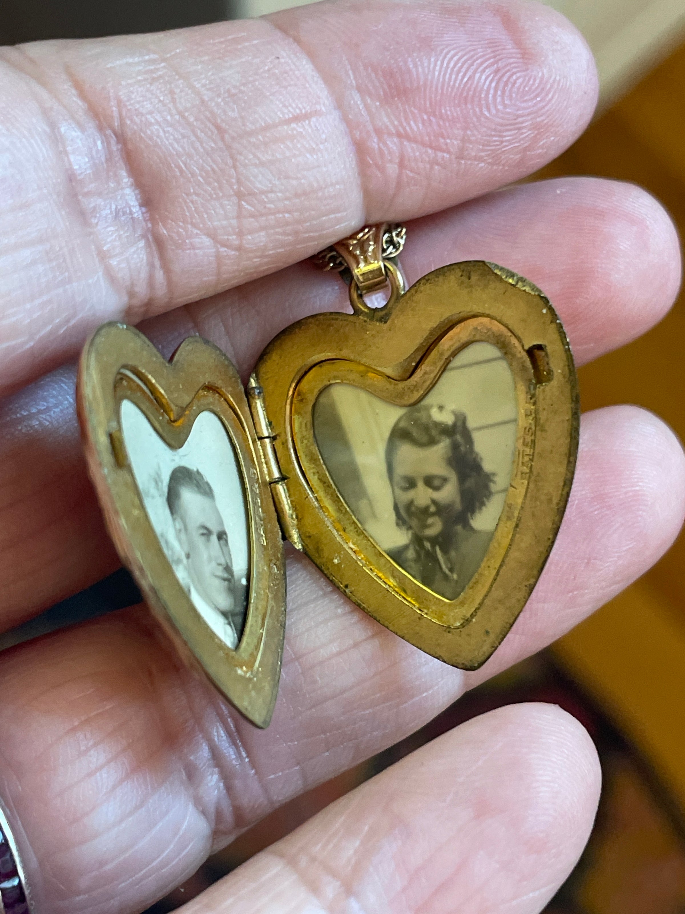Fabulous beautiful raised edge heart flower locket.  Has double heart design with engraved flower above.  Also has ornate detail on bail.  Locket measures 1.25 inches with bail x approx 1 inch.  Two frames present with acetate and old photos.  New owner can choose whether to replace.  Stamped “Bates and Co.” Comes on 18 inch gold filled rope chain.