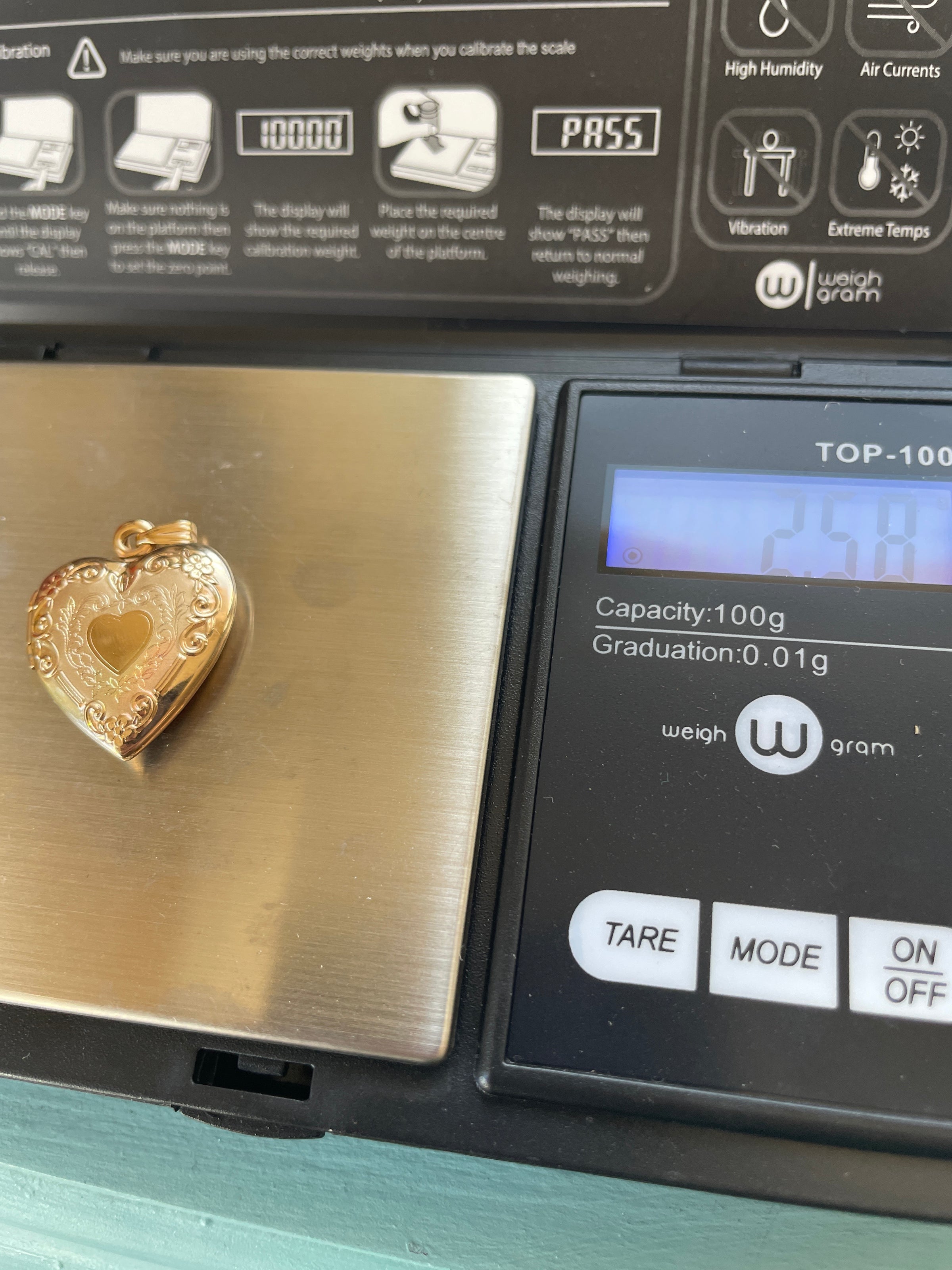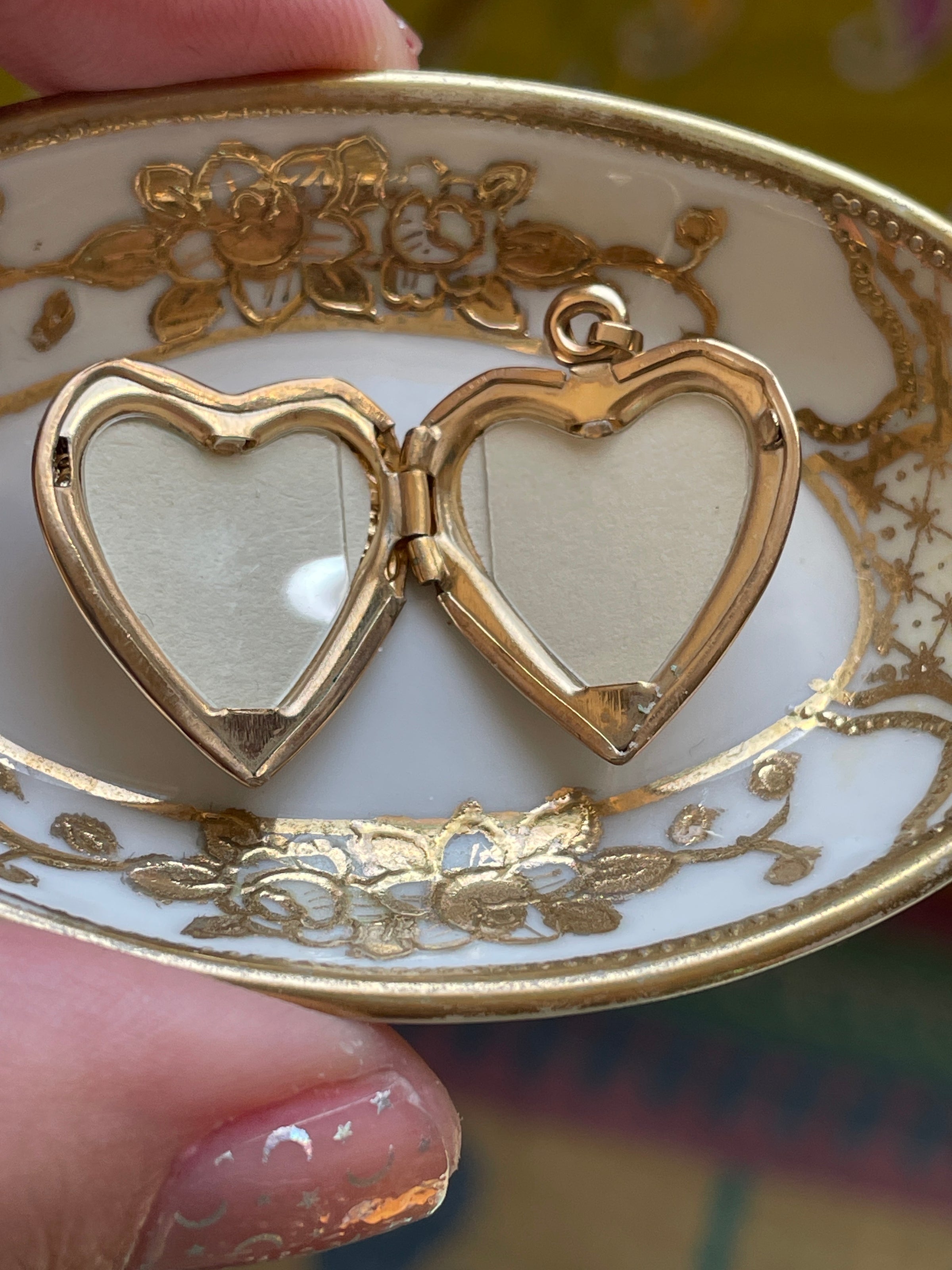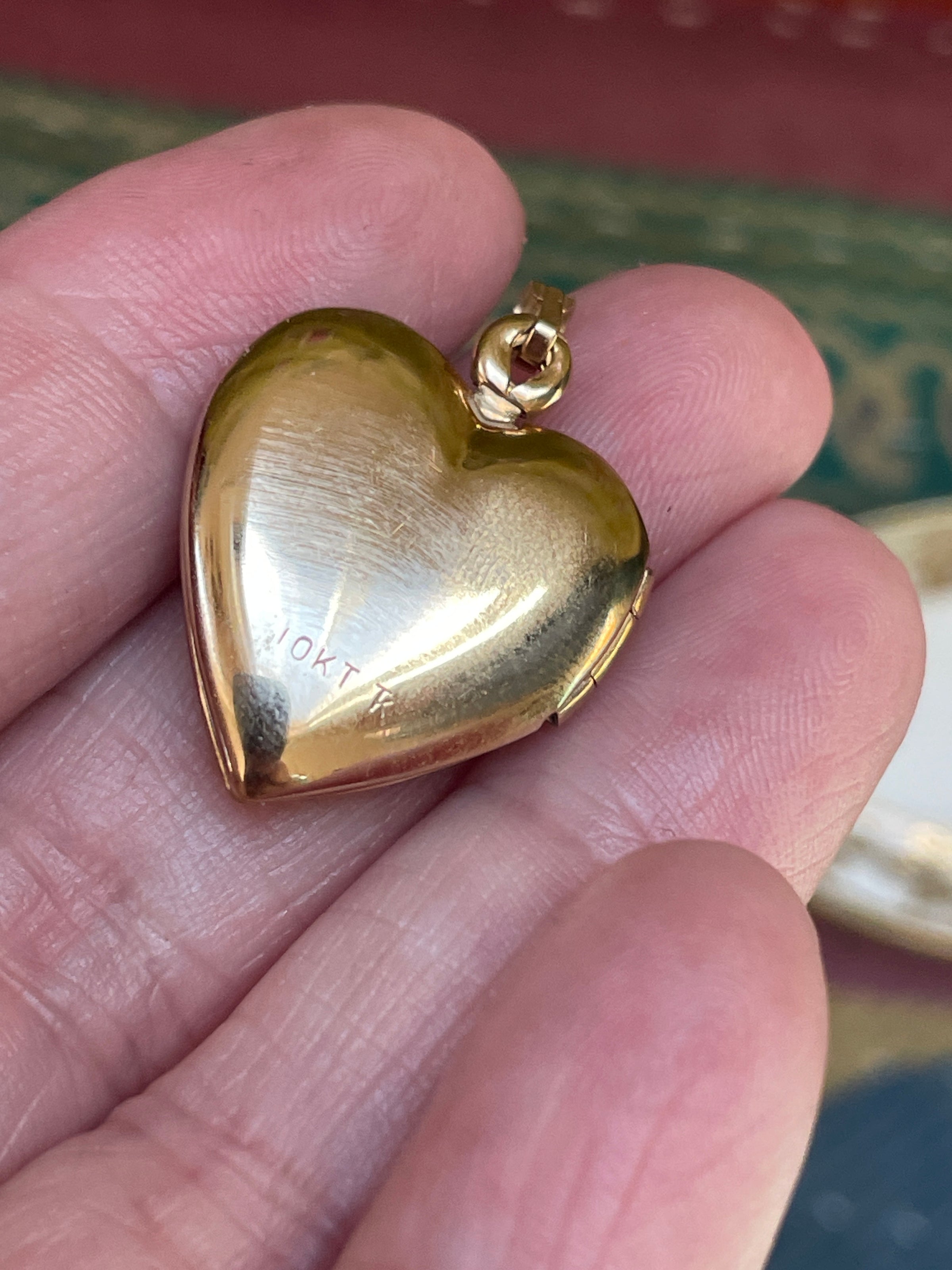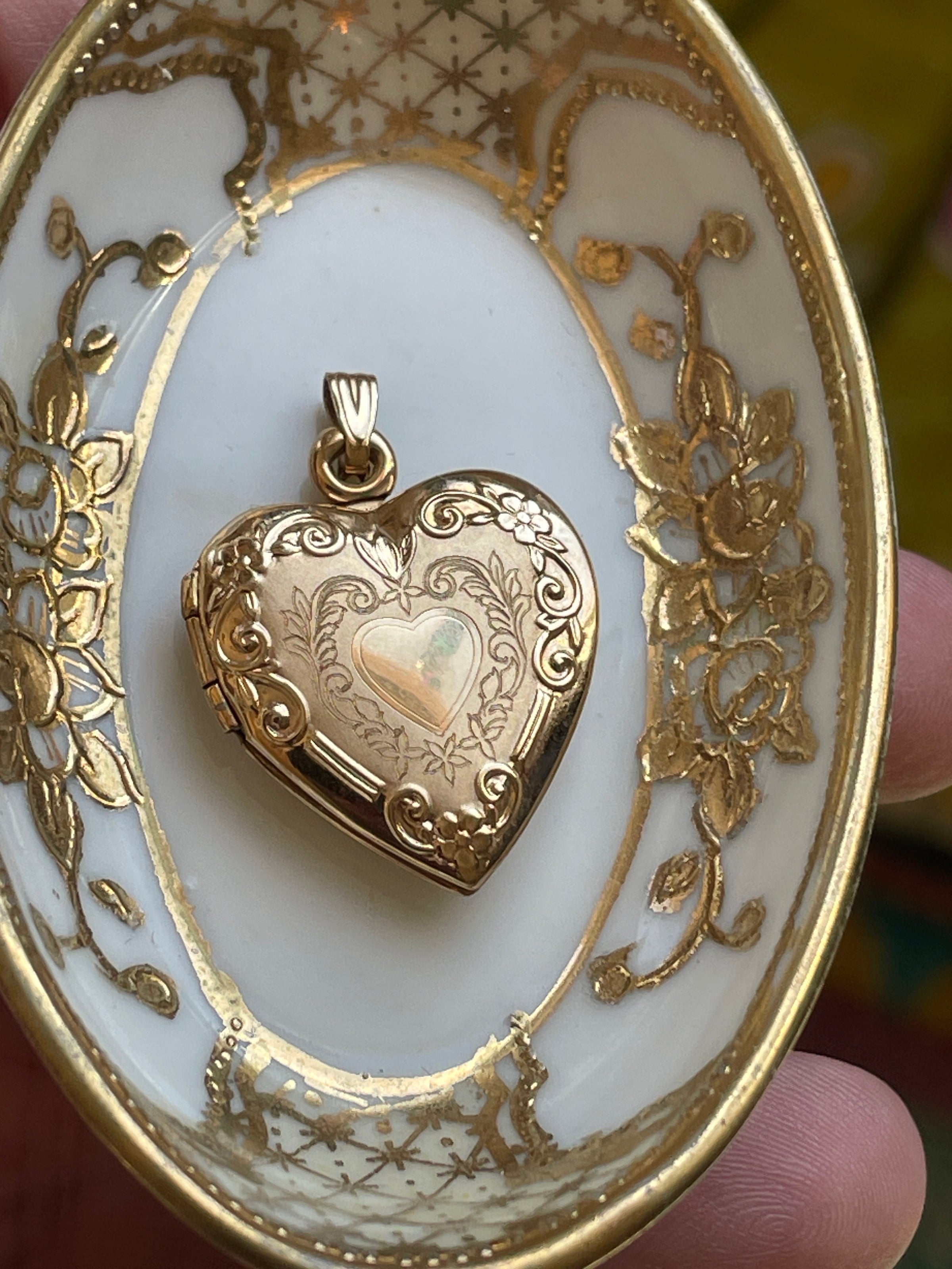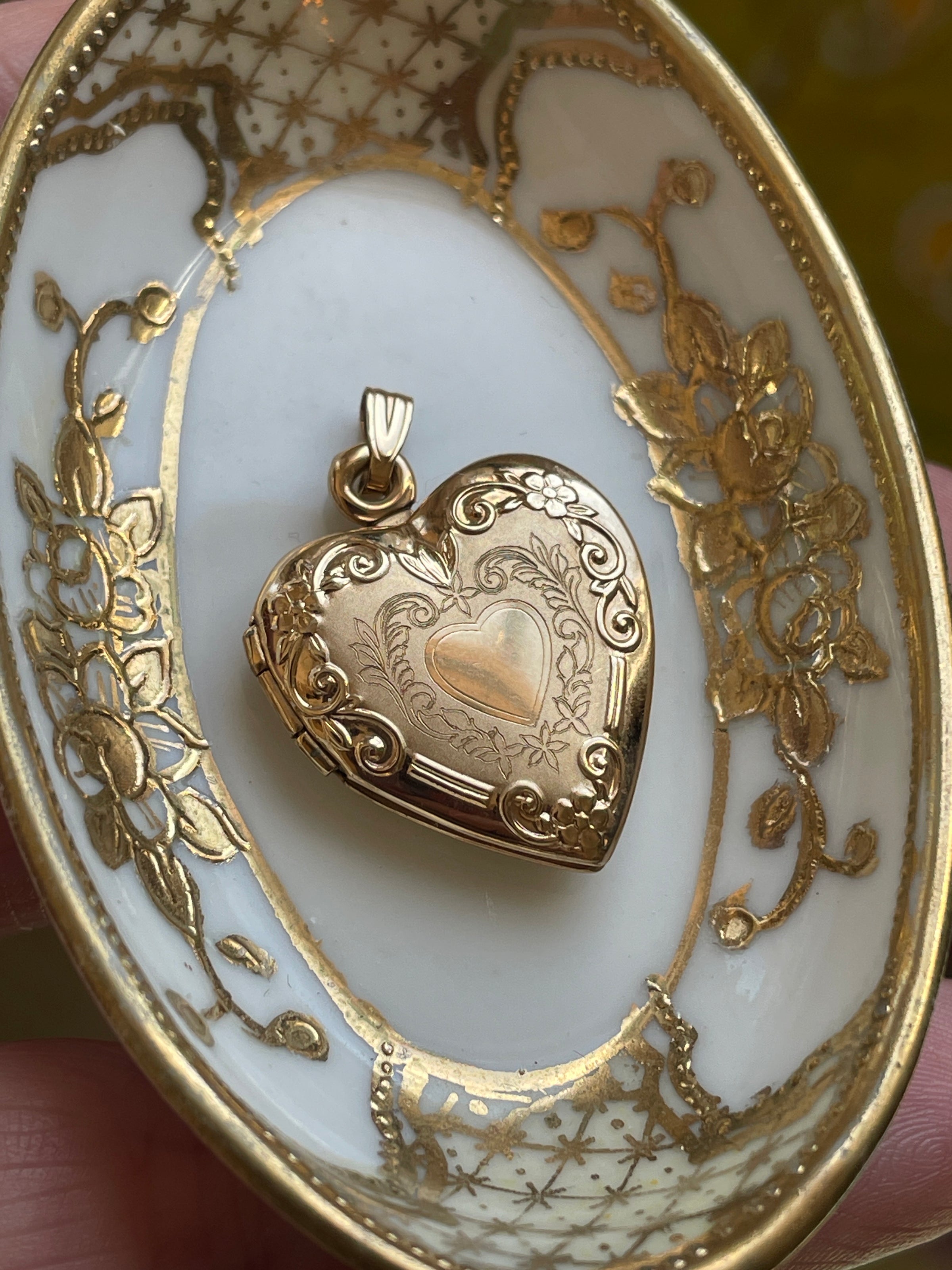 Beautiful vintage Heart locket with gorgeous ornate design in 10k gold. Measures approx 1 inch (with bail) x 0.75 inches. Both acetate are present inside. Stamped 10k on back. Weighs 2.58 grams.