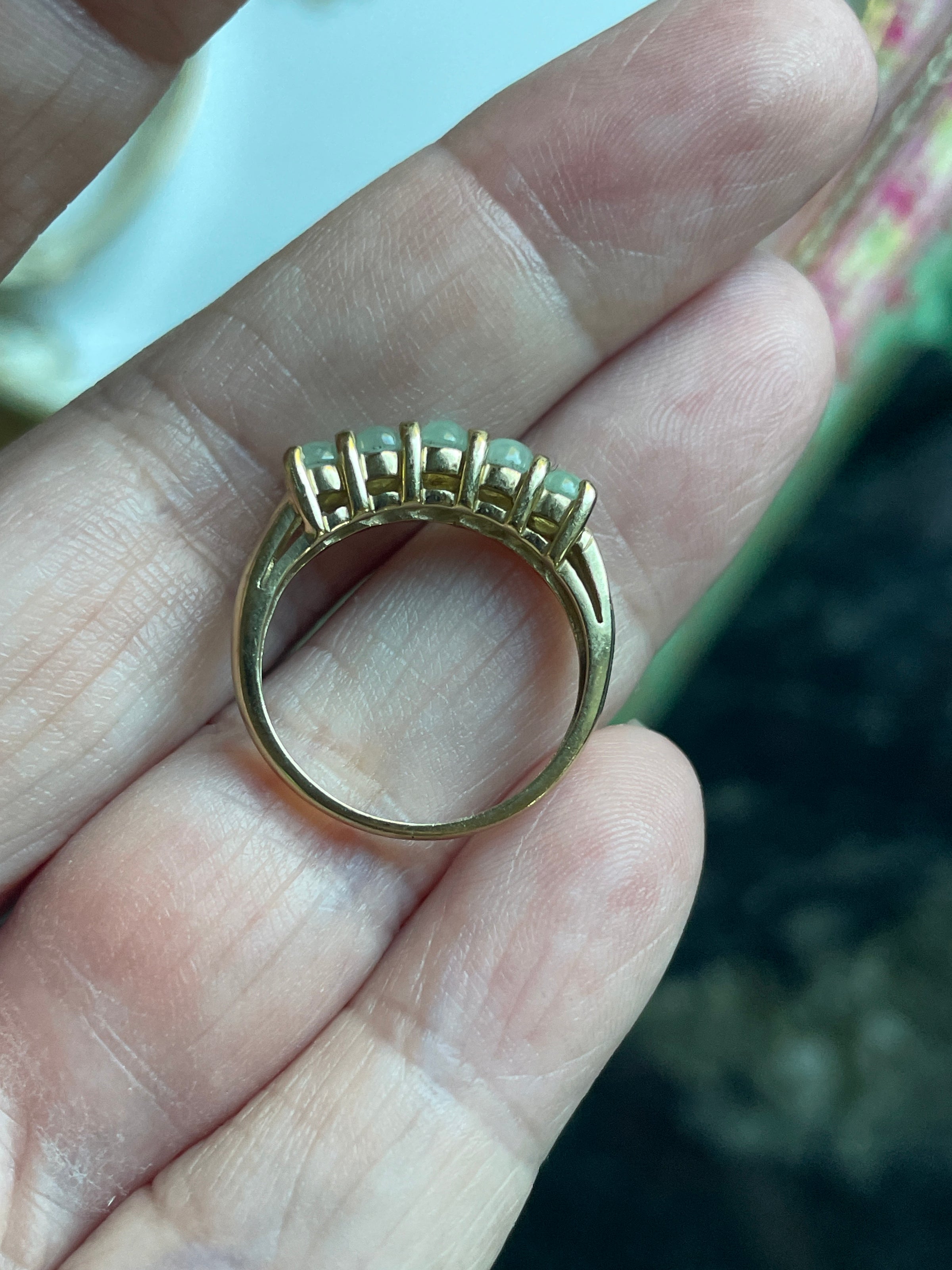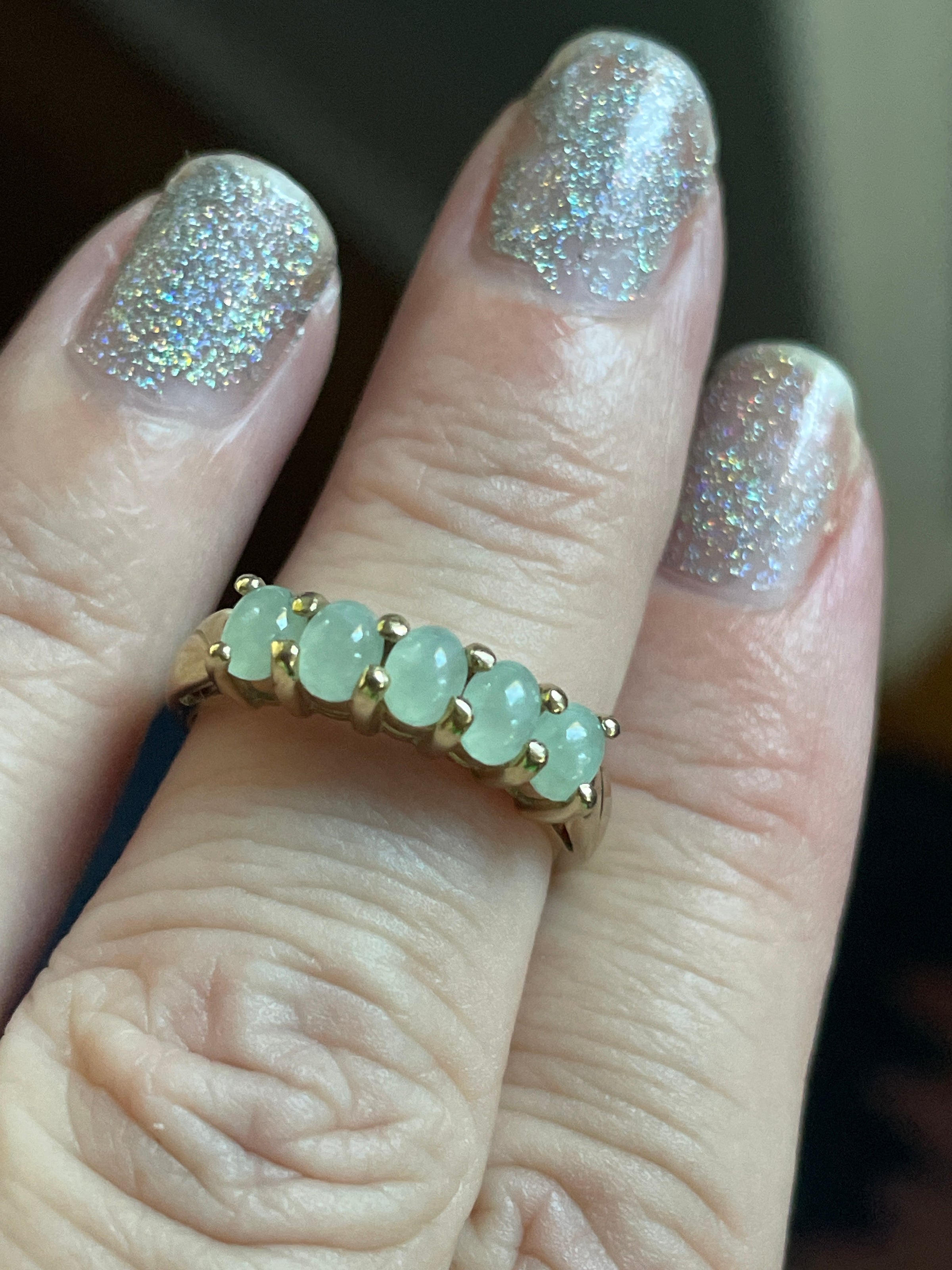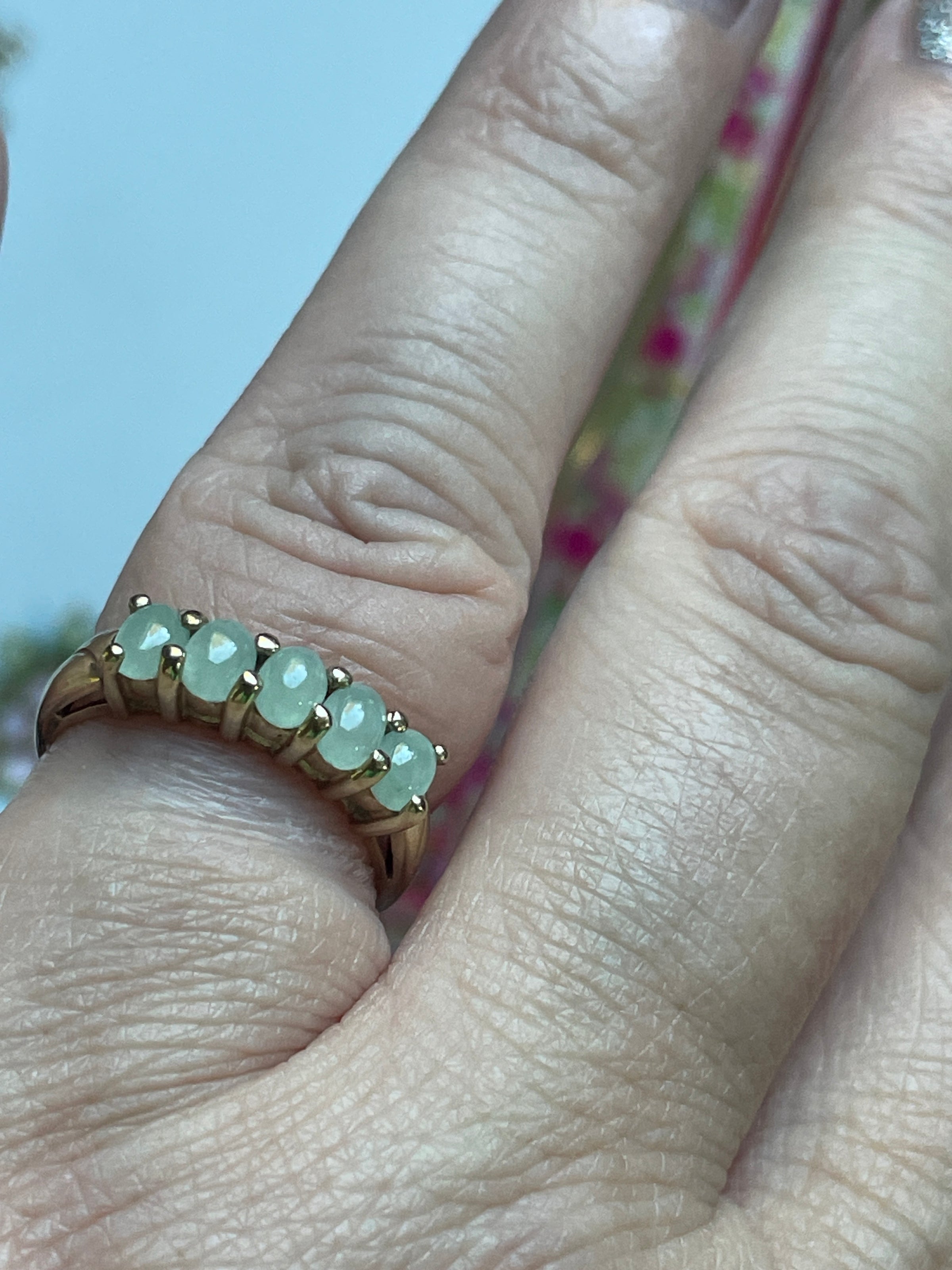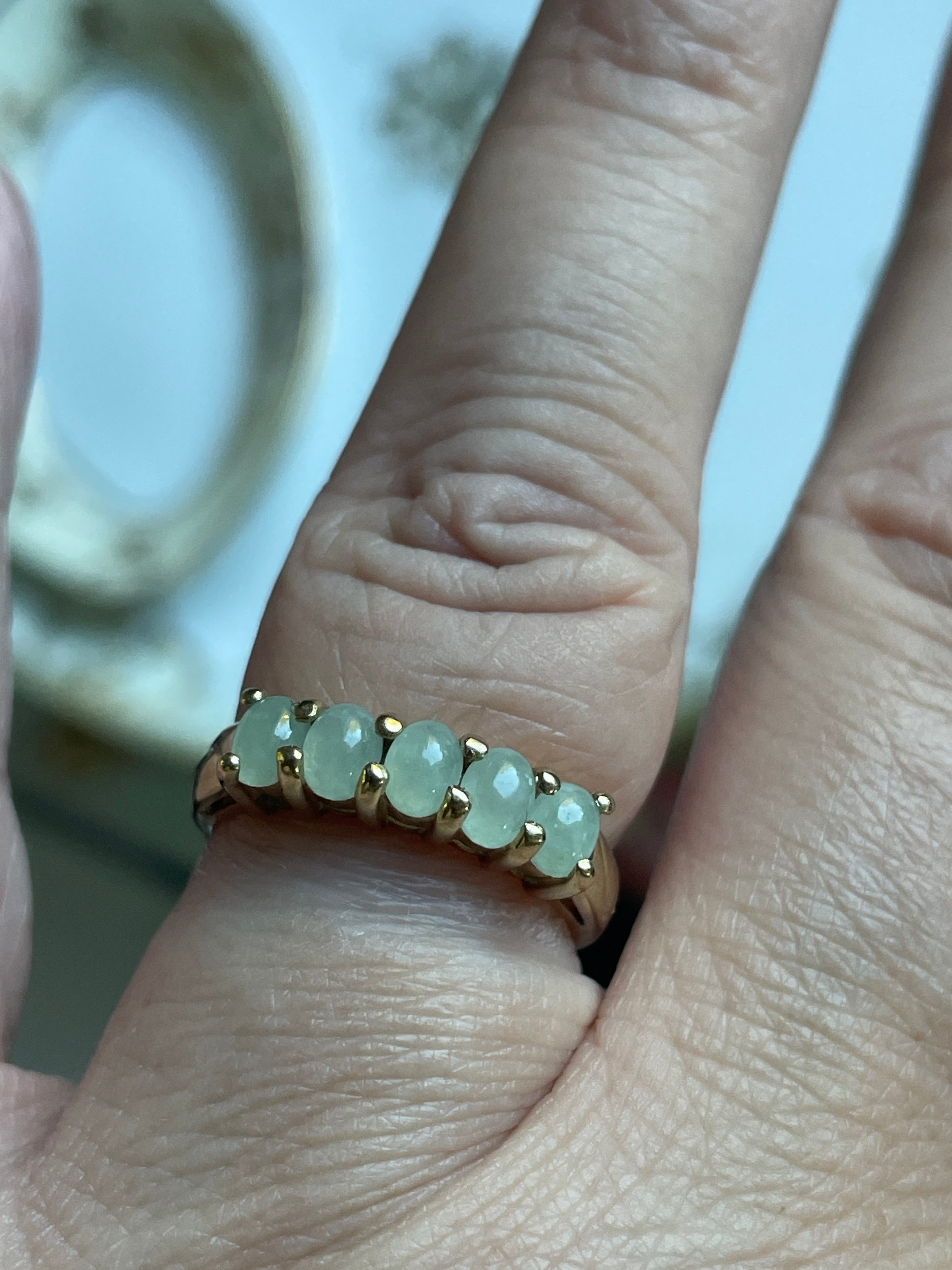 Vintage Jade gold band in 9k gold. Ring size = 5.25. Ring stamped 375 for 9k gold. Beautiful luminous stones. Weighs 2.05 grams.