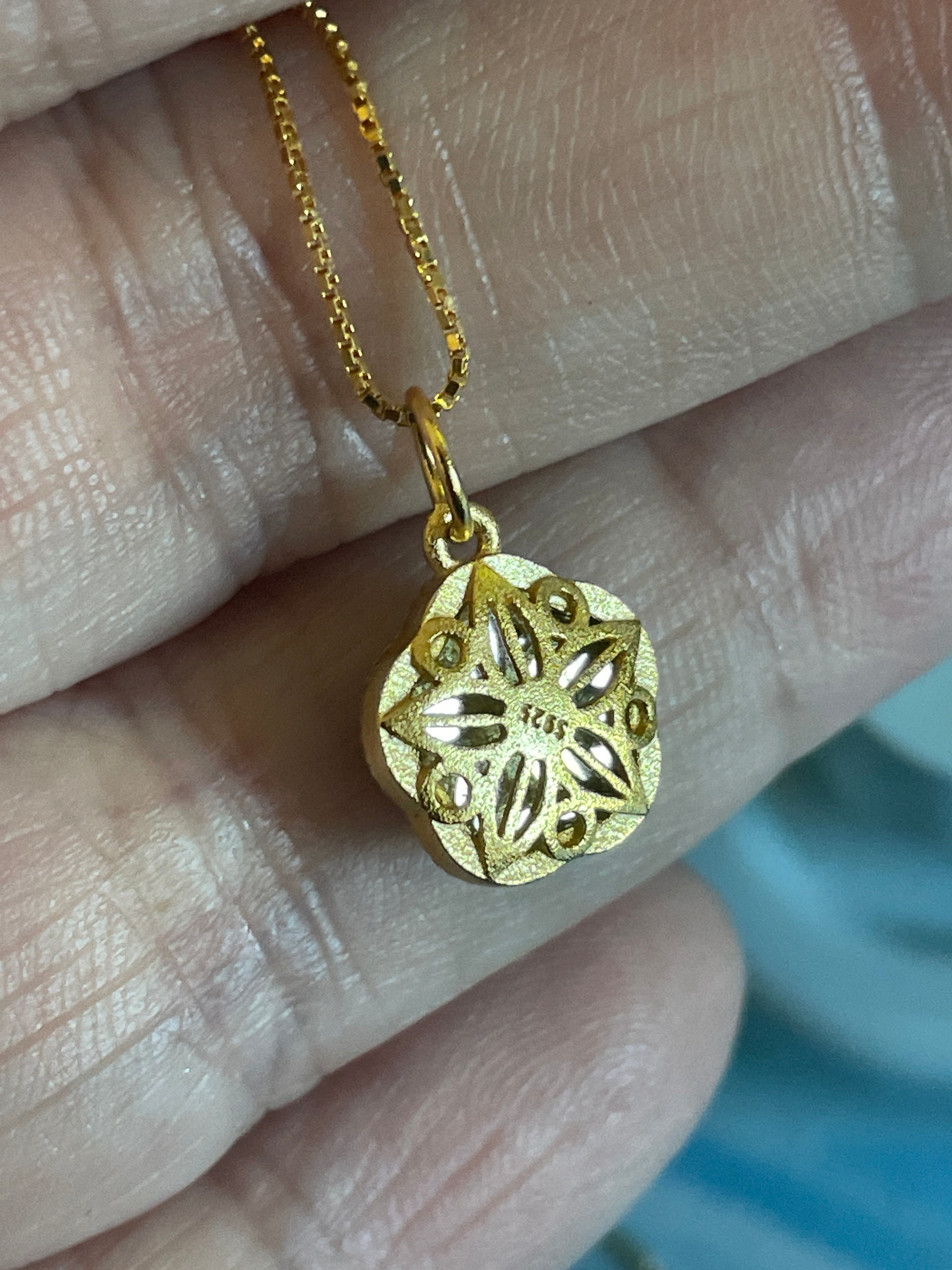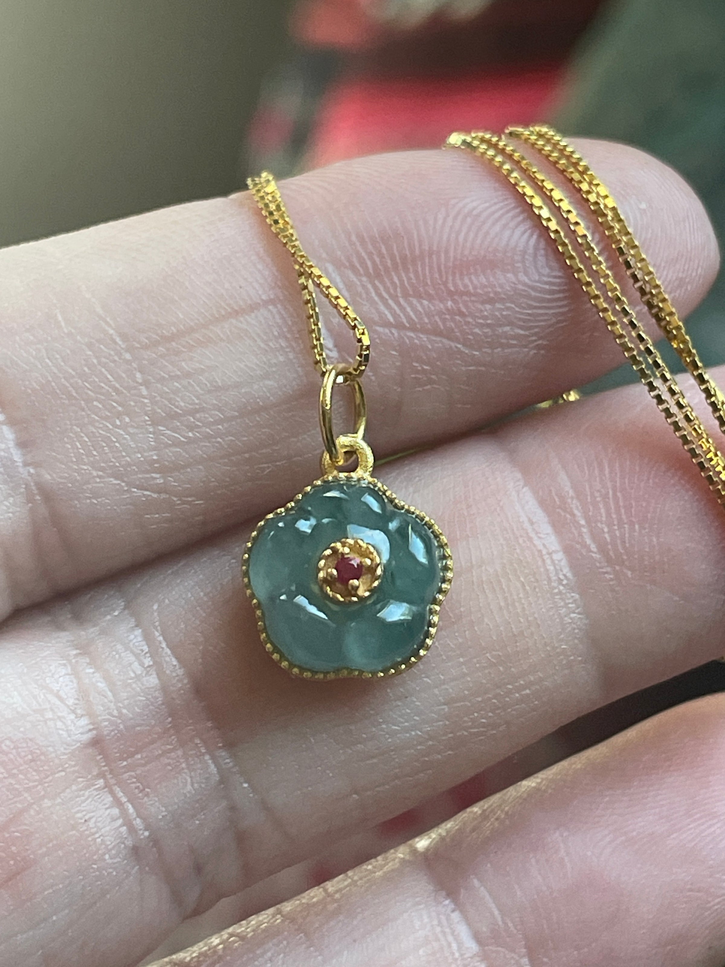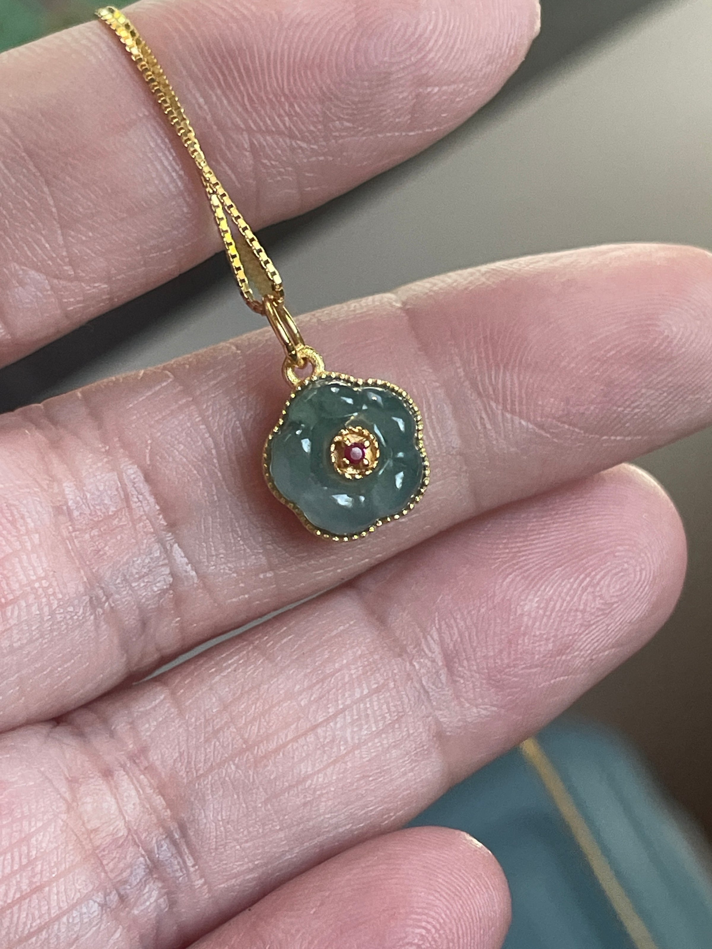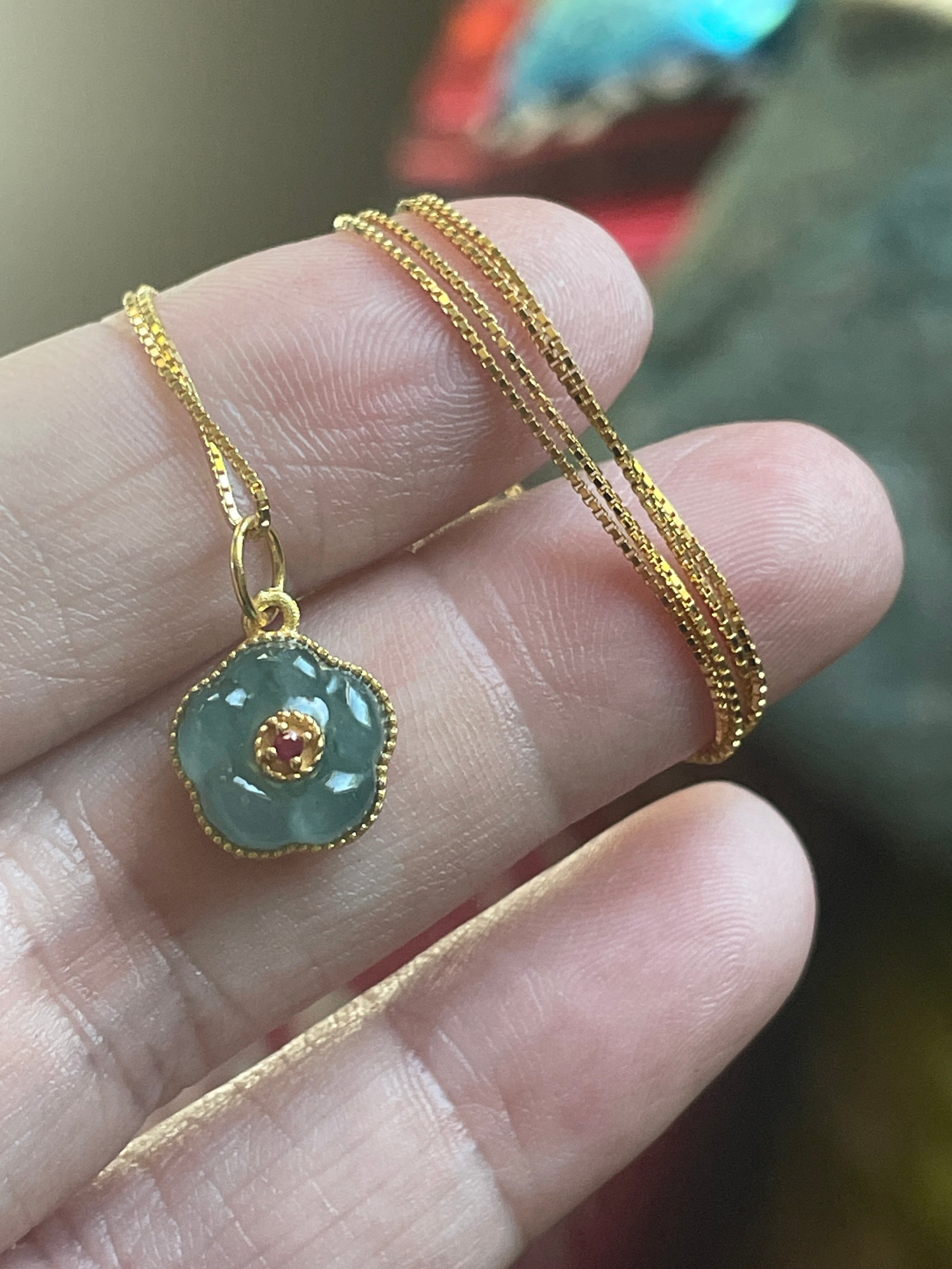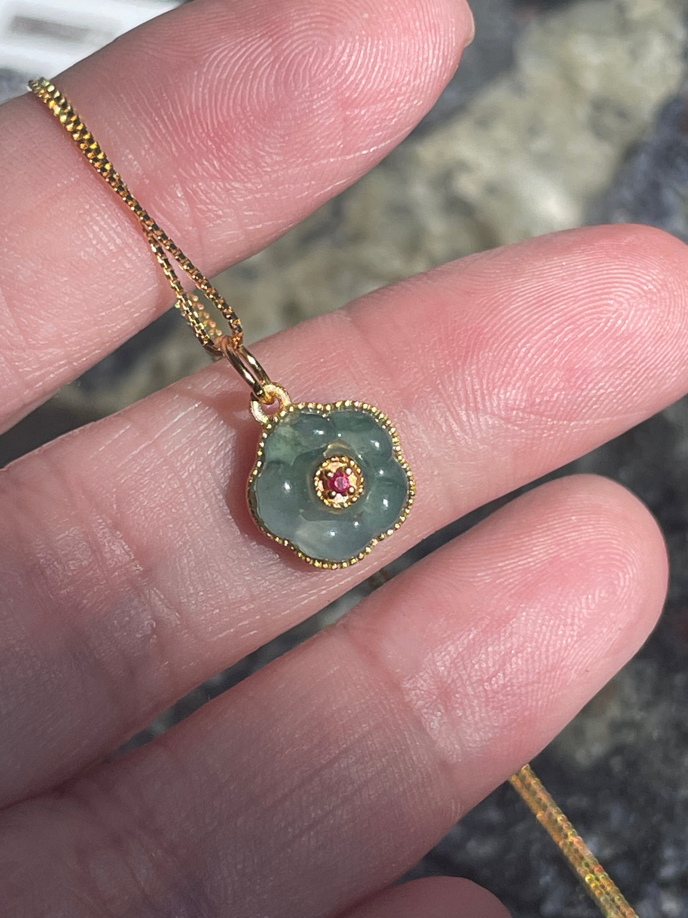 Gorgeous Jade flower necklace in a vibrant bright gold (14k over sterling). Jade has a tiny Tourmalime center. Necklace is adjustable length with a beautiful unique design. Pendant measures approximately 14mm including loop. Chain stamped 925 and Italy.