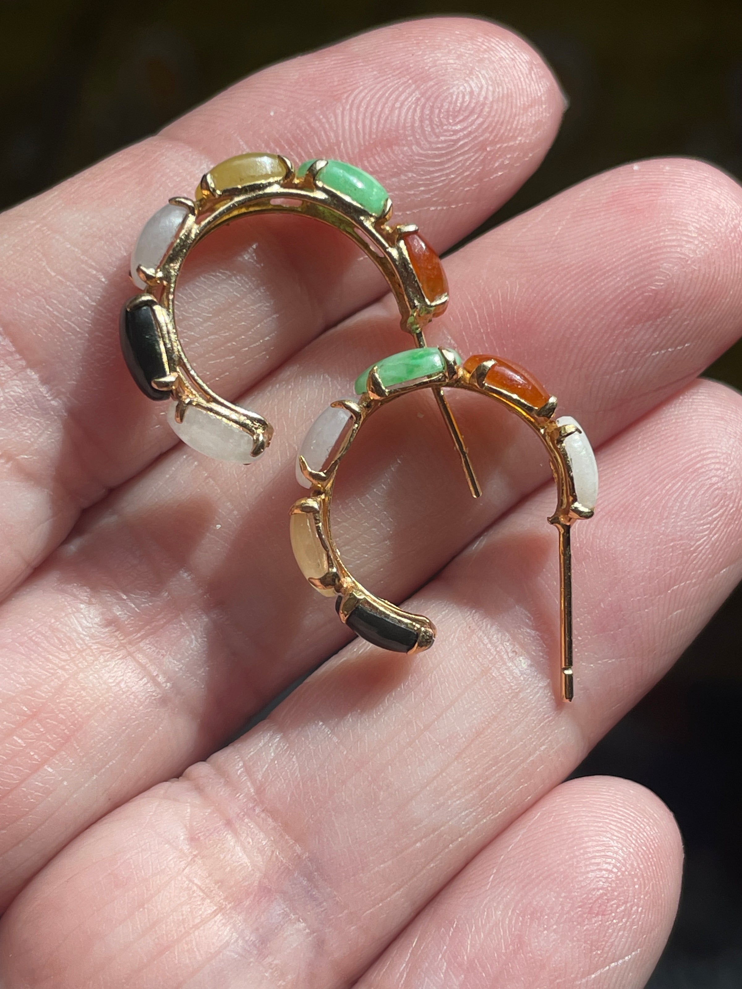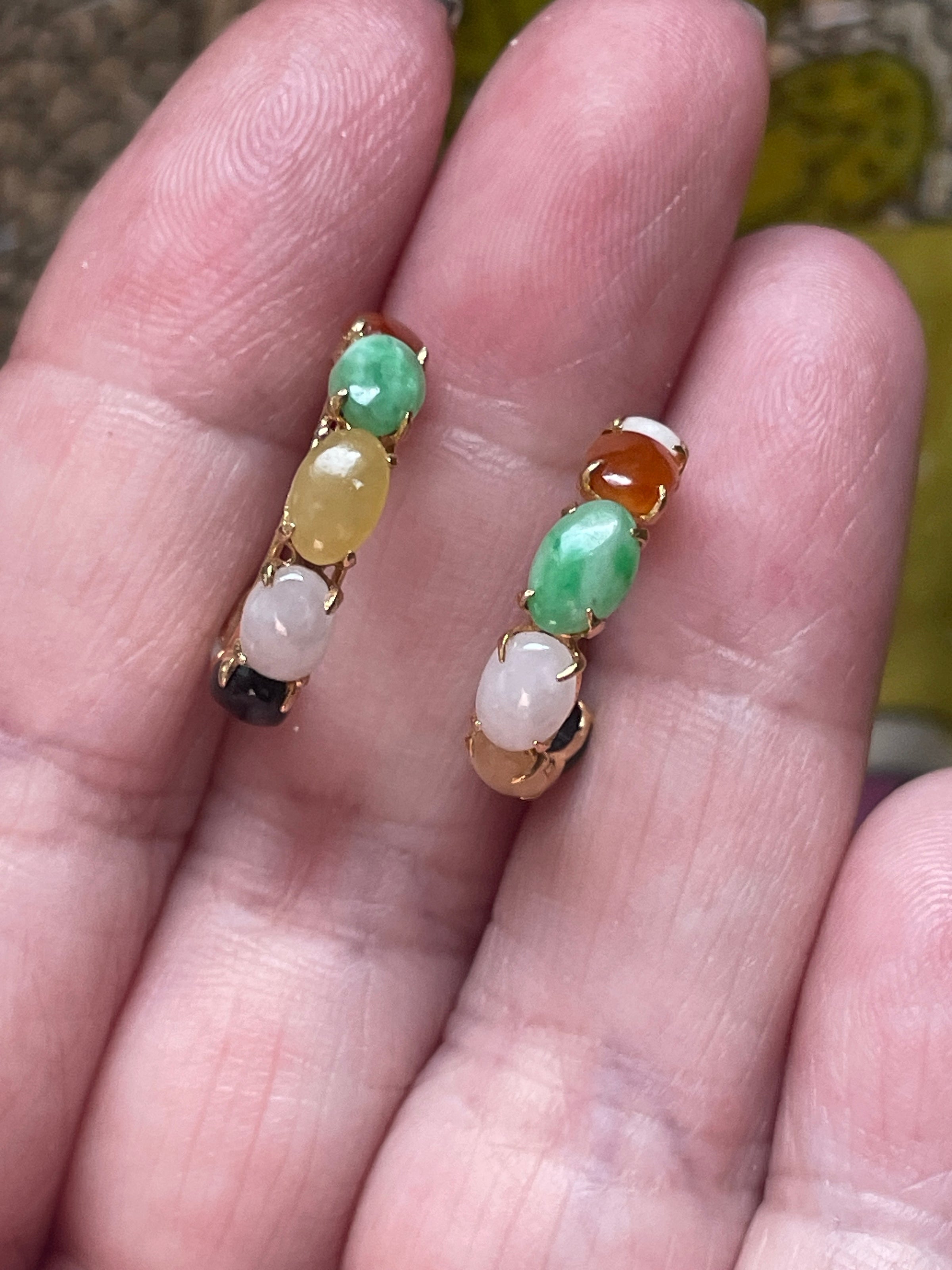 Stunning vintage Jade hoop earrings with various shades of Jade. These measure approx 0.75 inches. They have post backs. Unmarked but tested 14k. Backs are stamped 14k. Note stones are in different order on each earring. So gorgeous!