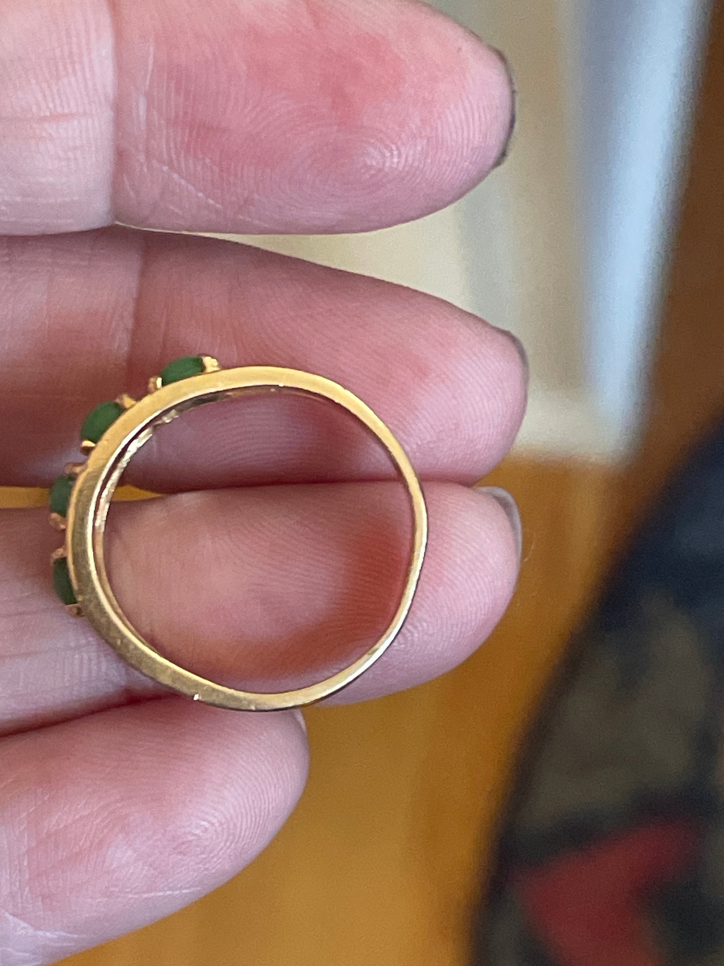 Fabulous vintage Jade four stone ring in buttery 14k gold. Ring size = 6.25. Stamped 14k. Ring slightly out of round but comfortable. Weight just under 3 grams.