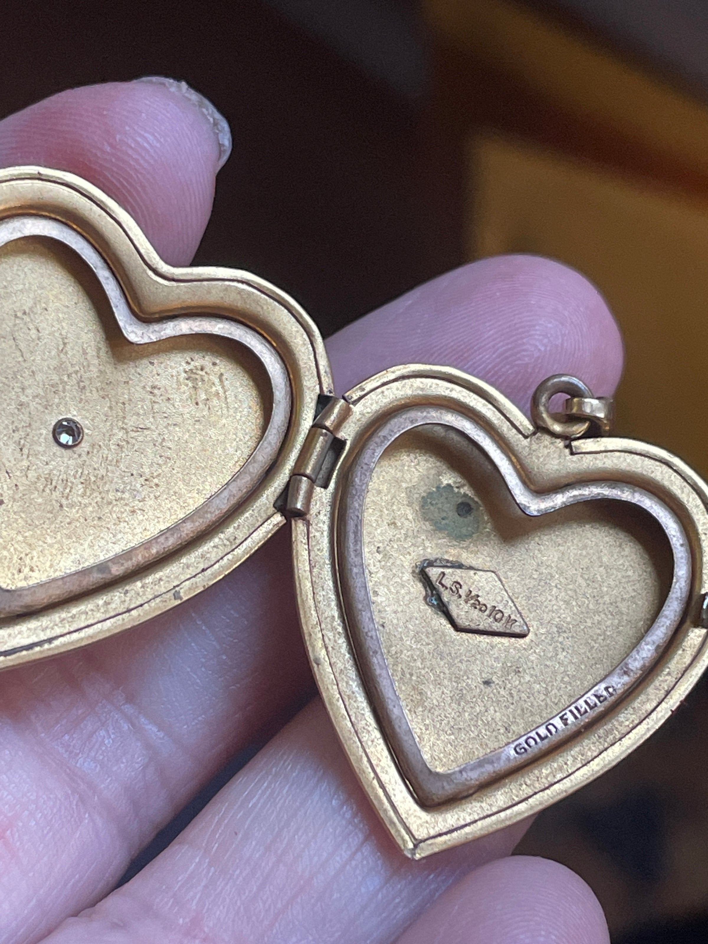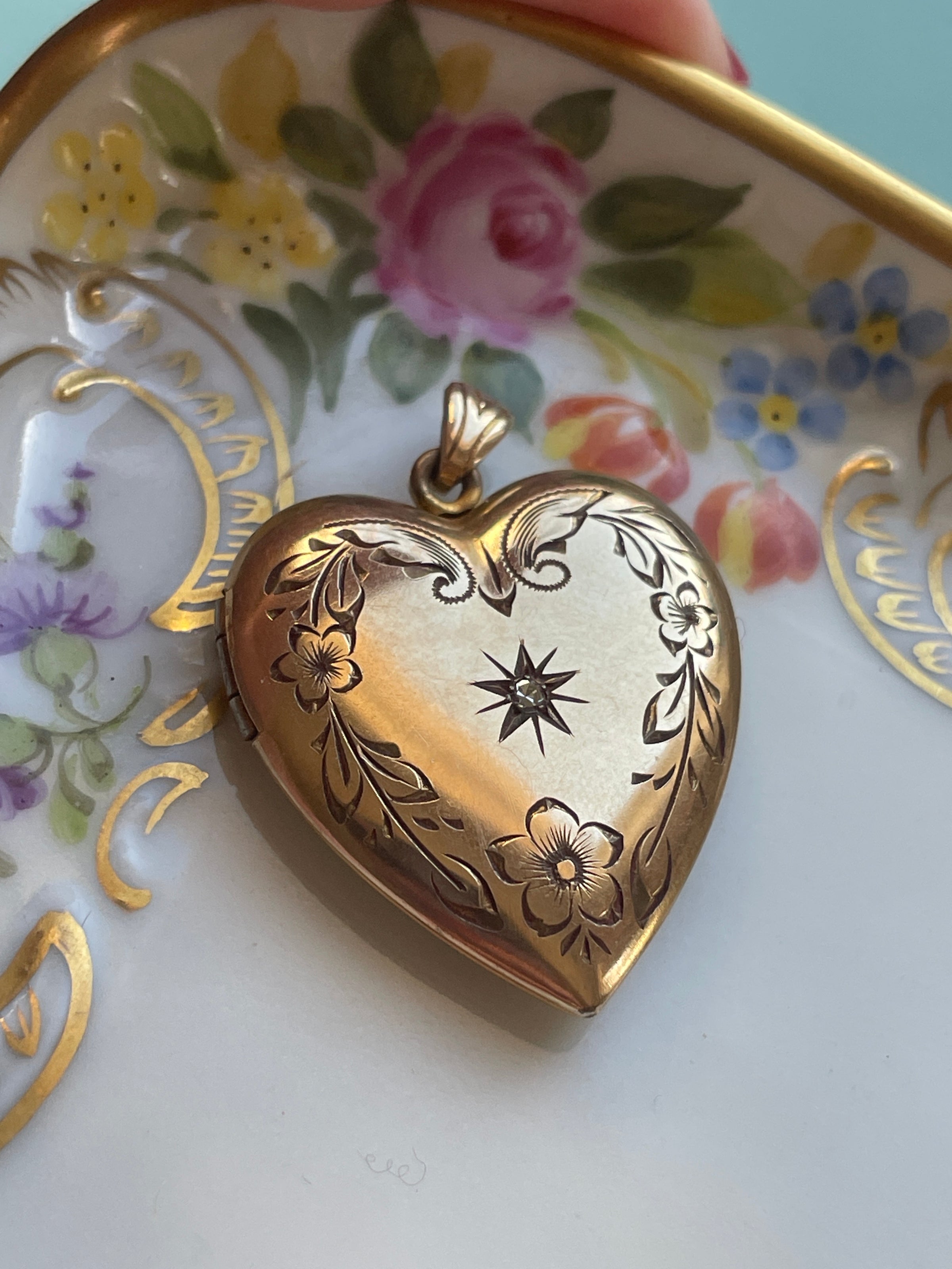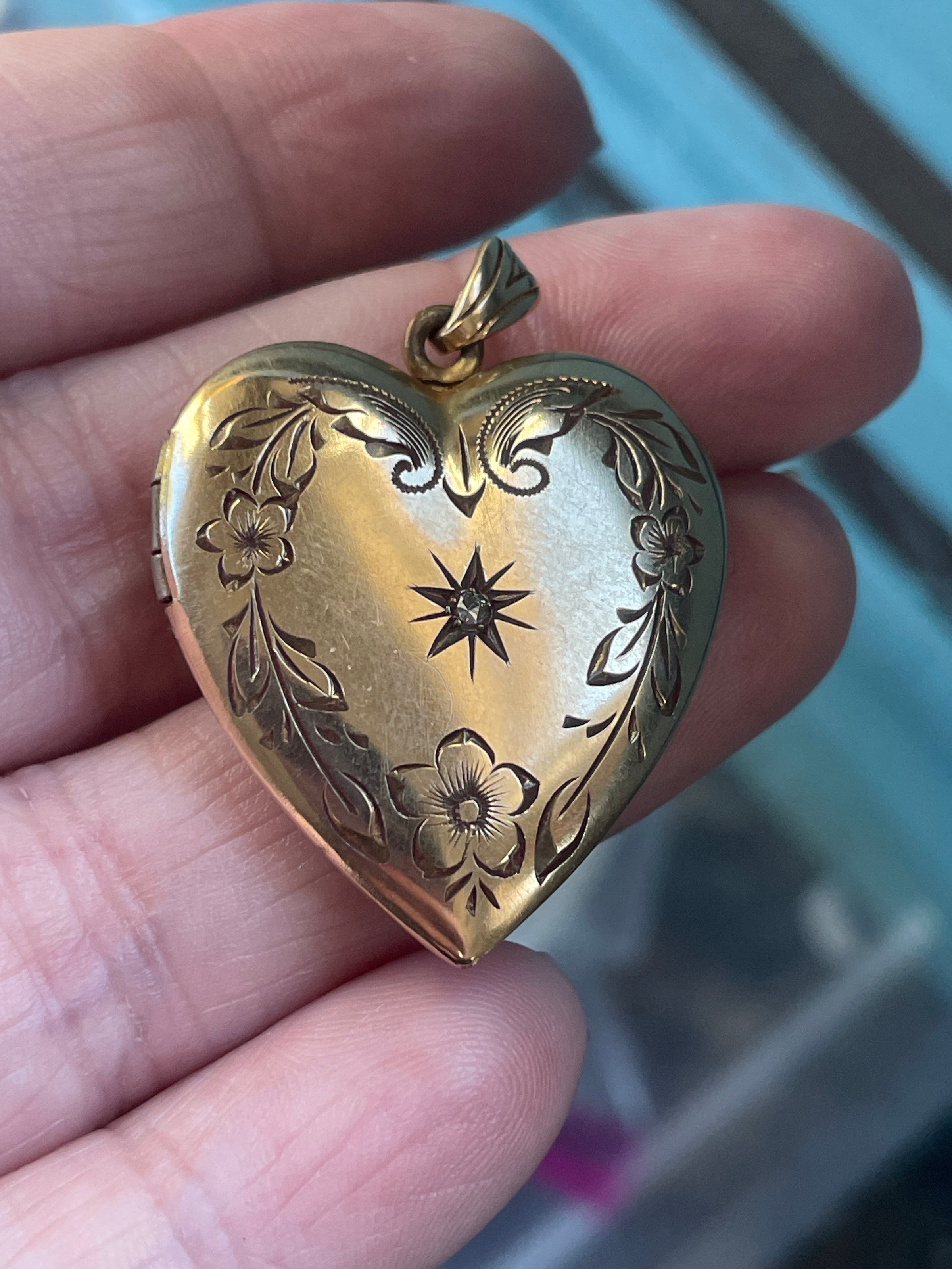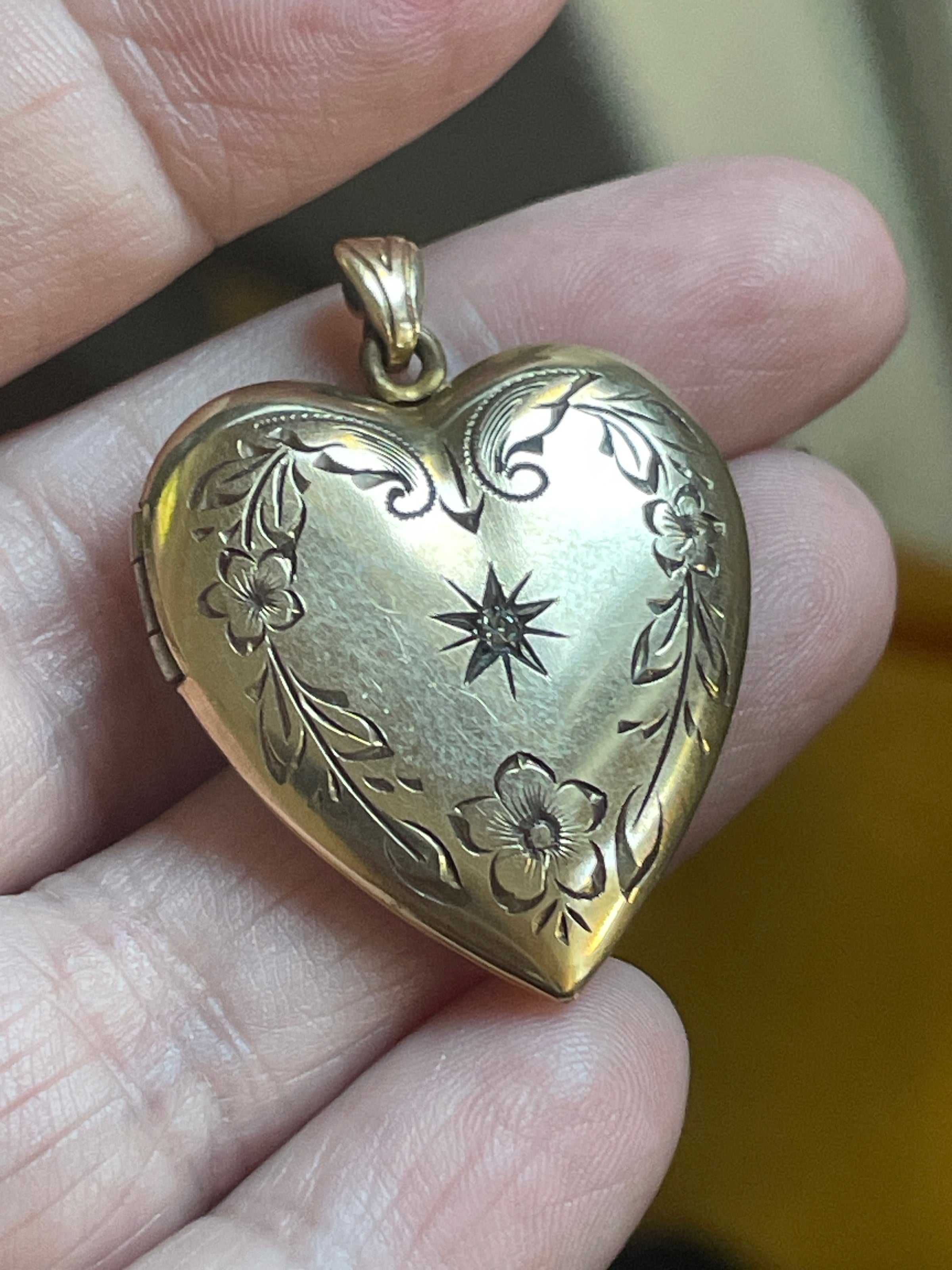Stunnig larger heart locket with engraved flowers and a paste in a star setting at the middle. Locket measures just over 1.25 inches (with bail) x 1 inch. Two frames present no acetate. Stamped for gold filled on frame and inside locket. Closes with a snap. Light scratches on back.
