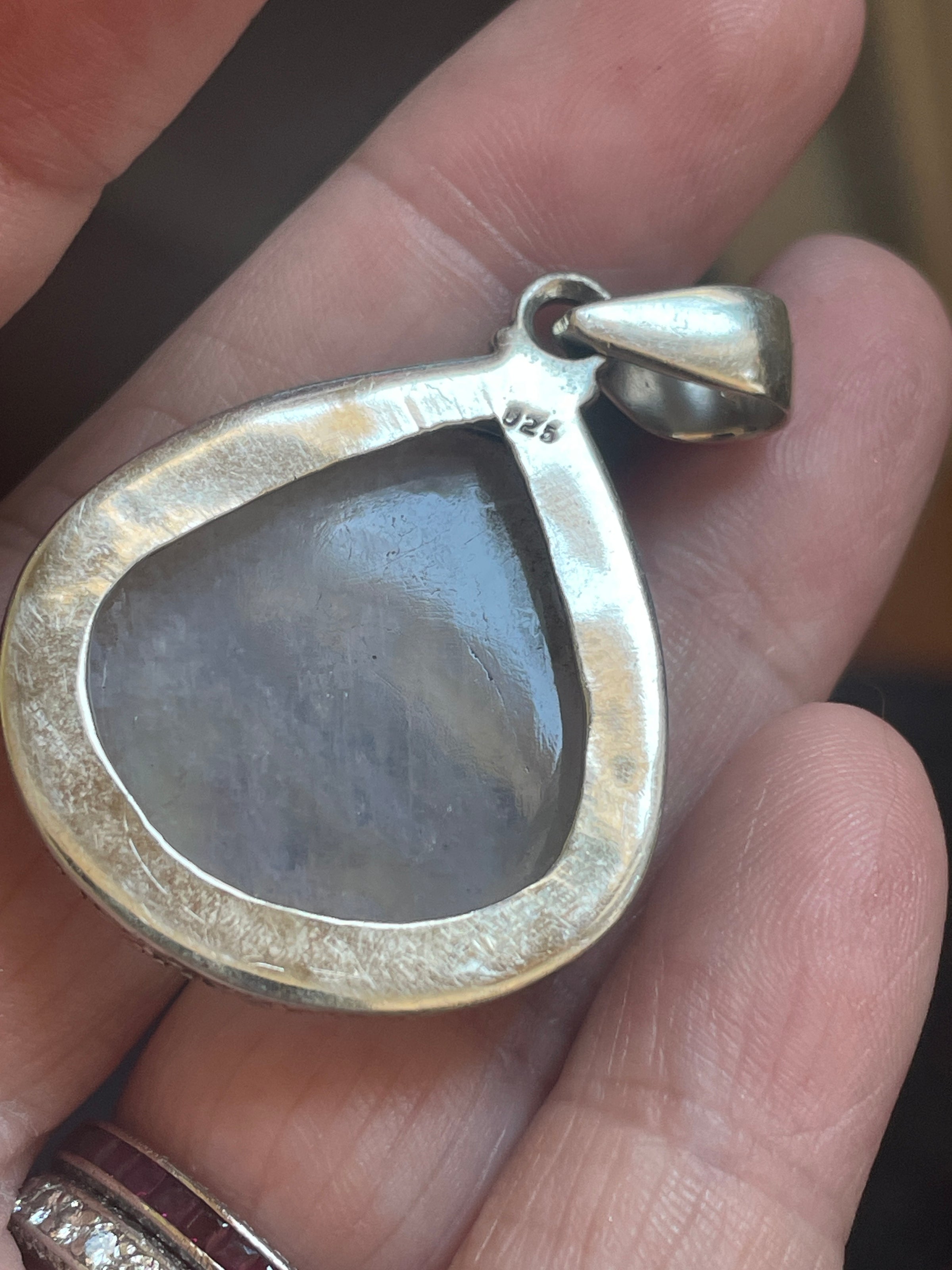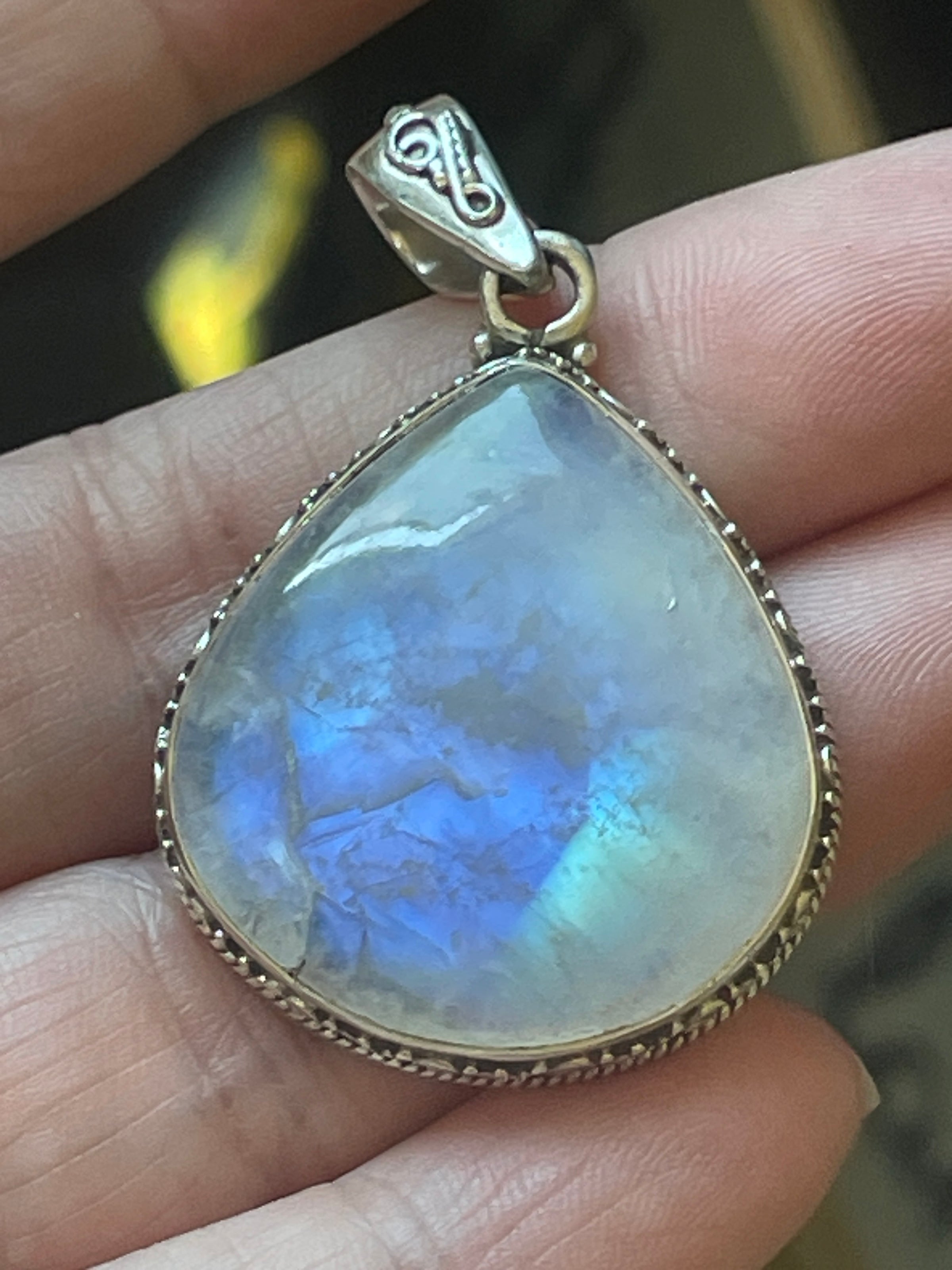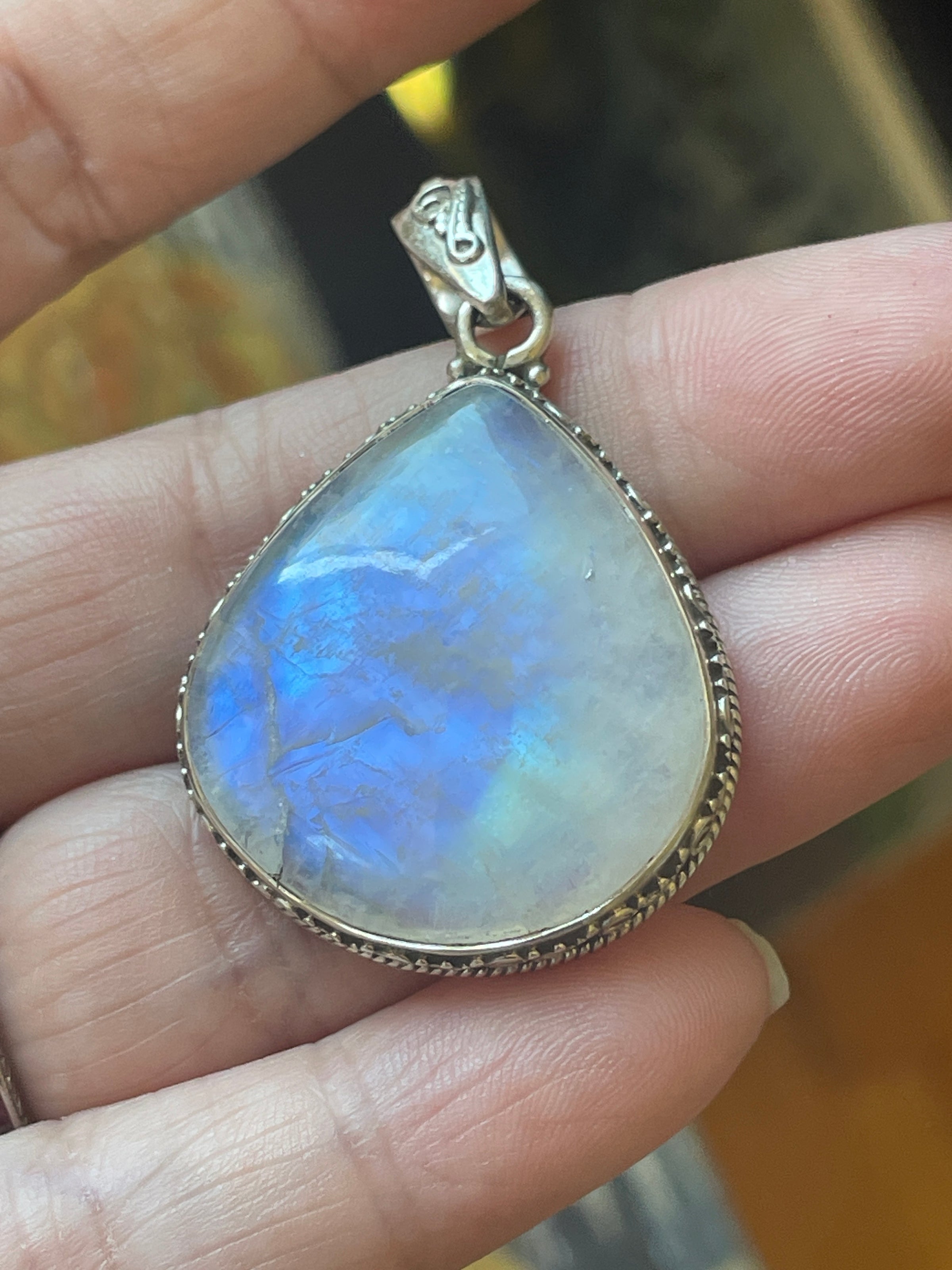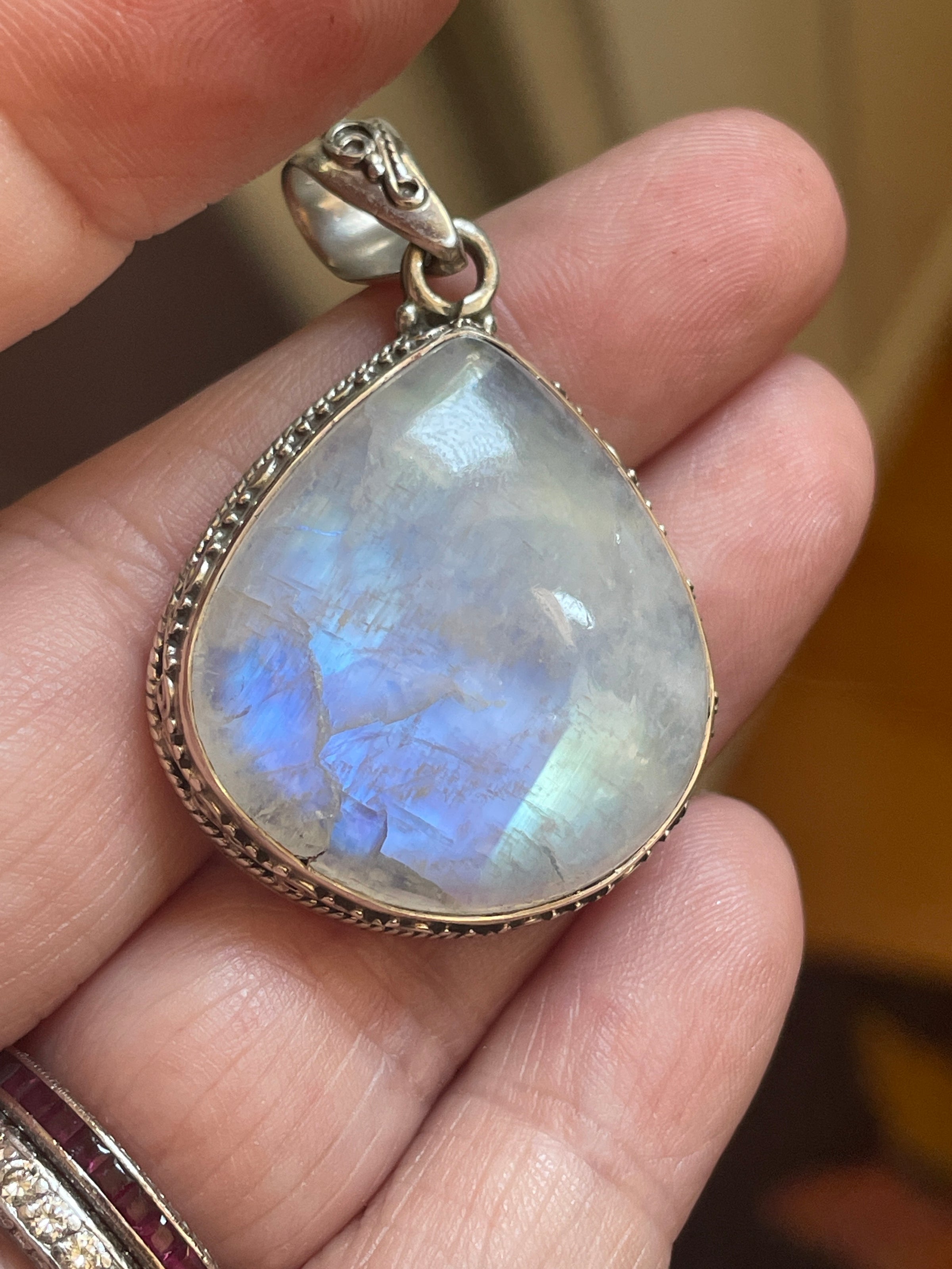 Fabulous glowing Moonstone teardrop pendant in sterling silver. Measures just over 1.5 inches (with bail) x approx 1 inch wide. Stamped 925. This is a modern piece. Note lots of inclusions but also tons of blue flash.