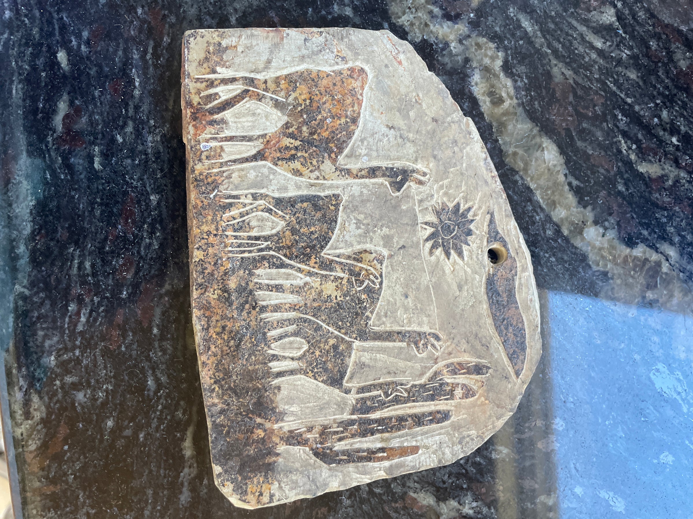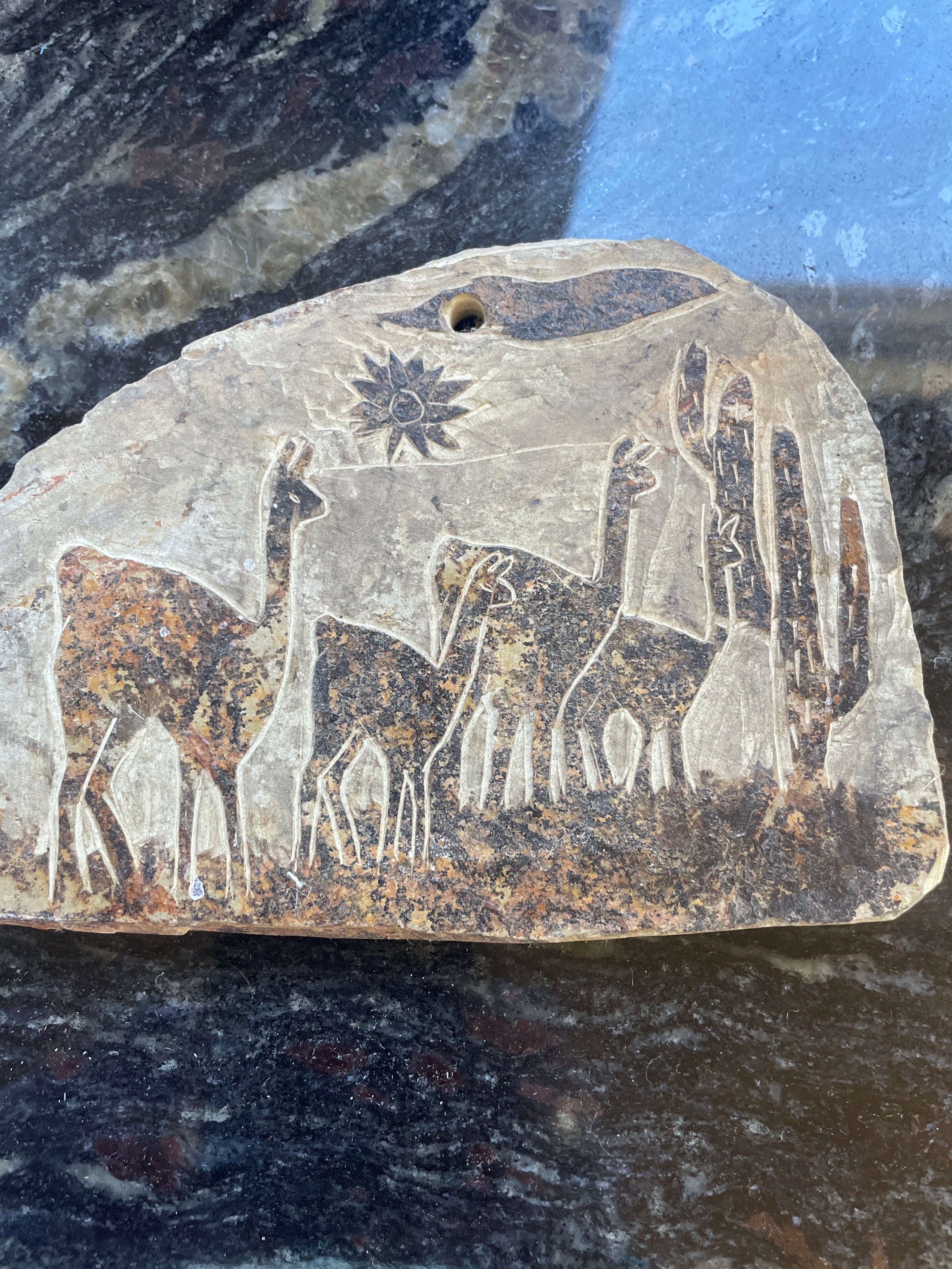 Stunning Llama slate Art piece with beautiful natural stone and engraved design. Measures 5.25 inches x 4.25 inches. Heavy piece. Has hole at the top to hang.