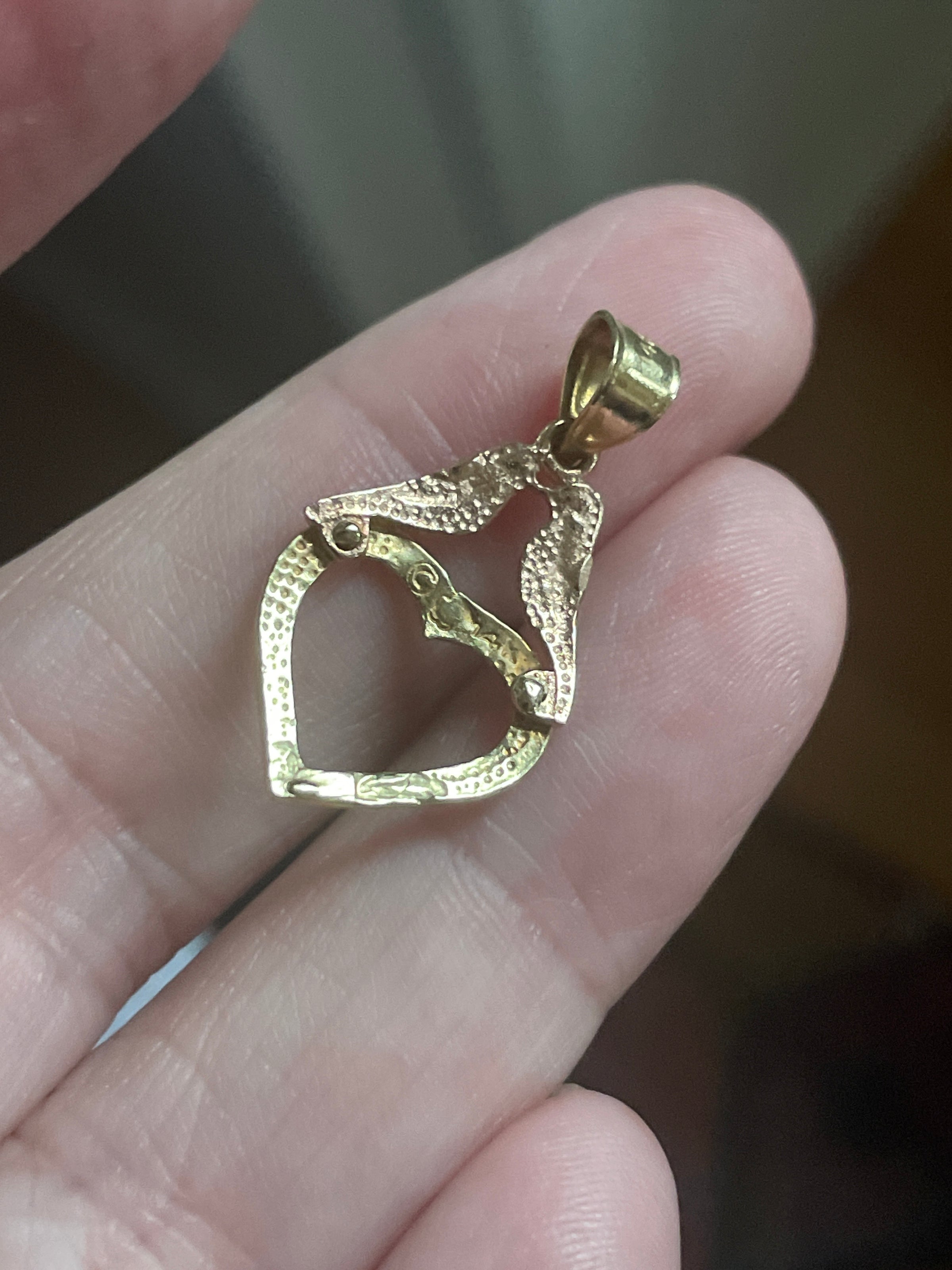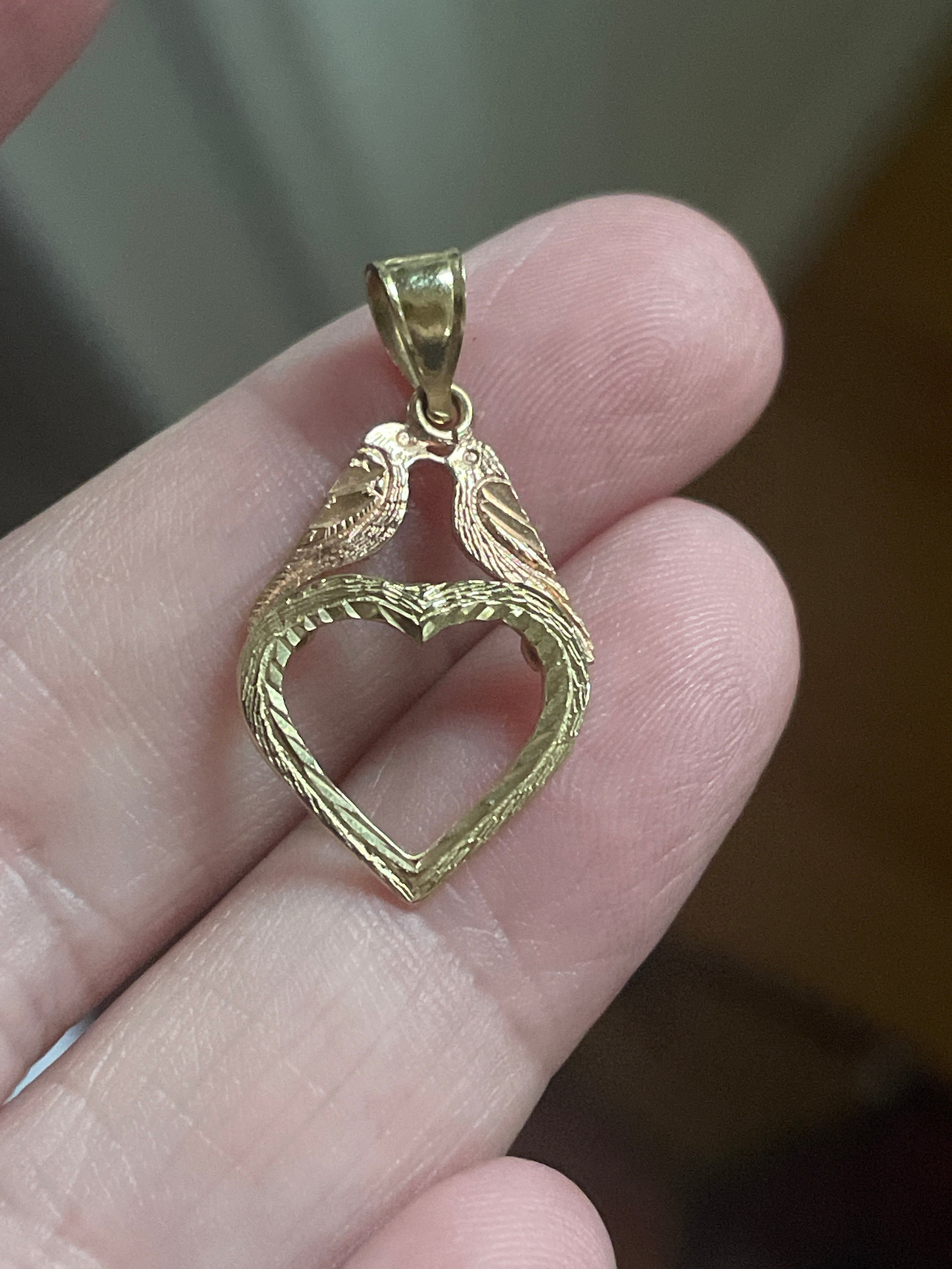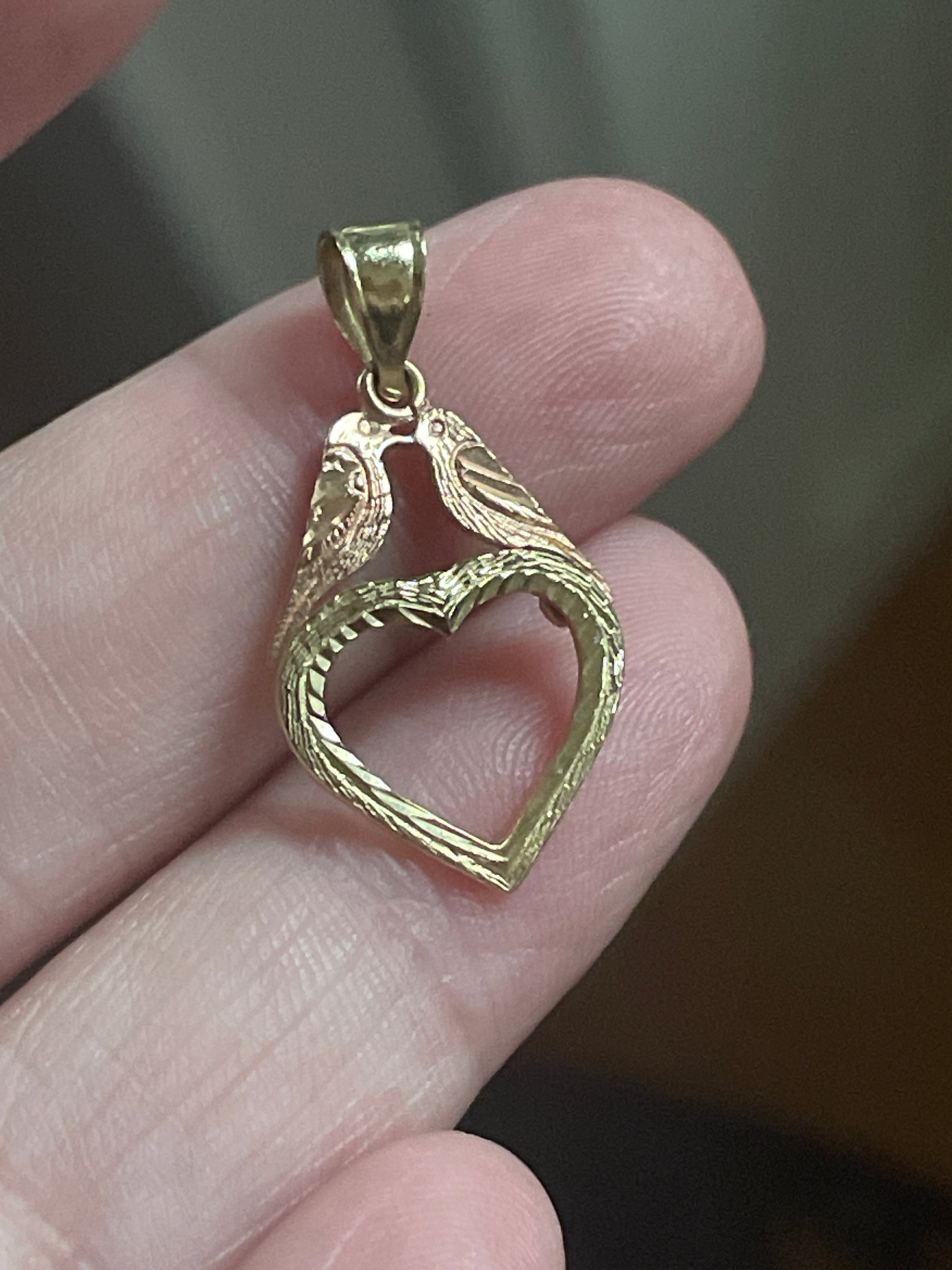 Beautiful delicate yet ornate lovebirds pendant with Rose gold birds on a yellow gold heart.  Pendant measures just under 1 inches.  Stamped 14k on bail.