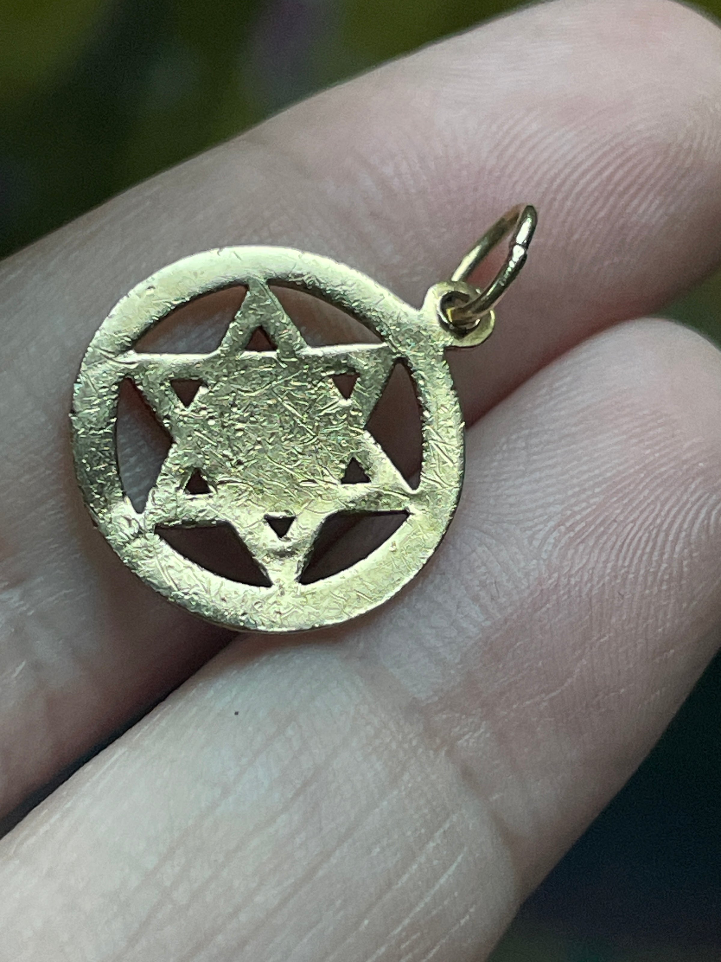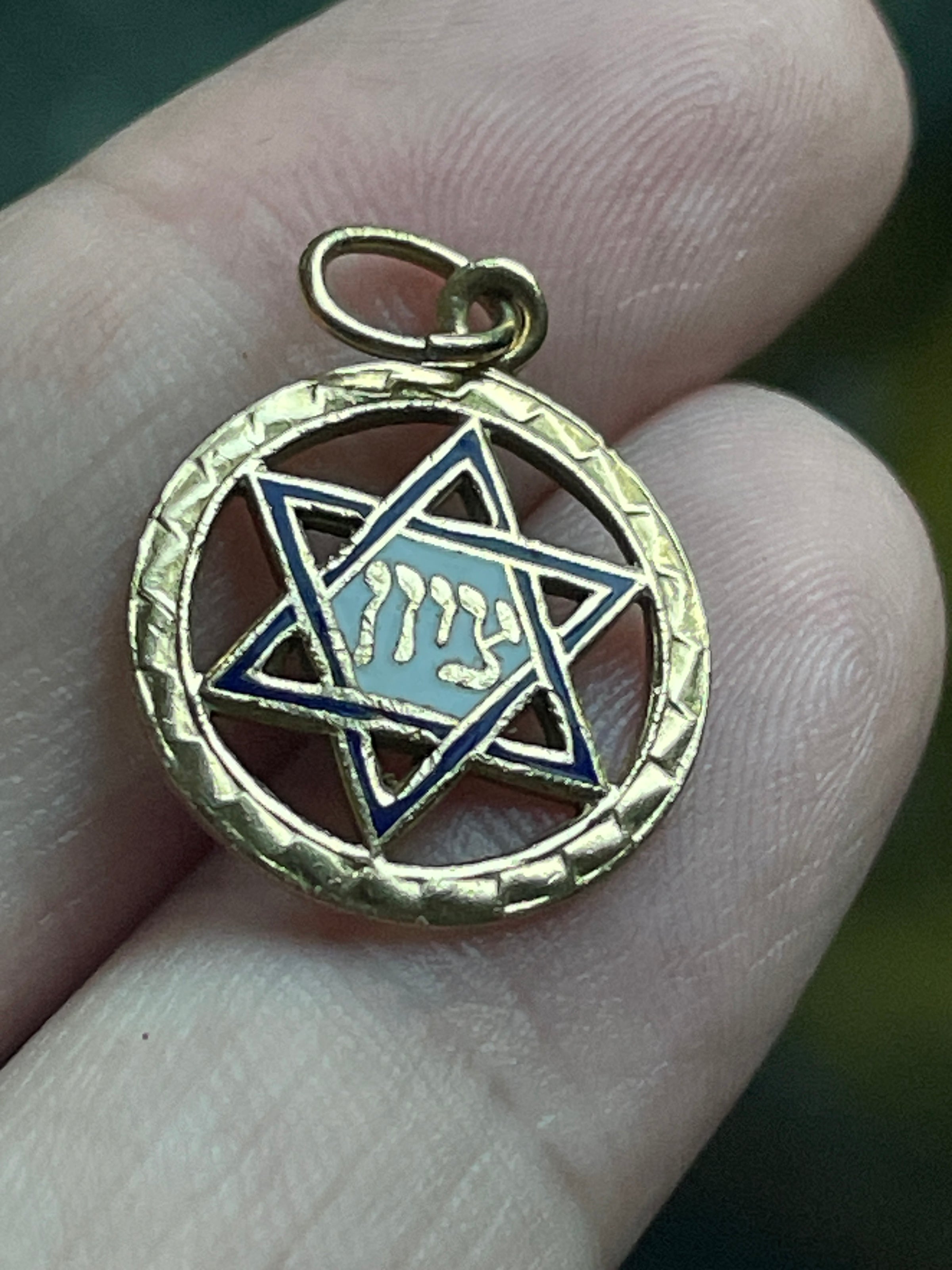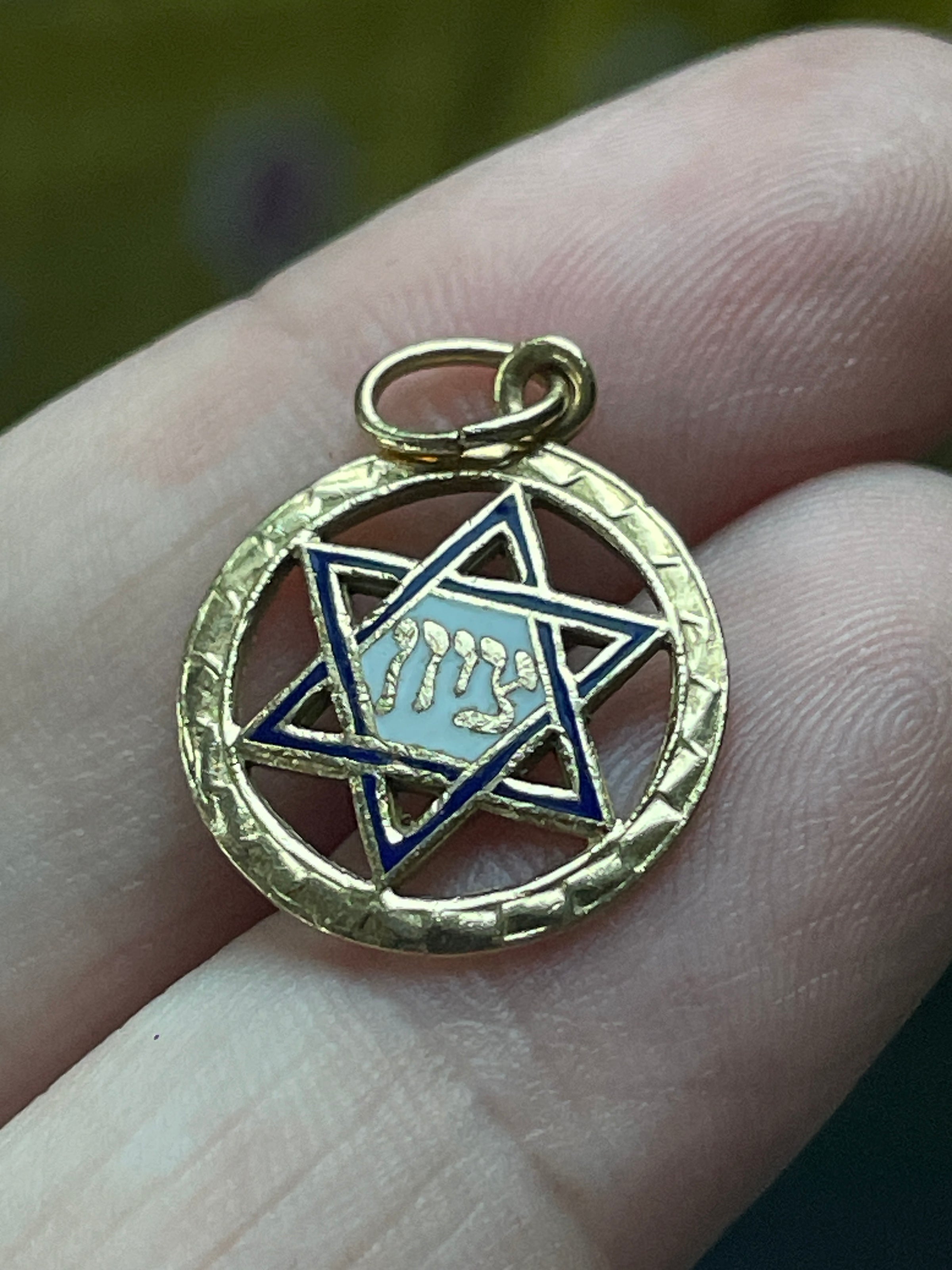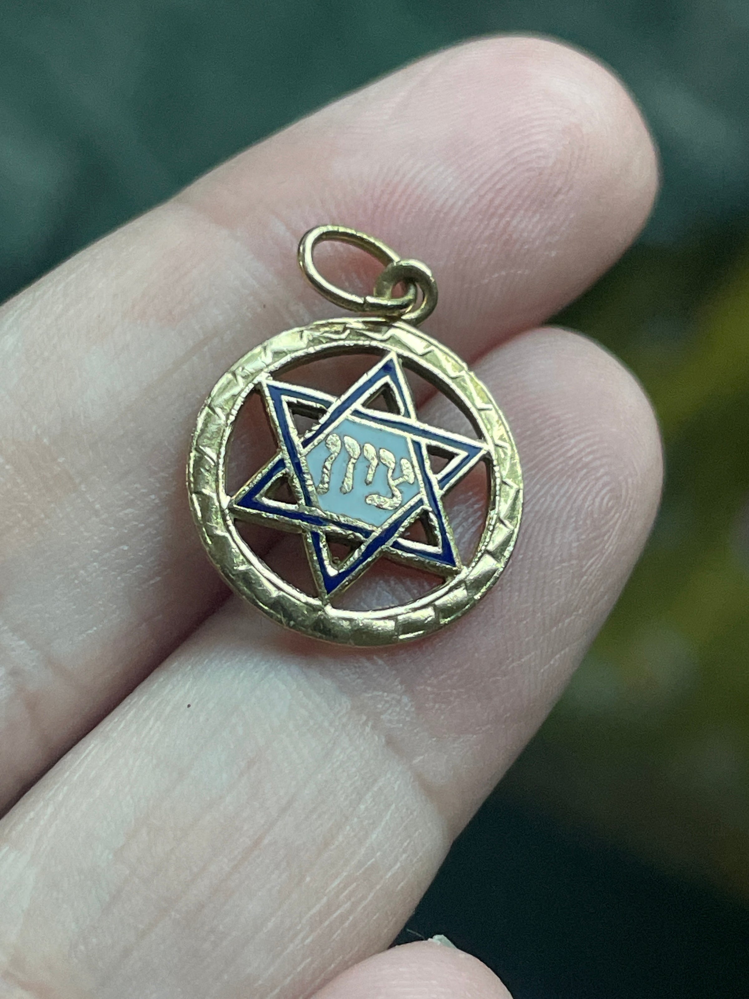 Beautiful detailed enameled vintage Magen David or Jewish star pendant in 14k gold. Lovely enameling with a tiny bit of wear and gorgeous patterned edge. Measures approx 0.75 inches (with top loop) x just over 0.5 inches. Faded 14k mark but tested 14k as well.