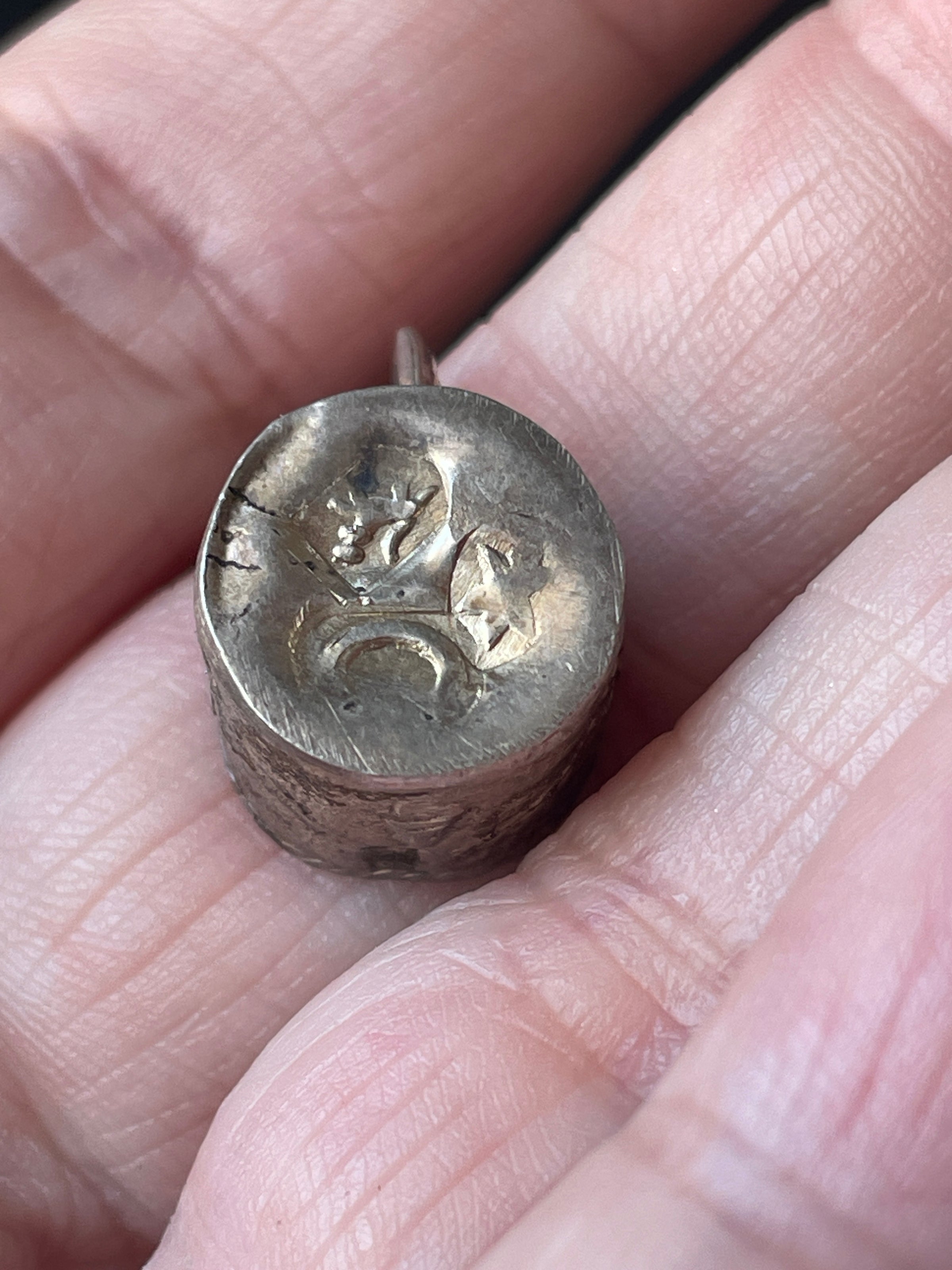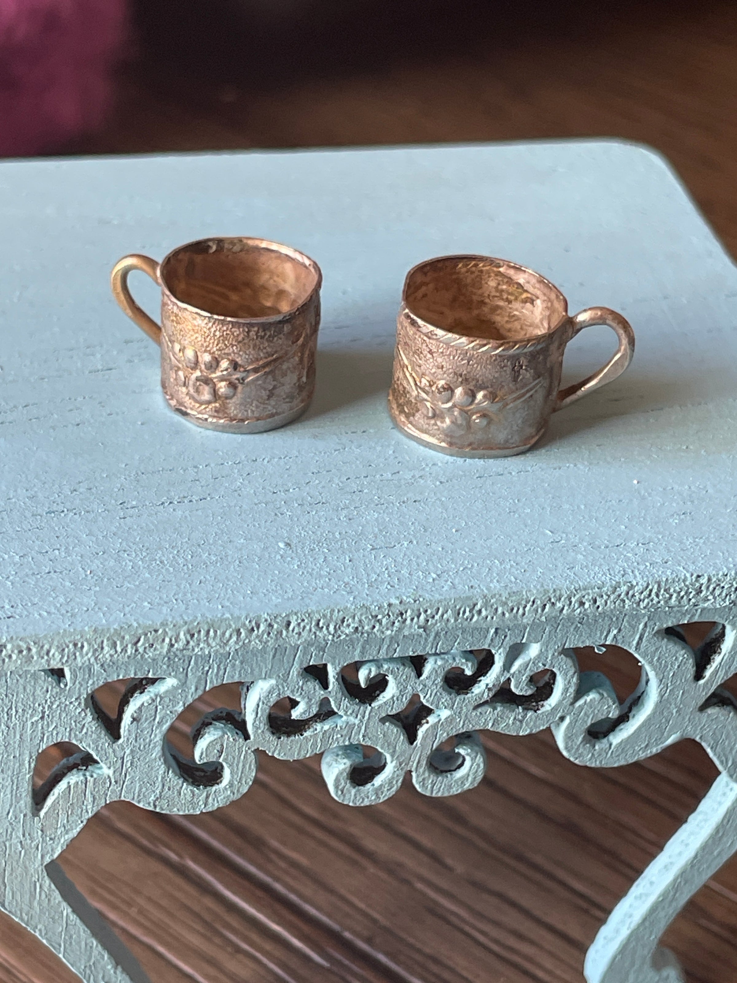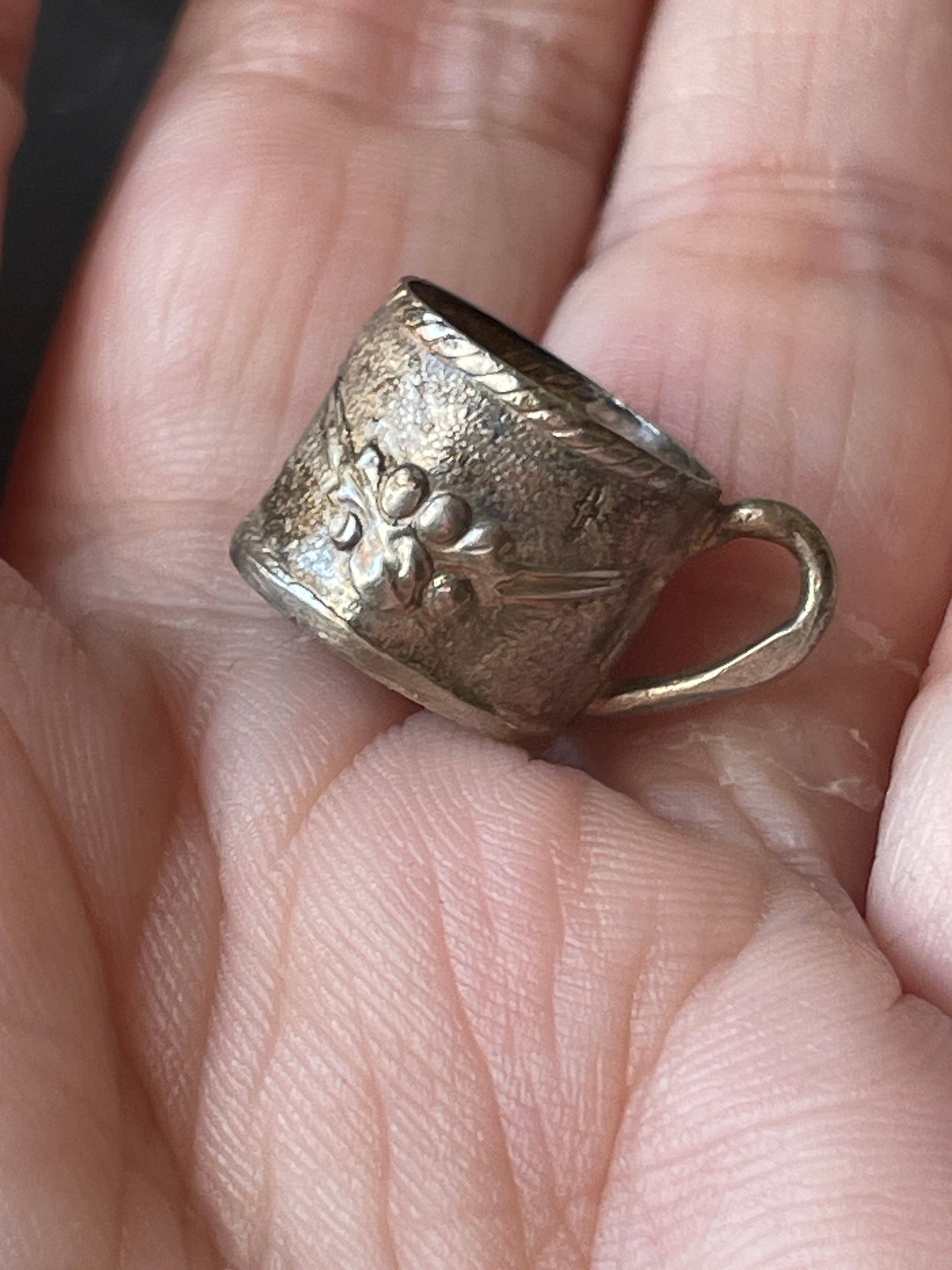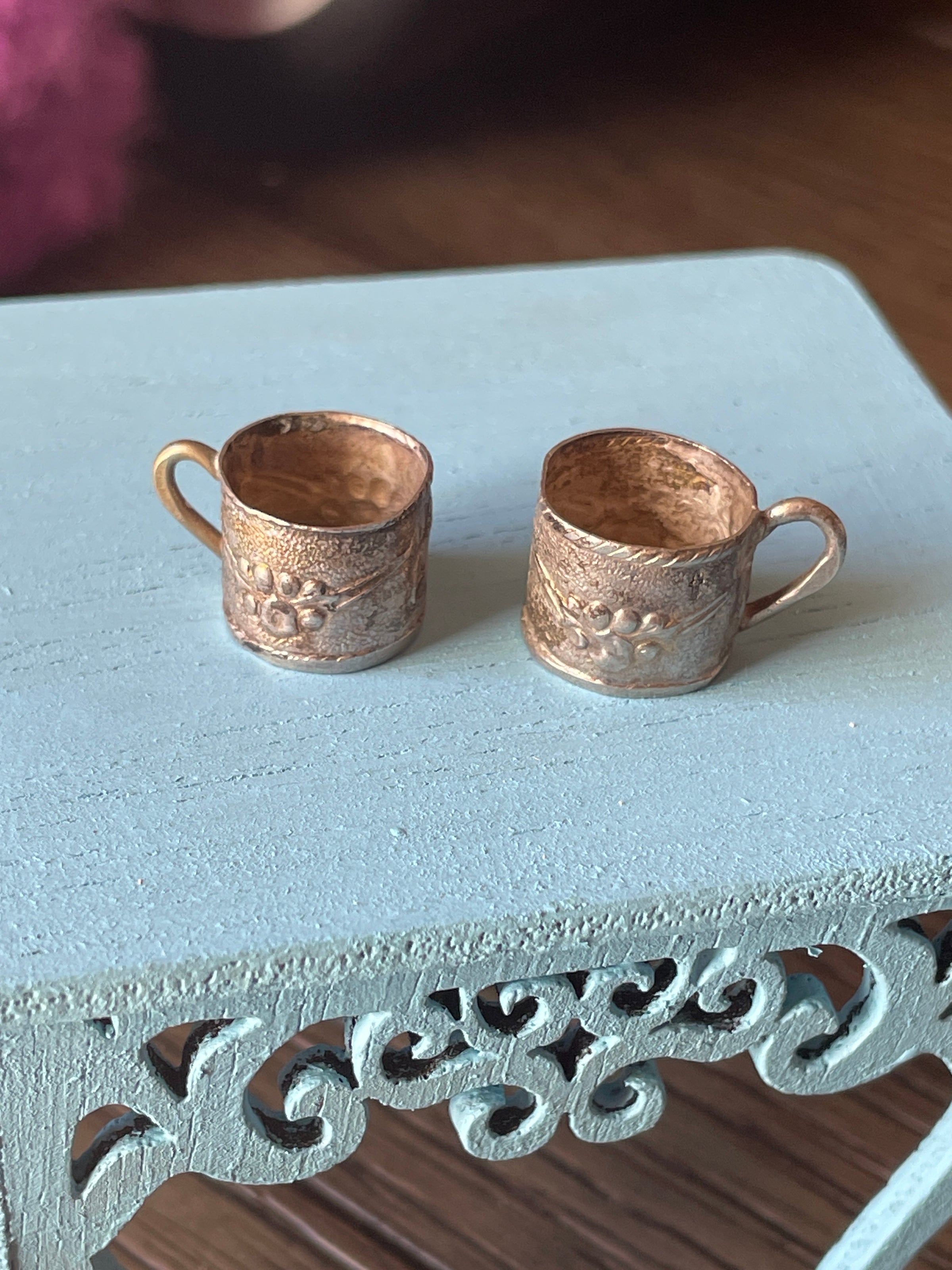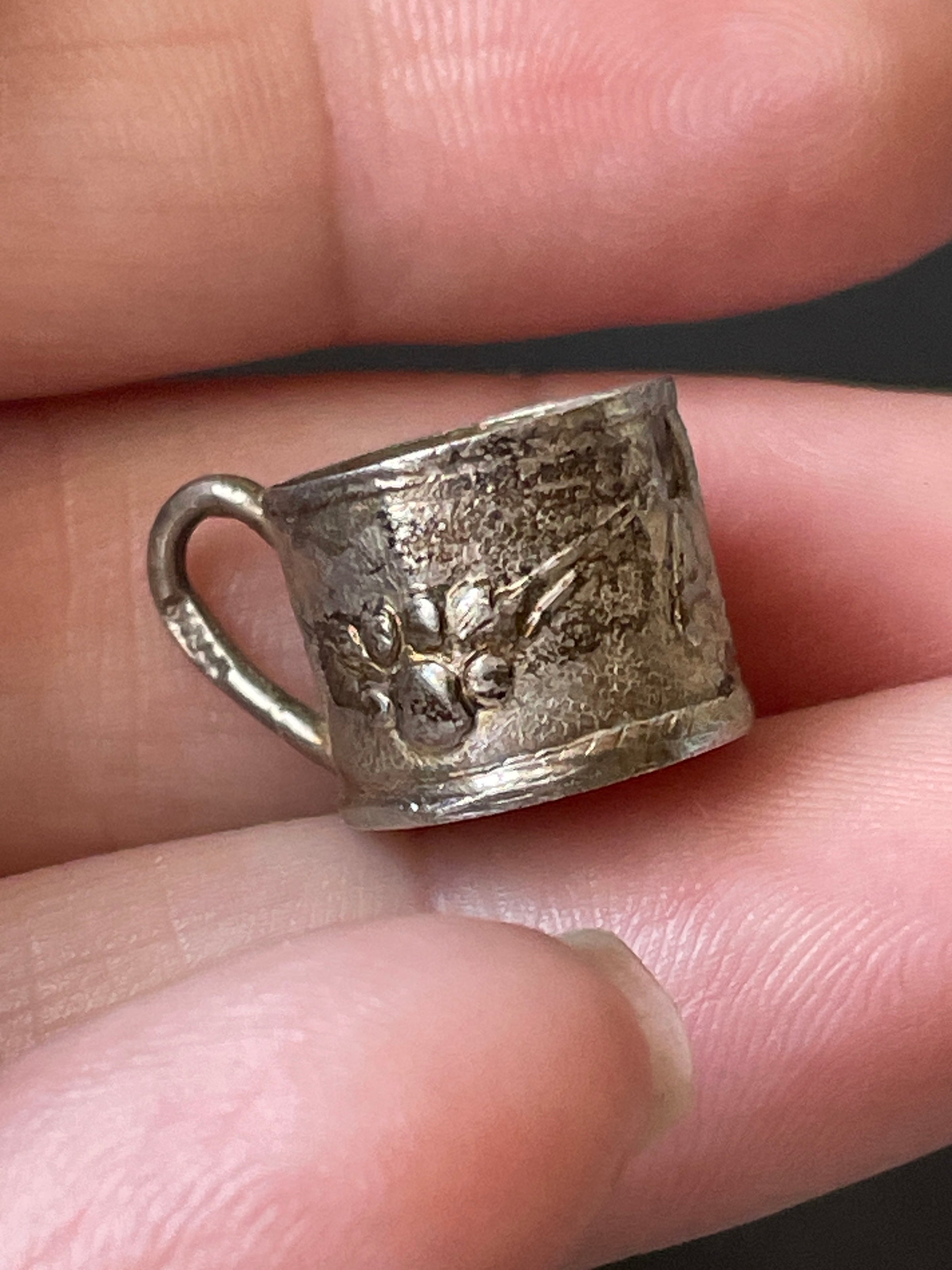Adorable super tiny teacups (sold individually) which can be used for a dollhouse or worn on a chain. These measure approx 0.5 inches. They have unusual markings underneath. Bought from a silver dealer who indicated these test sterling. There is a mark on the handles but it is too hard to make out.