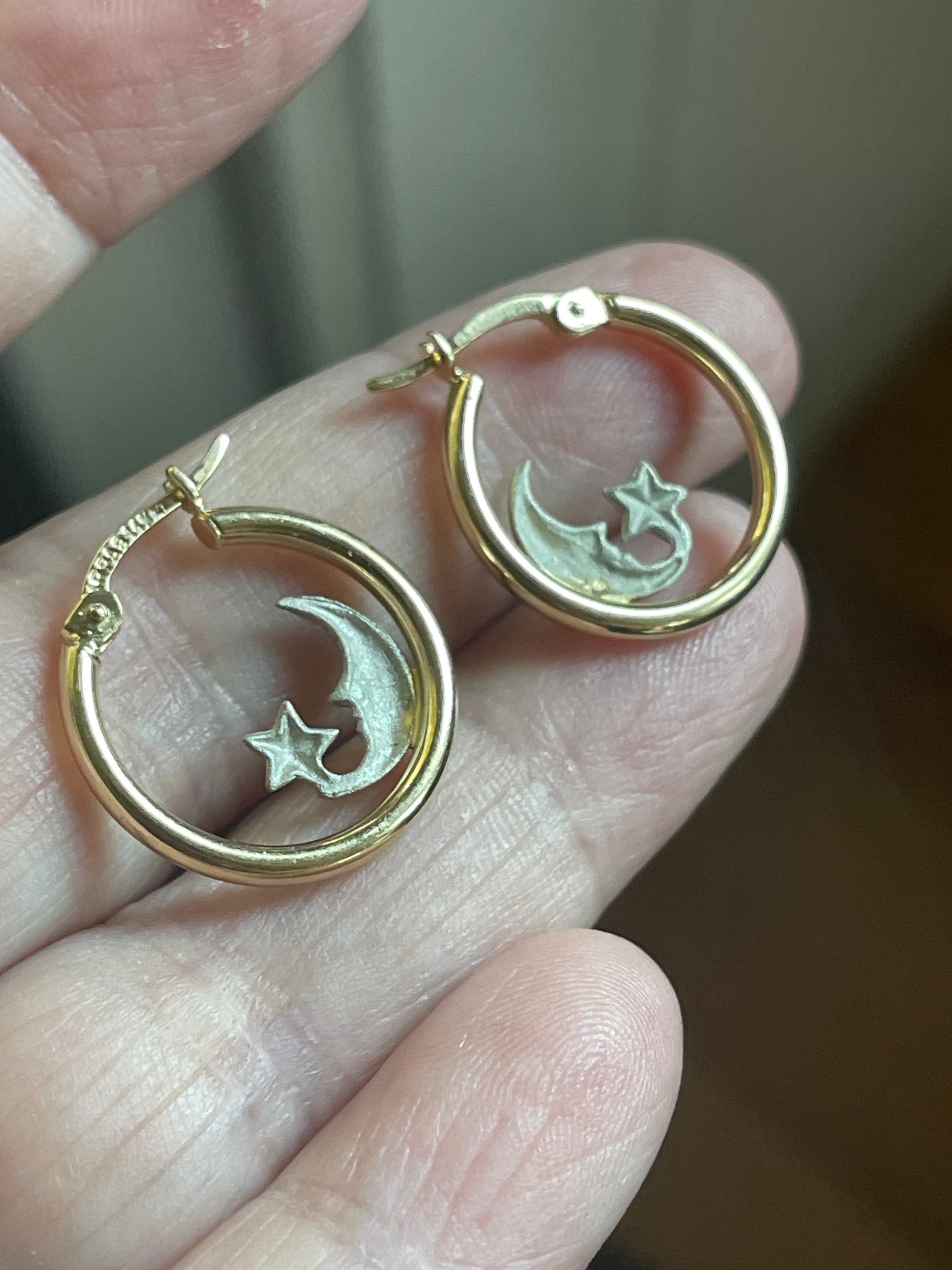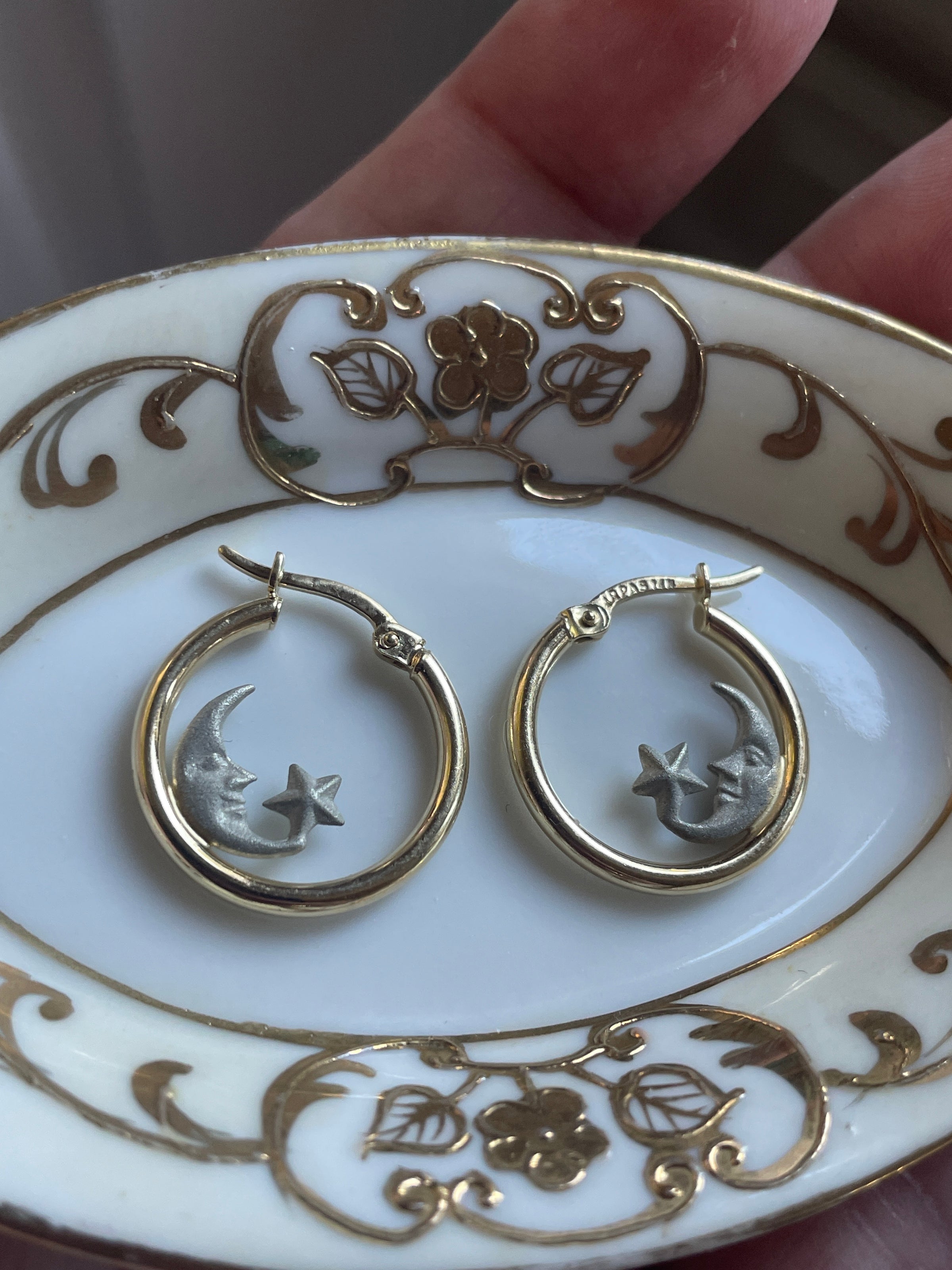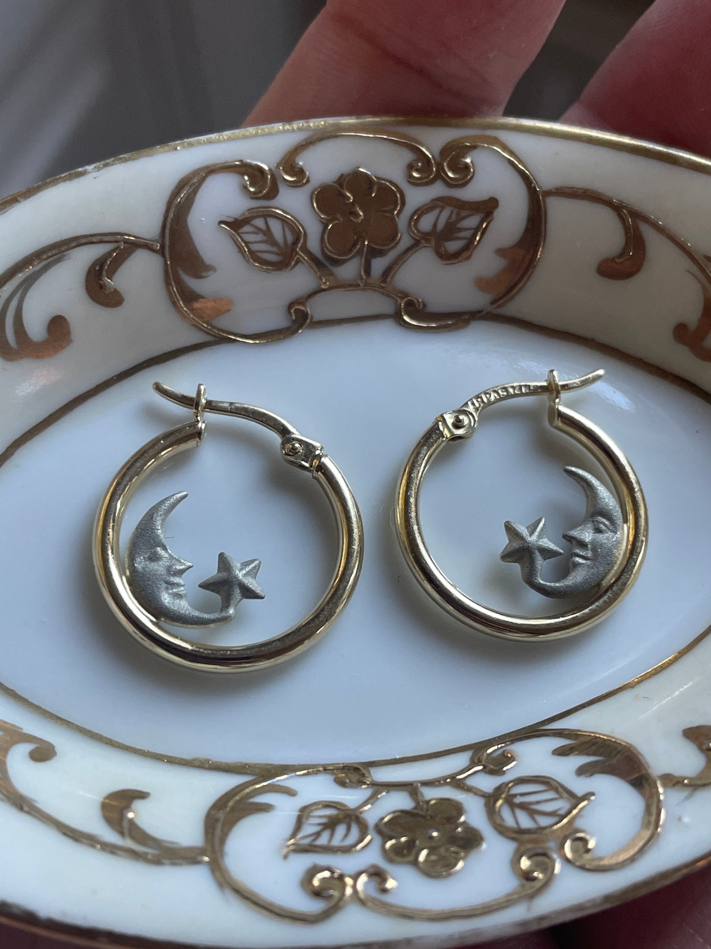 Fabulous vintage Moon Star hoops in 14k gold. These measure approx 0.75 inches. Design is on one side. The Moon and Star are in a matte colored metal. Stamped 14k on earwires.