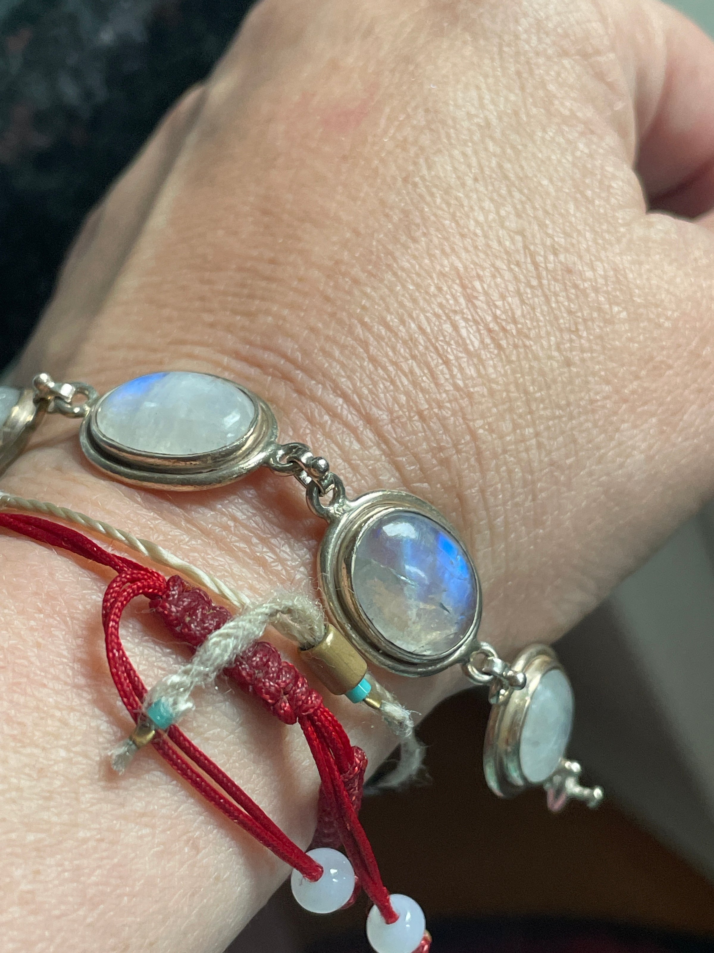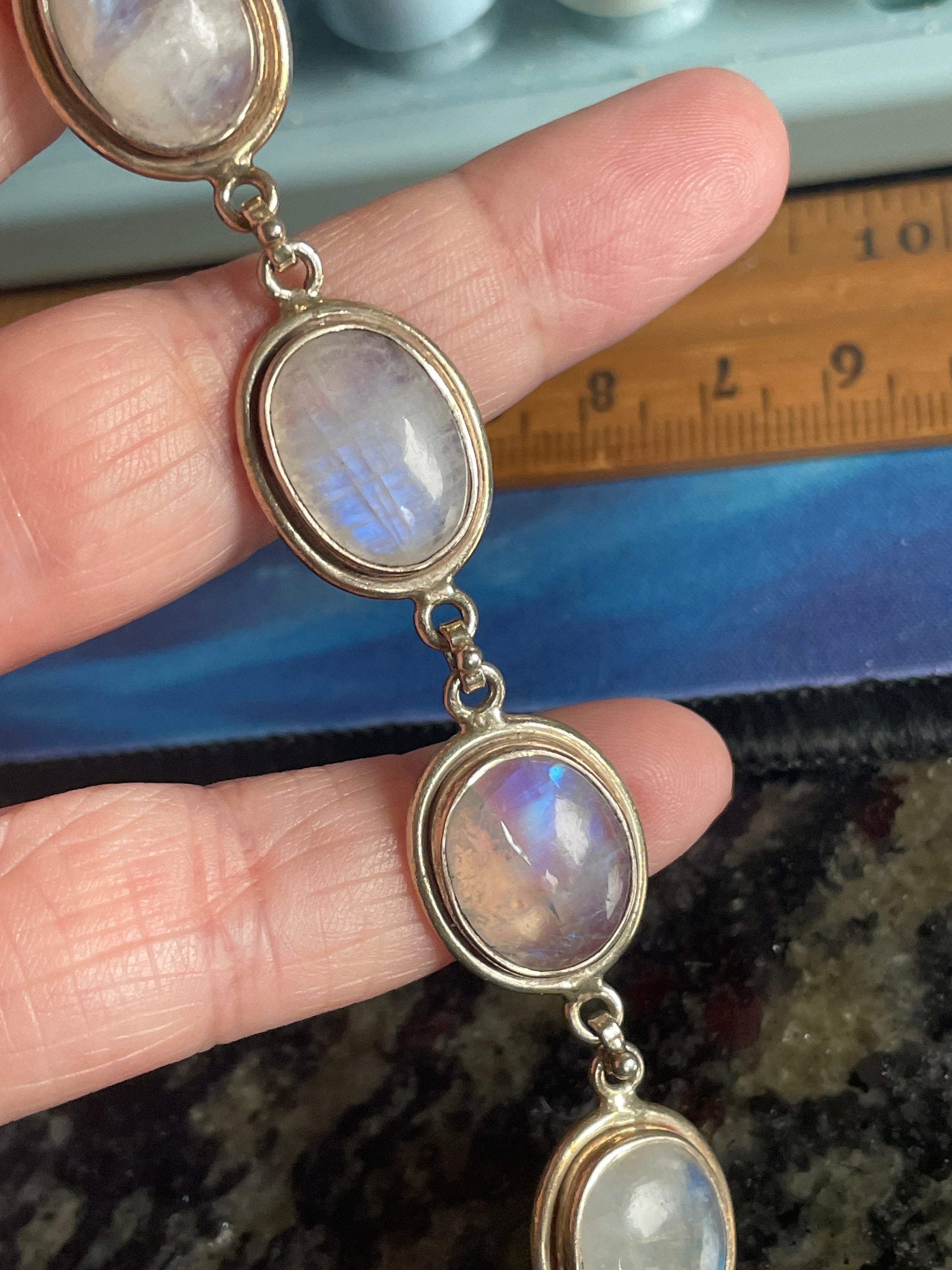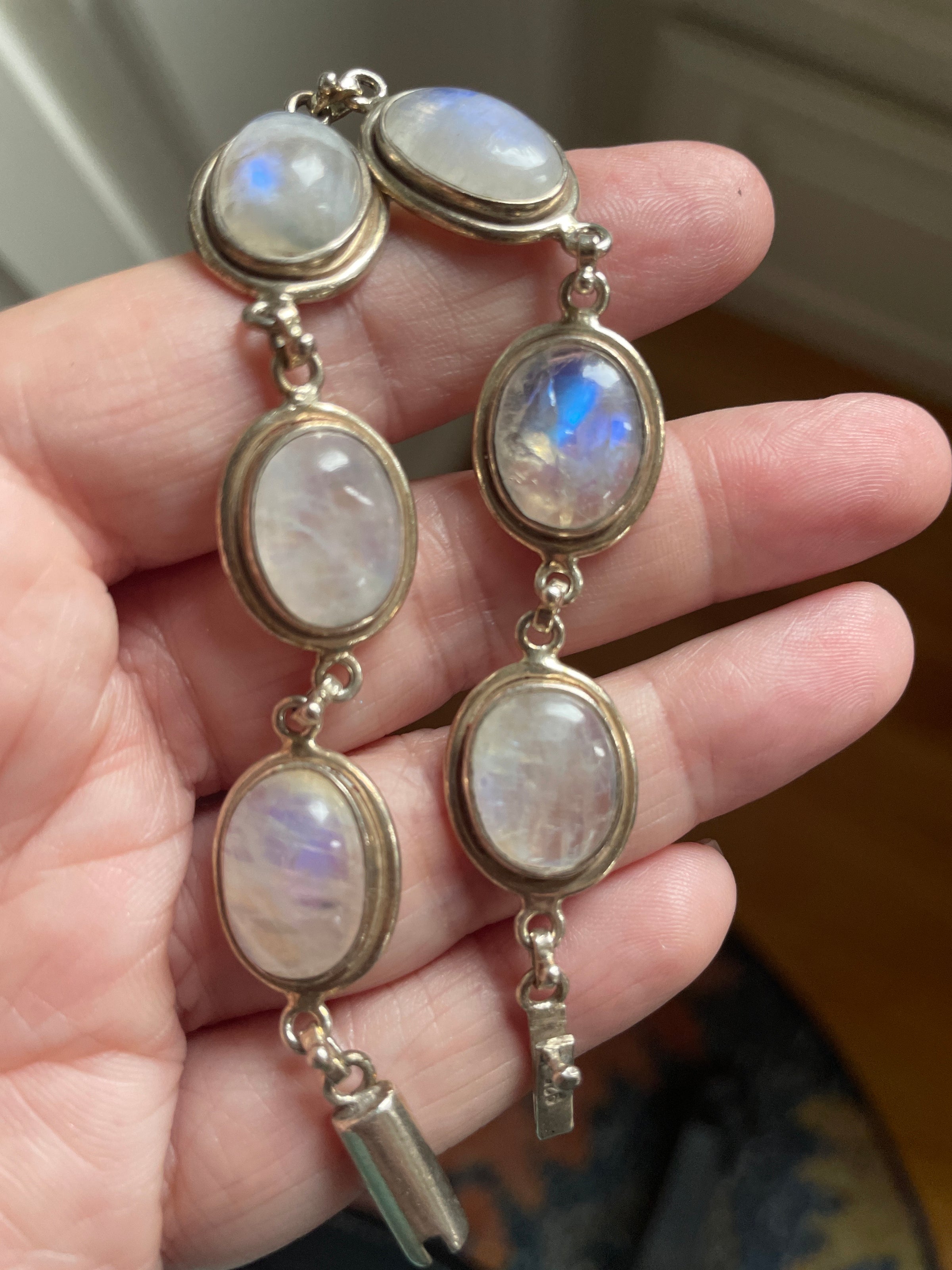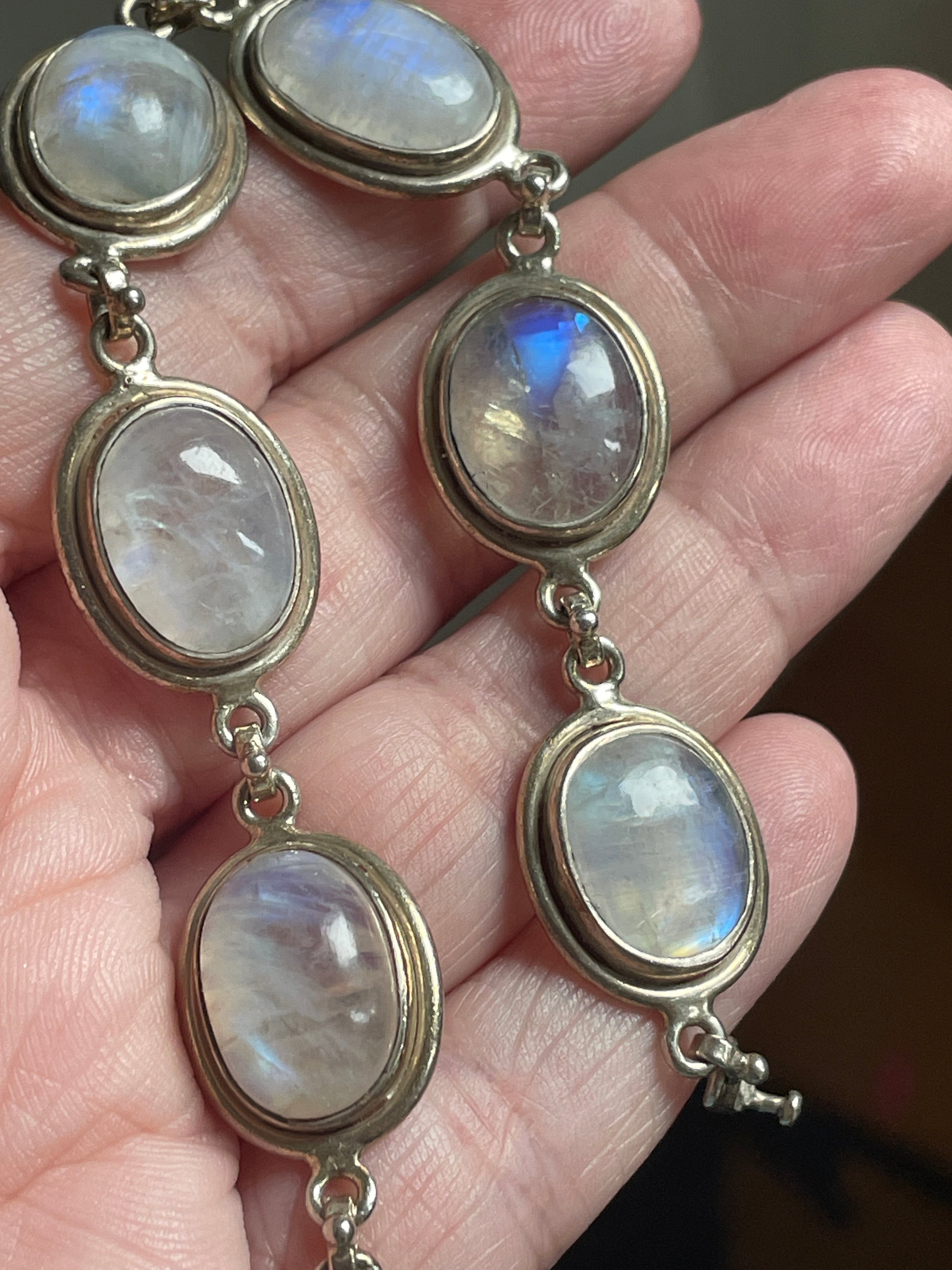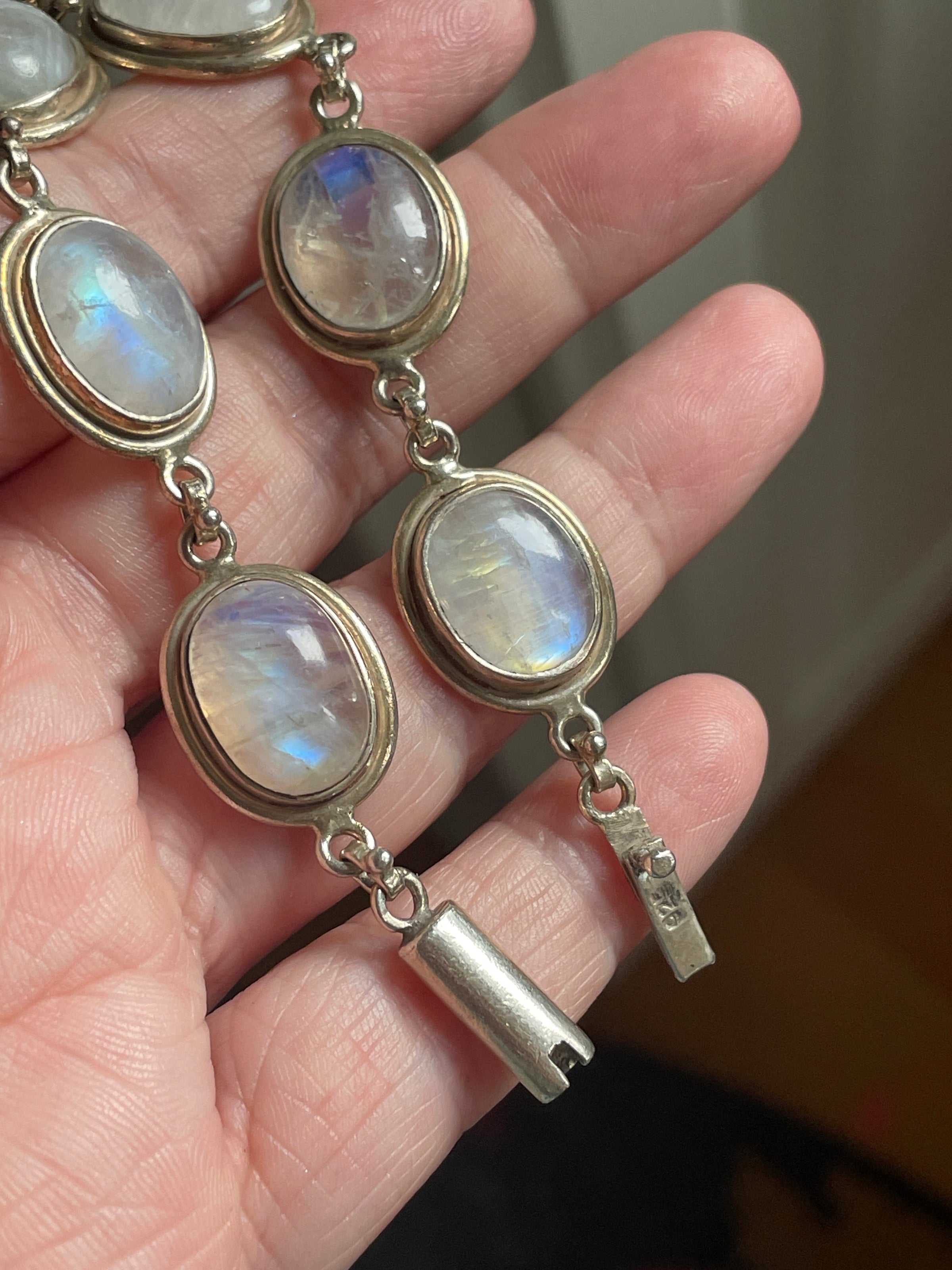 Beautiful large Moonstone bracelet in sterling silver. Moonstones have beautiful blue fire and natural inclusions. Measures approx 7 inches with secure clasp. Each Moonstone measures 14mm x 10mm. Stamped 925 on clasp.