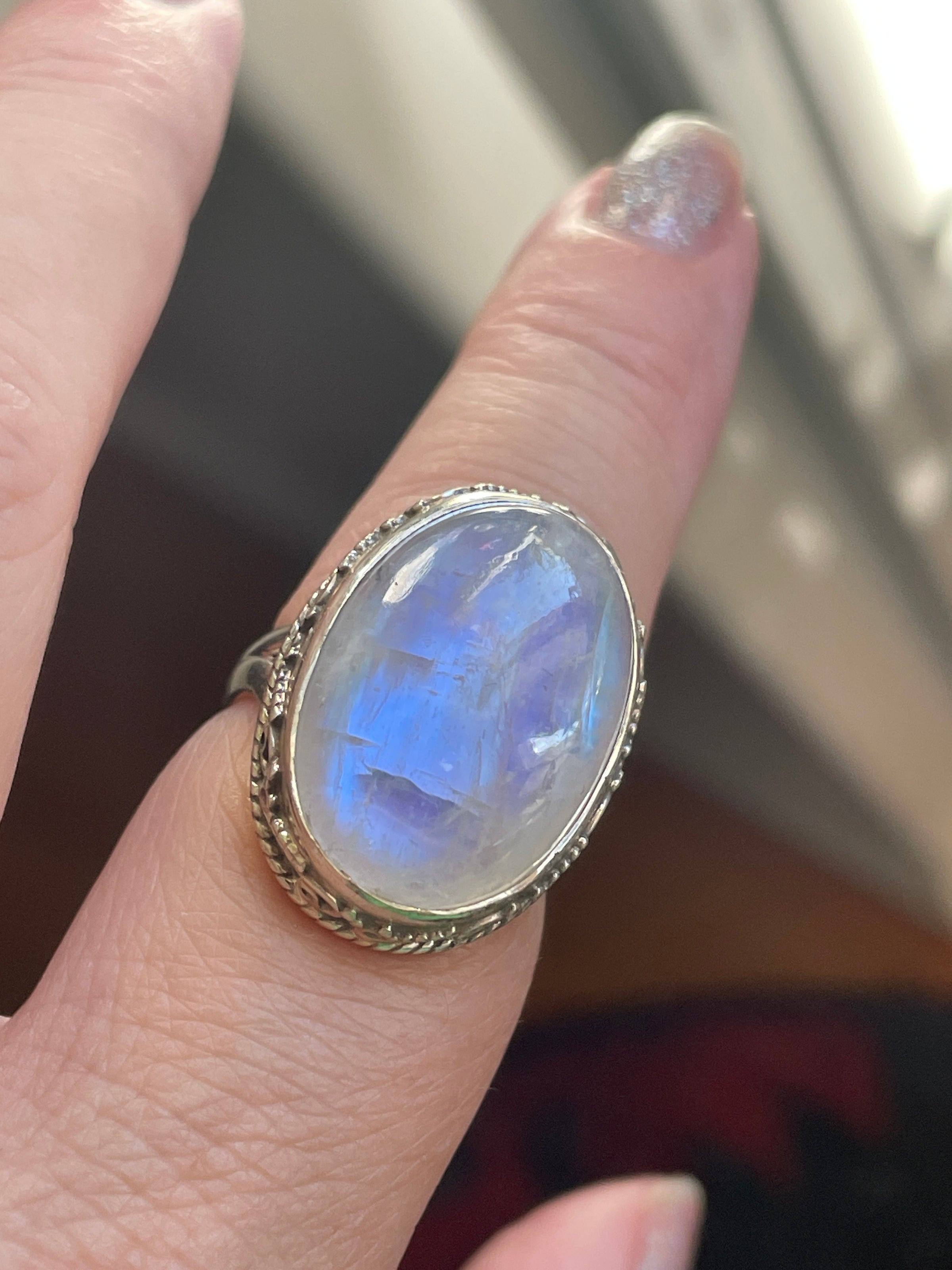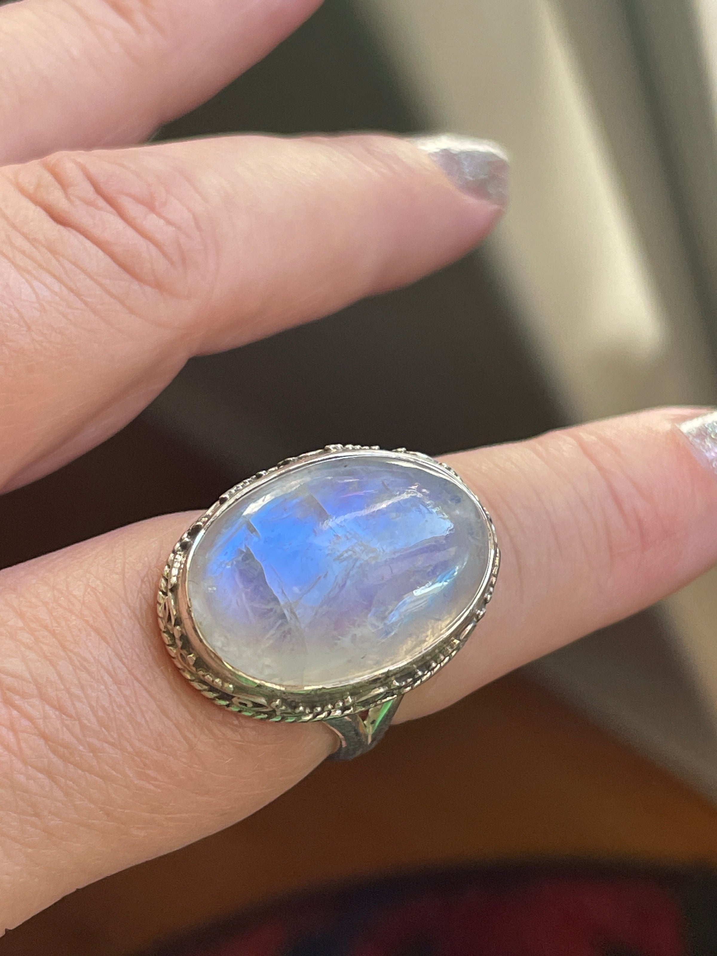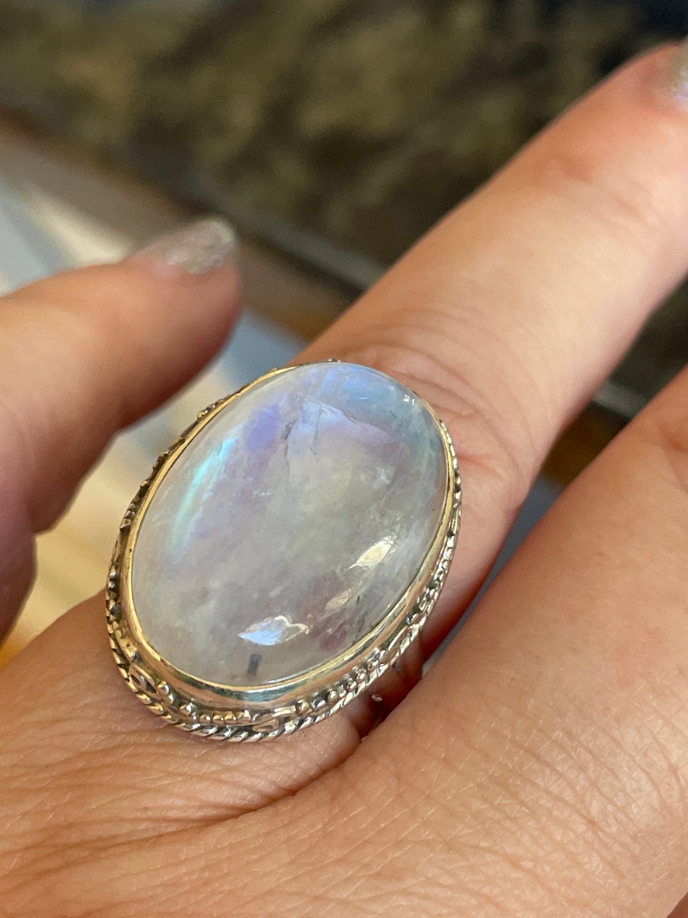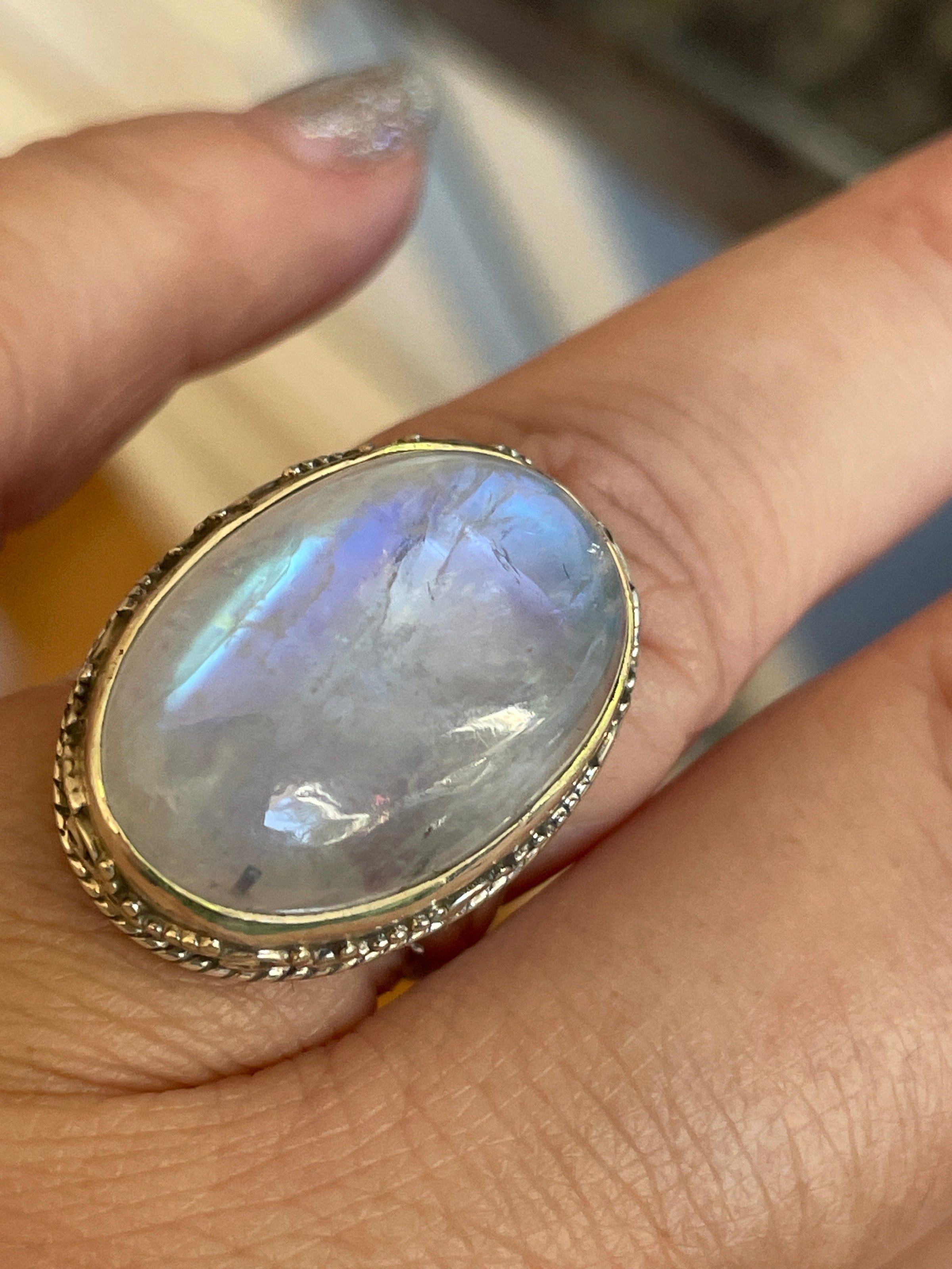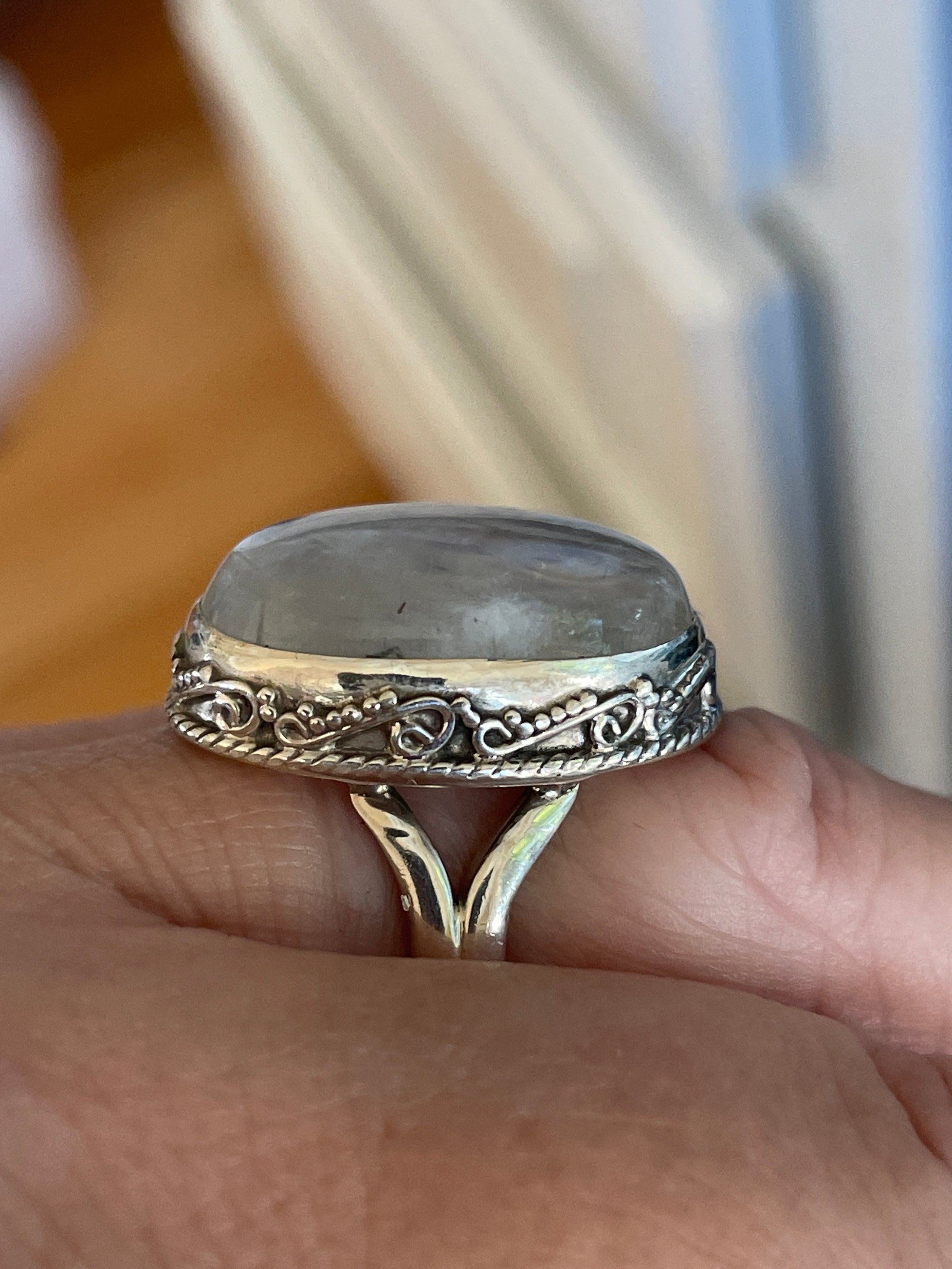 Fabulous large Moonstone ring with shimmering stone. Stone measures 20mm x 14mm. Ring size = 7. Stamped 925 for Sterling.