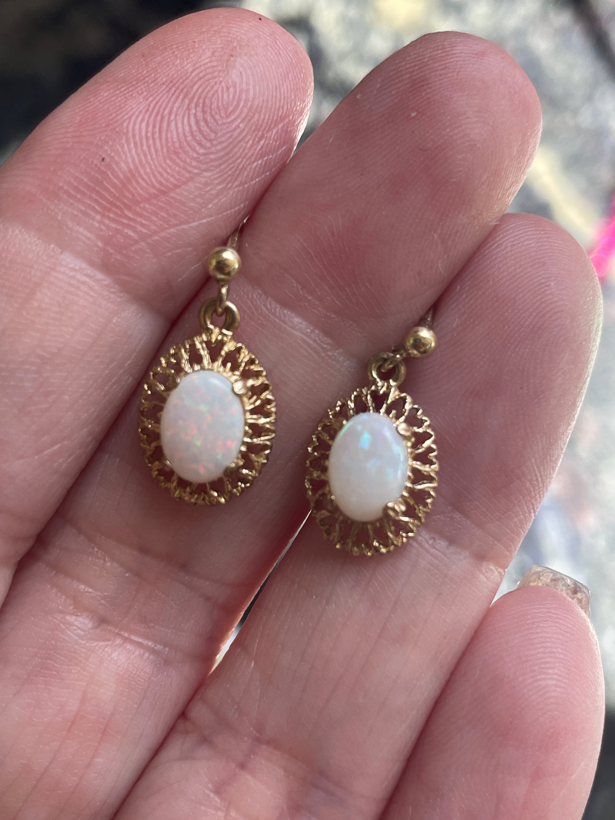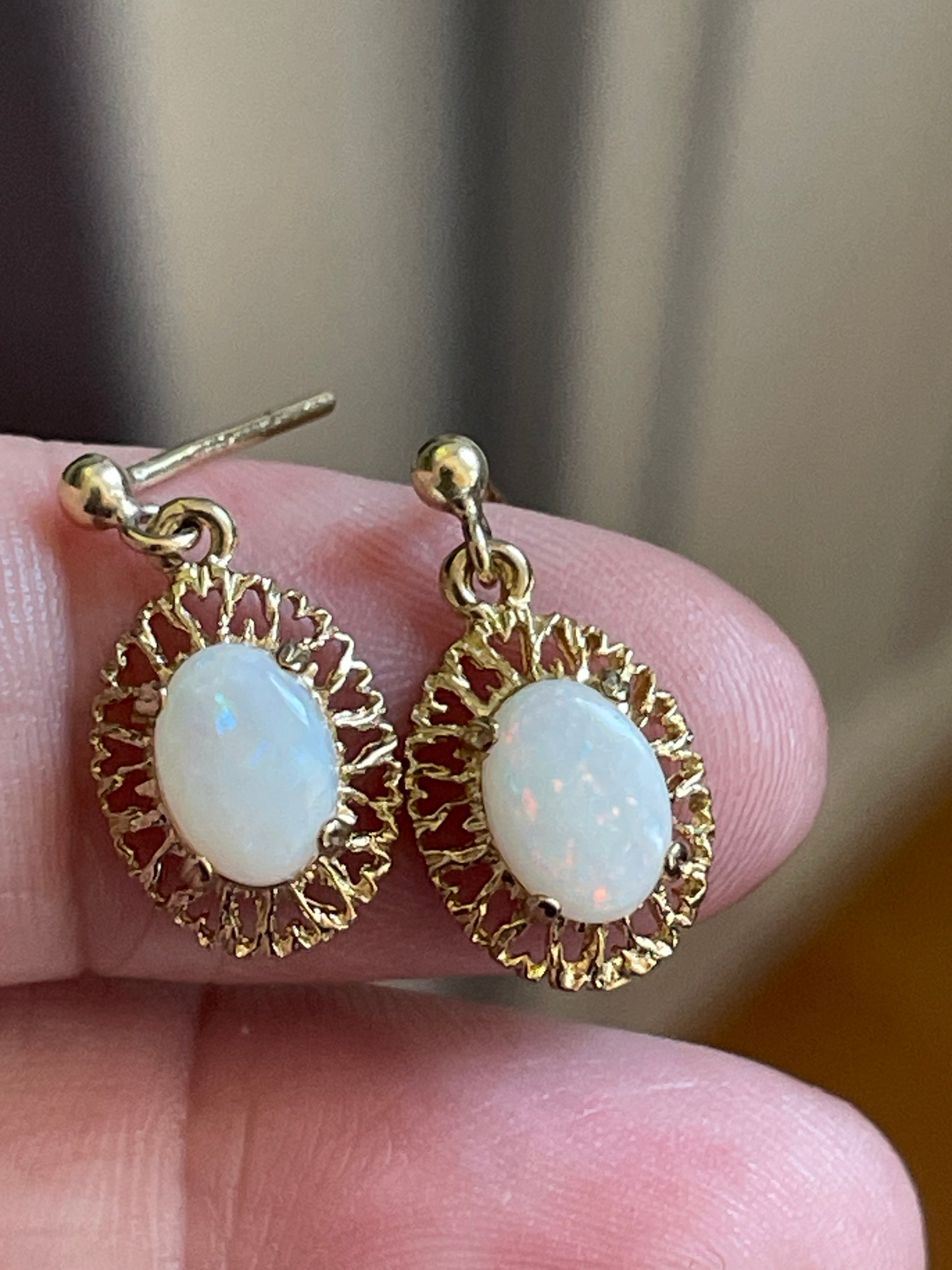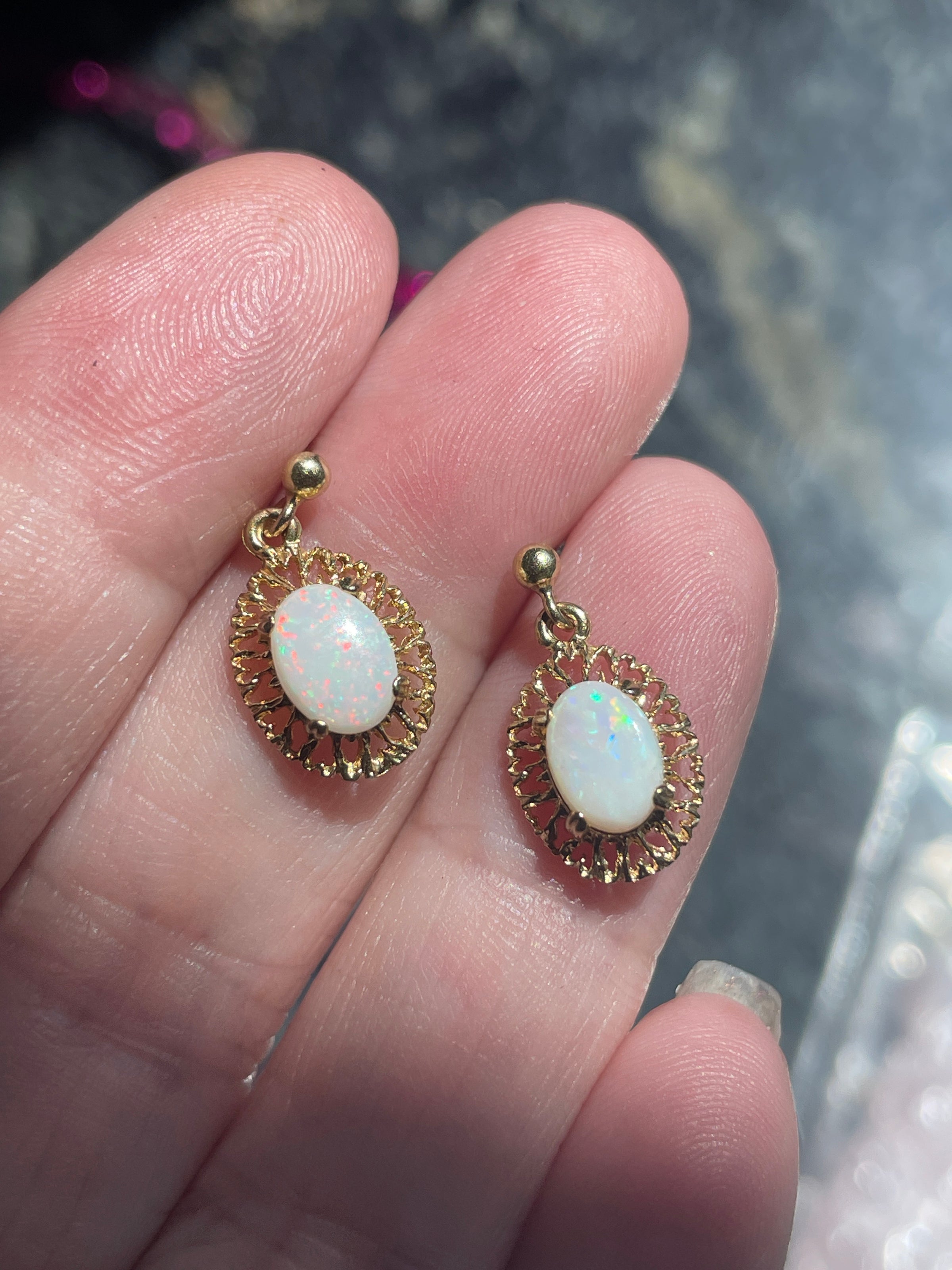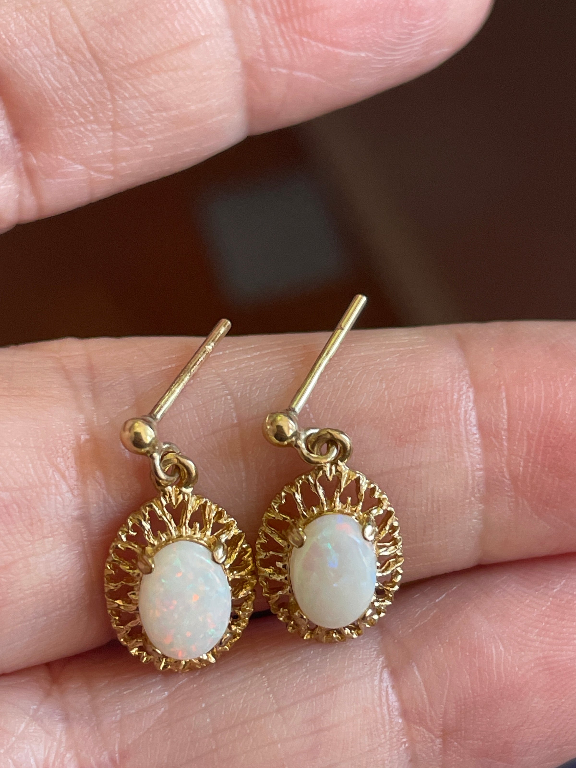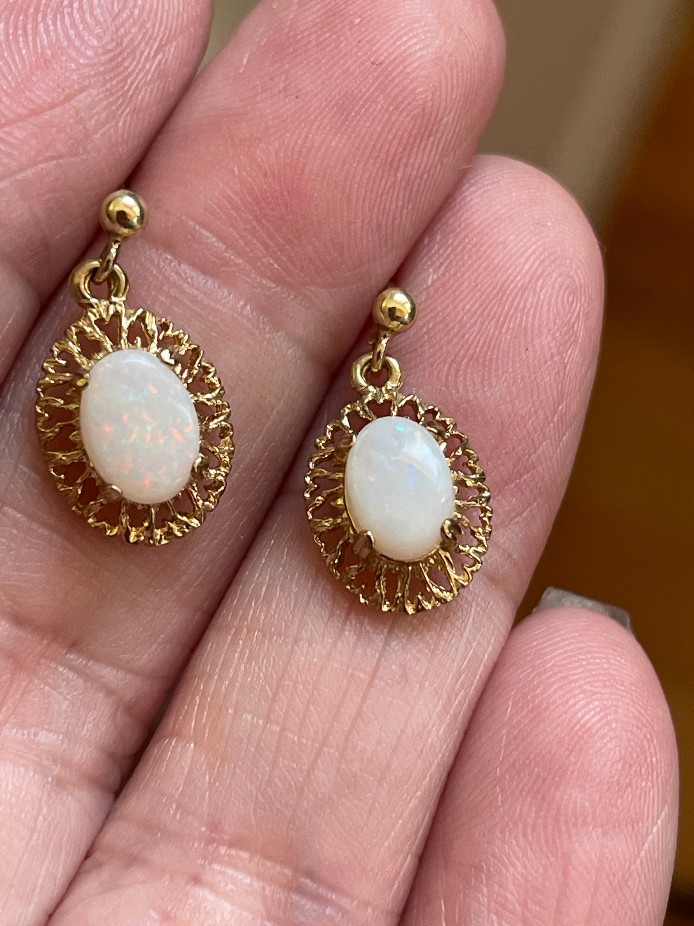 Stunning Opal drop earrings in 9k gold. Opals have lovely subtle fire. Opals measure 7mm x 5mm with whole earring measuring just over 0.5 inches with posts. Hallmarked on posts including 375 for 9k. Backs also stamped “9c”