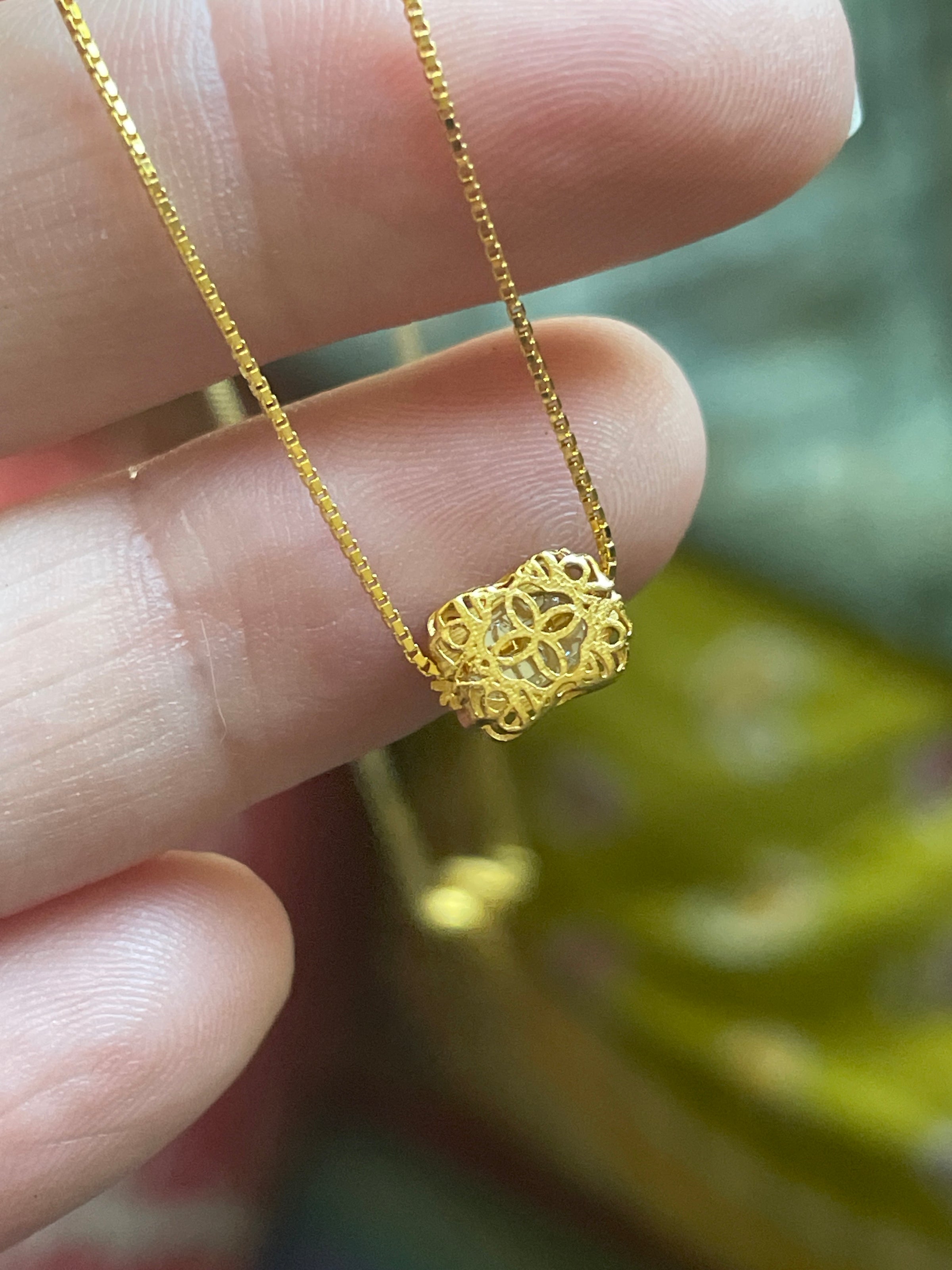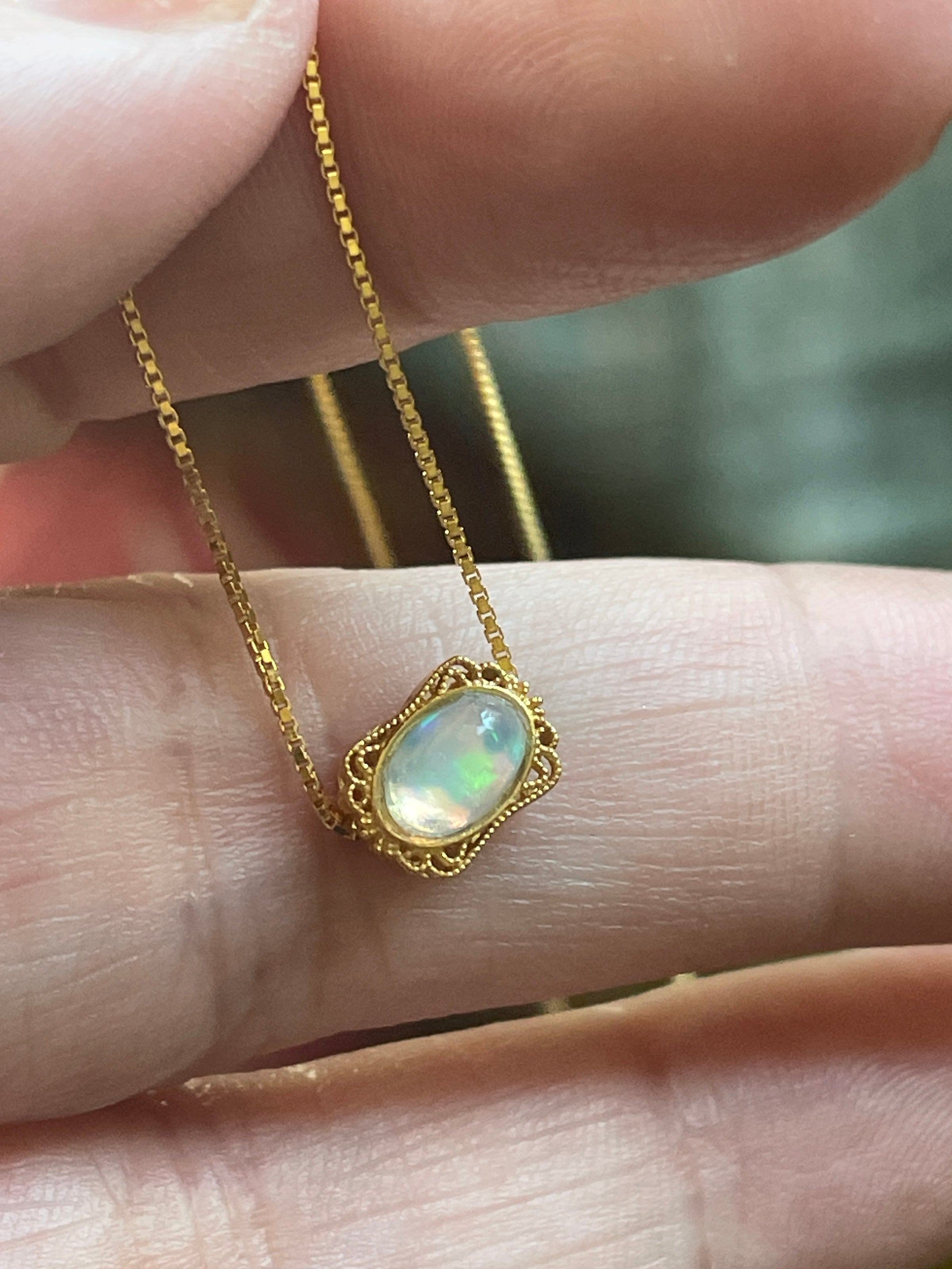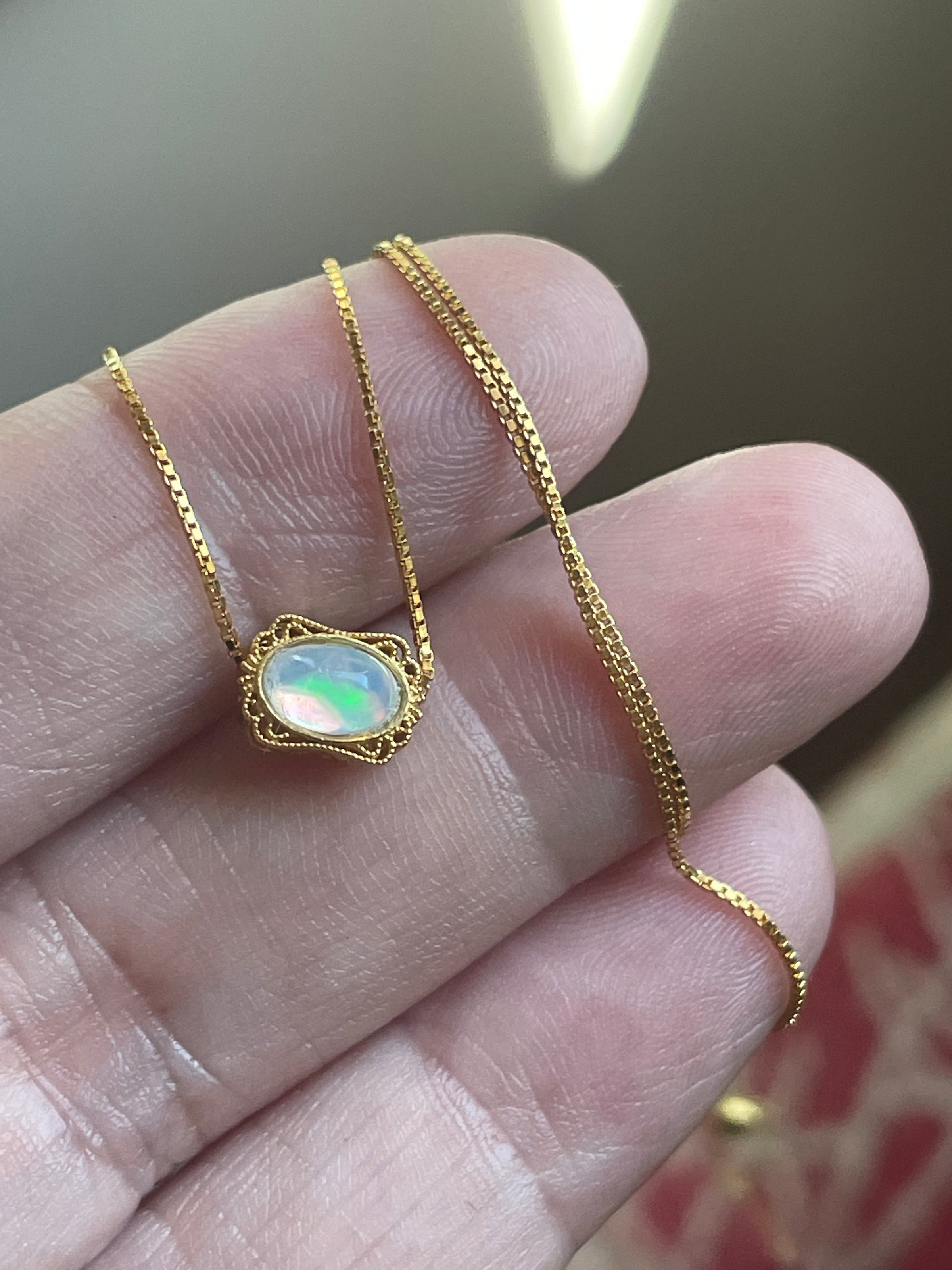 Gorgeous dainty Opal filigree necklace in a vibrant bright gold (14k over sterling). Pendant is a vibrant Opal in filigree setting measuring approx 6mm across. Necklace is adjustable length. Chain stamped 925 and Italy.