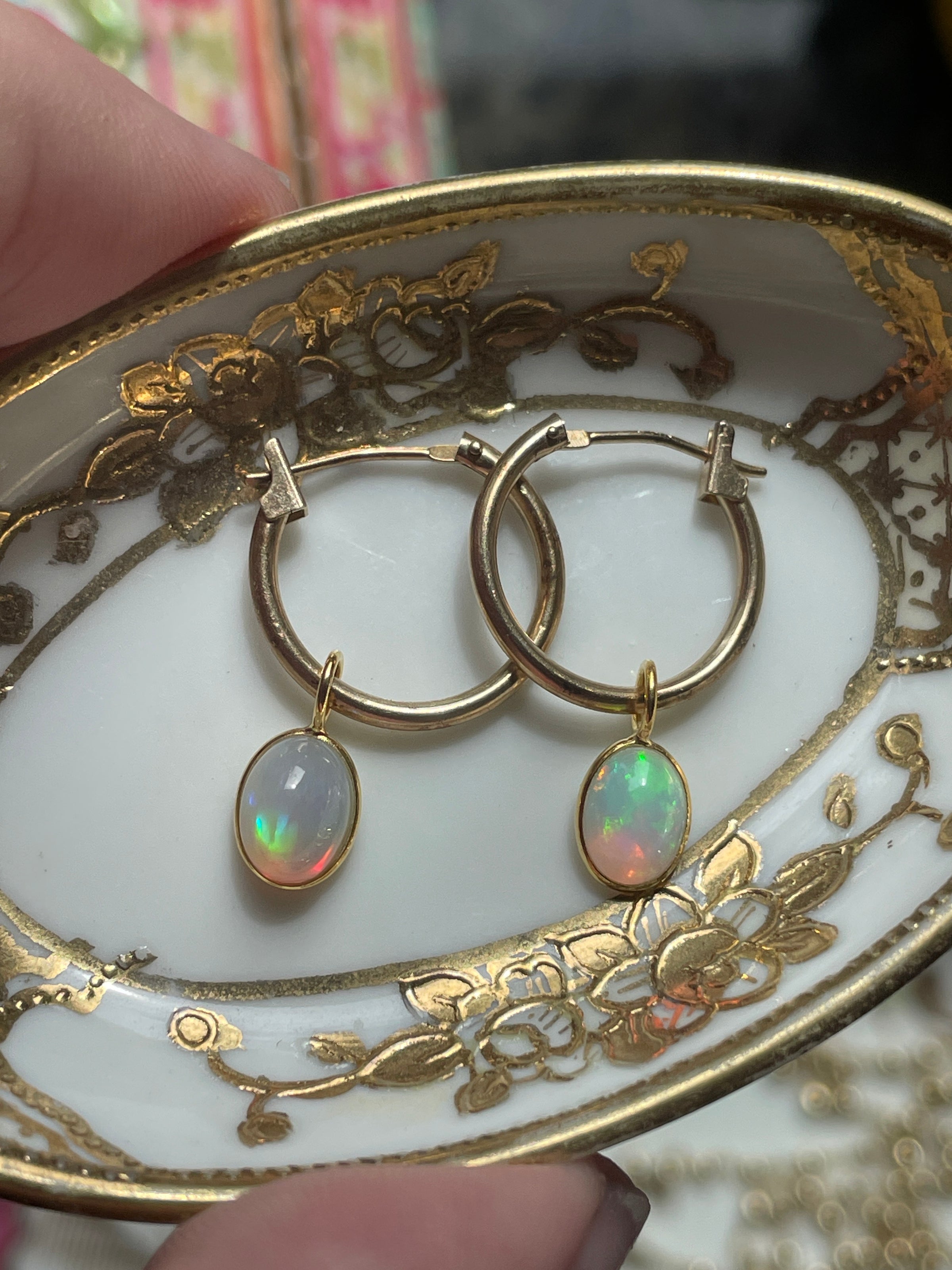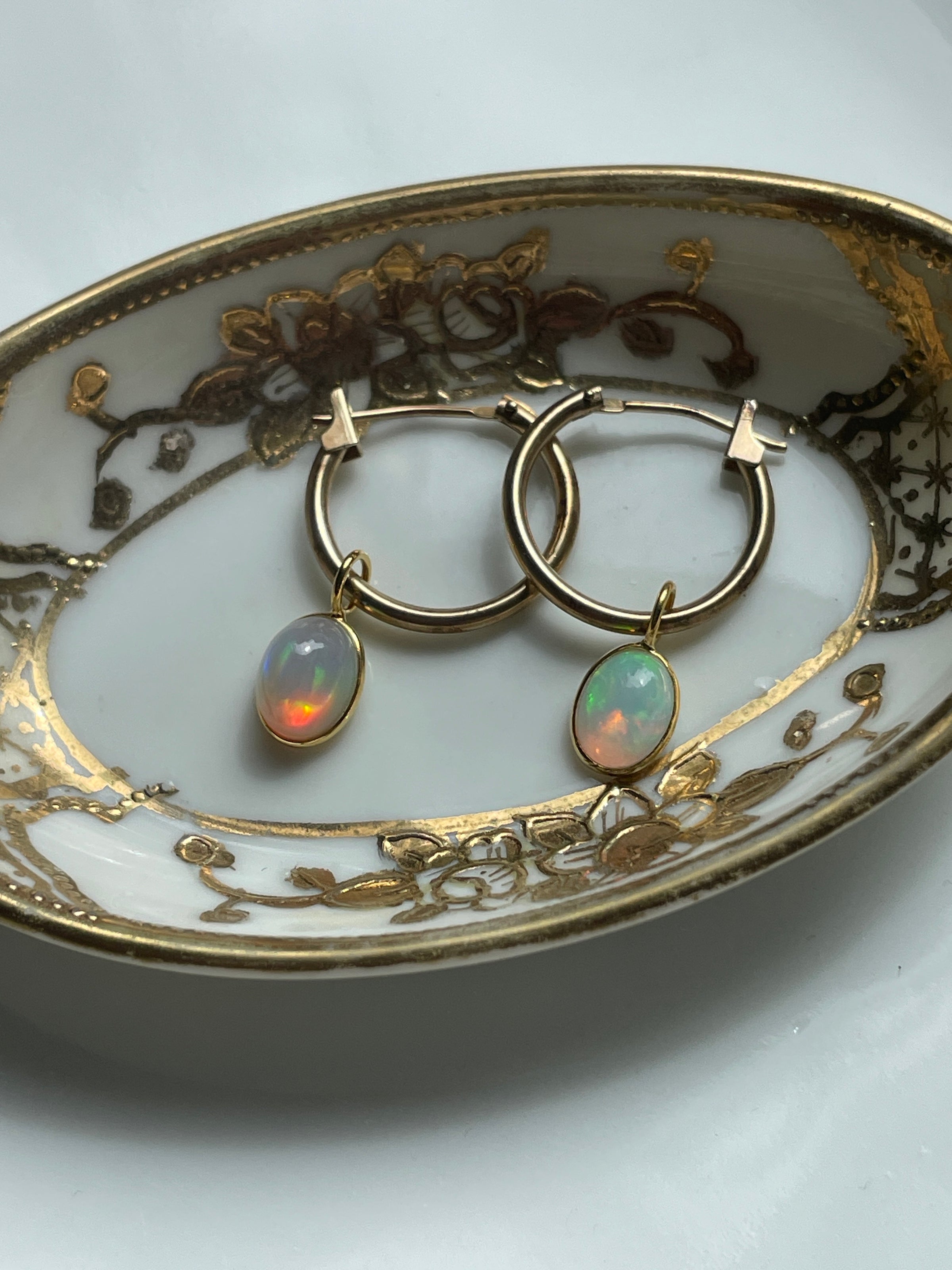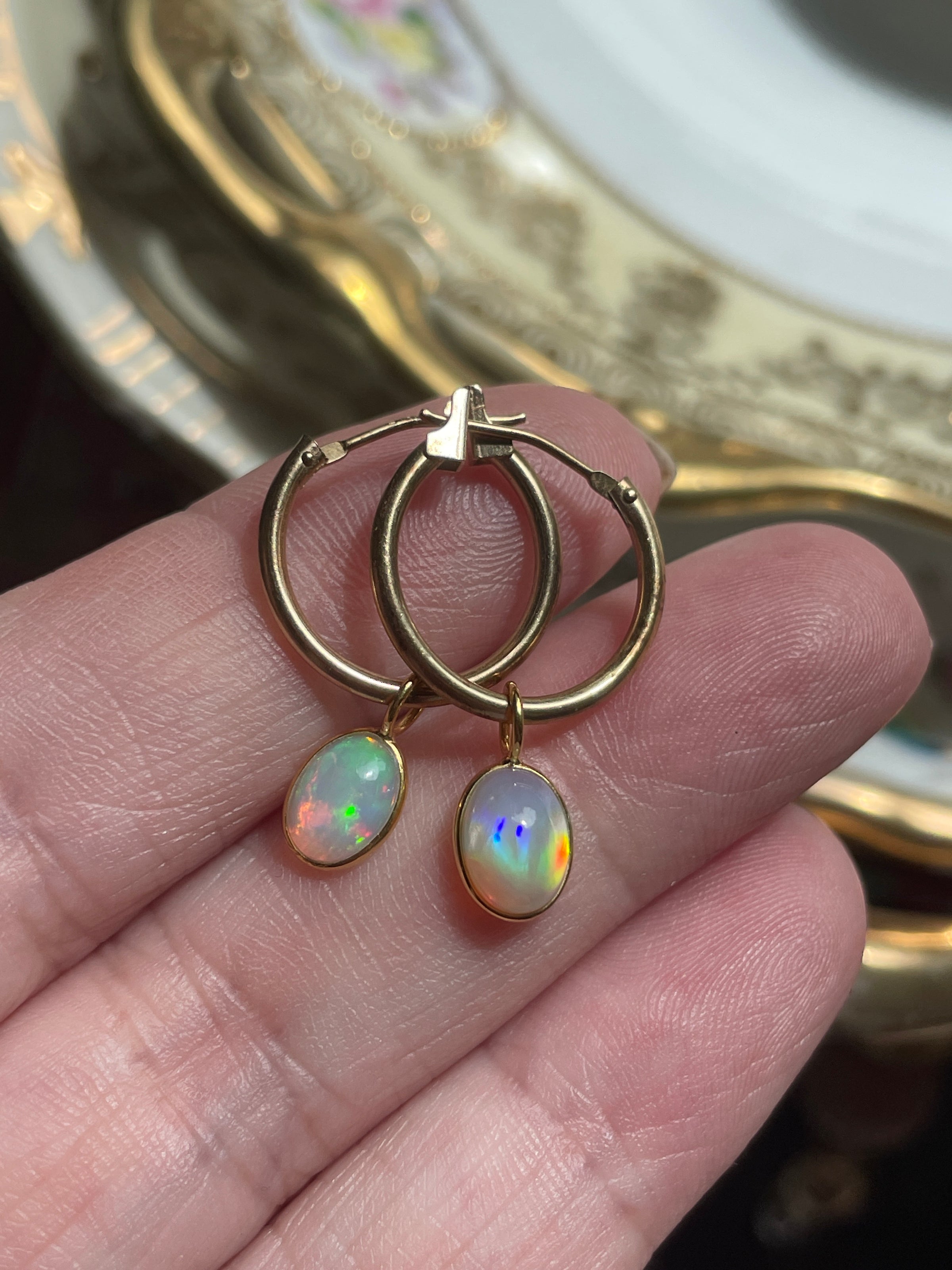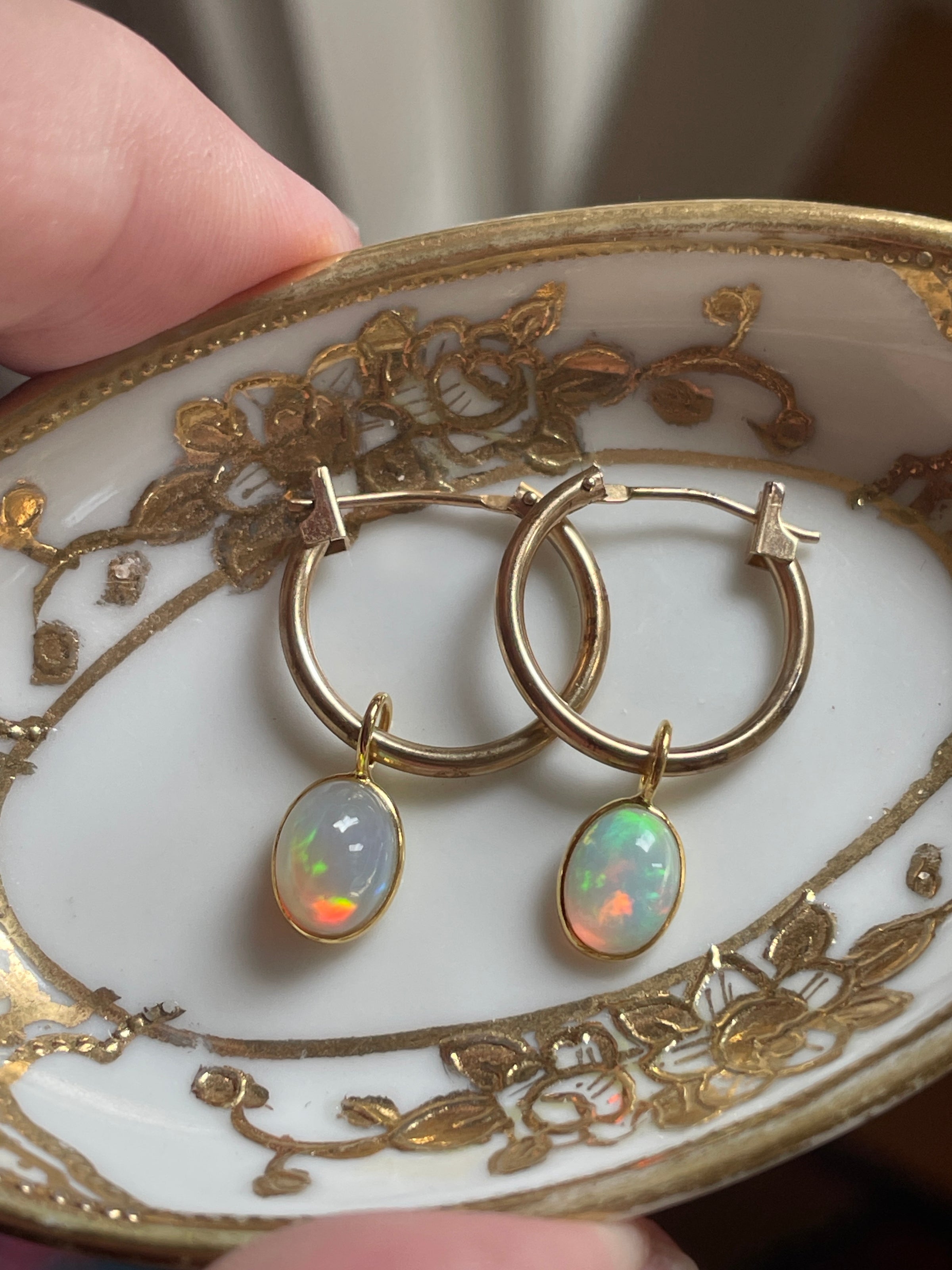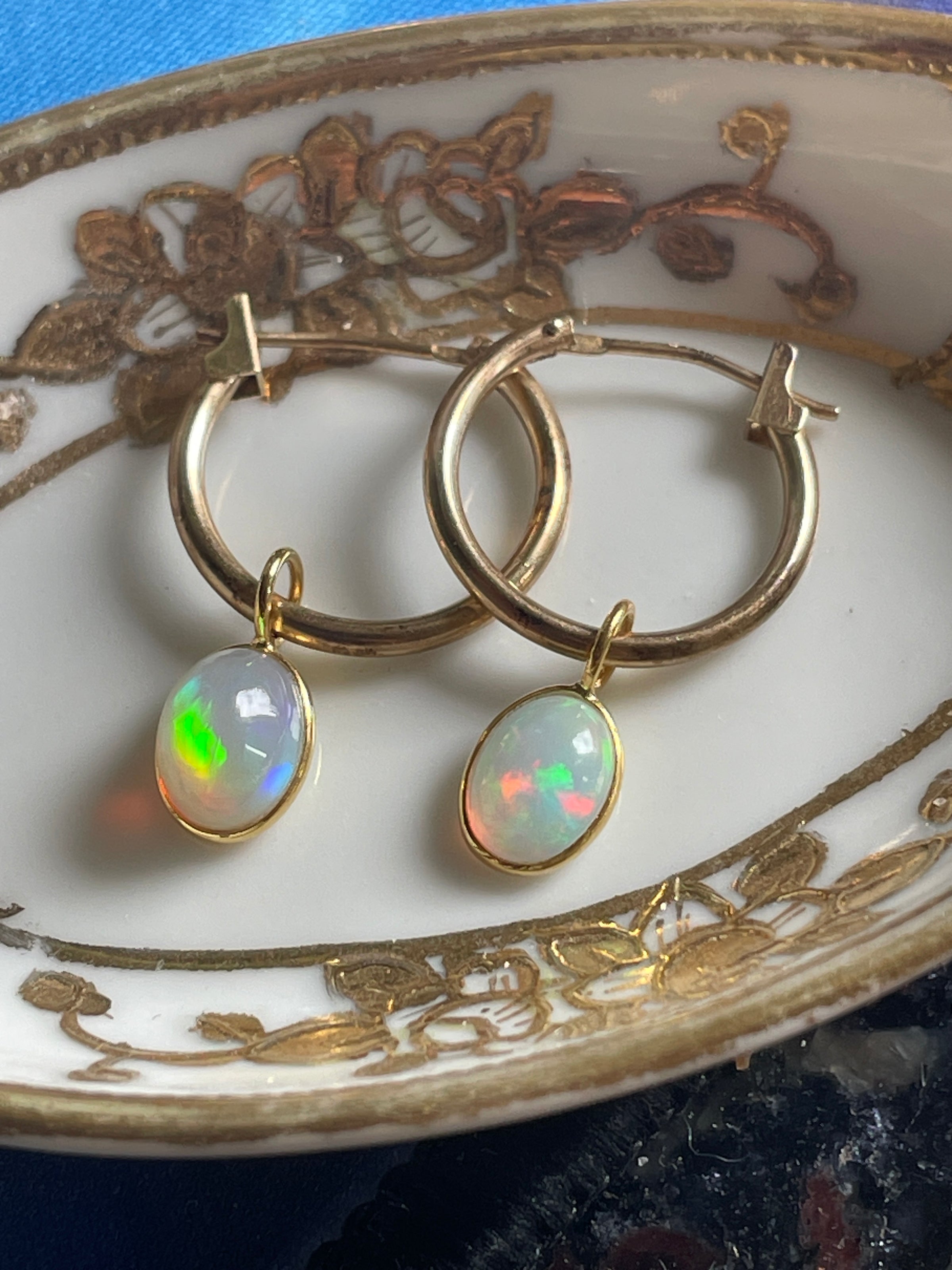 Stunning vintage 14k gold hoops have been paired with modern 18k Opal drops. Hoops are approx 13mm and 23mm with the drops. Hoops are stamped 14k. Amazing fire!!