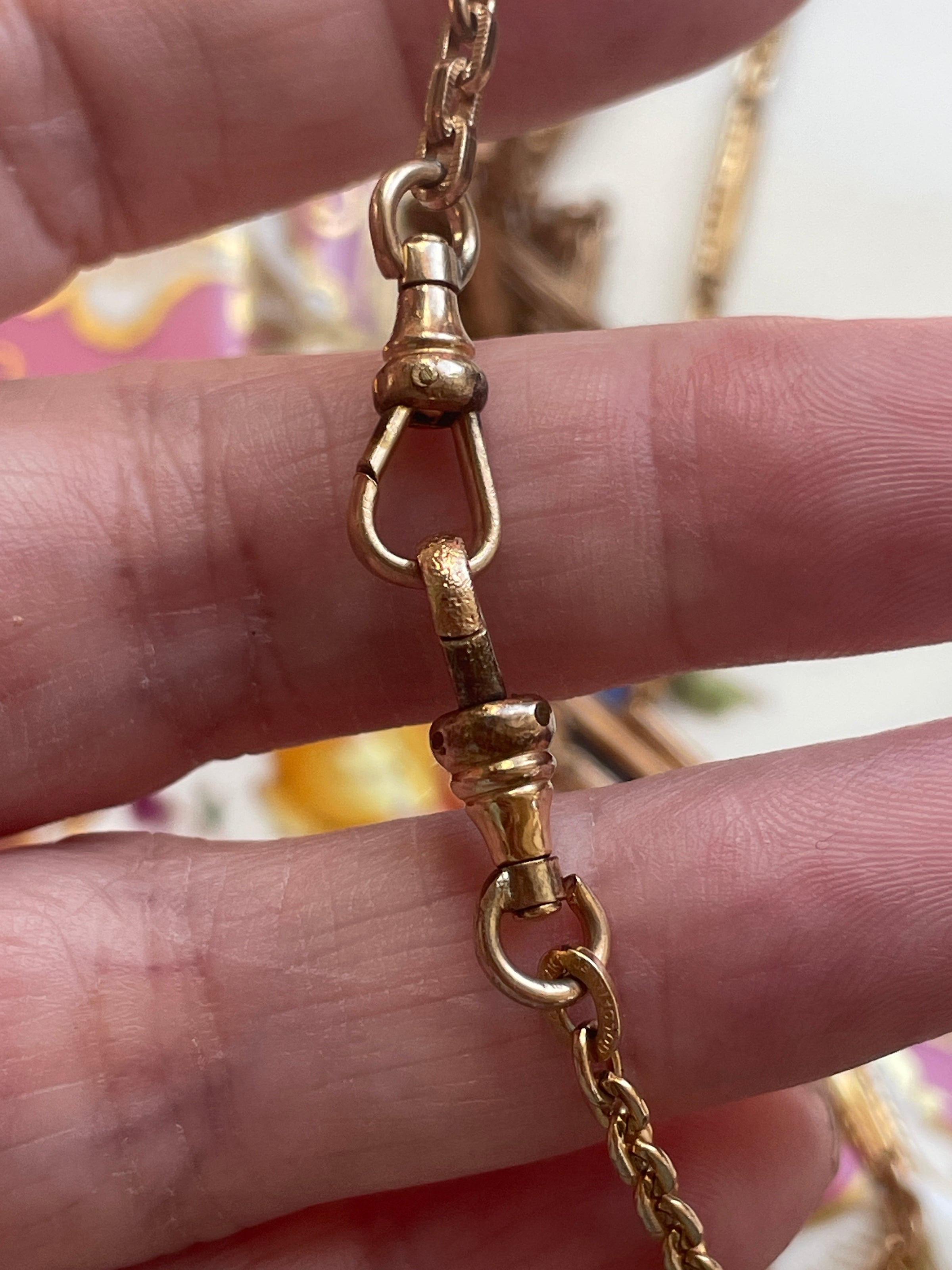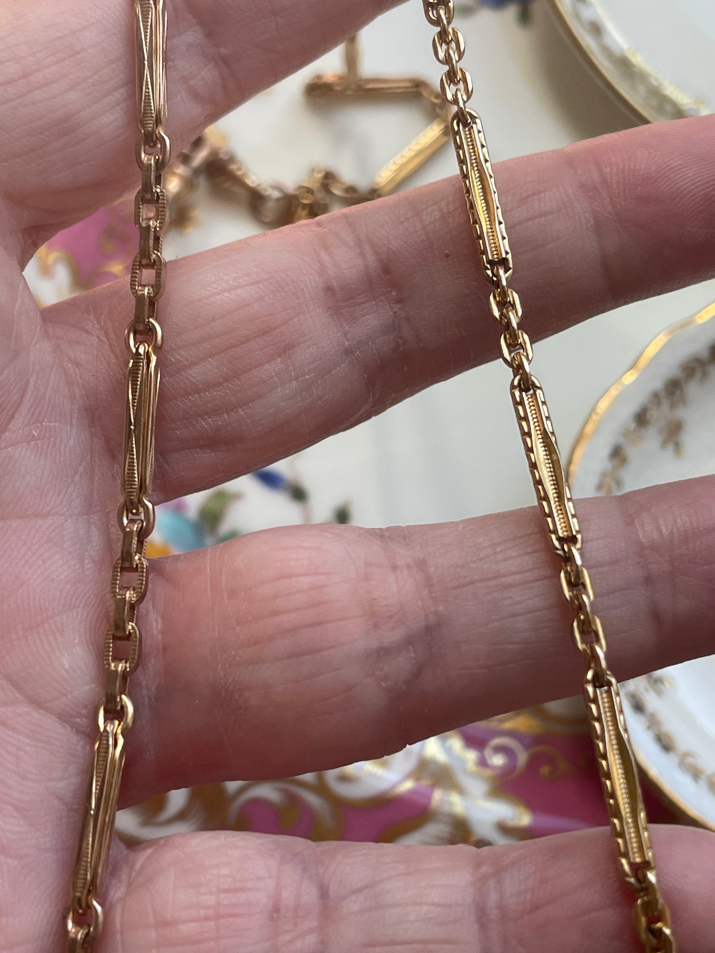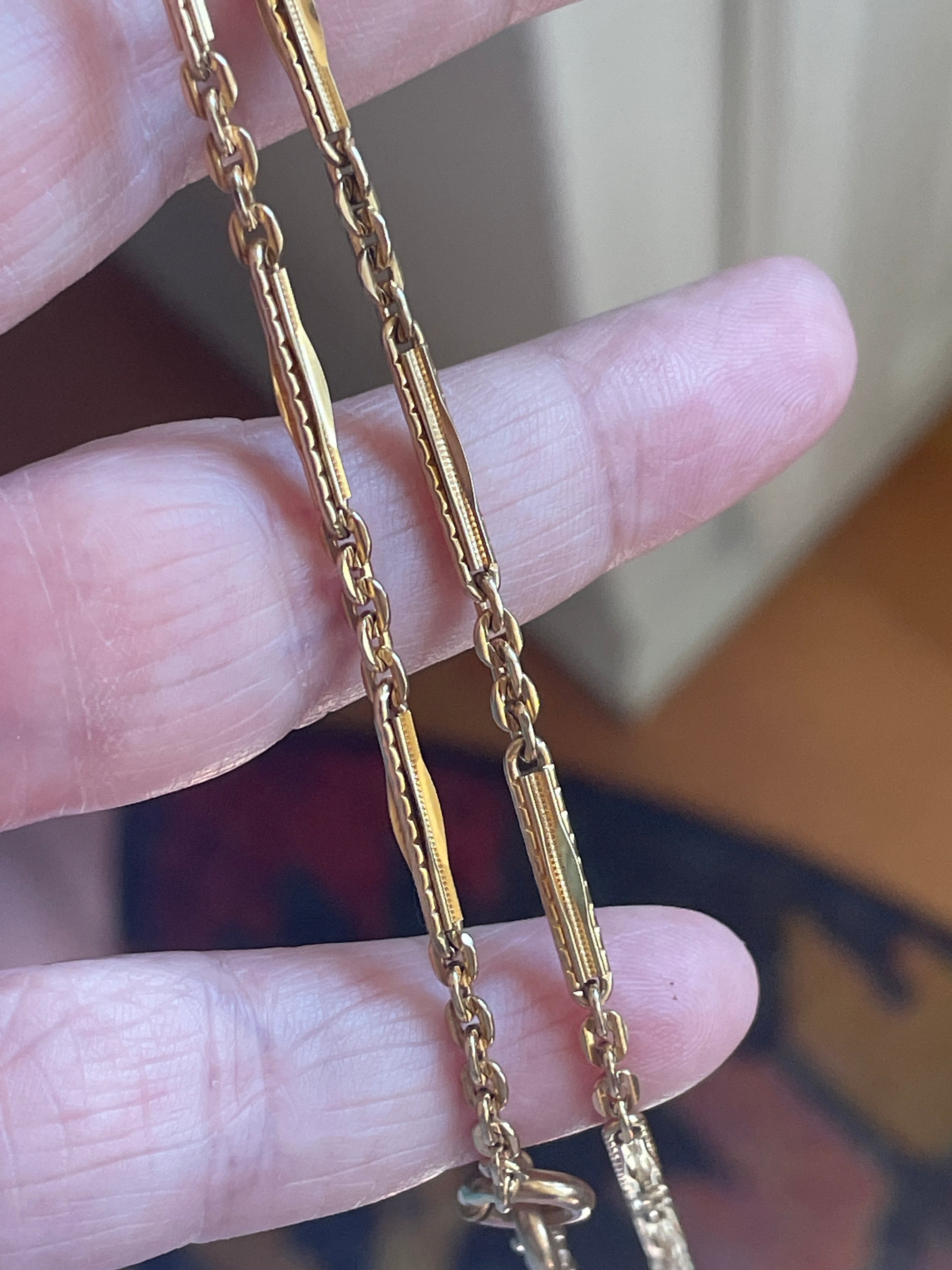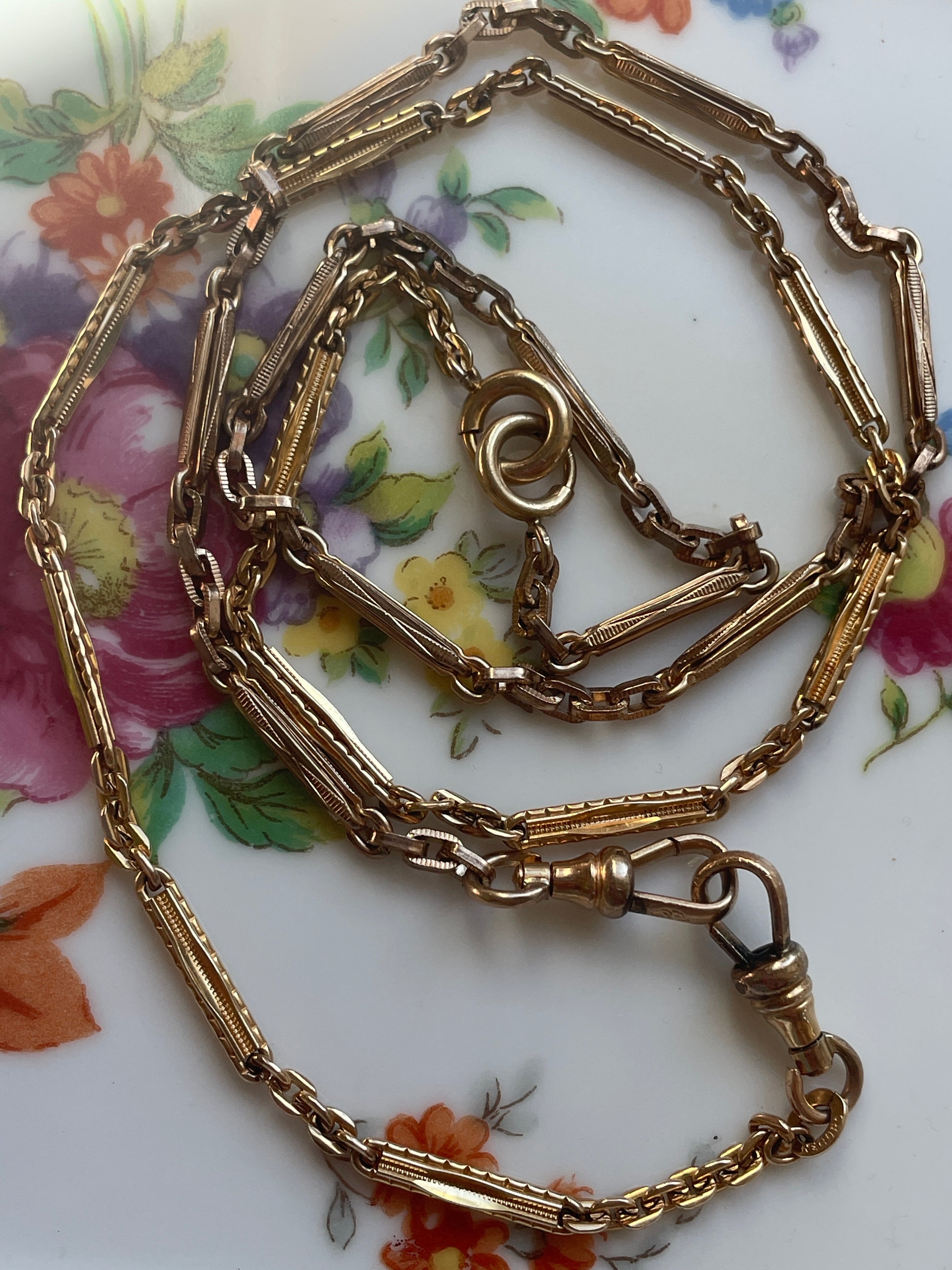 Stunning antique Bar chain (two combined) with gorgeous patterns. These are early 1900s chains and in great condition for their age. These chain measures approx 26 inches. Perfect for wearing as is or with hanging a locket from one of the clasps. Has two dog clips and two bolt clasps.