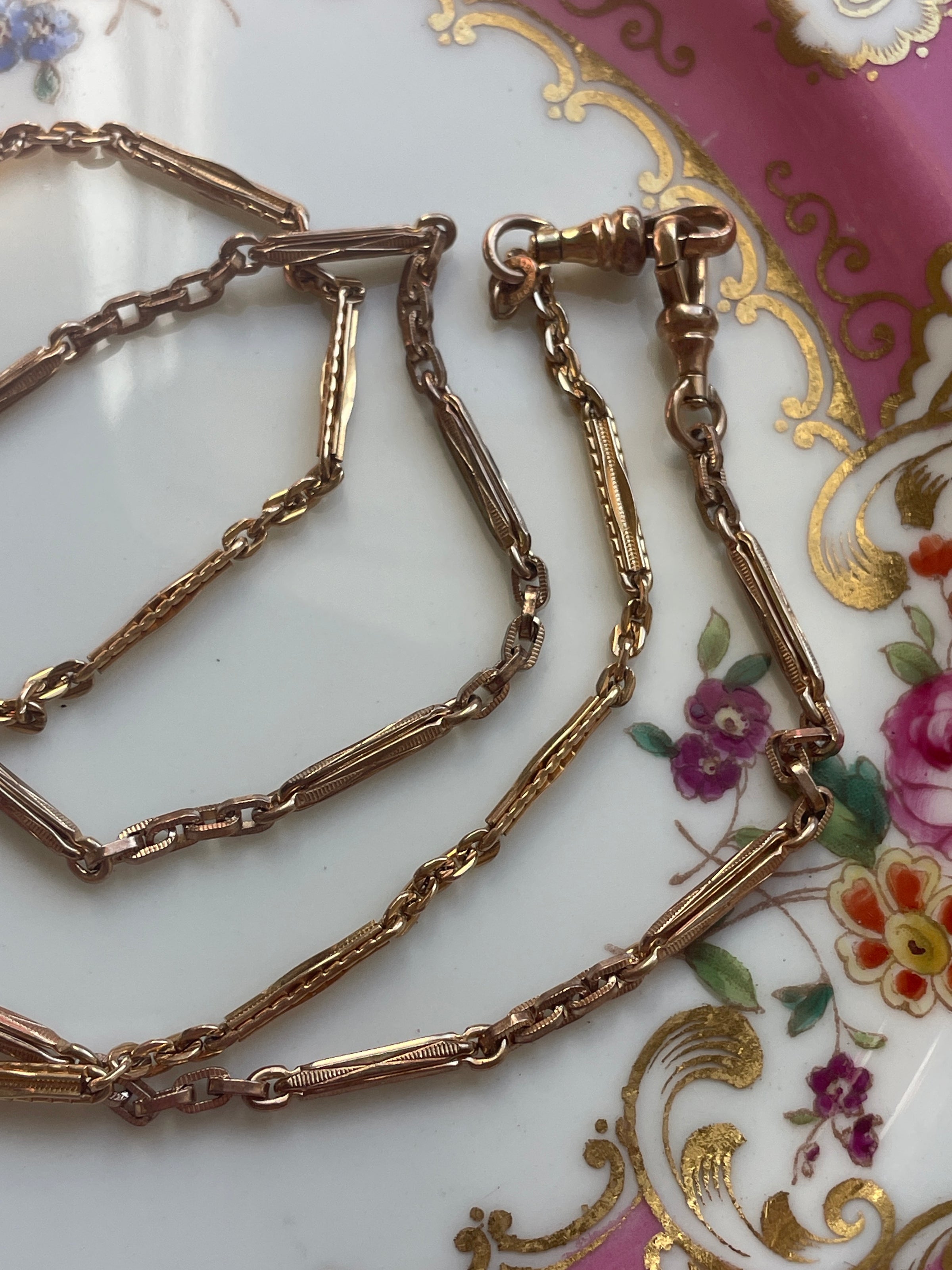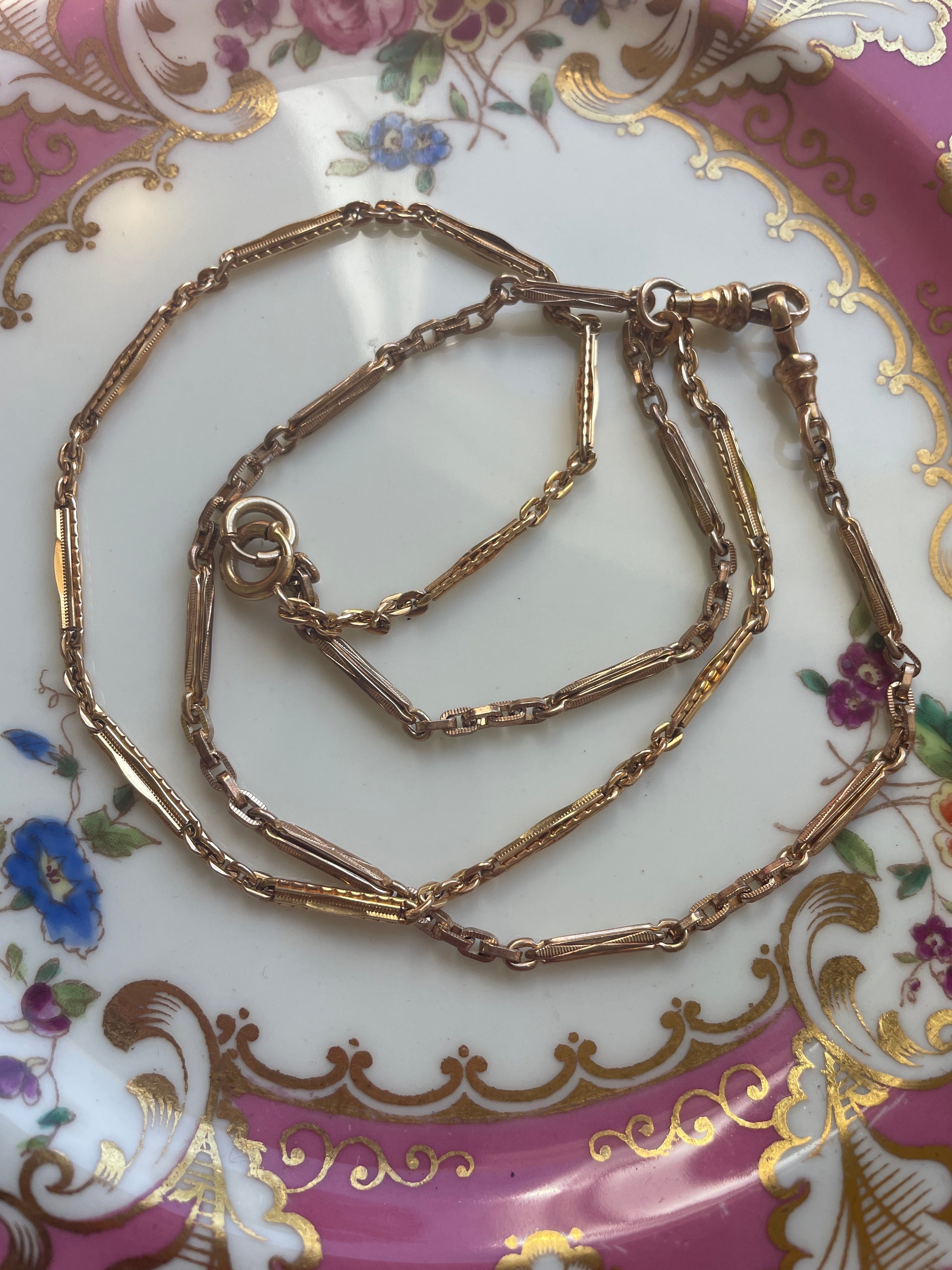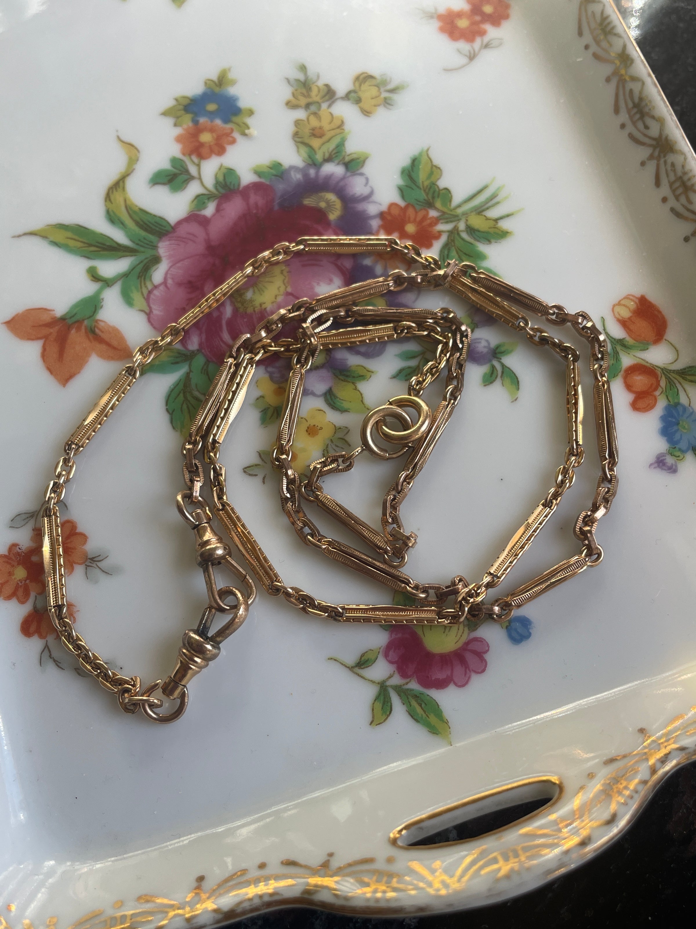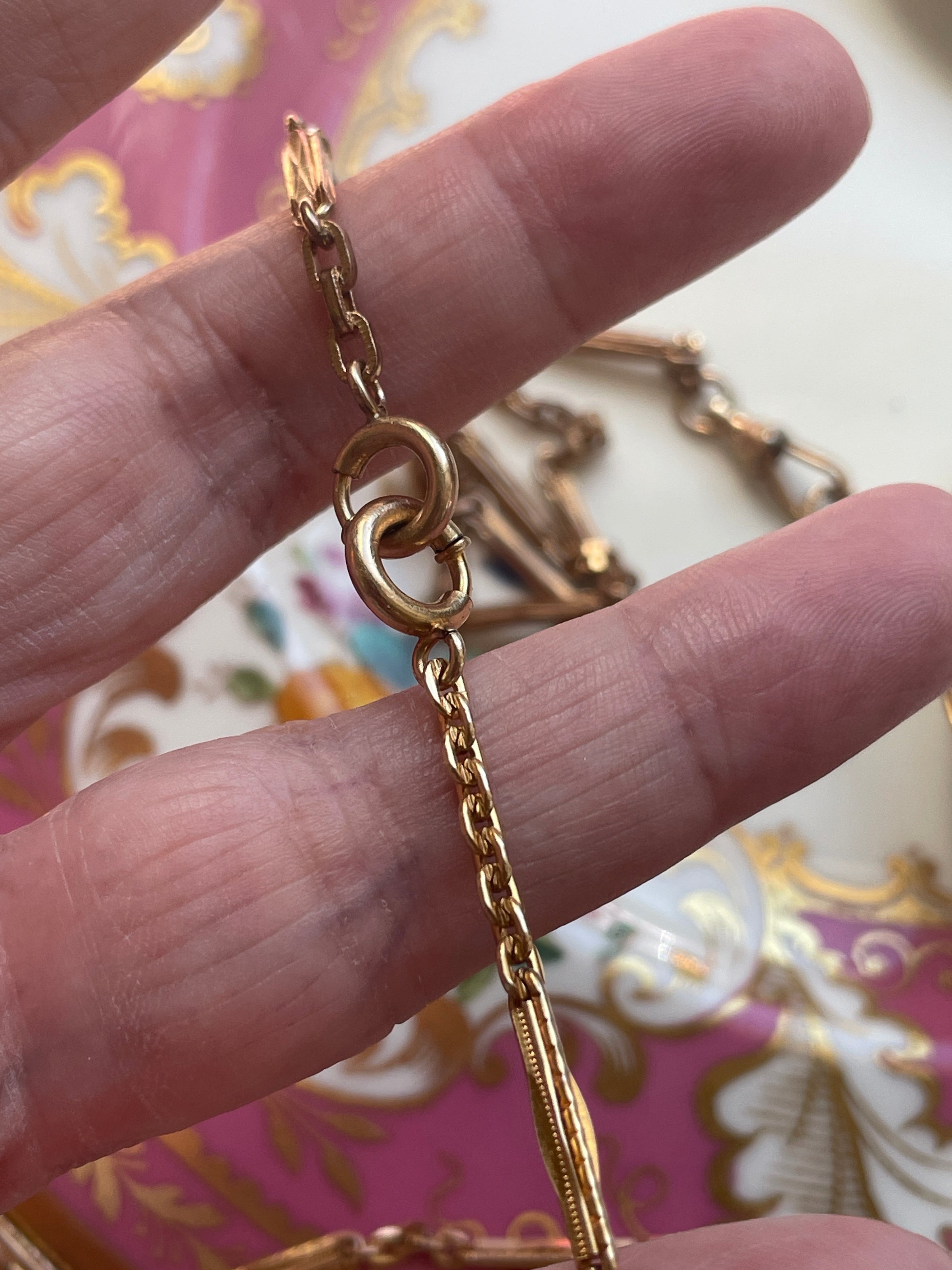 Stunning antique Bar chain (two combined) with gorgeous patterns. These are early 1900s chains and in great condition for their age. These chain measures approx 26 inches. Perfect for wearing as is or with hanging a locket from one of the clasps. Has two dog clips and two bolt clasps.