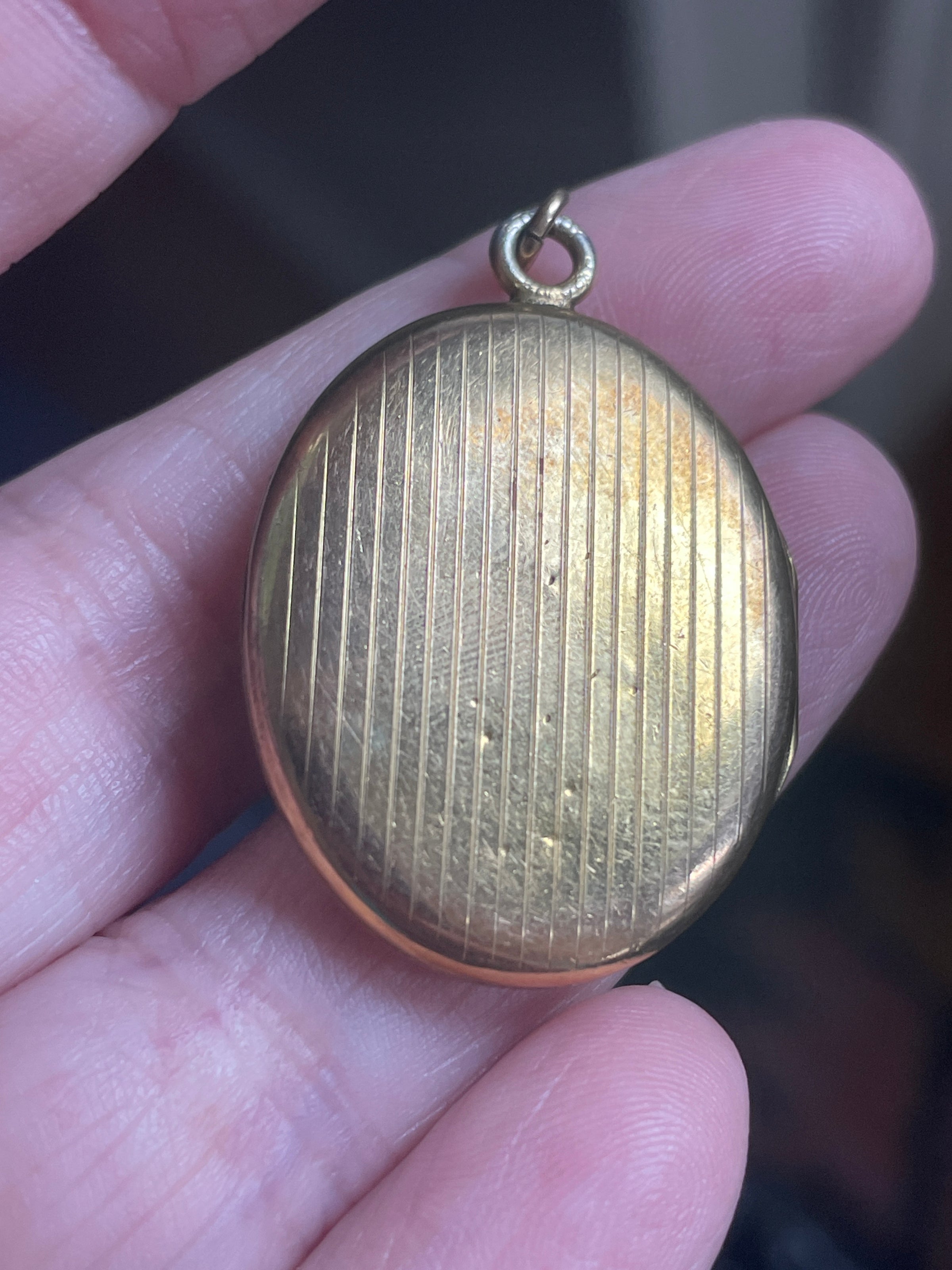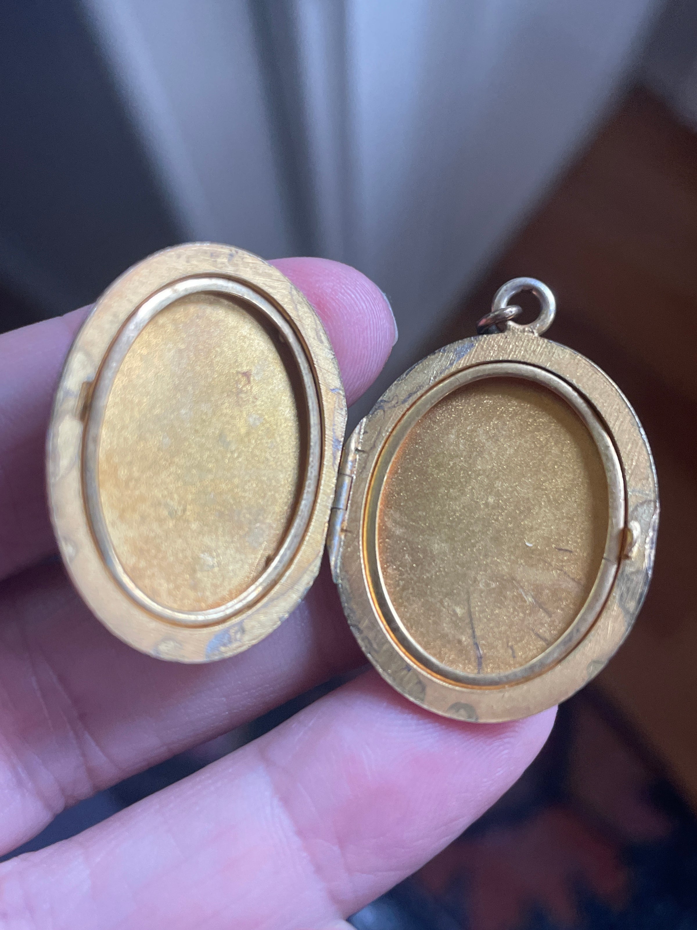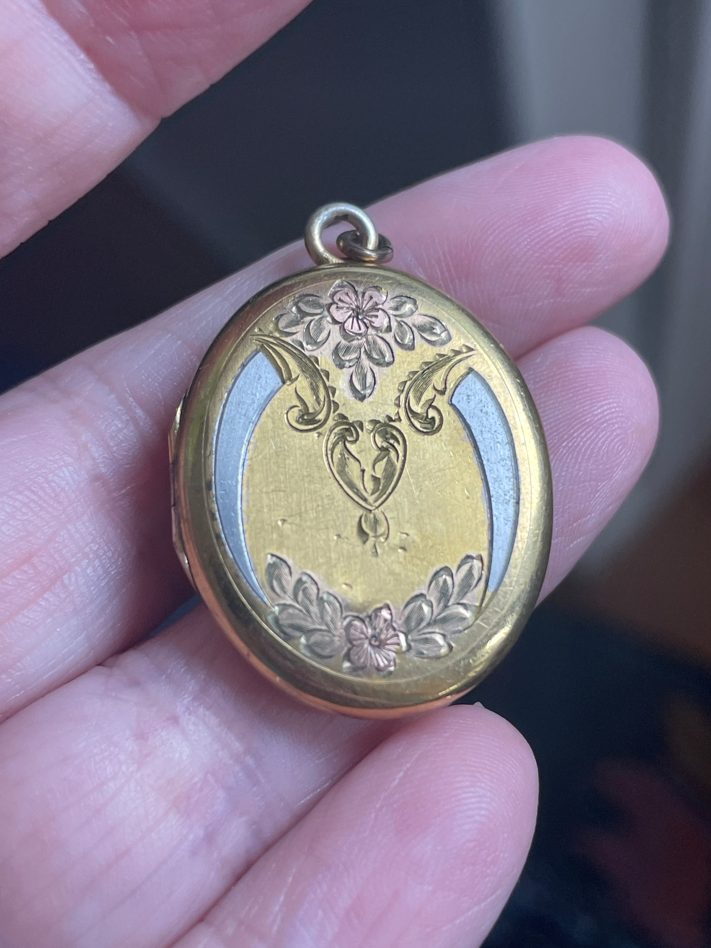 Vintage oval locket with Rose gold flowers, White gold accents and yellow gold engravings. Has striped back. Some wear (see photos). Locket measures just under 1.5 inches x just under 1 inch. Two frames present no acetate. Unmarked but likely gold filled.