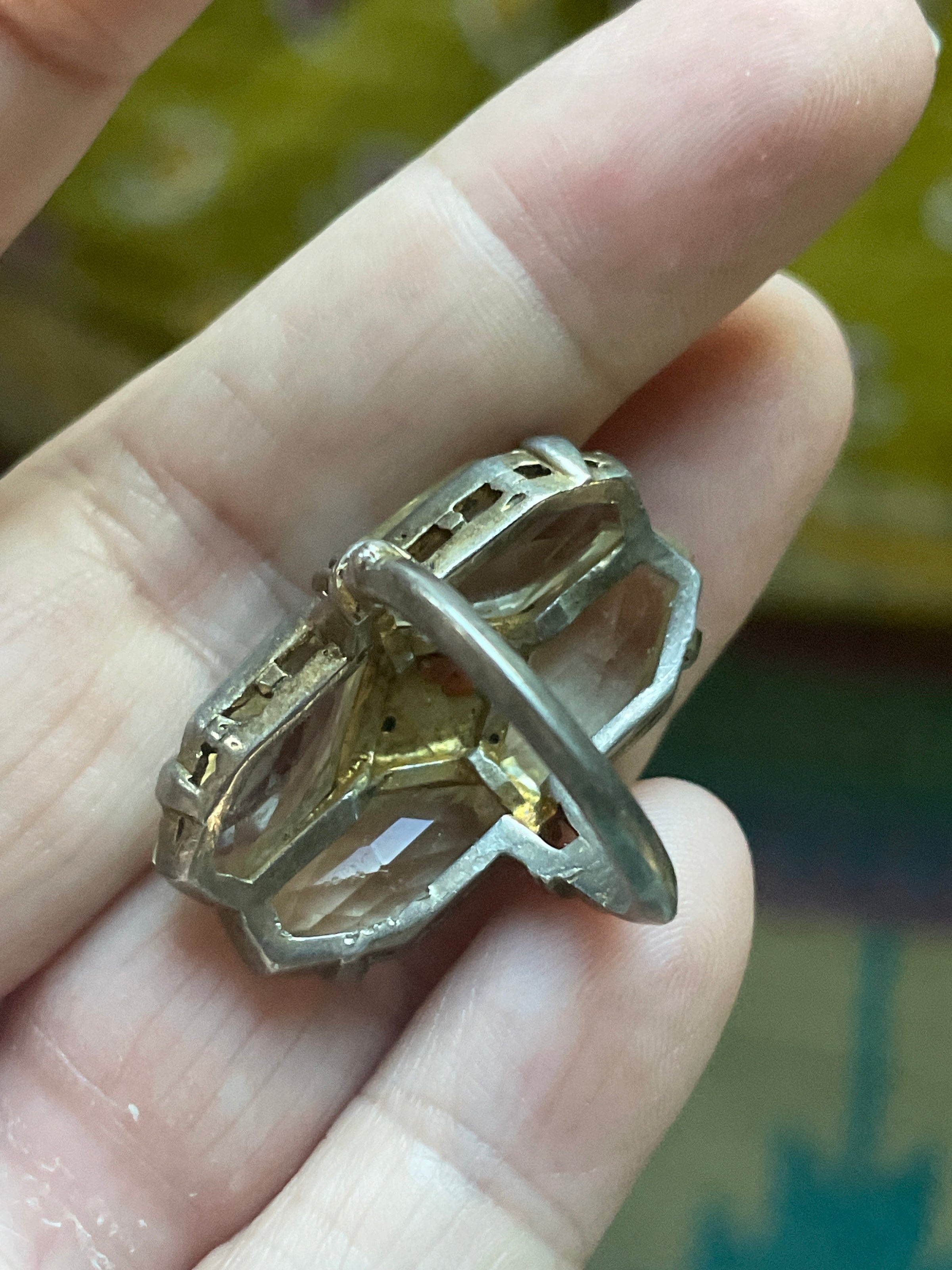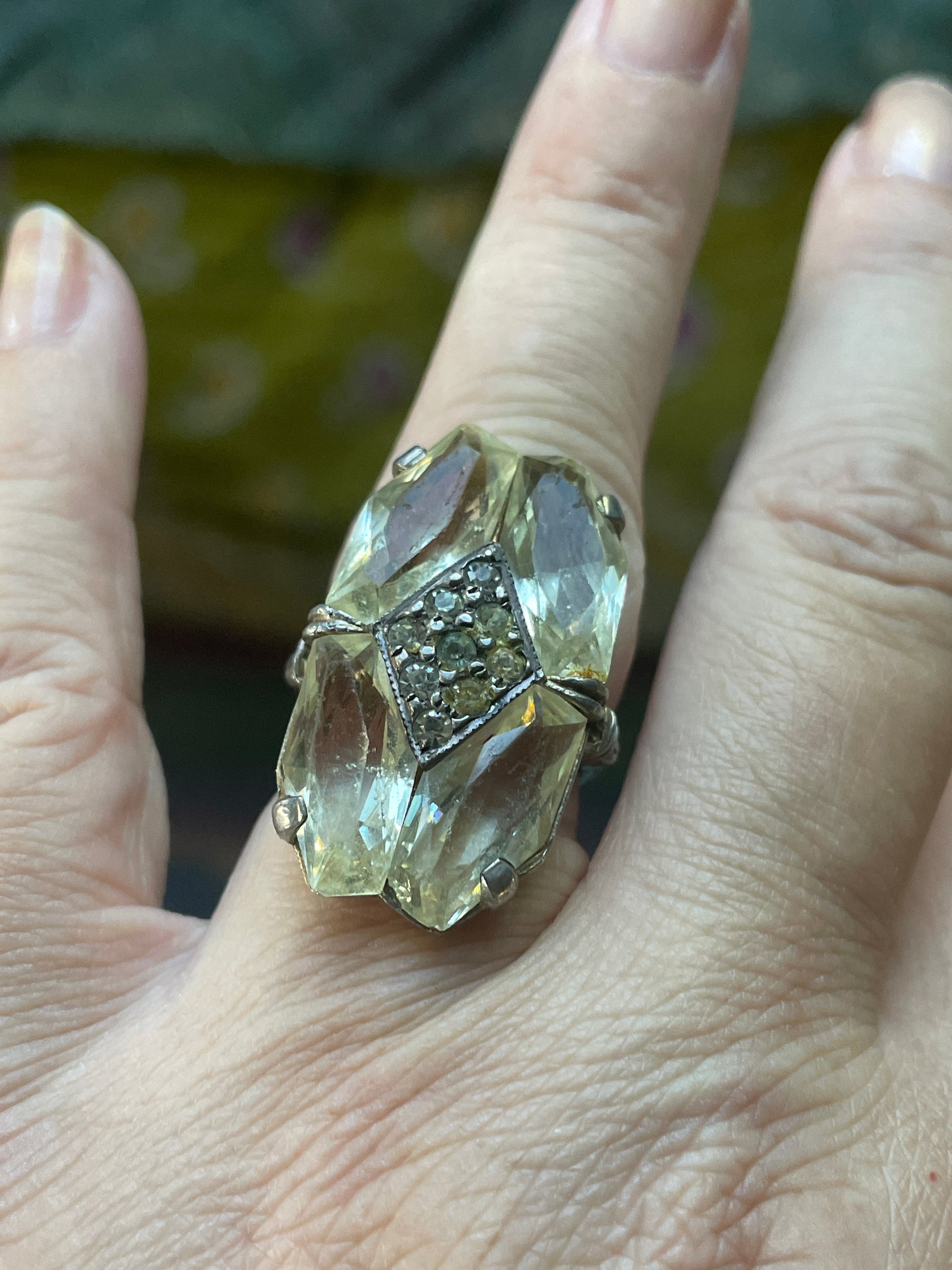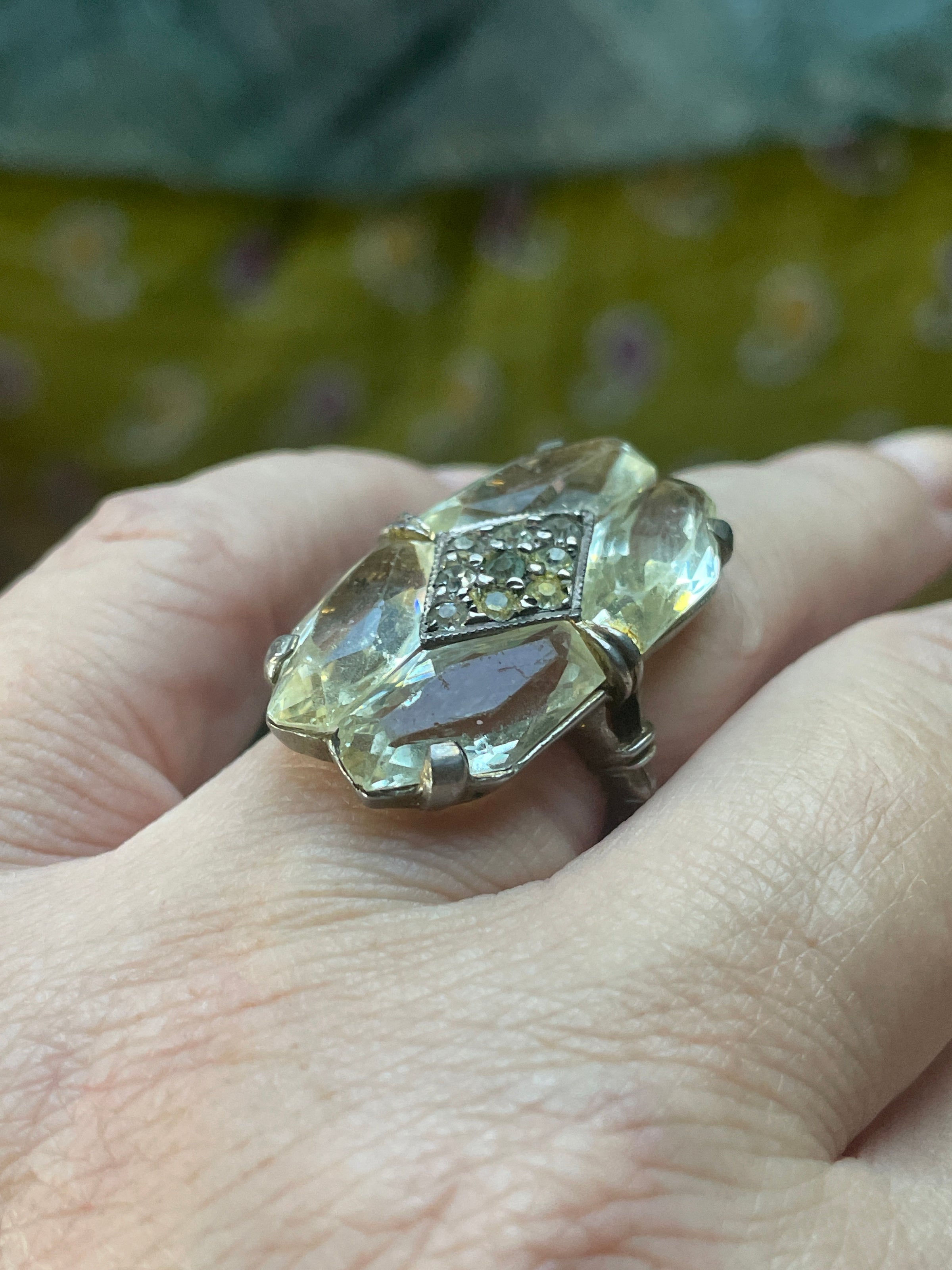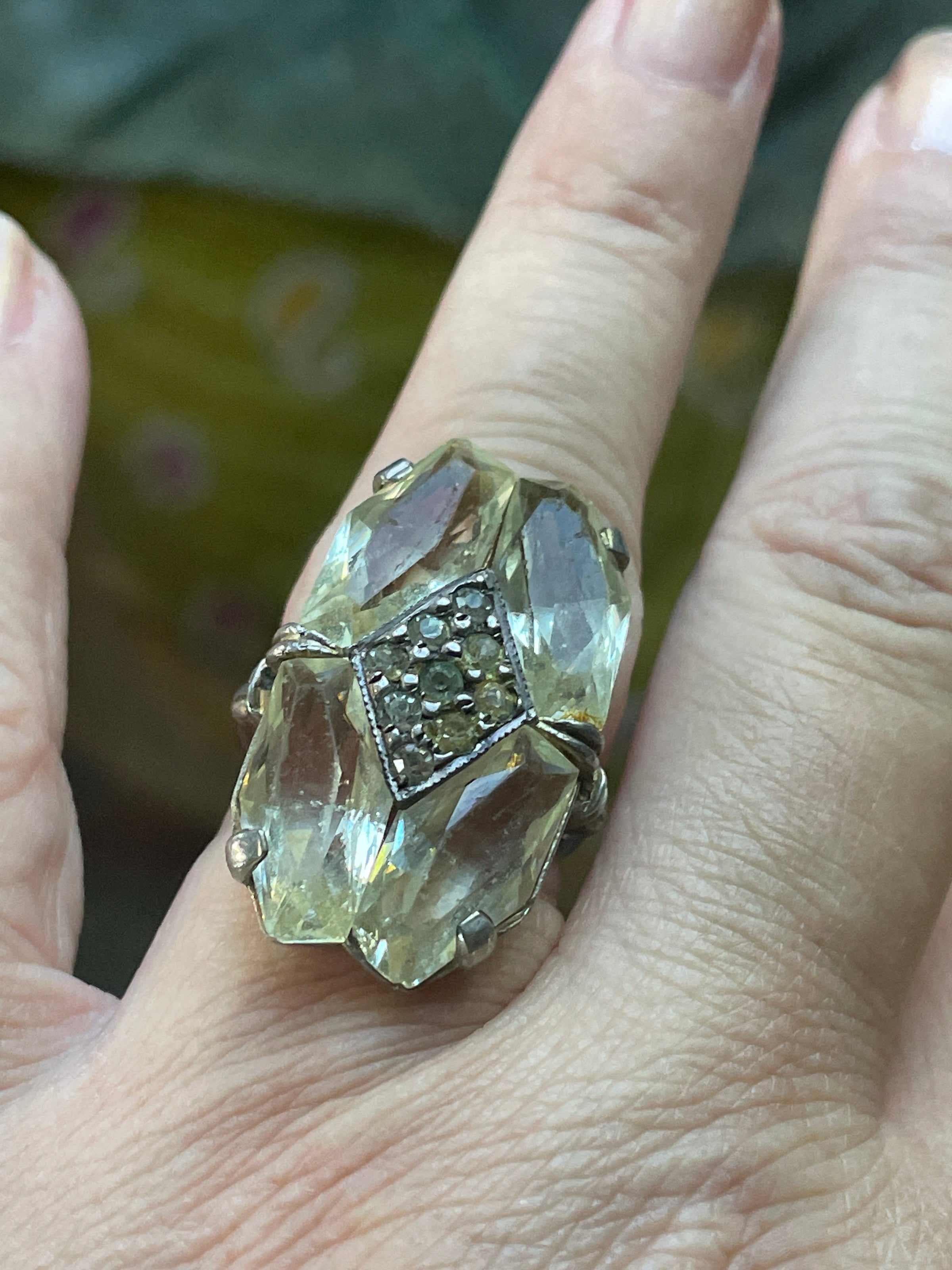 Beautiful antique Deco paste ring with pale yellow cut stones and rhinestones in the center. Looks to be hand cut glass as pieces are slightly different sizes. Ring size = 5.75. Band stamped “Sterling”.