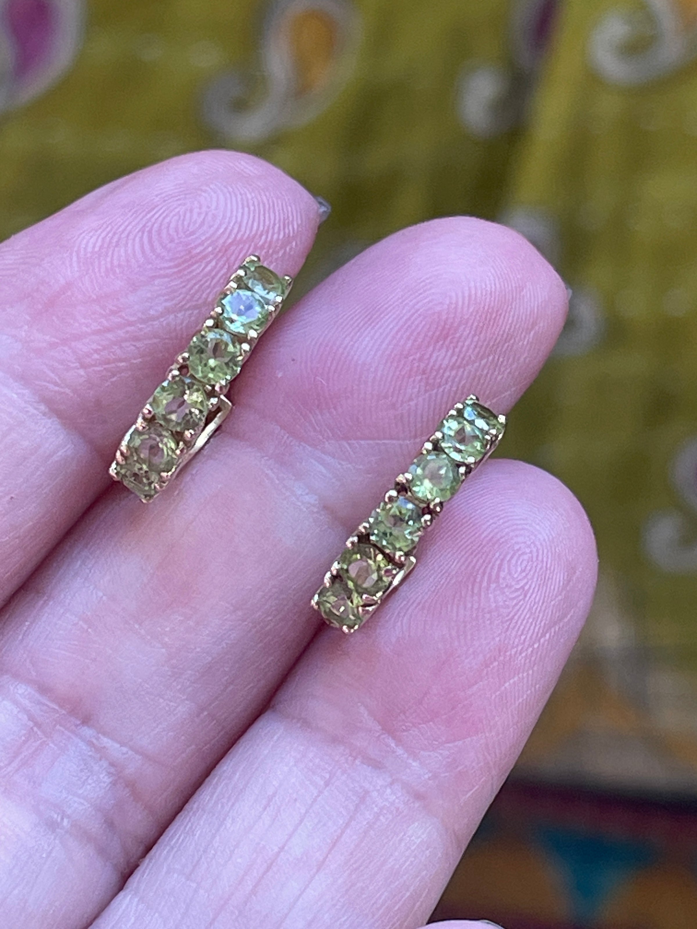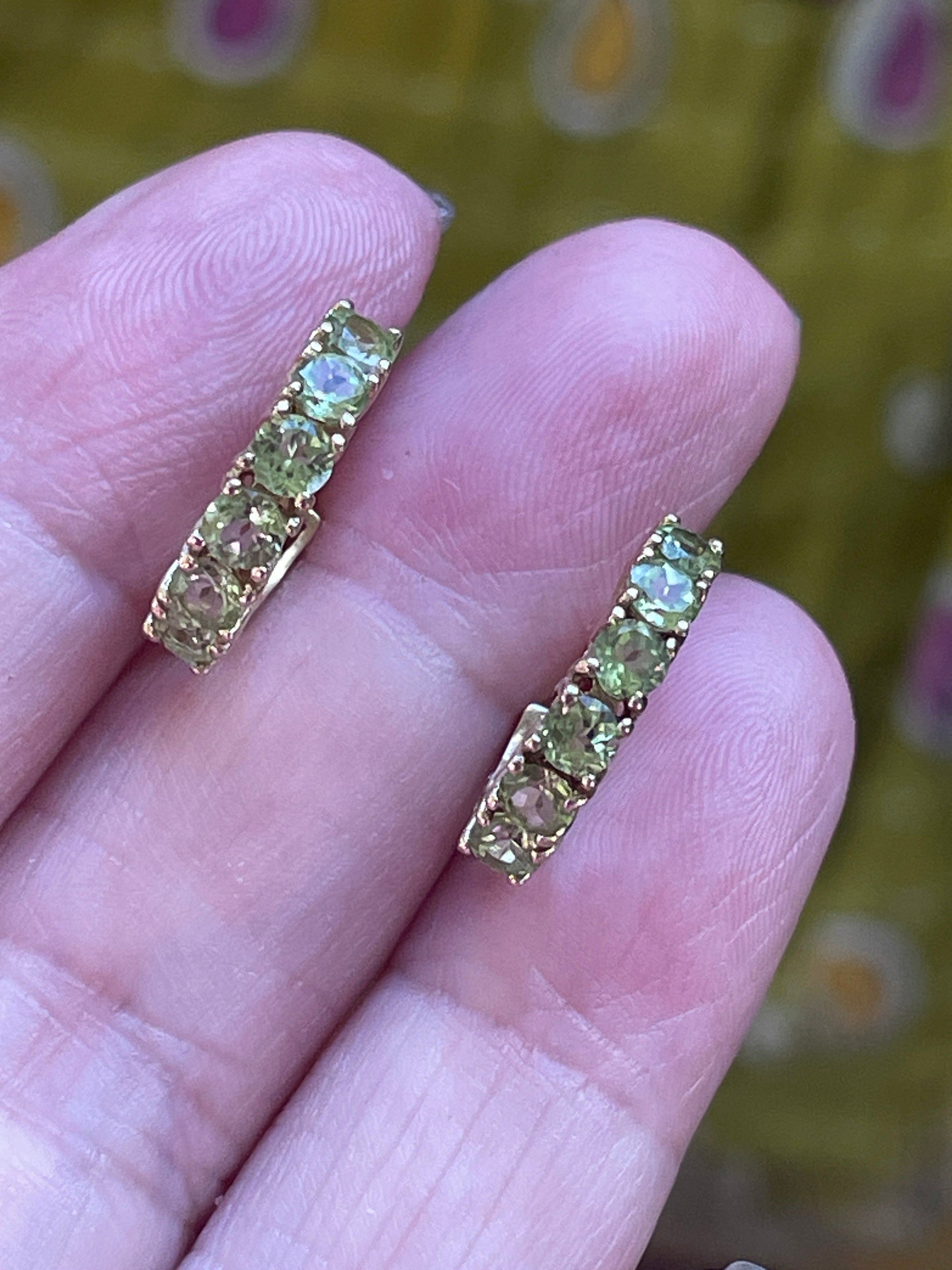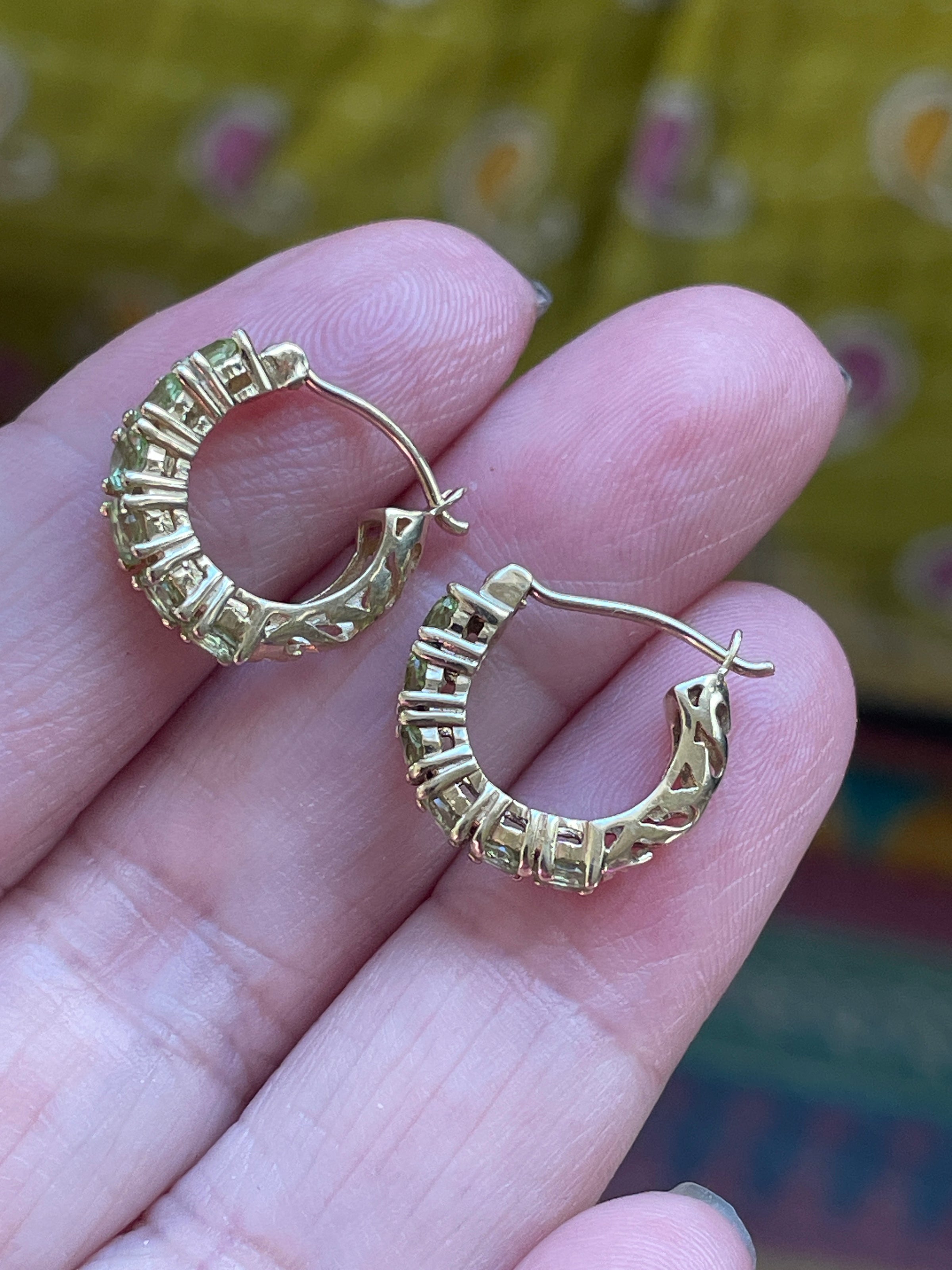 Stunning rare Peridot hoop earrings in 14k gold. These are well made and have good weight (2.47 grams for the pair). Earrings measure approx 0.5 inches. Stamped 14k on earrings.