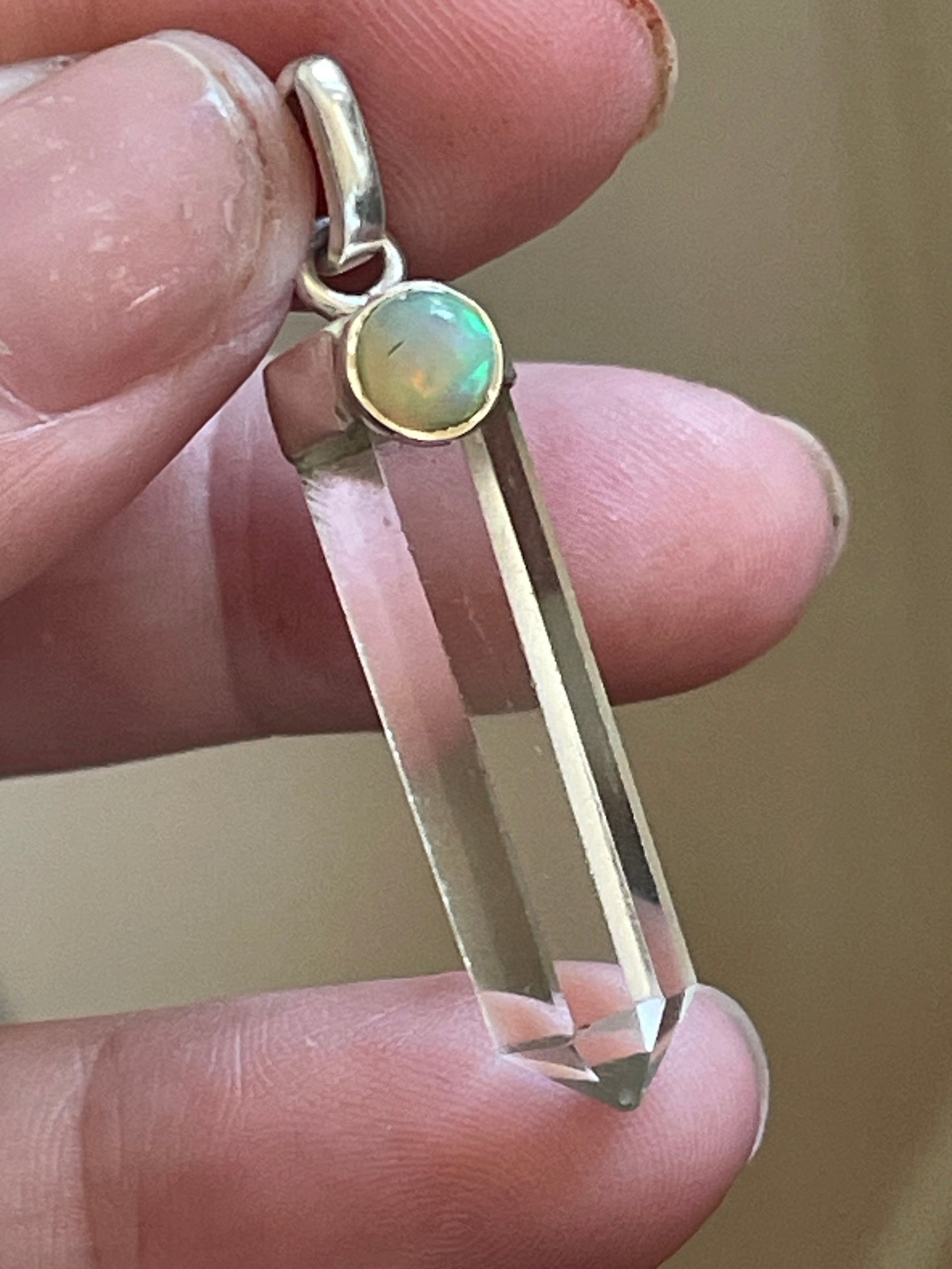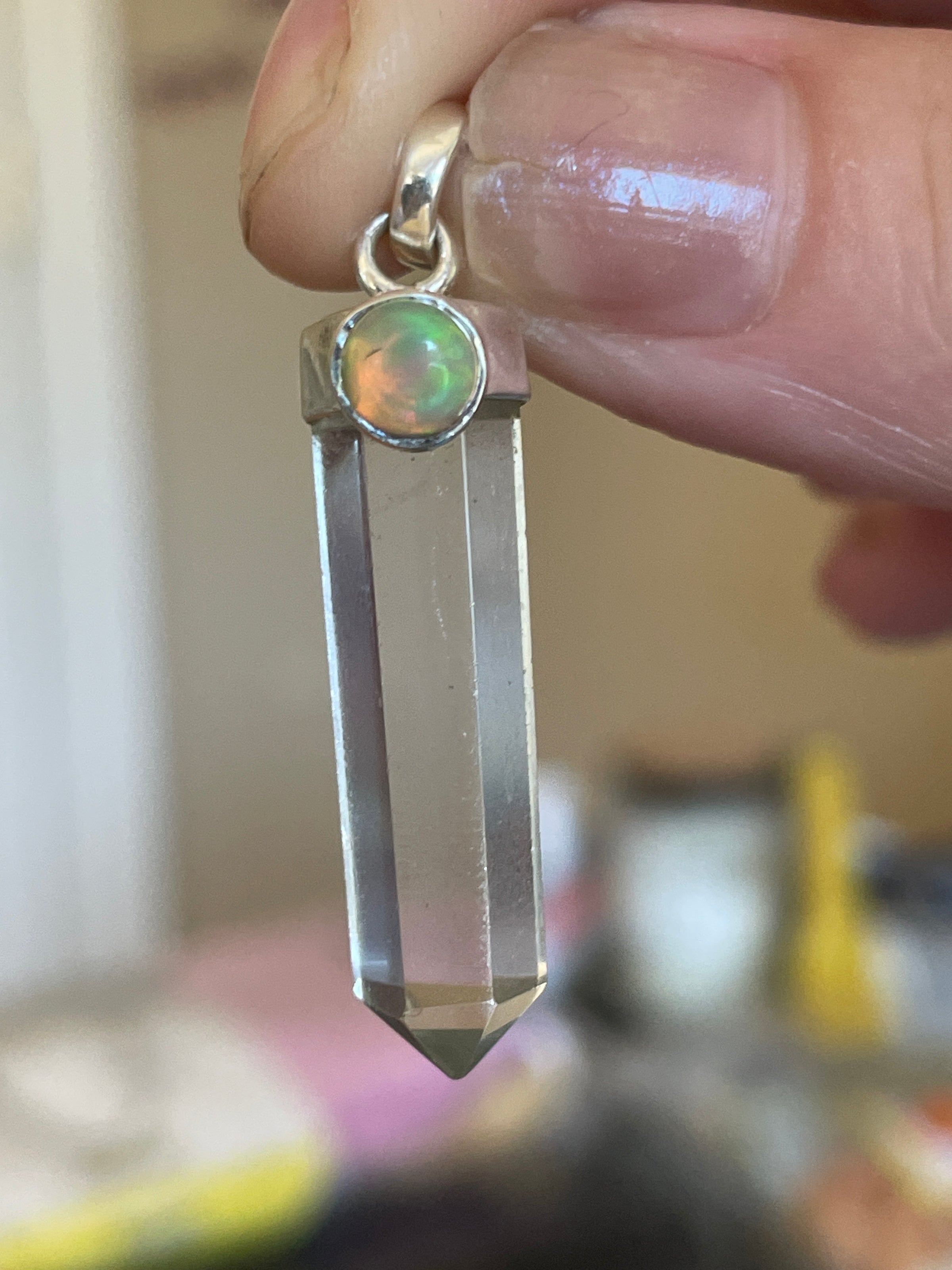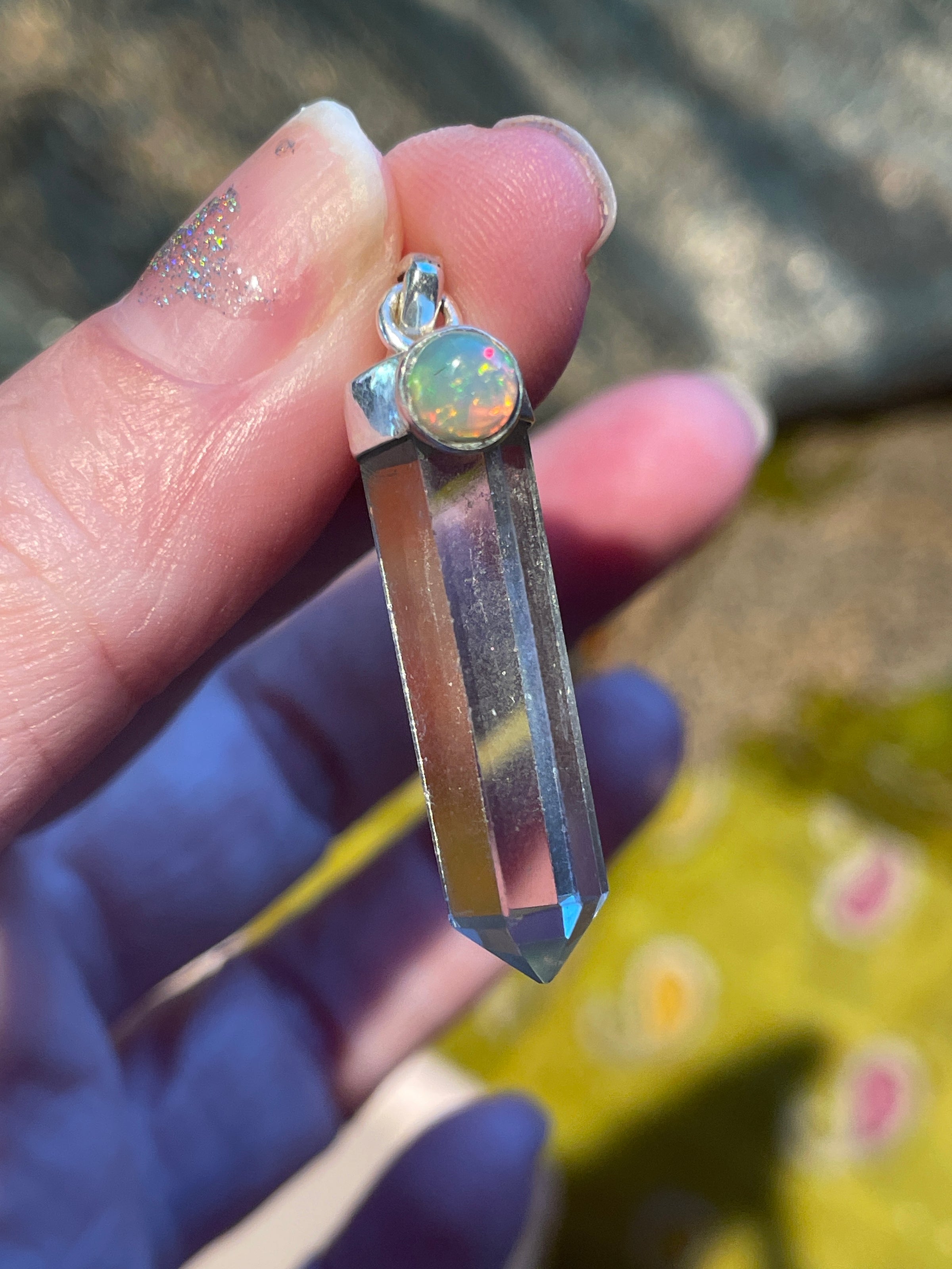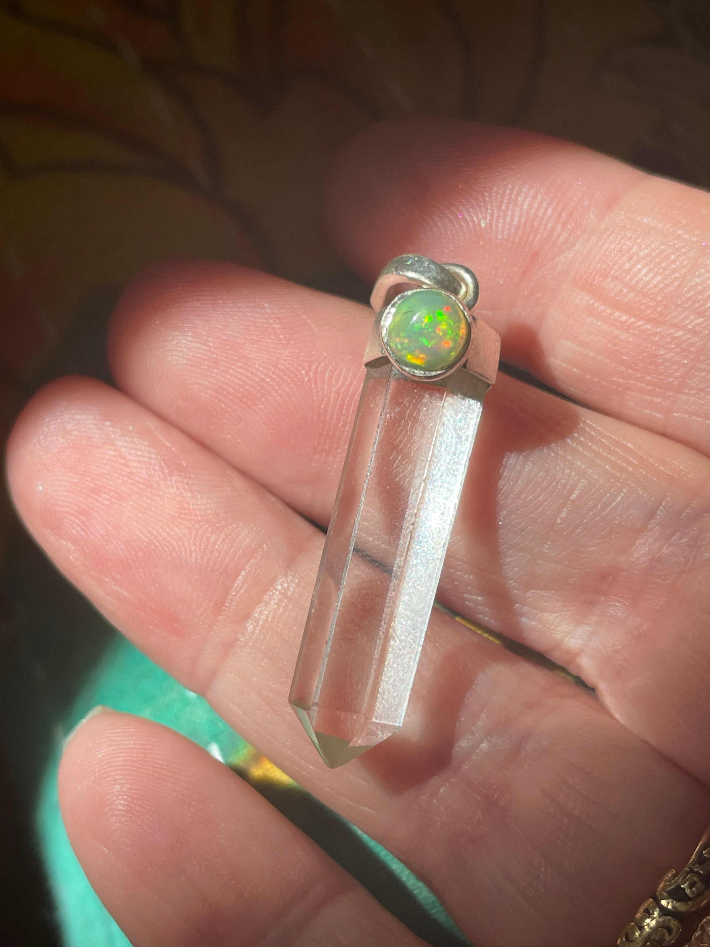Stunning vintage point crystal pendant with Opal accent in sterling silver. Measures approx 1.5 inches. Stamped 925 inside bail.