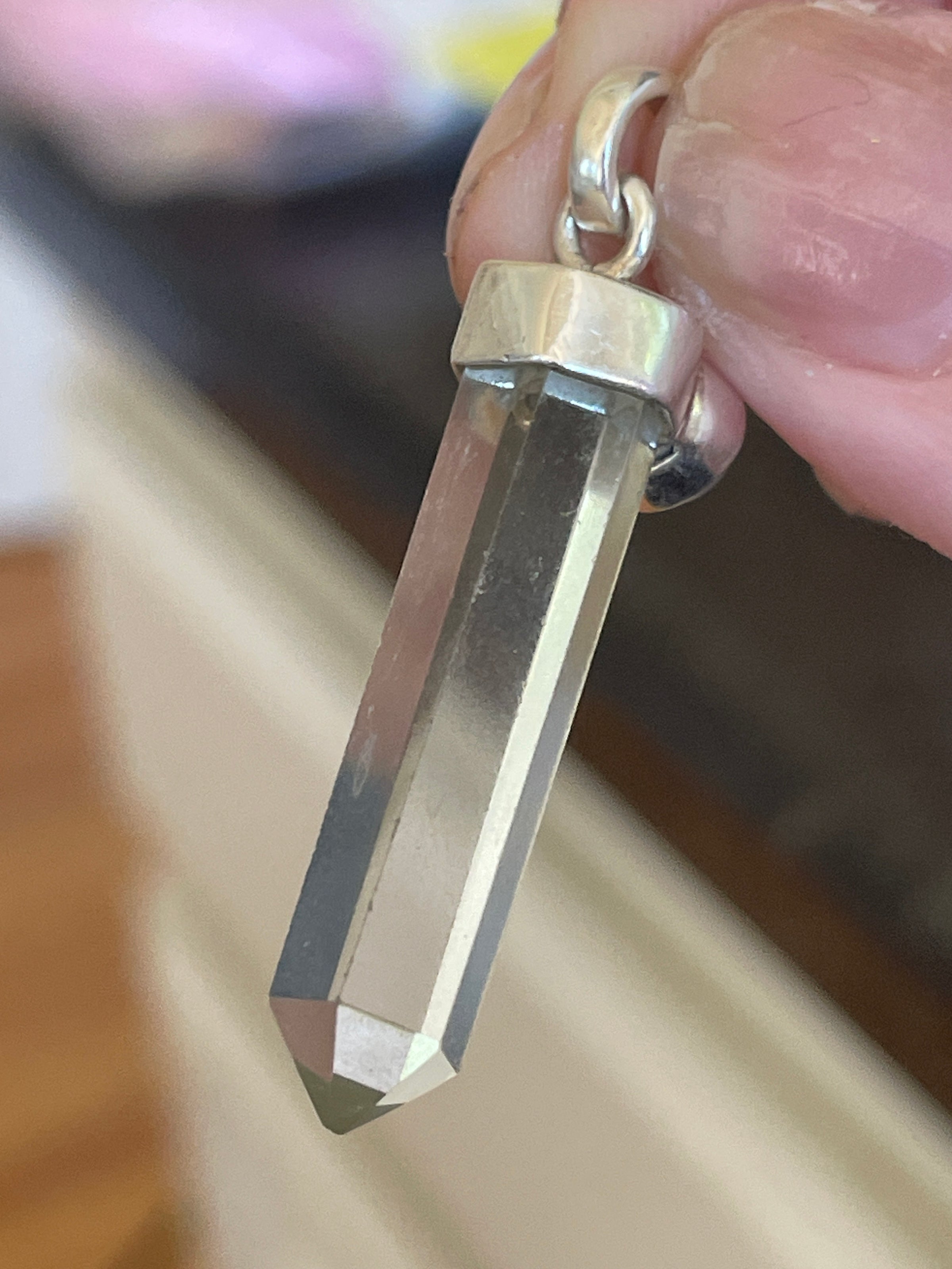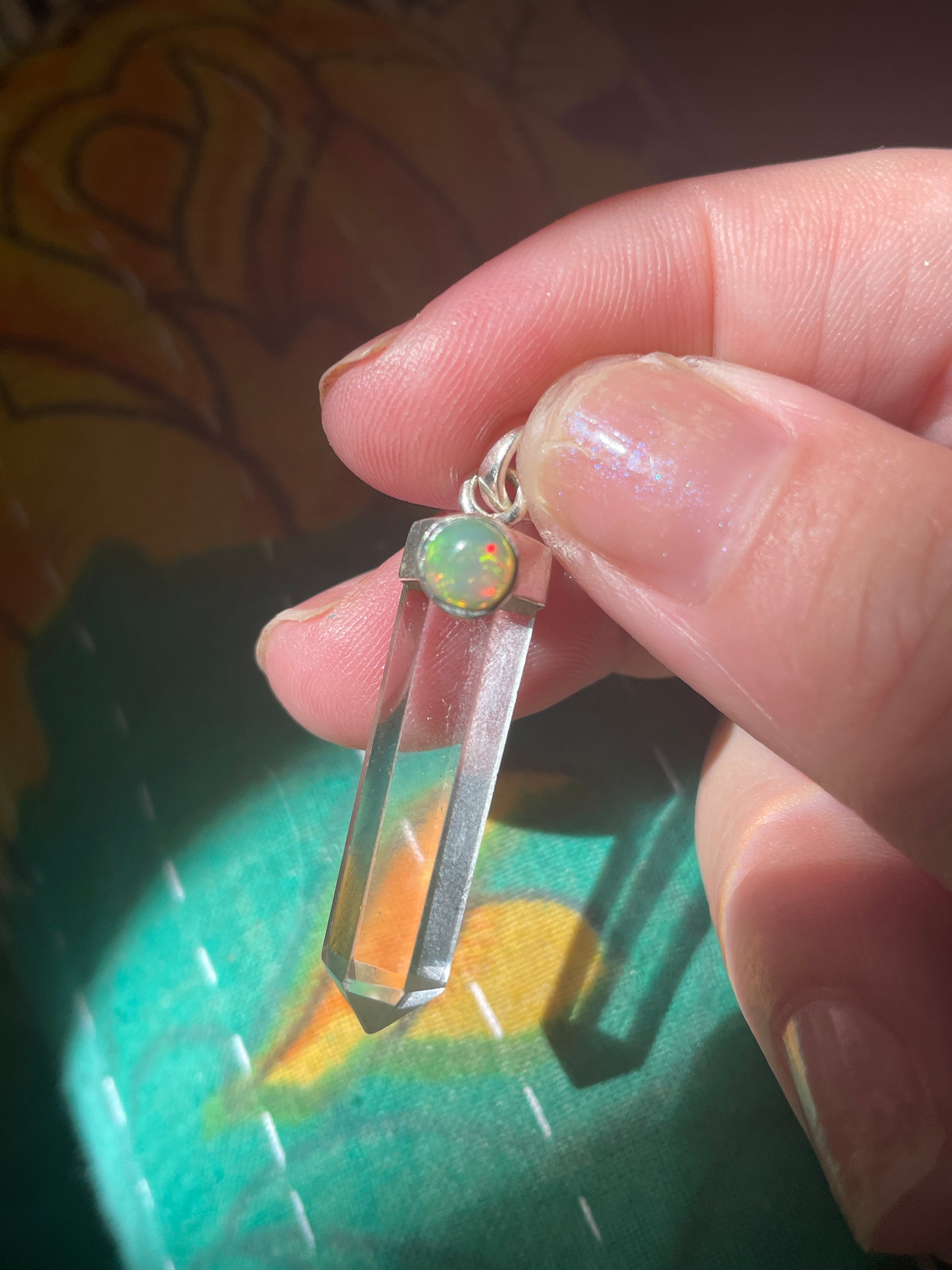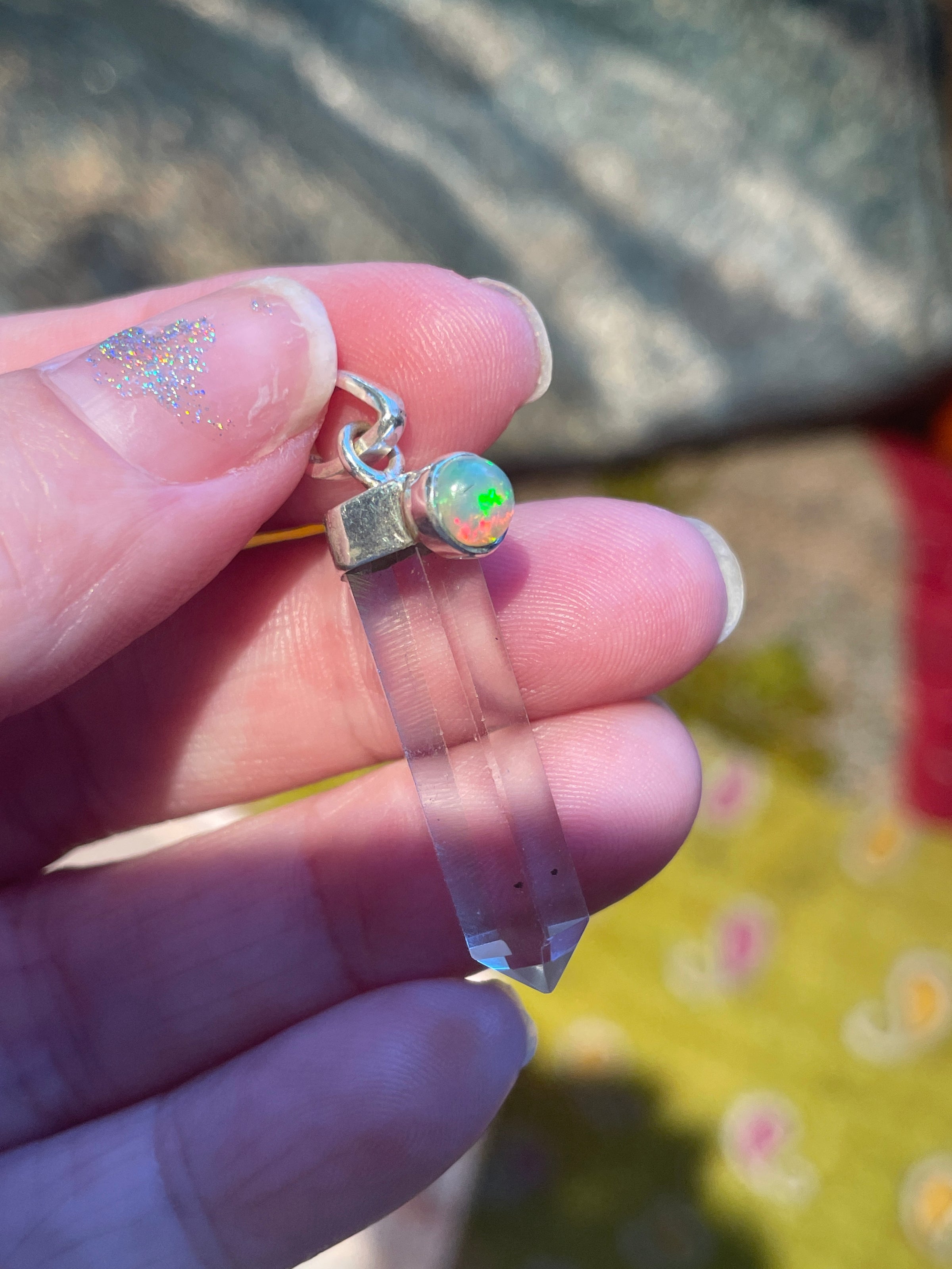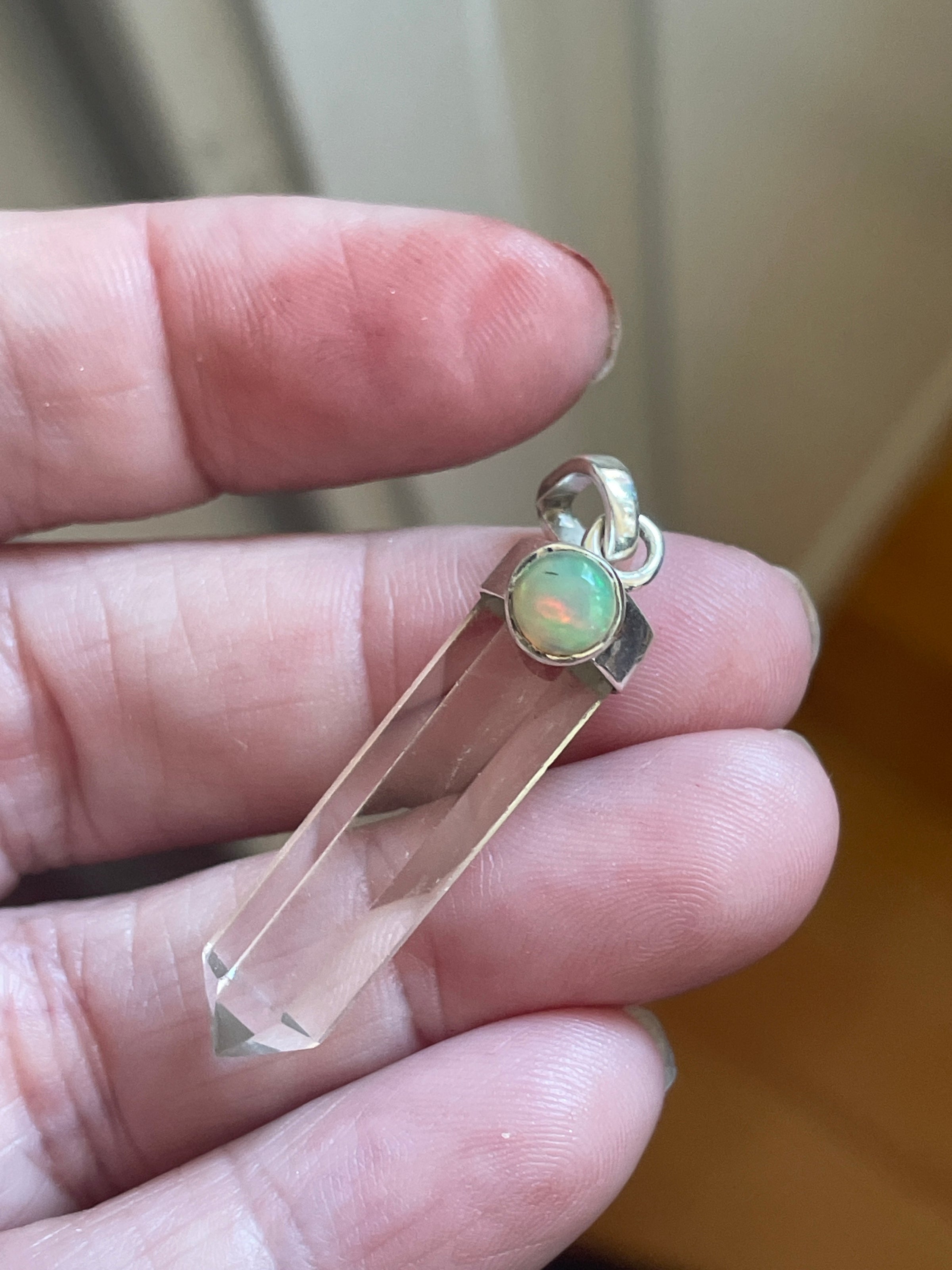 Stunning vintage point crystal pendant with Opal accent in sterling silver. Measures approx 1.5 inches. Stamped 925 inside bail.