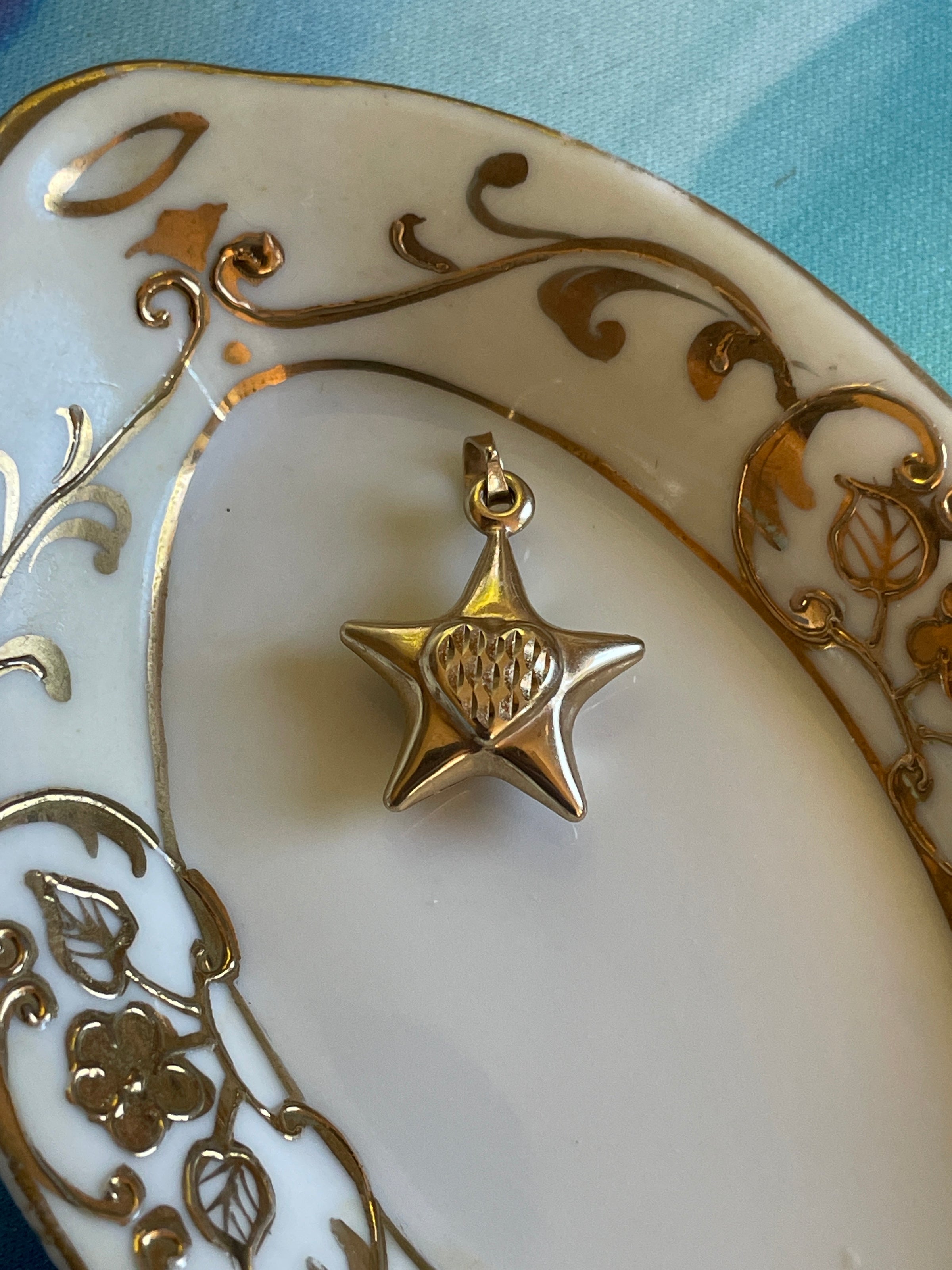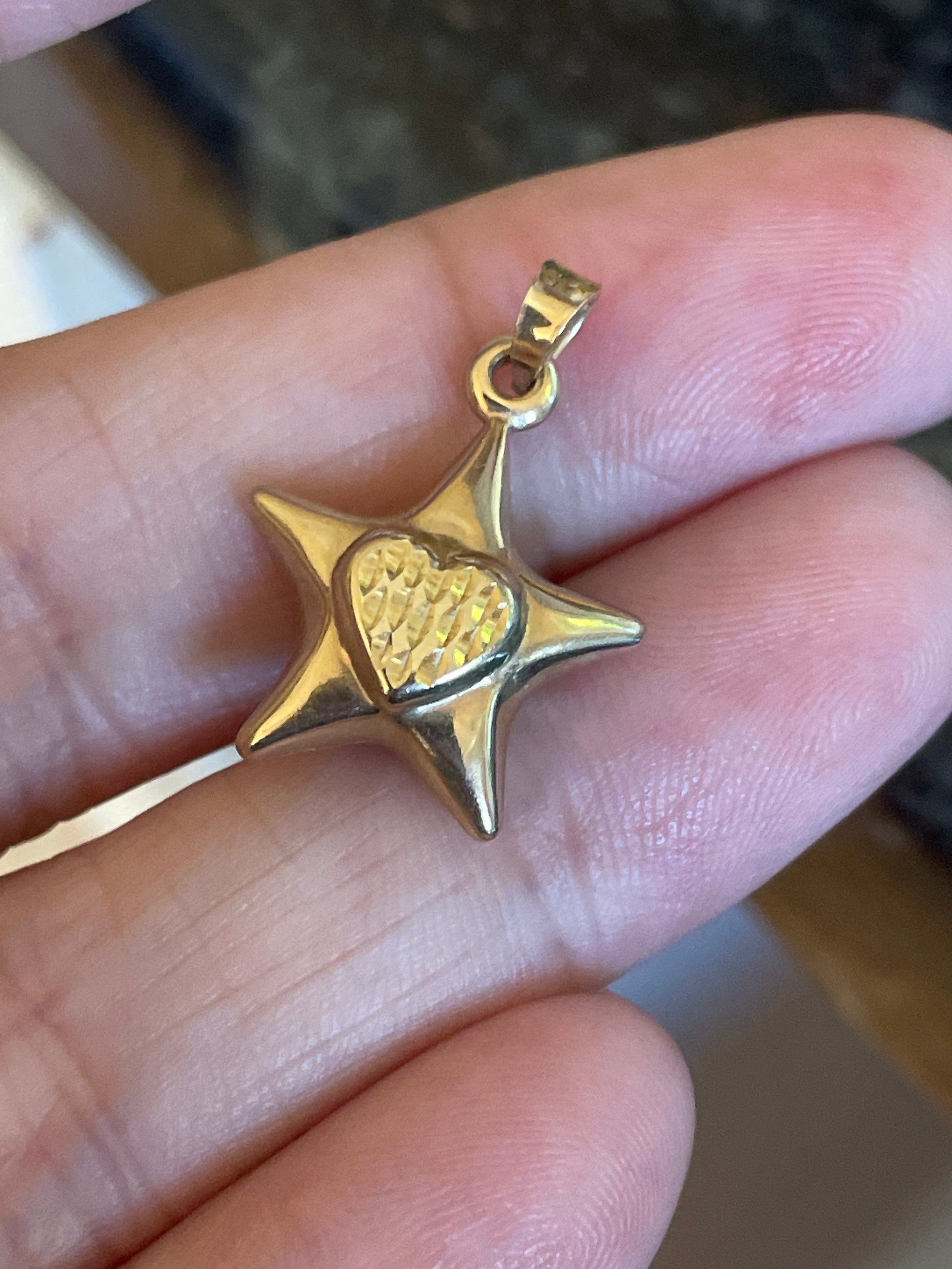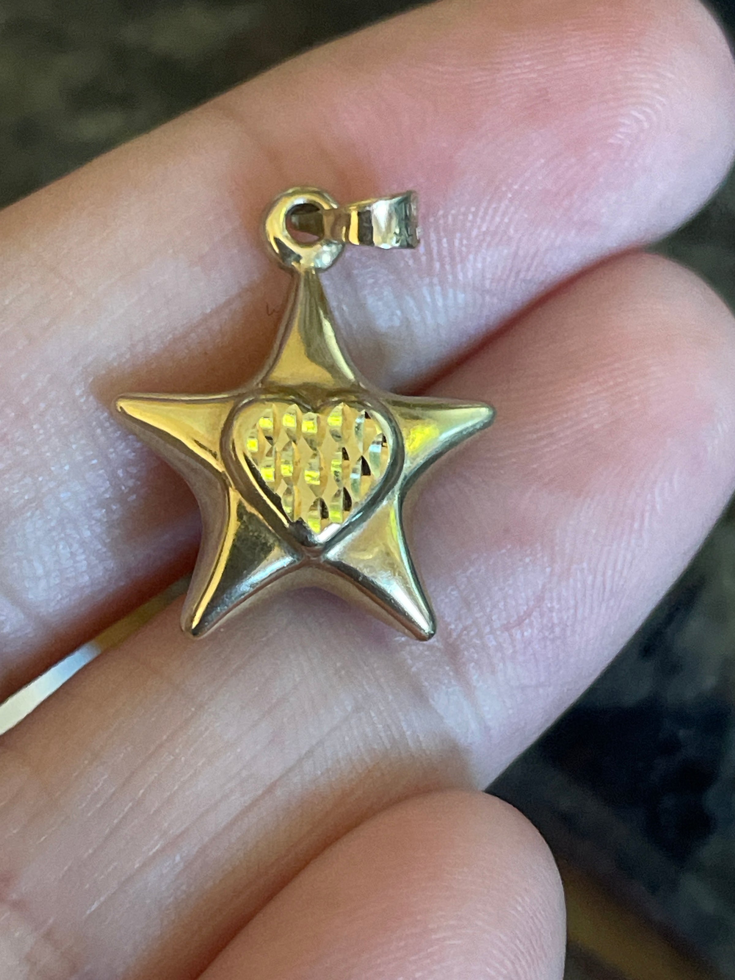 Fabulous puffy Star pendant in 10k gold with textured heart on both sides. Measures approx 0.75 inches with bail. Lightweight and comfortable for daily wear. Stamped 10k on bail.