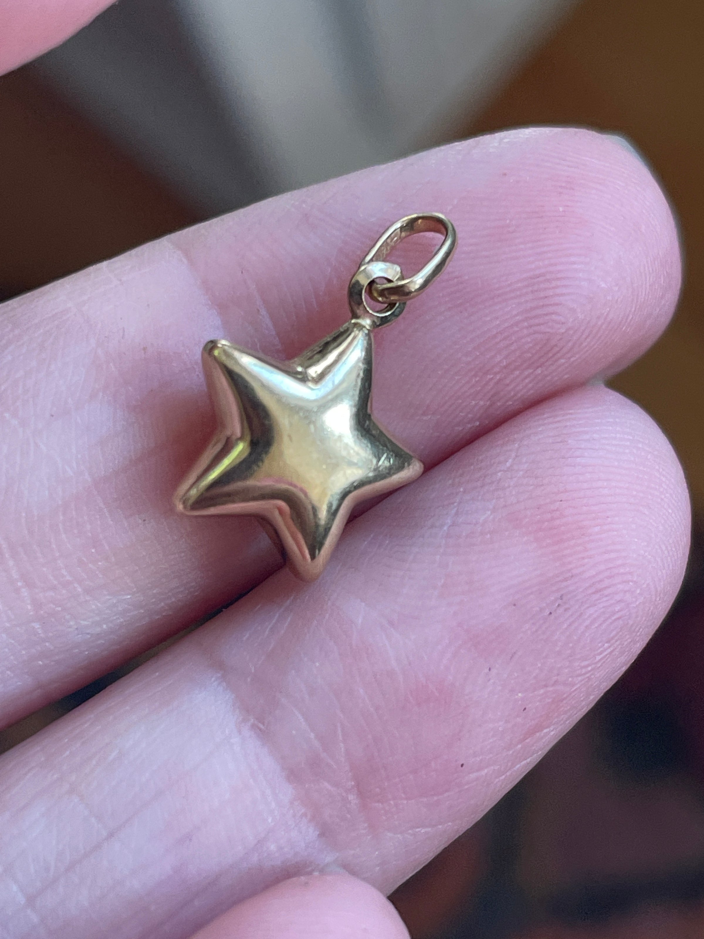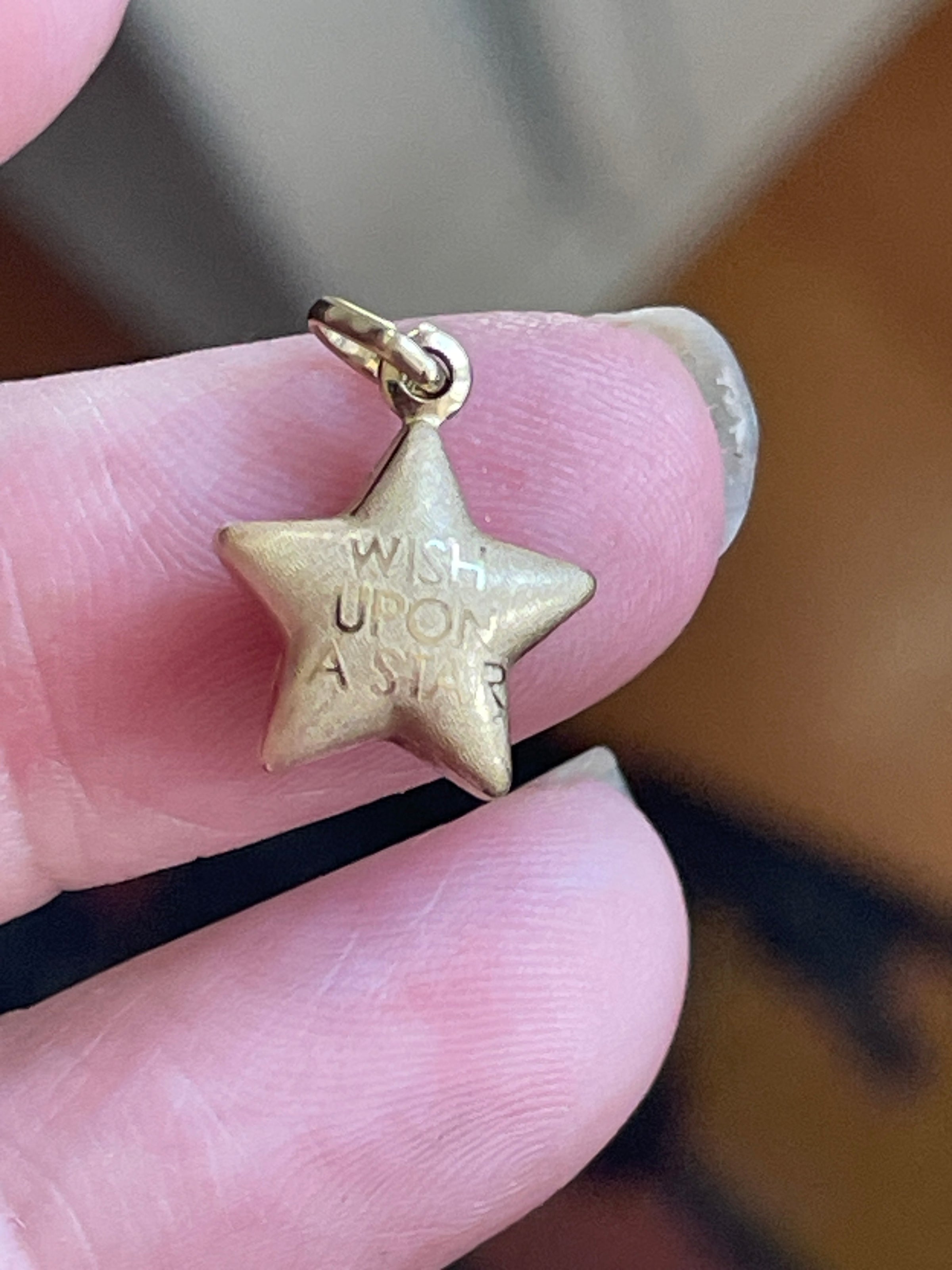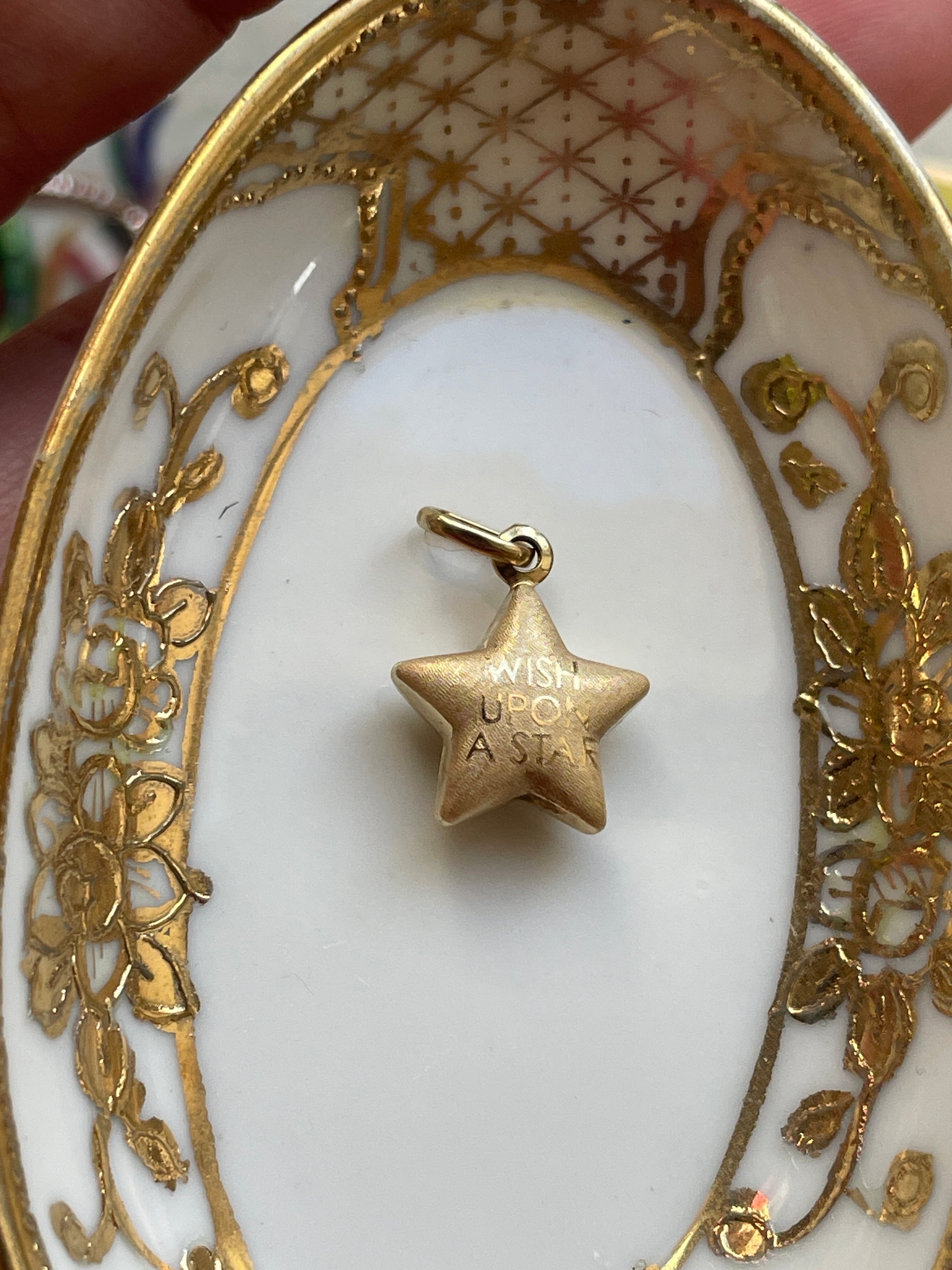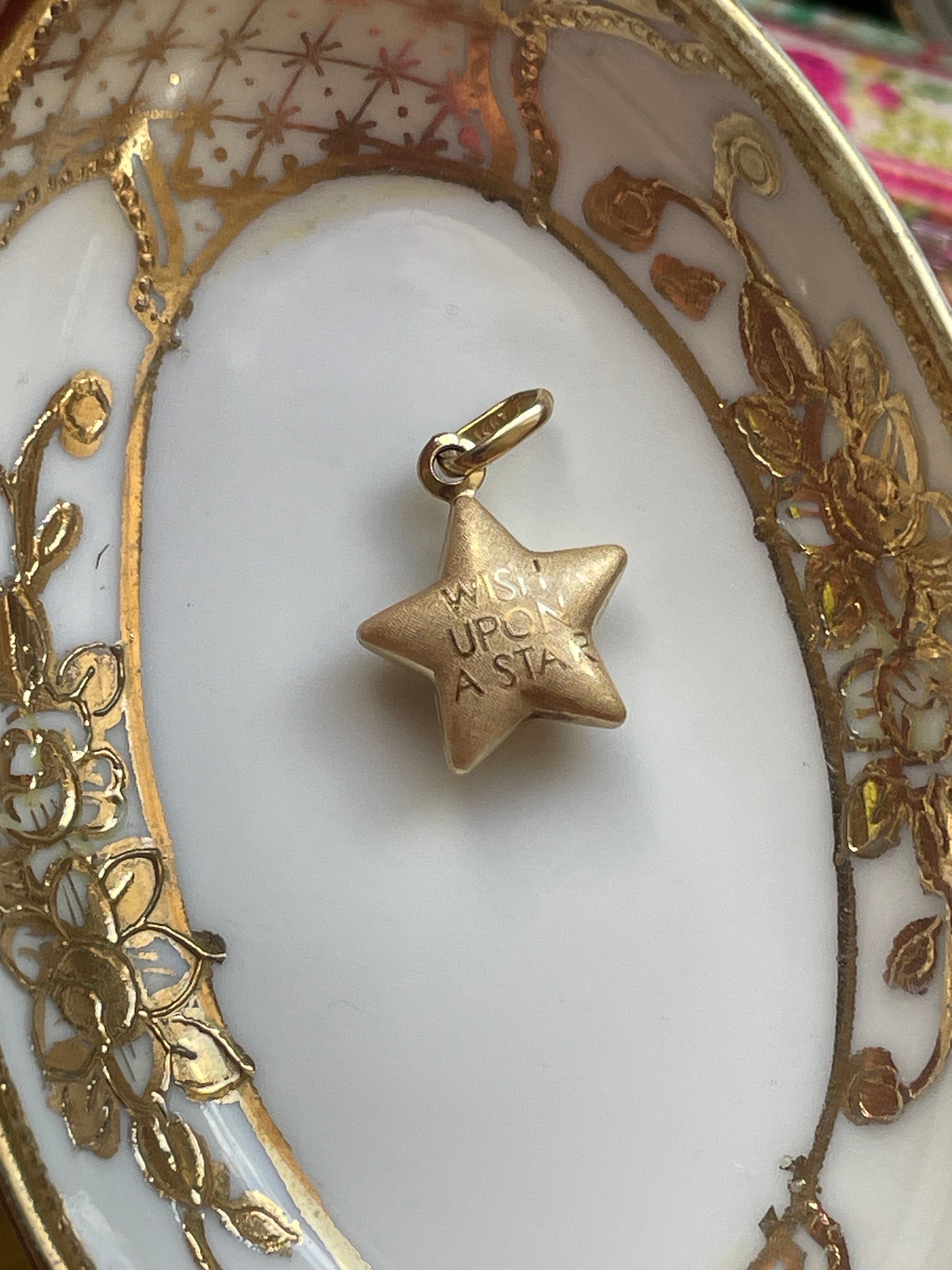Sweet vintage puffy star pendant with “Wish Upon A Star” engraved ln it. Measures approx 0.5 inches with bail x 11mm. Stamped “Italy” and “14k” on inside of bail.