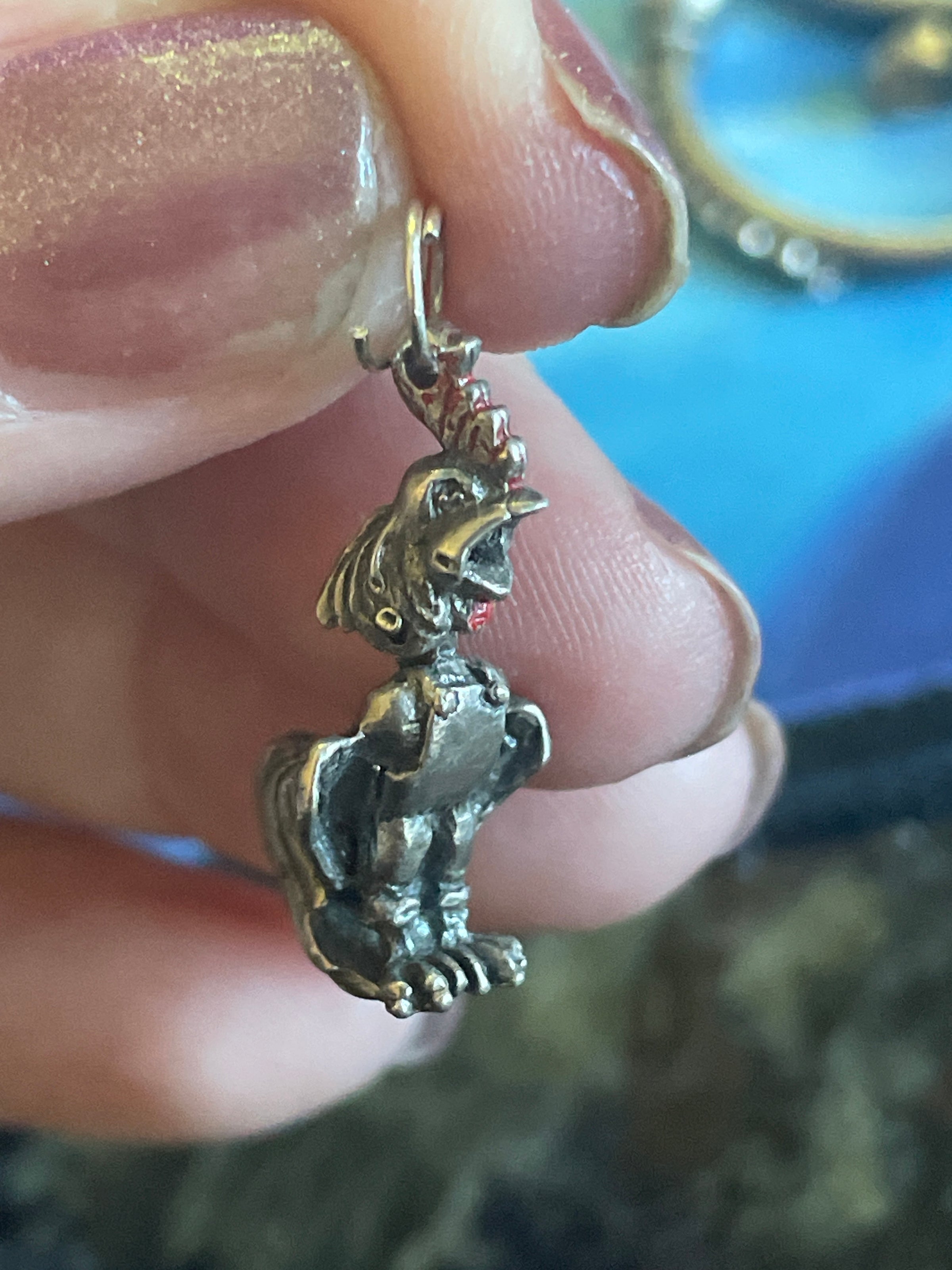 Lovely vintage articulated ooster pendant in sterling silver.  Has some enamel but much has worn.  Measures just over 0.75 inches.  Neck moves.  Top loop is a keyring style would likely change out if I was new owner.  Tested sterling.